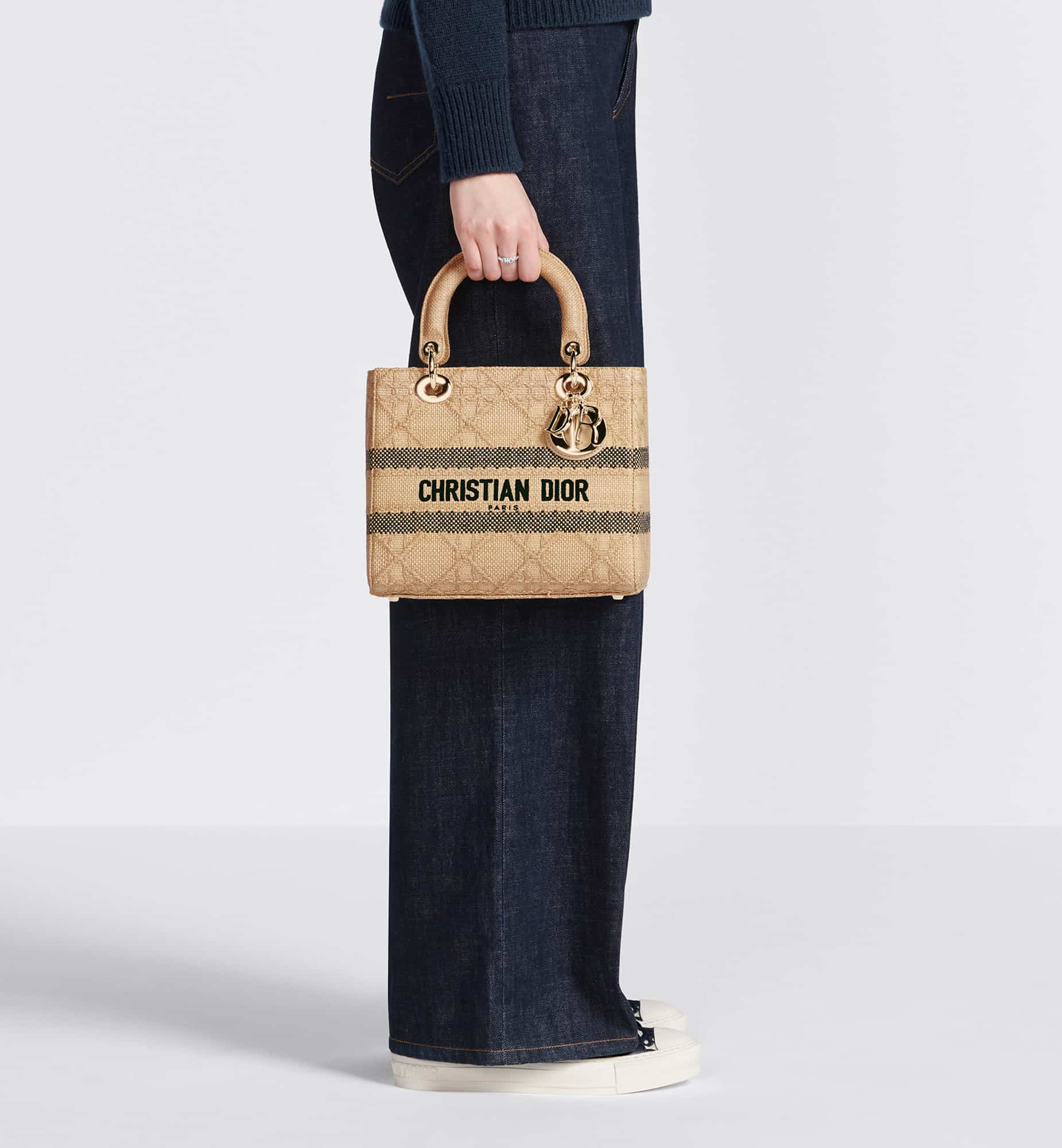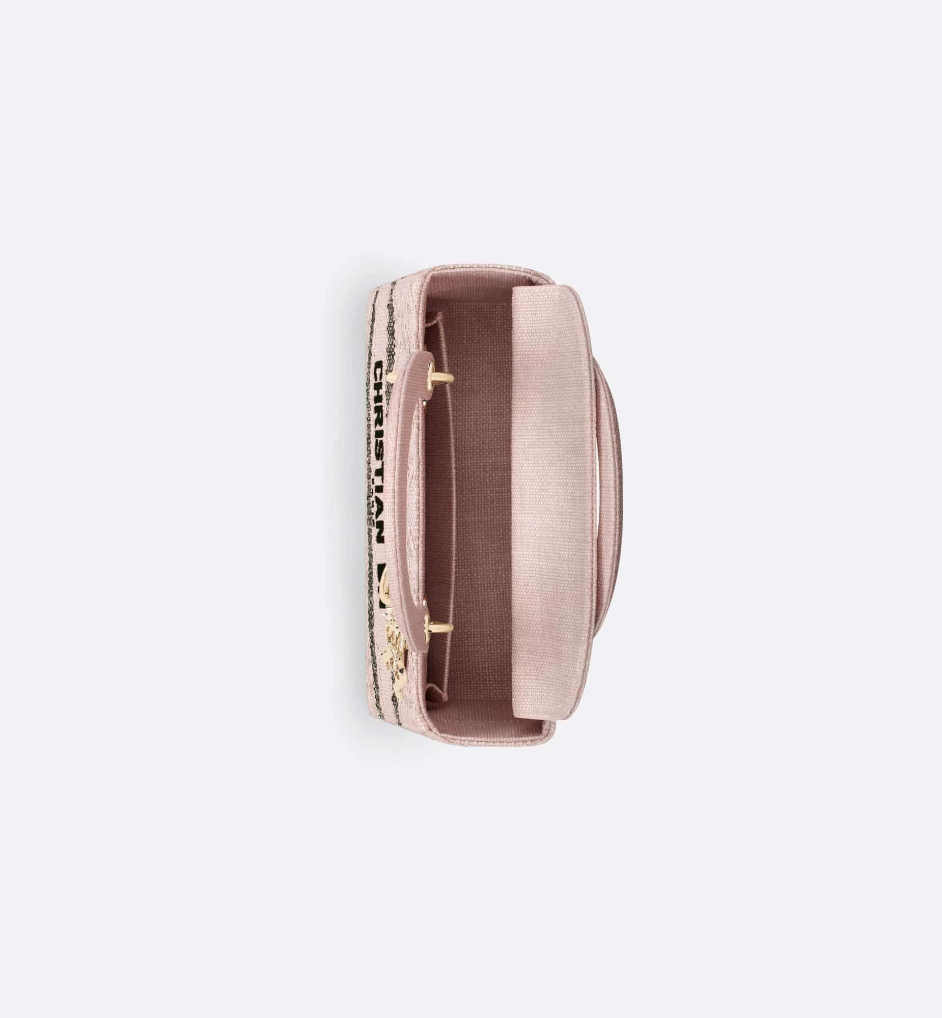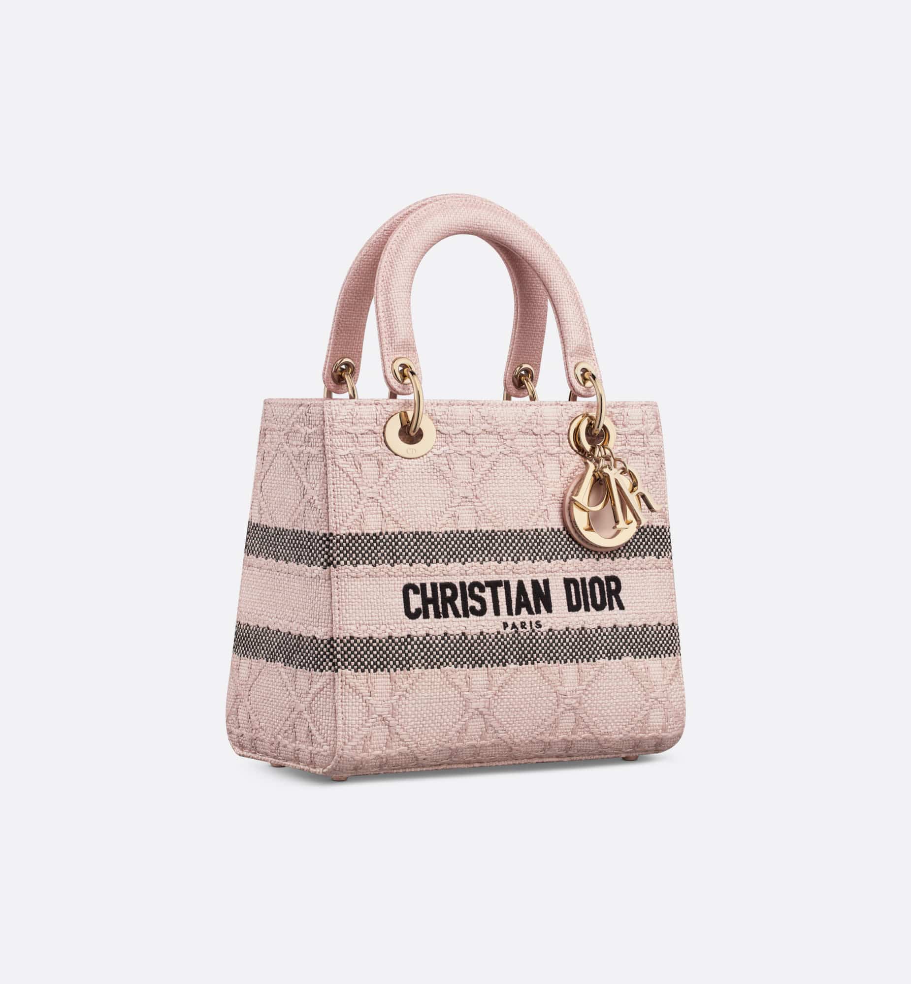 The Lady D-Lite bag combines classic elegance with House modernity. Crafted in powder pink raffia, it showcases hallmark Cannage stitching. A Christian Dior Paris signature adorns the front, while D.I.O.R. charms in pale gold-finish metal further embellish and illuminate the silhouette. Featuring a wide, removable and reversible embroidered shoulder strap, the medium Lady D-Lite bag can be carried by hand or worn crossbody.