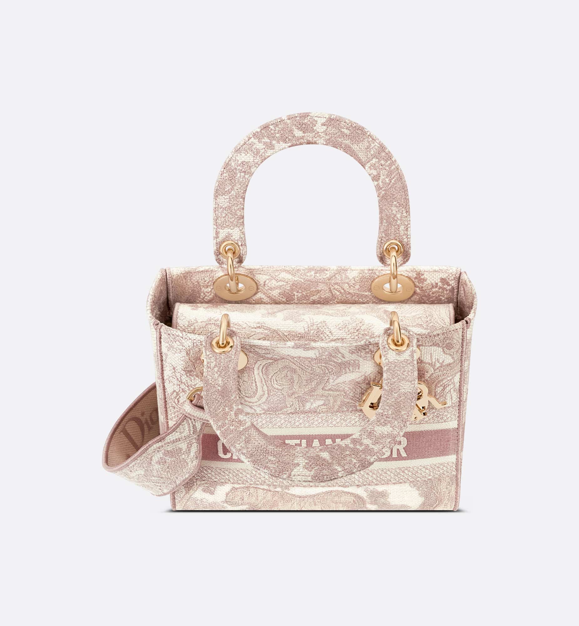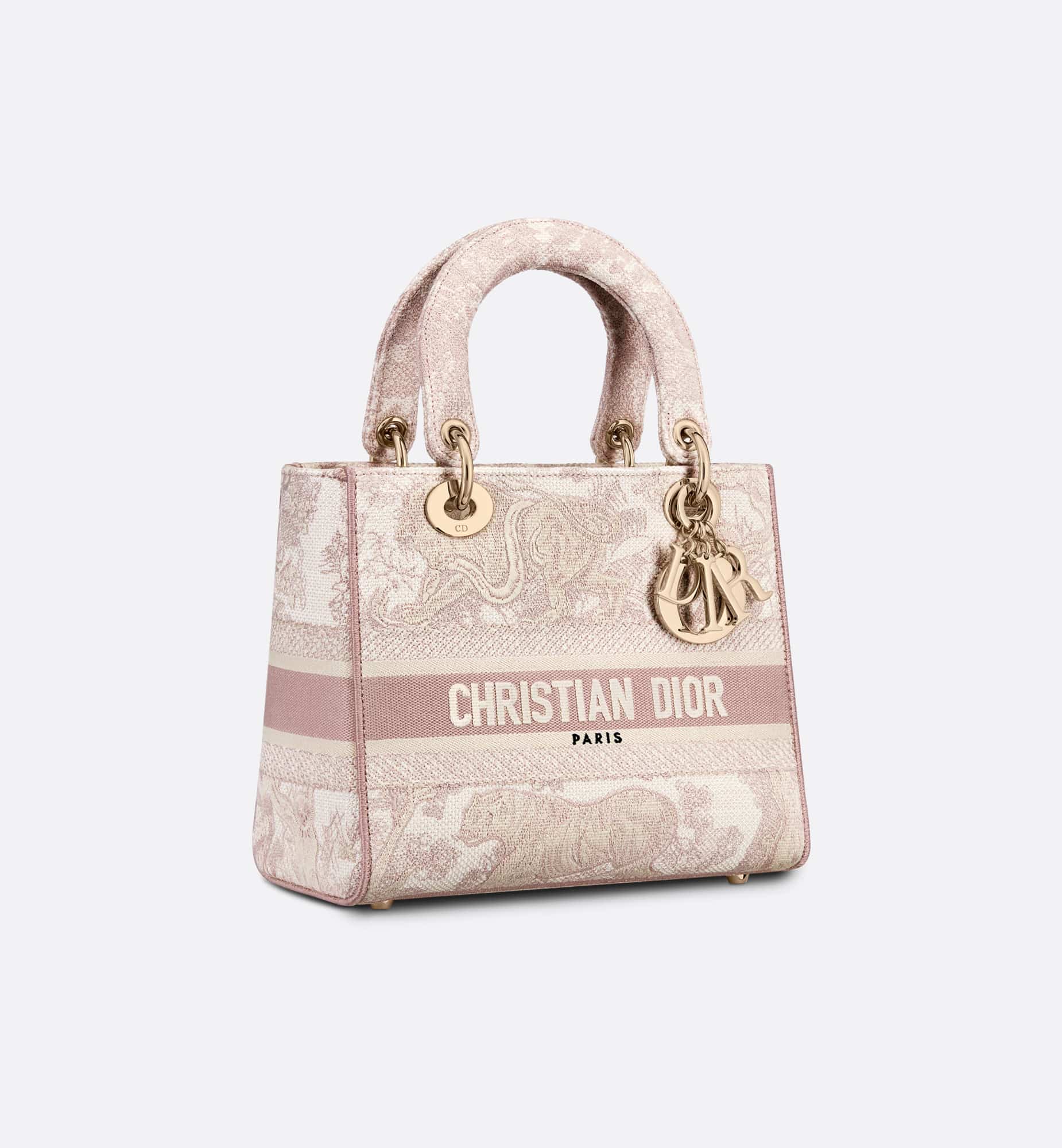 The Lady D-Lite bag combines classic elegance with House modernity. The style is fully embroidered with the Rose des Vents Toile de Jouy motif. A Christian Dior Paris signature adorns the front, while thick D.I.O.R. charms in pale gold-finish metal further enhance and highlight the silhouette. Featuring a wide, reversible and removable embroidered shoulder strap, the medium Lady D-Lite bag can be carried by hand or worn crossbody.