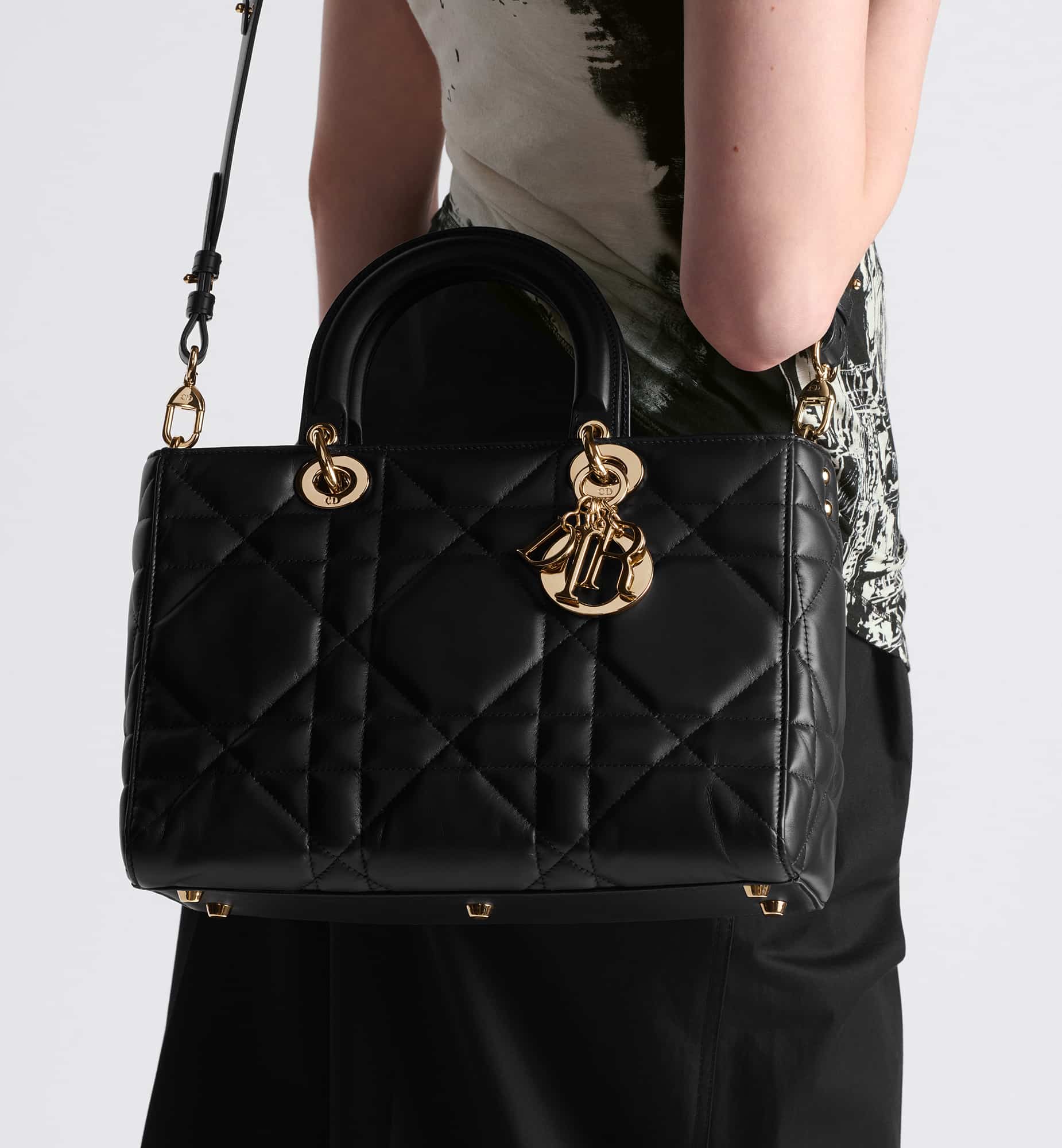 The Lady D-Sire My ABCDior bag is inspired by the elegance of the iconic Lady Dior, revisited with the urban aesthetic of a supple and unstructured form. The black calfskin showcases Maxicannage topstitching in a nod to the House hallmark, while pale gold-finish metal D.I.O.R. charms accent the silhouette. Featuring a shoulder strap that can be personalized with symbolic badges, the unique medium bag can be carried by hand or worn crossbody.