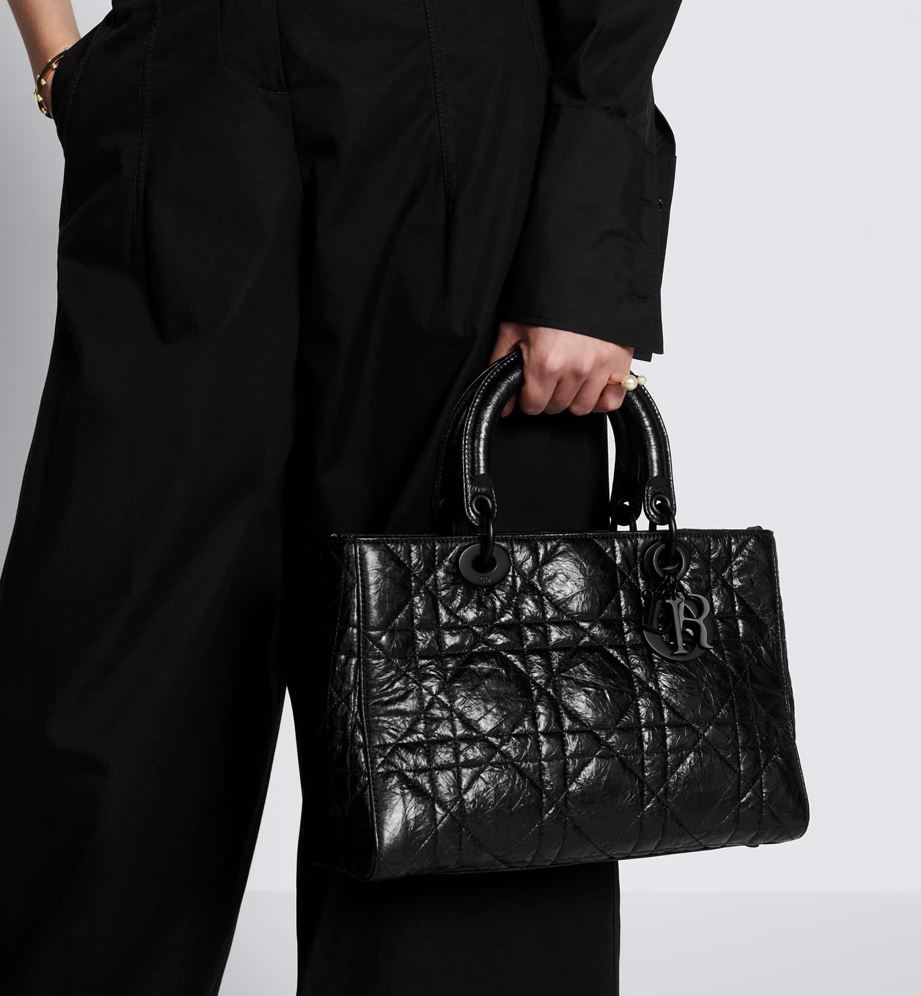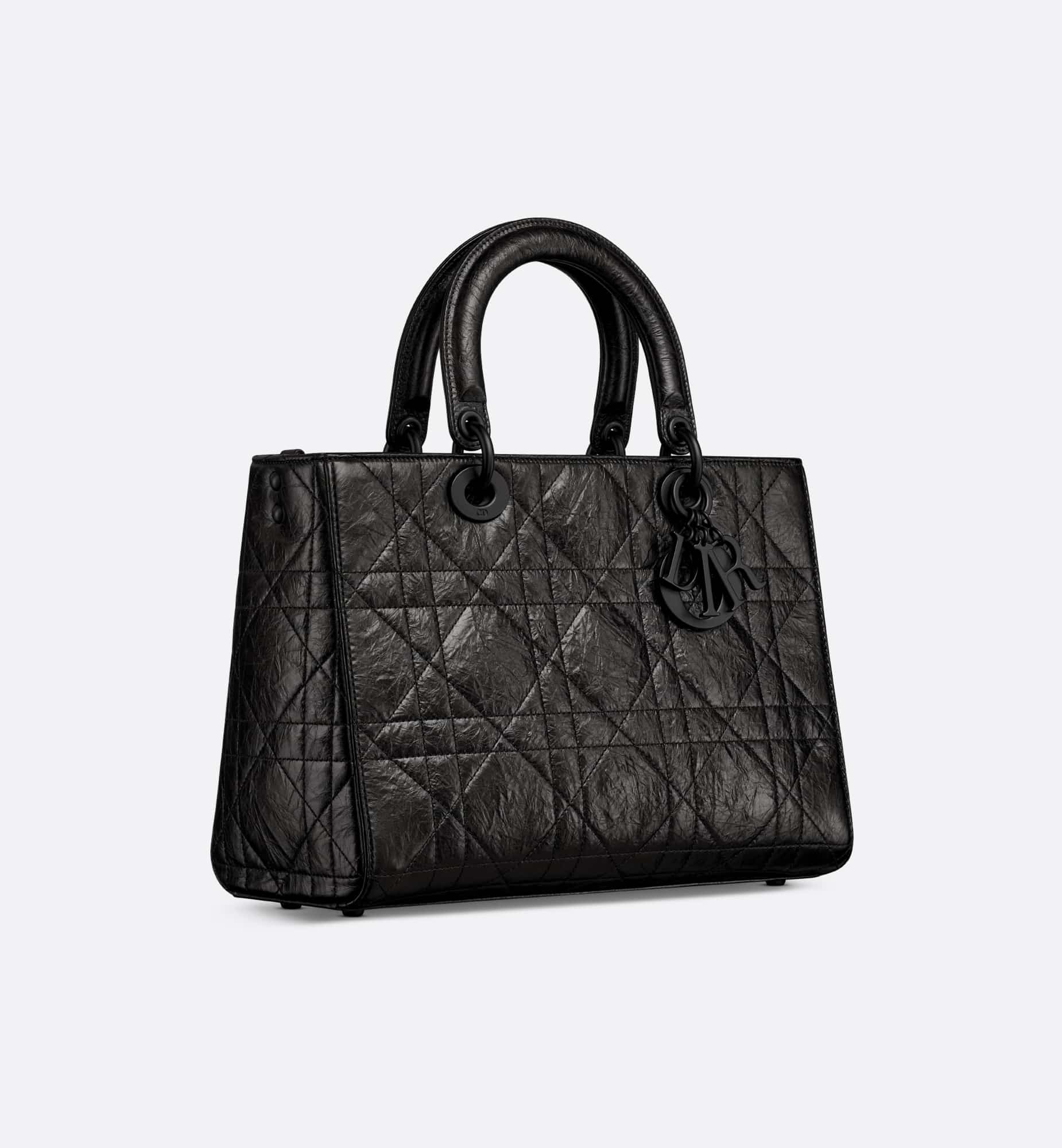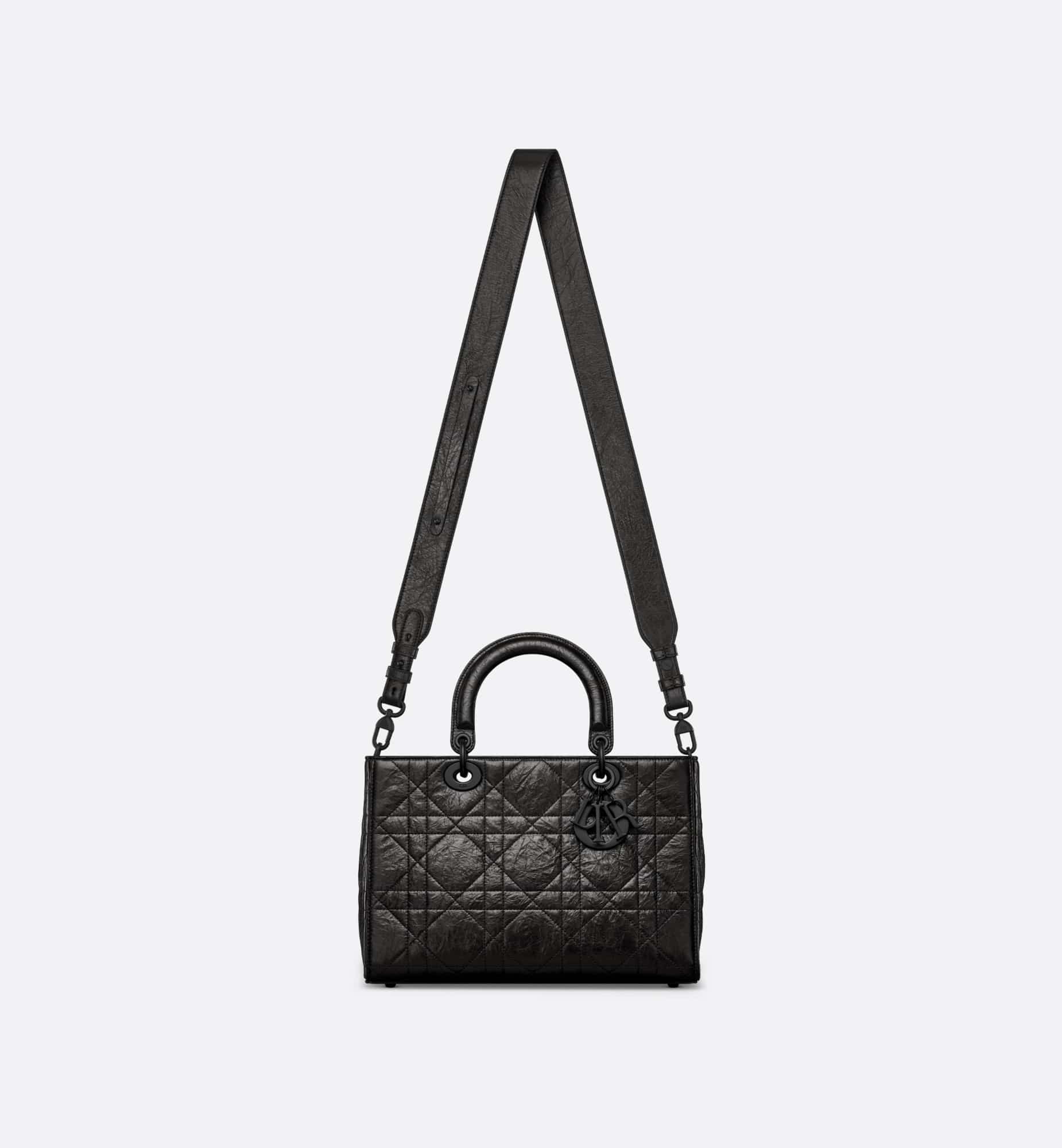 New for the season and appearing in the Spring-Summer 2024 Fashion Show, the Lady D-Sire My ABCDior bag draws inspiration from the iconic elegance of the Lady Dior design. Reimagined with a casual style for an urban look, the black crinkled calfskin is accented by Macrocannage topstitching, while tonal ultra-matte metal D.I.O.R. charms lend a modern touch. Showcasing a shoulder strap that can be personalized by adding symbolic badges, the unique medium bag can be carried by hand or worn crossbody.