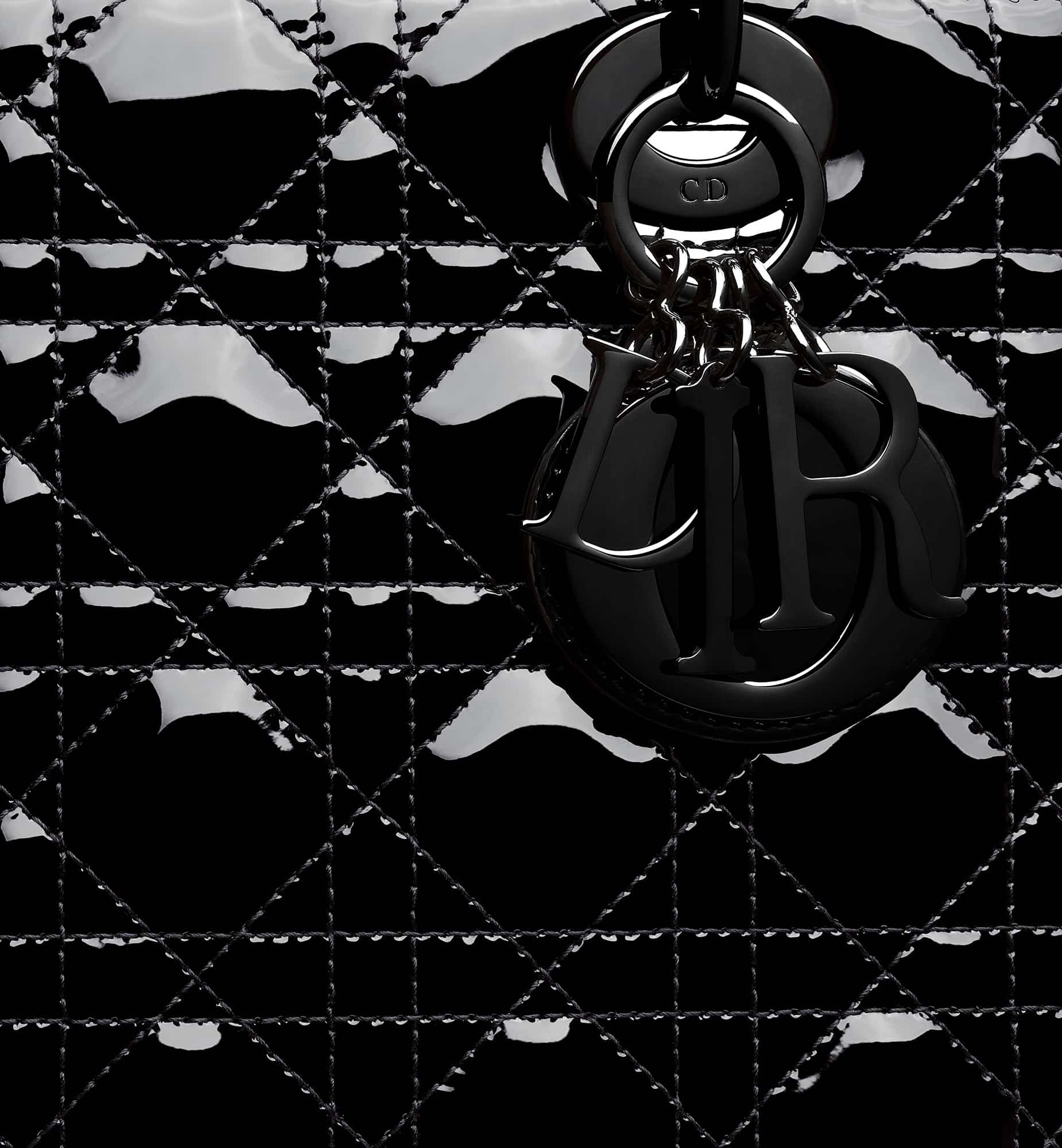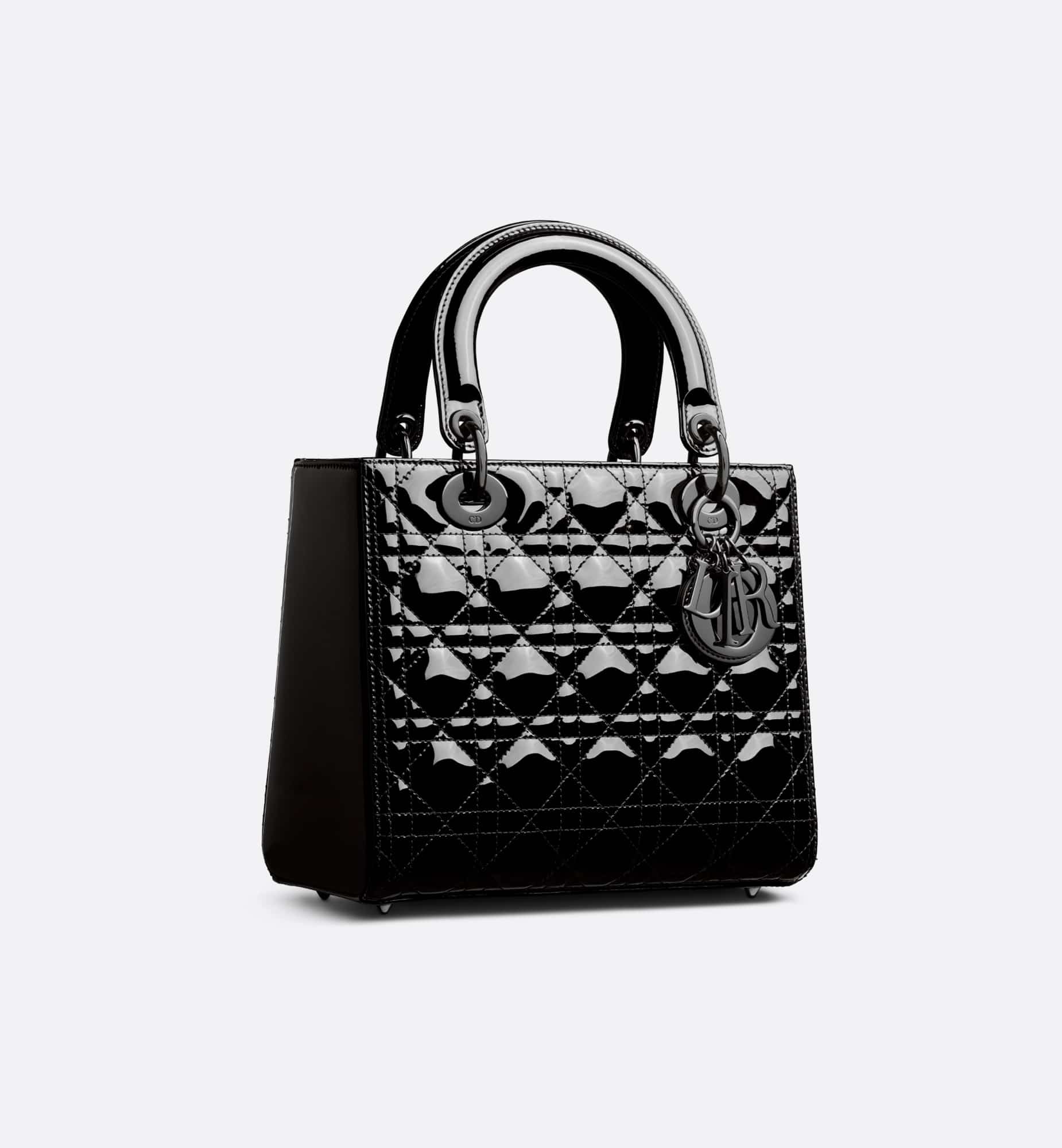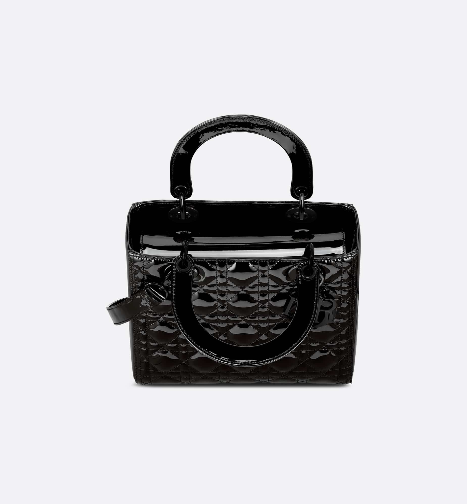 The Lady Dior bag epitomizes the House’s vision of elegance and beauty. Sleek and refined, the timeless style is crafted in black ultraglossy patent calfskin and covered with Cannage stitching, creating the instantly recognizable quilted texture, while shiny black metal D.I.O.R. charms further embellish its silhouette. Featuring a thin, removable leather shoulder strap, the medium Lady Dior bag can be carried by hand or worn crossbody.