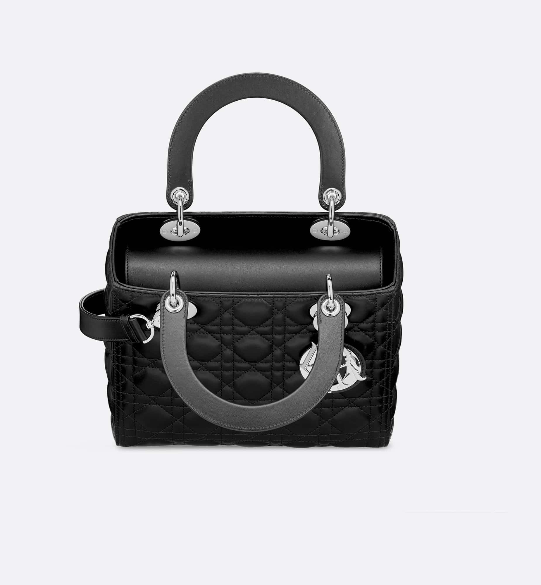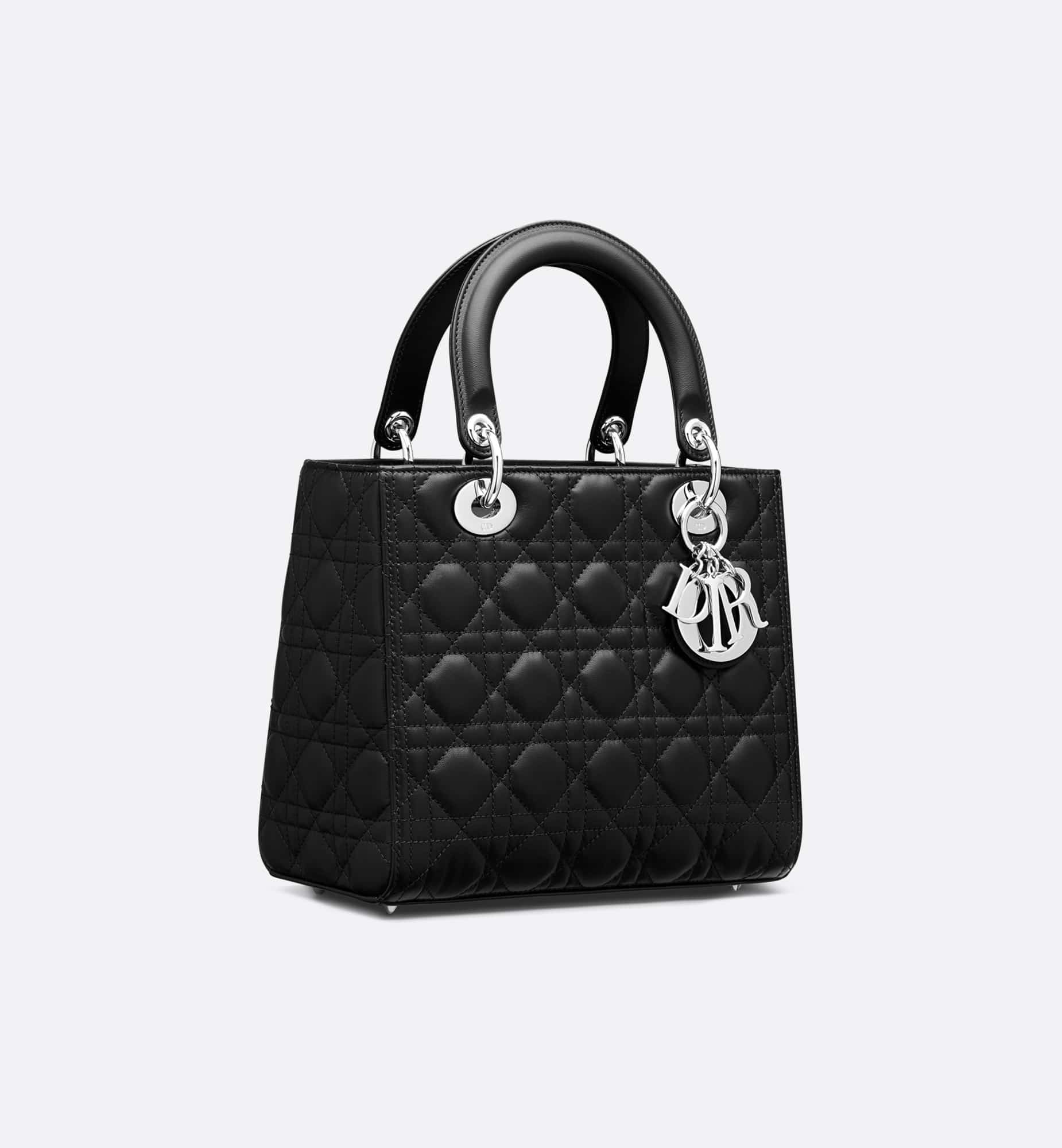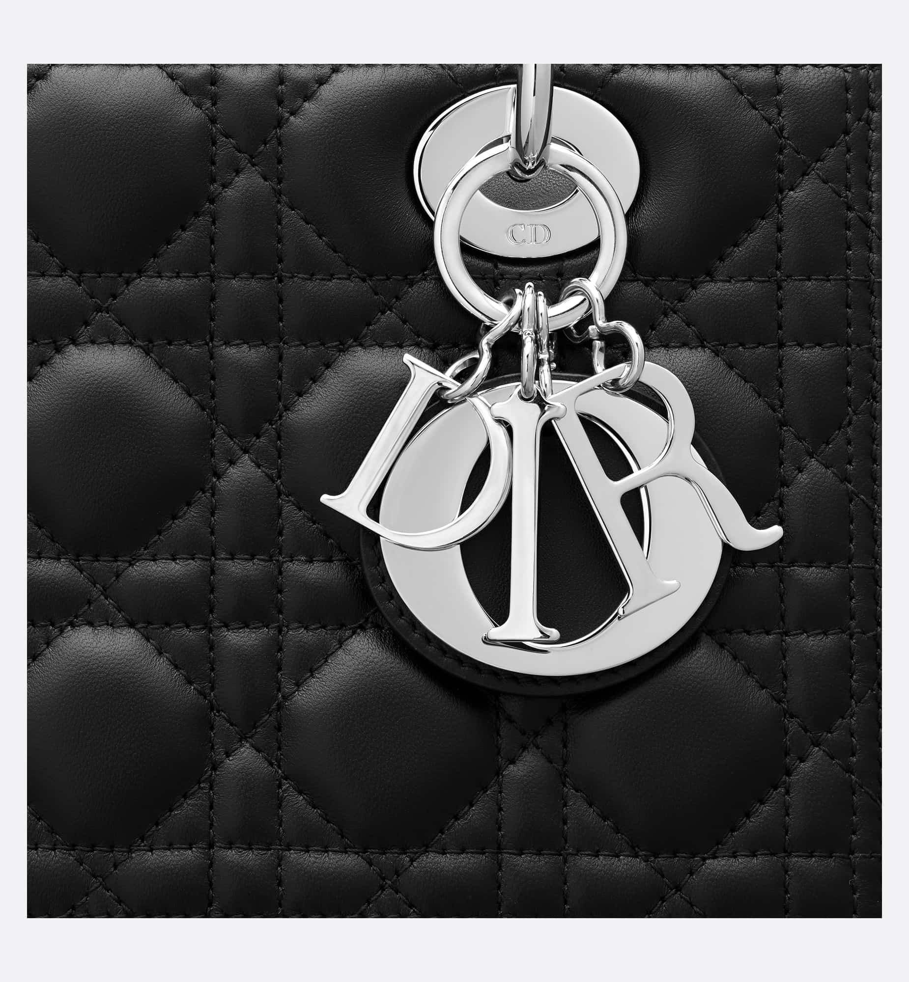 The Lady Dior bag embodies Dior’s vision of elegance and beauty. Sleek and refined, the timeless yet relevant style is crafted in black lambskin with Cannage stitching, creating the instantly recognizable quilted texture. The silver-finish metal D.I.O.R. charms offer an elegant allure. Featuring a thin, removable leather strap, the medium Lady Dior bag can be carried by hand, worn over the shoulder or crossbody.