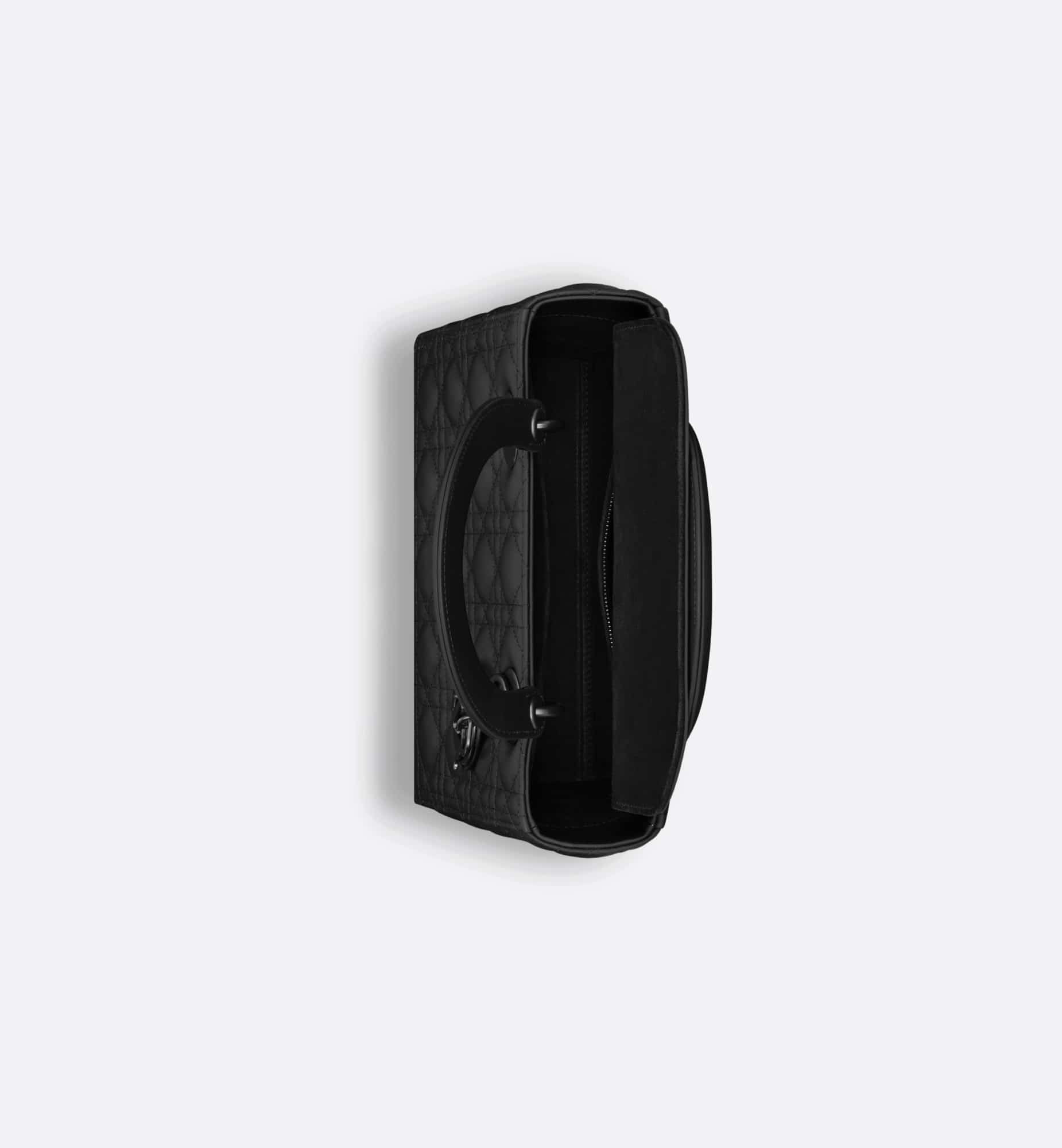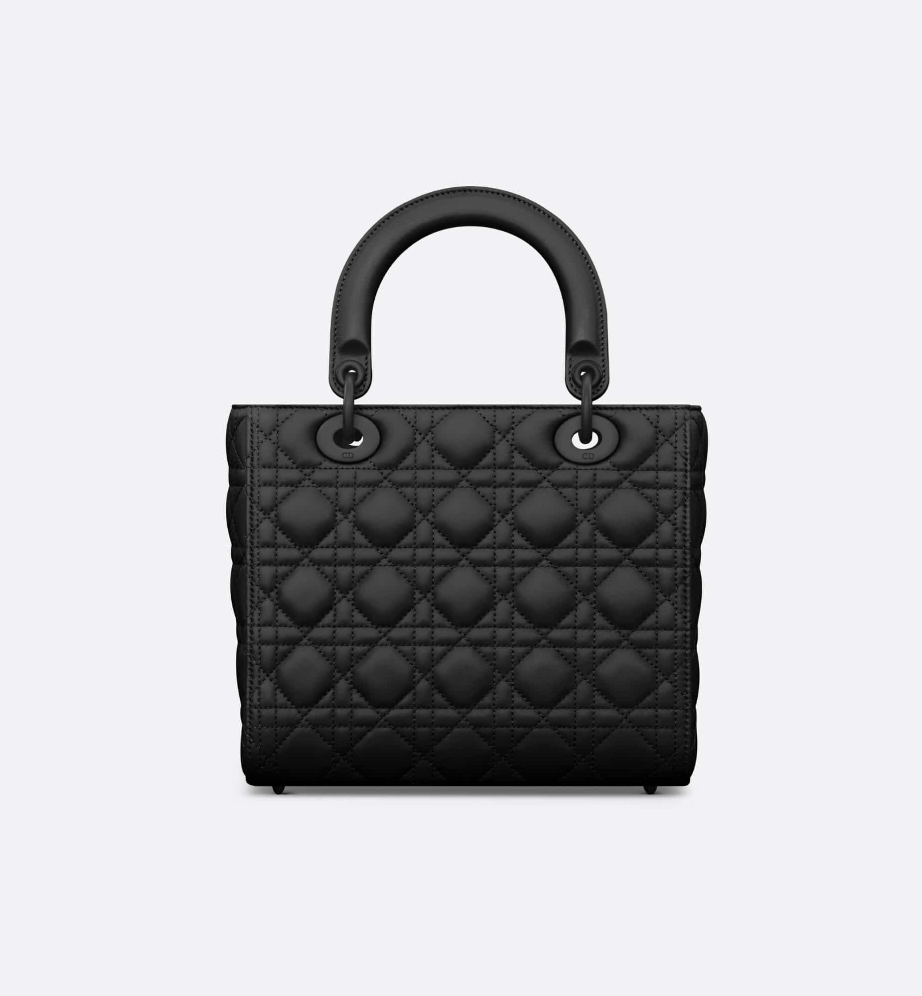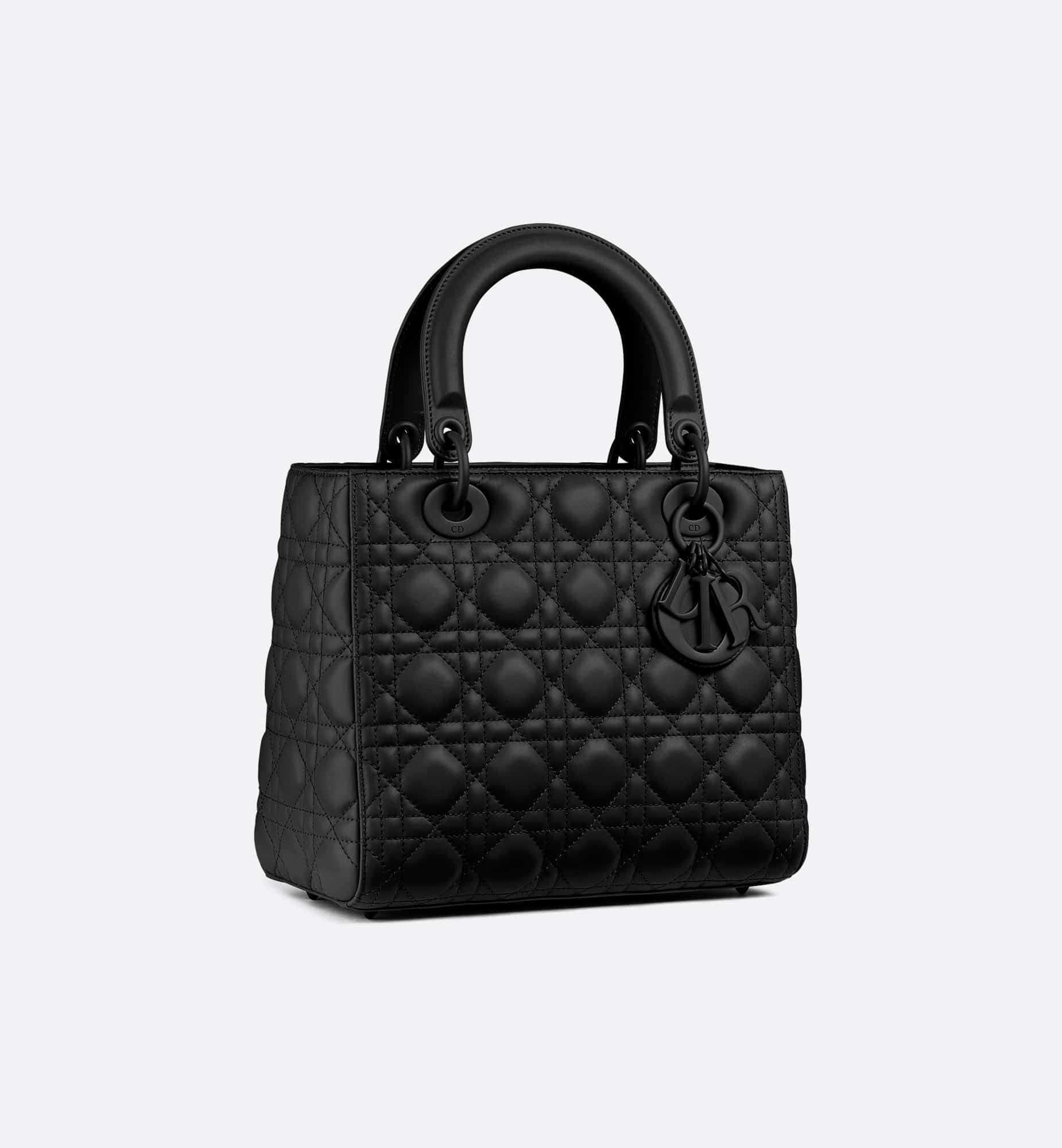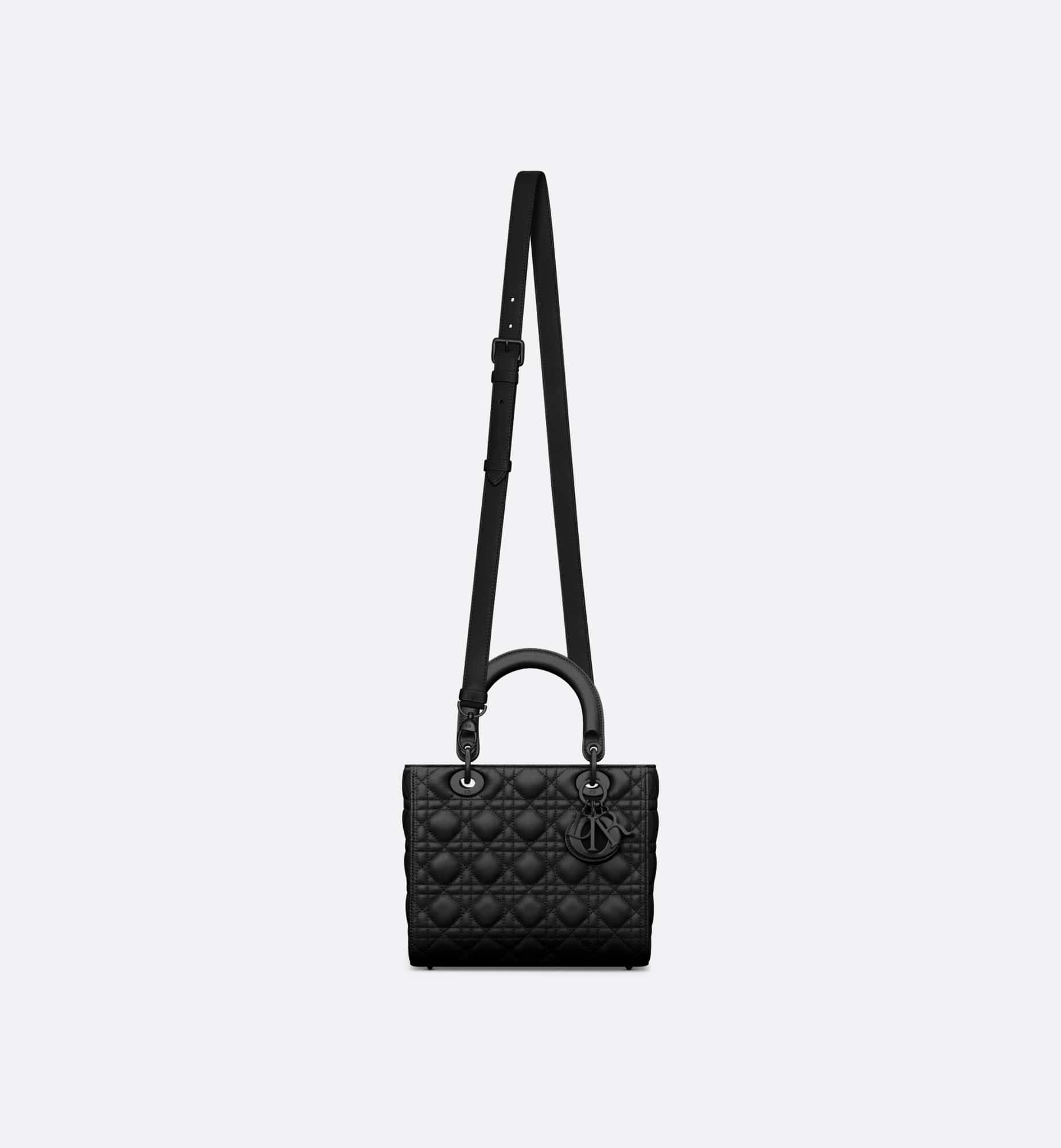 The Lady Dior bag epitomizes the House’s vision of elegance and beauty. Sleek and refined, the timeless yet relevant style is crafted in black ultramatte calfskin with Cannage stitching, creating the instantly recognizable quilted texture. The tonal metal D.I.O.R. charms complete and illuminate the silhouette. Featuring a thin, removable leather strap, the medium Lady Dior bag can be carried by hand, worn over the shoulder or crossbody.