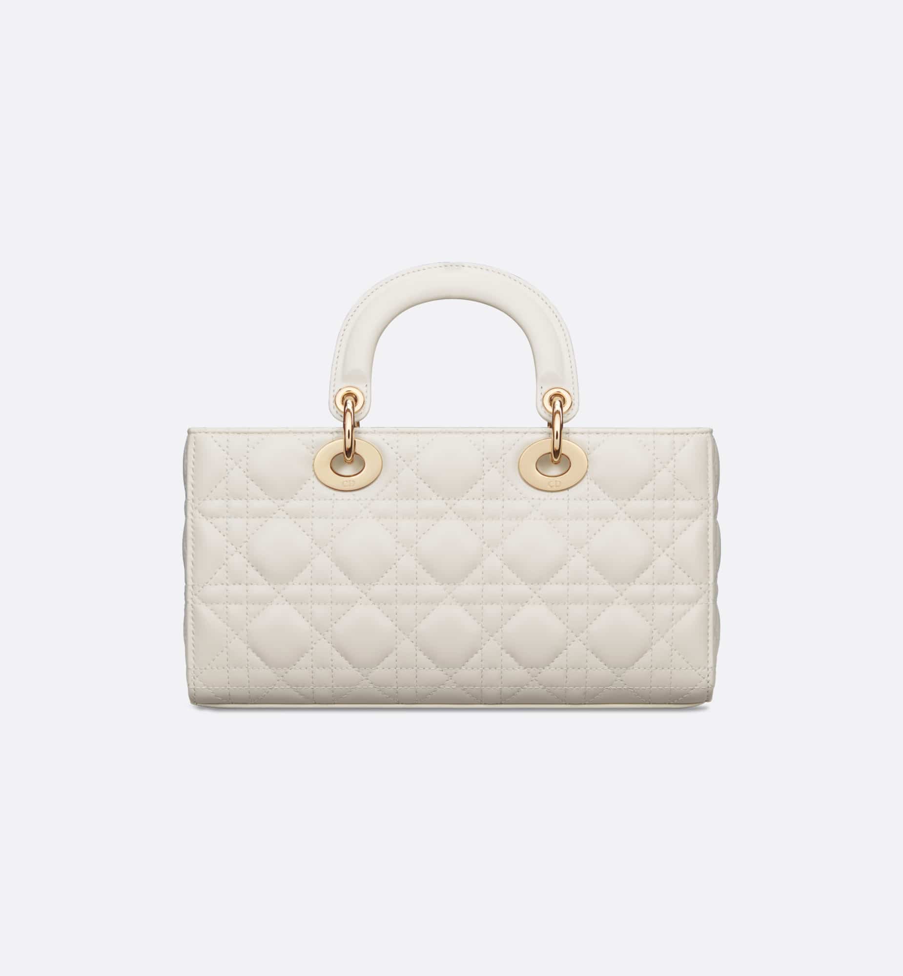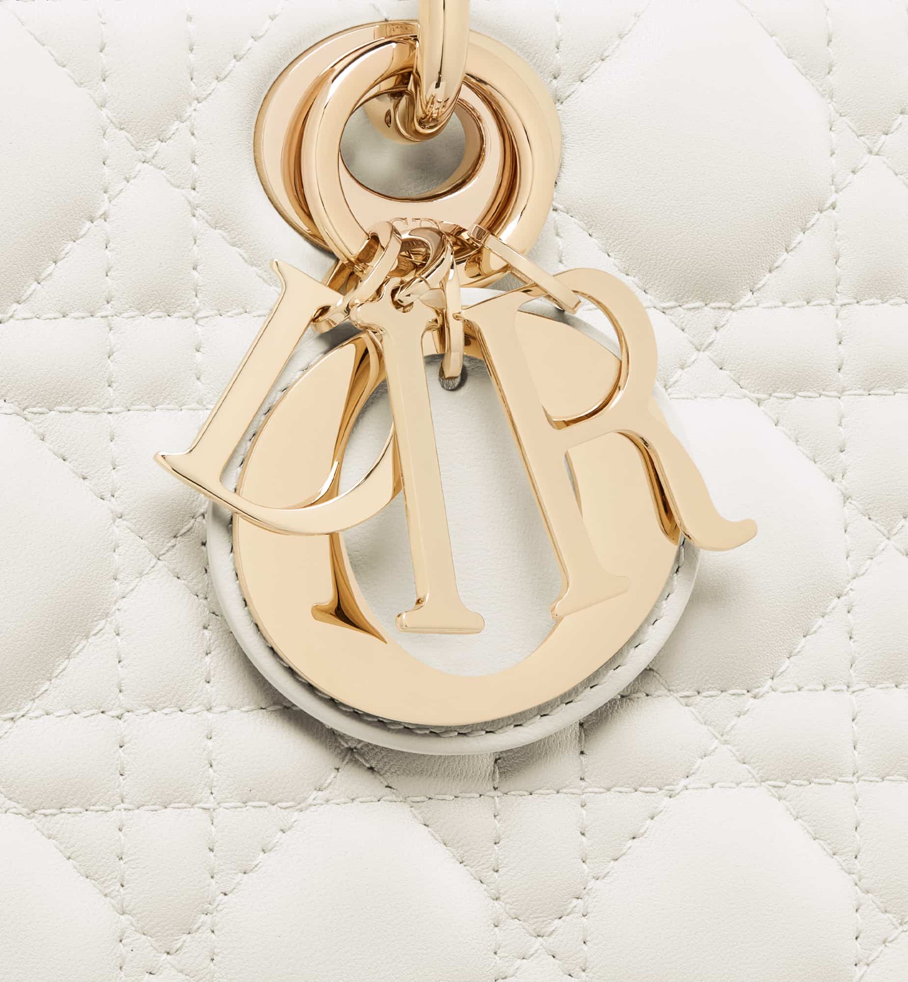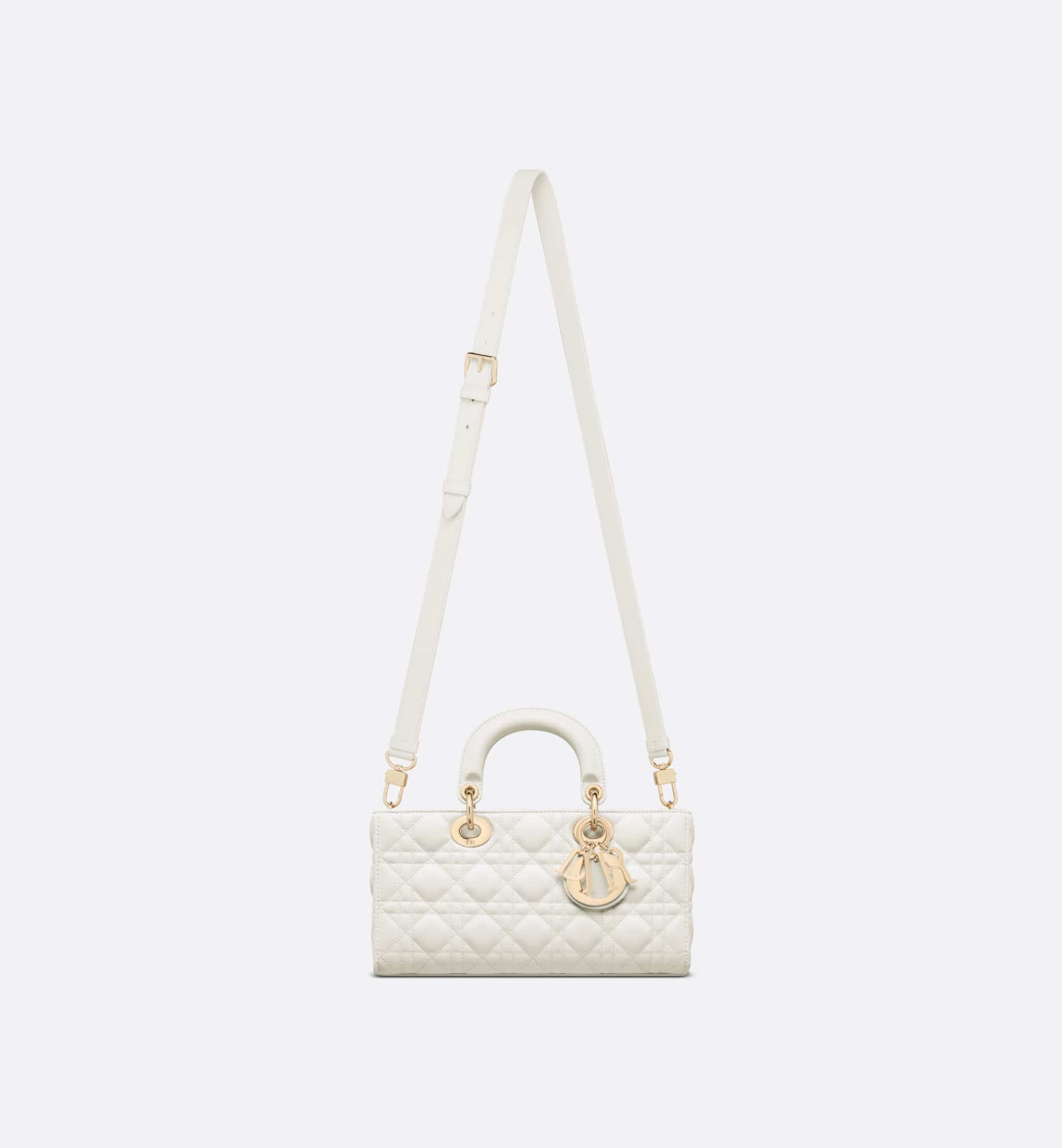 The Lady D-Joy bag captures the House’s vision of elegance and beauty. Refined and sleek, this timeless style showcases the iconic streamlined aesthetic of the Lady Dior line. Crafted in latte lambskin with Cannage stitching, it is enhanced by pale gold-finish metal D.I.O.R. charms embellishing its silhouette. Featuring one removable chain shoulder strap and another adjustable and removable leather shoulder strap, the medium Lady D-Joy bag can be carried by hand or worn crossbody as a daily companion.