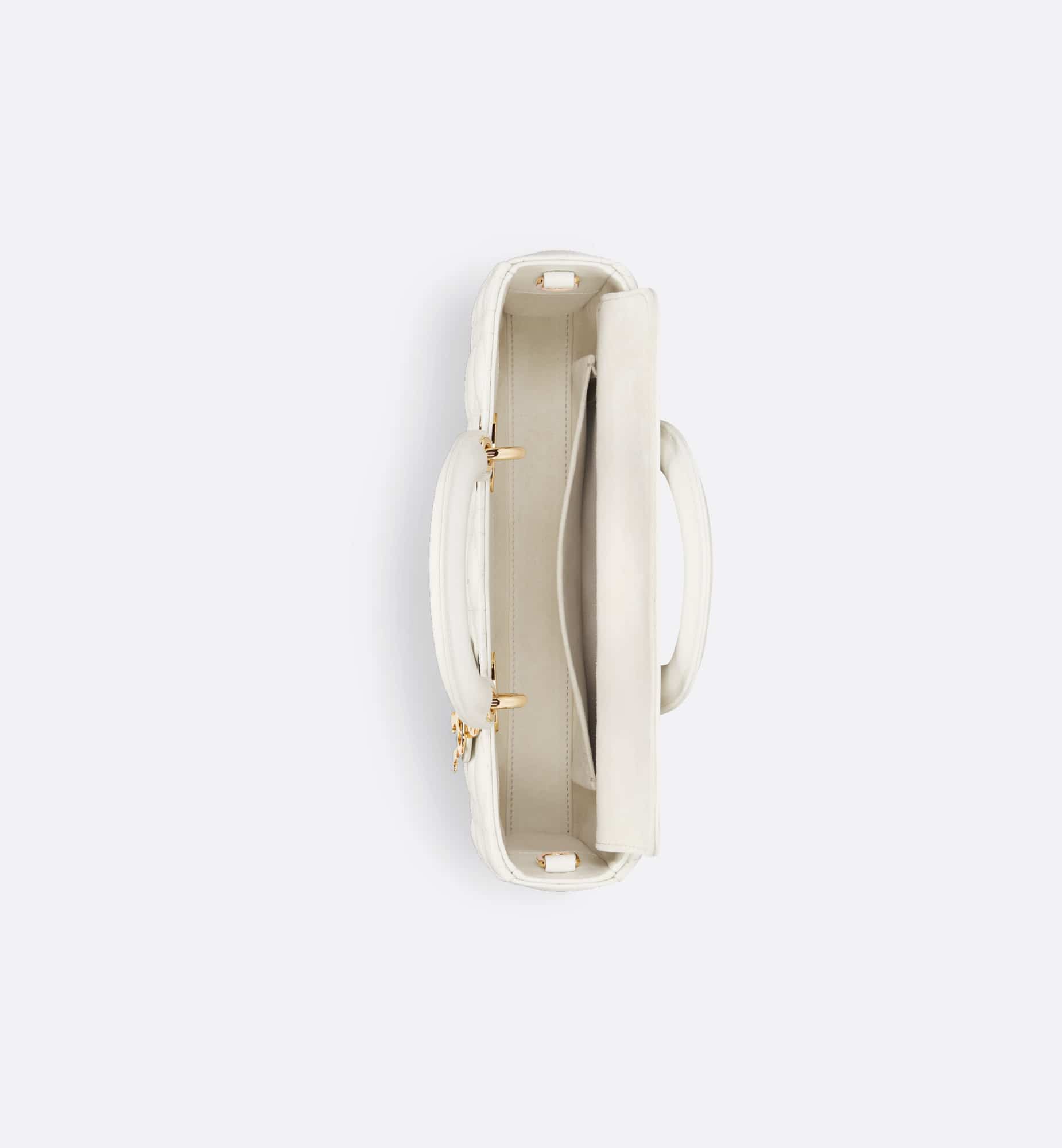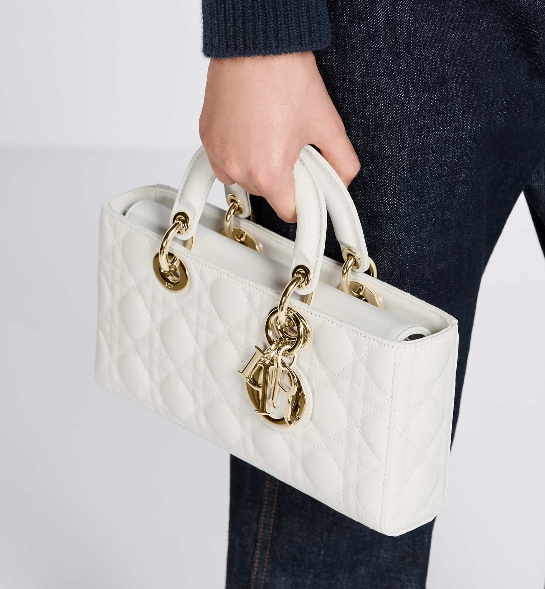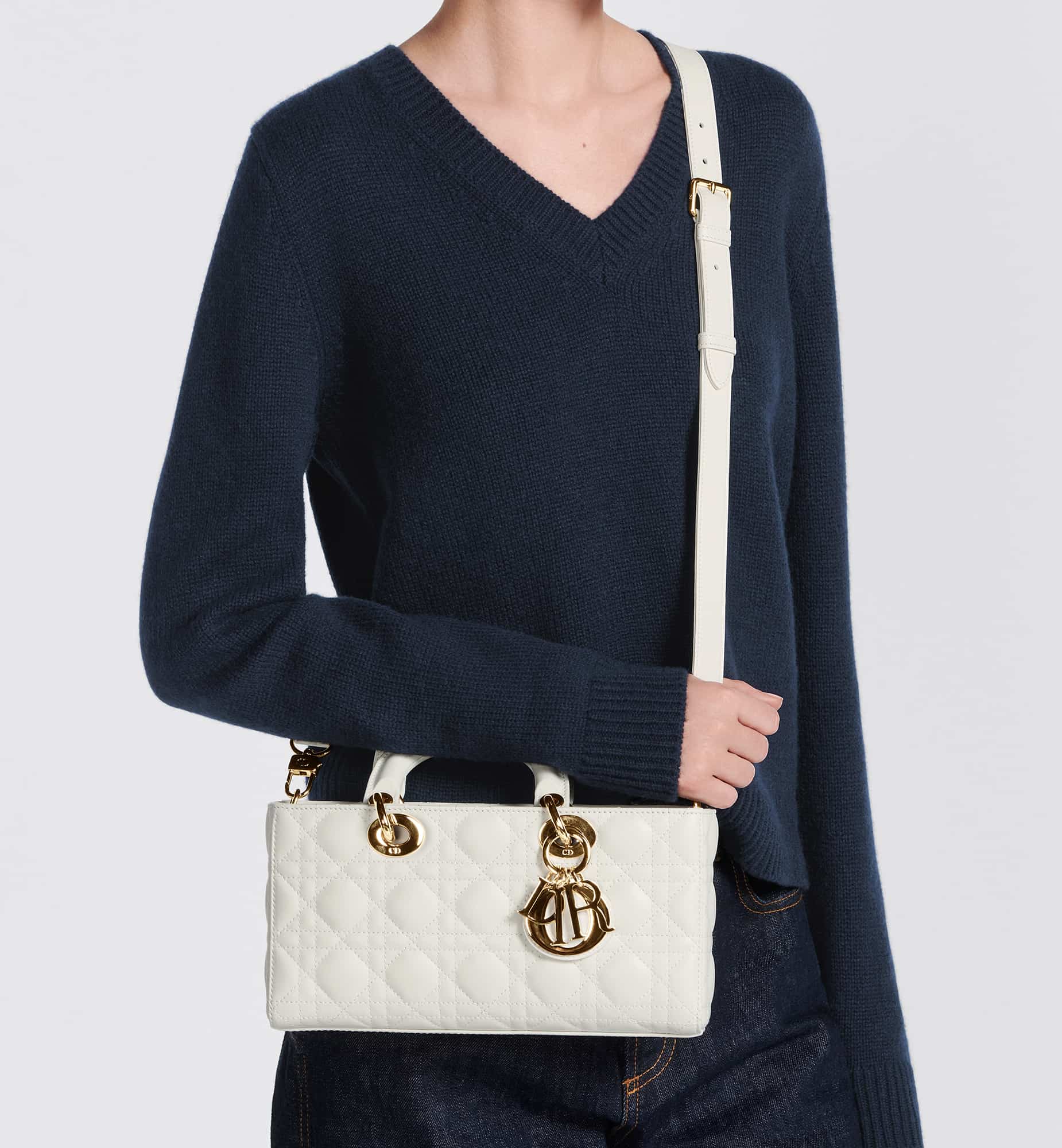 The Lady D-Joy bag captures the House’s vision of elegance and beauty. Refined and sleek, this timeless style showcases the iconic streamlined aesthetic of the Lady Dior line. Crafted in latte lambskin with Cannage stitching, it is enhanced by pale gold-finish metal D.I.O.R. charms embellishing its silhouette. Featuring one removable chain shoulder strap and another adjustable and removable leather shoulder strap, the medium Lady D-Joy bag can be carried by hand or worn crossbody as a daily companion.