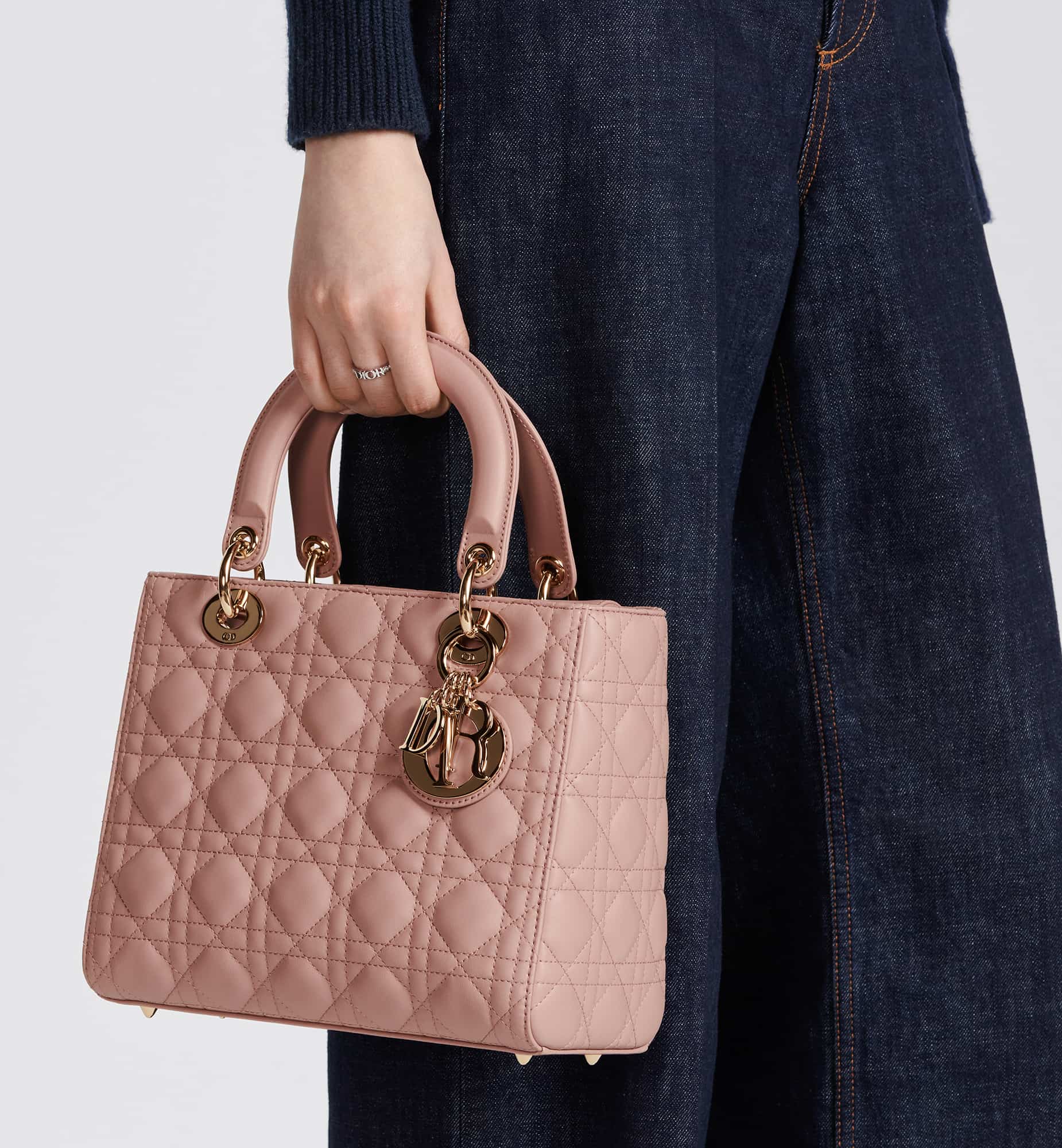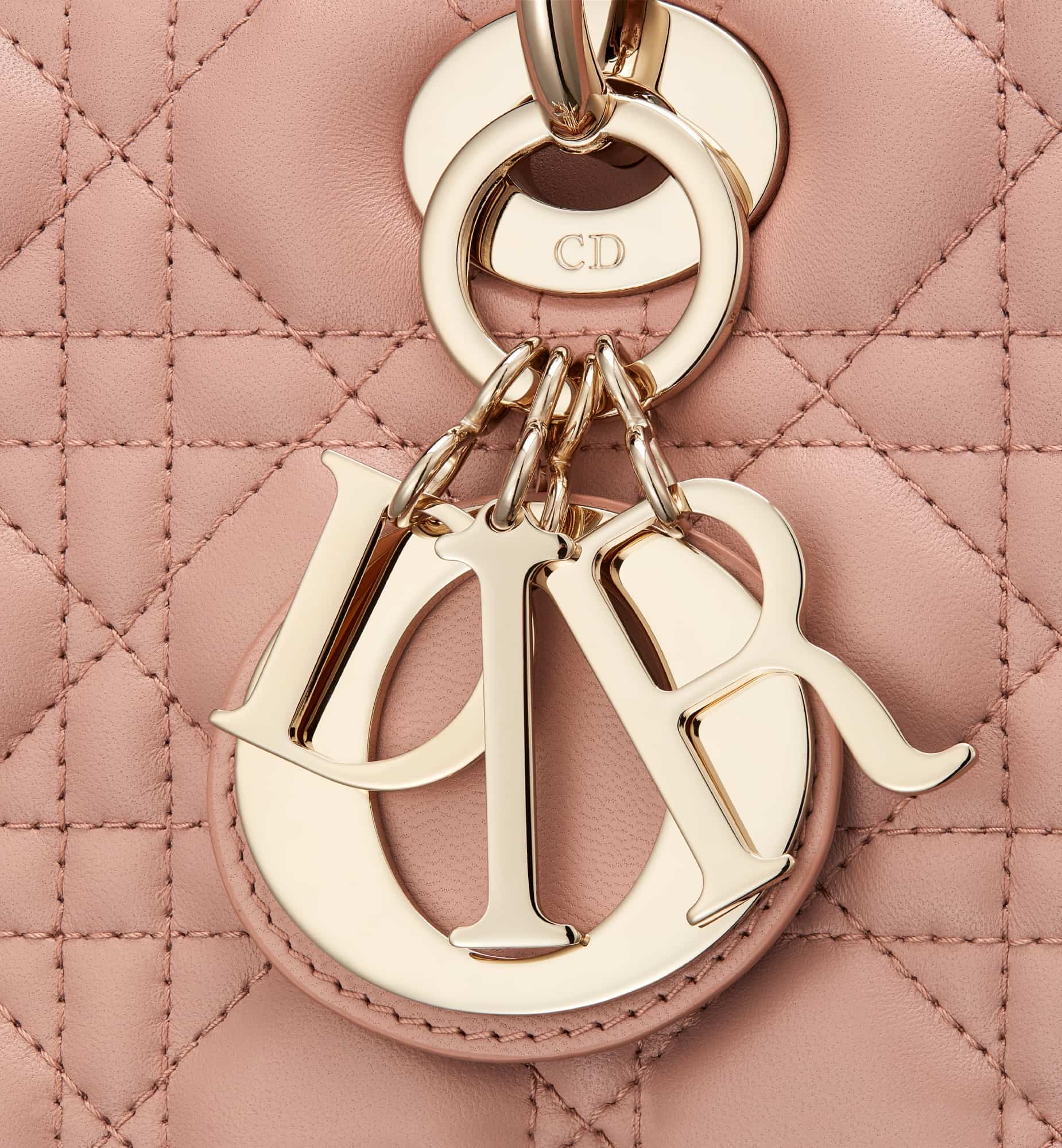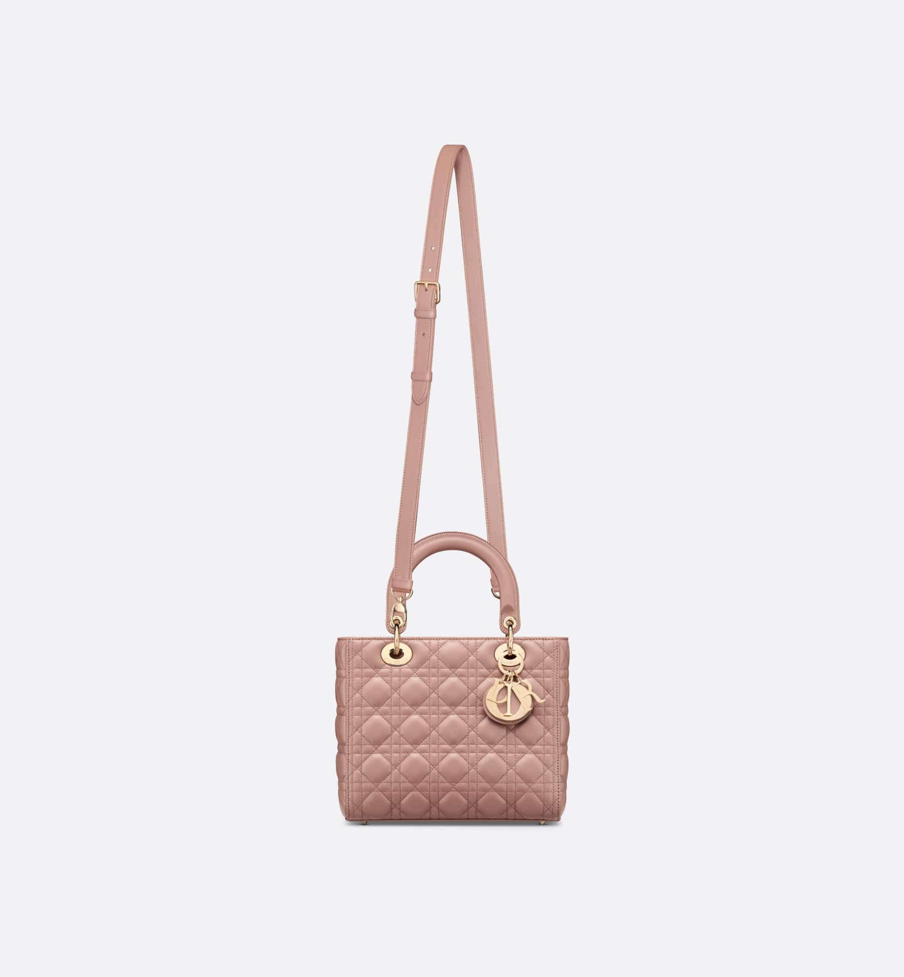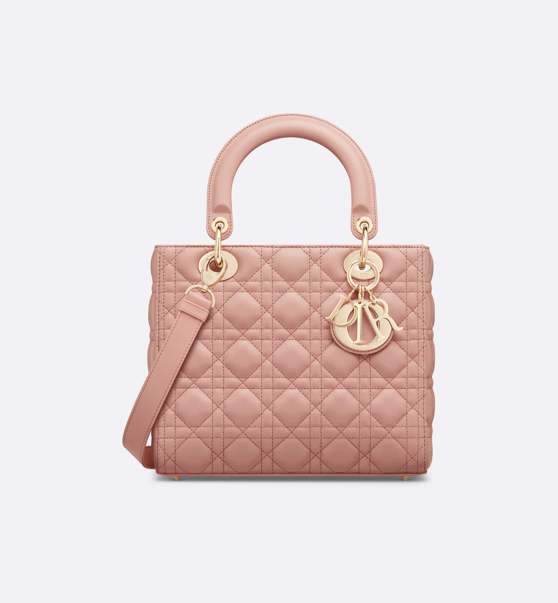 The Lady Dior bag epitomizes the House’s vision of elegance and beauty. Sleek and refined, the timeless style is crafted in blush lambskin with Cannage stitching, creating the instantly recognizable quilted texture, while the pale gold-finish metal D.I.O.R. charms offer an elegant allure. Featuring a thin, removable leather shoulder strap, the medium Lady Dior bag may be carried by hand or worn crossbody.