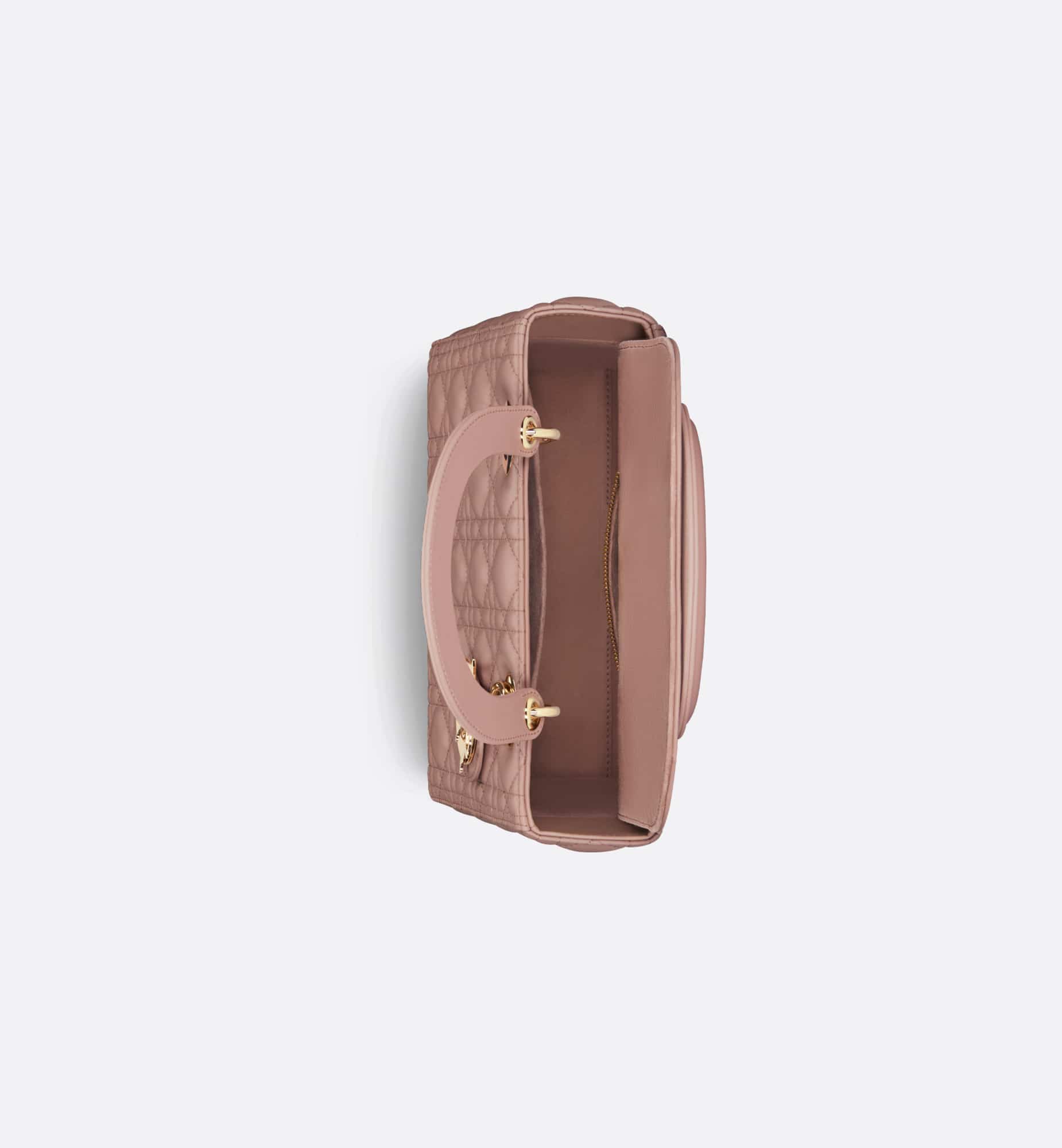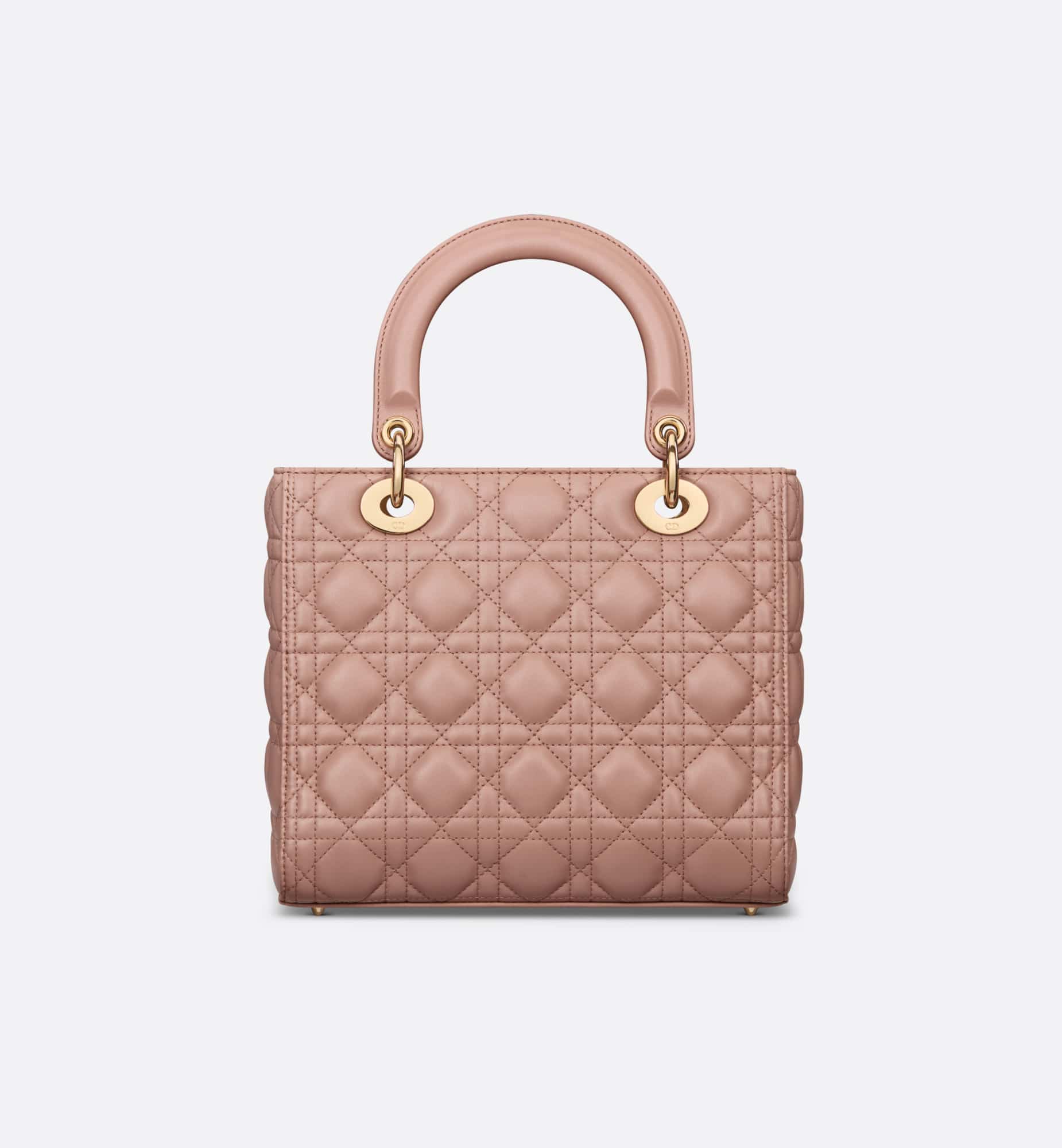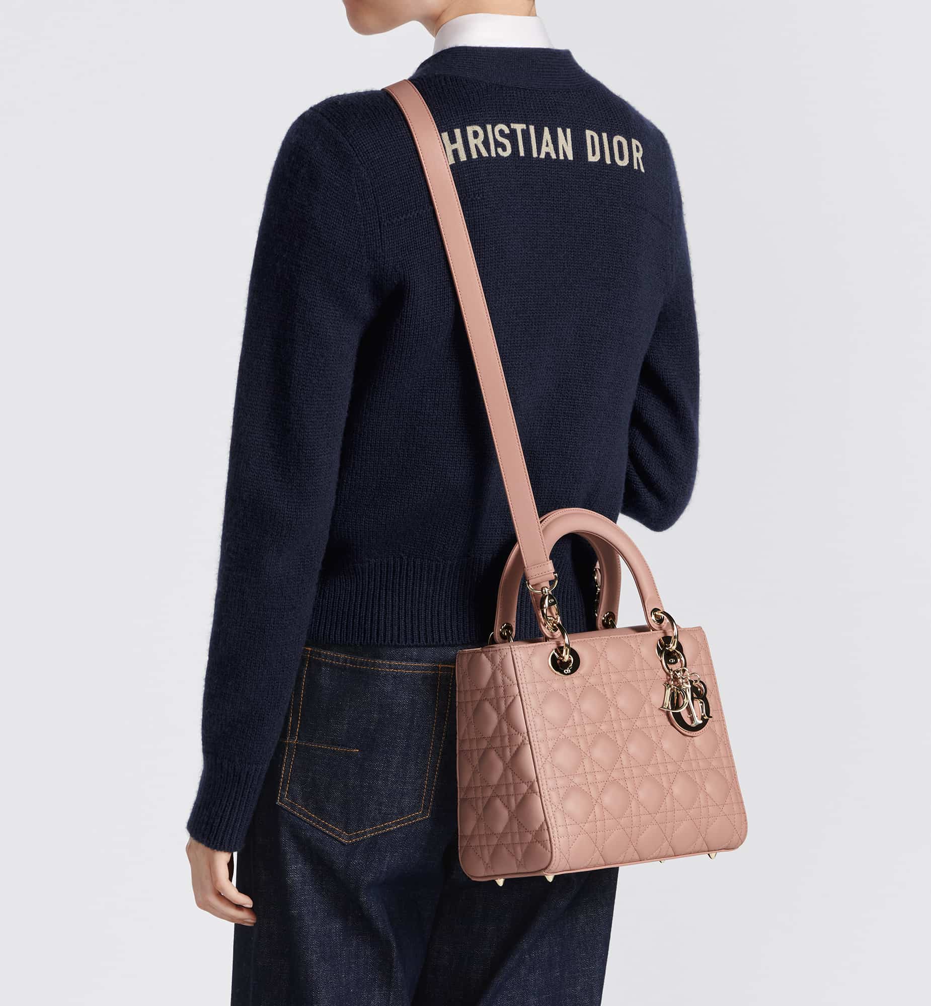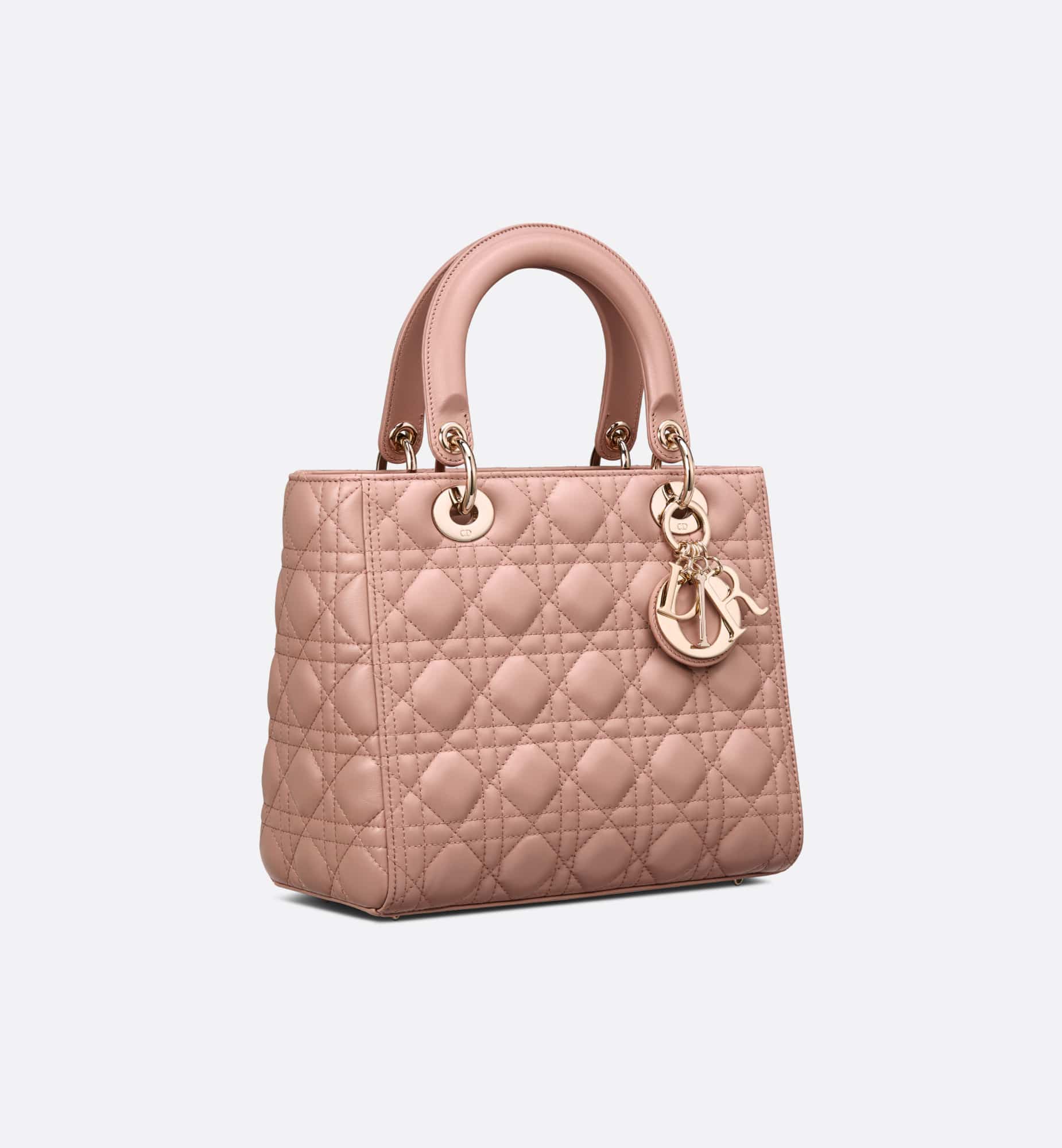 The Lady Dior bag epitomizes the House’s vision of elegance and beauty. Sleek and refined, the timeless style is crafted in blush lambskin with Cannage stitching, creating the instantly recognizable quilted texture, while the pale gold-finish metal D.I.O.R. charms offer an elegant allure. Featuring a thin, removable leather shoulder strap, the medium Lady Dior bag may be carried by hand or worn crossbody.