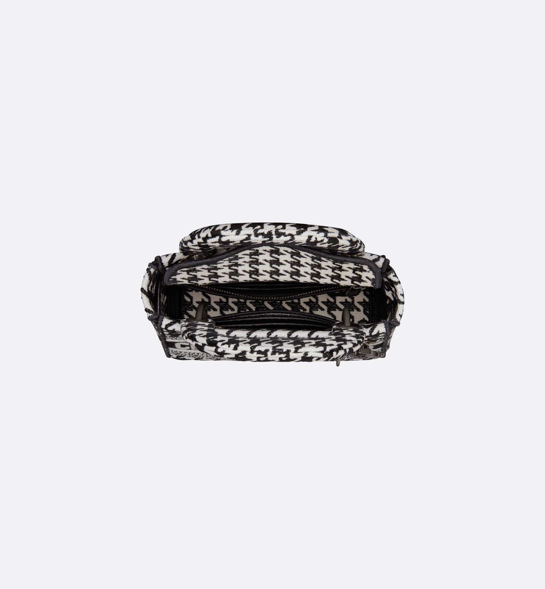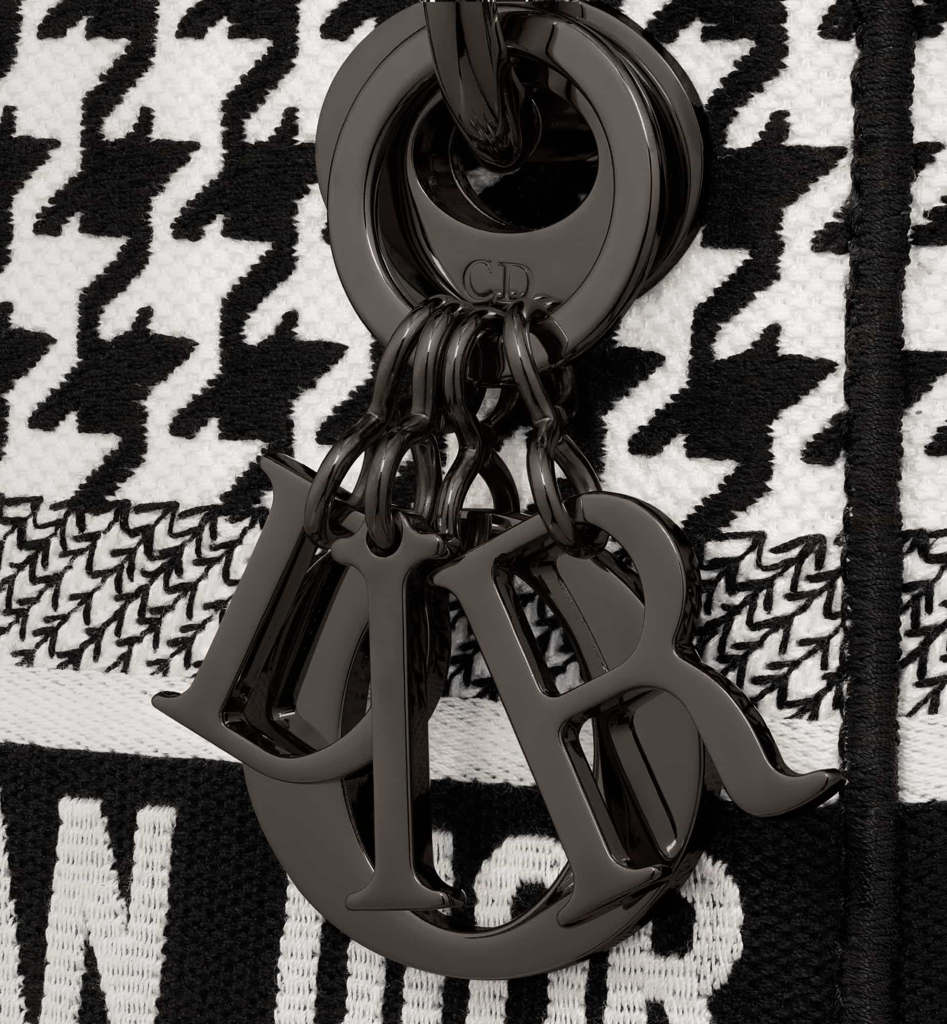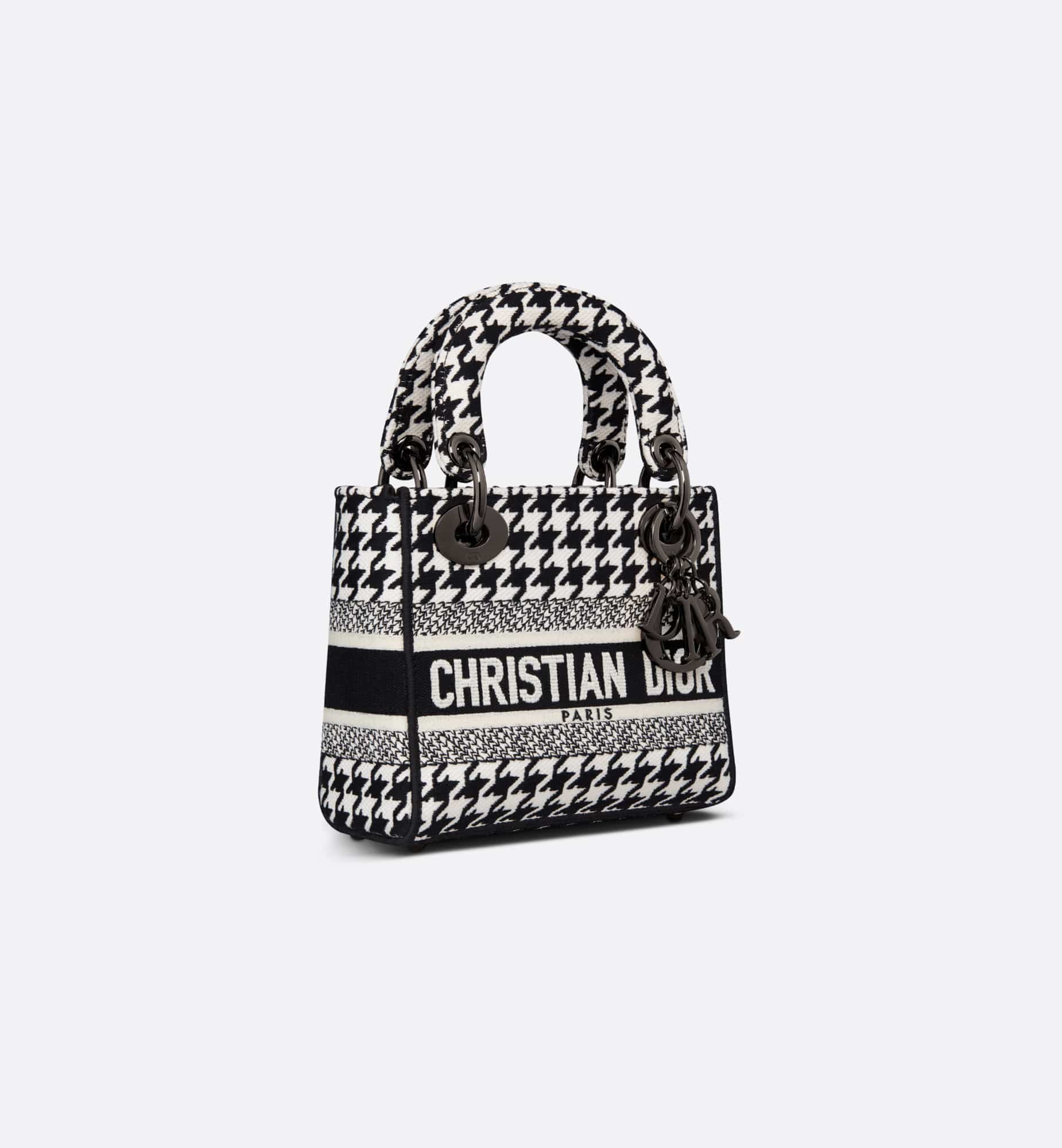 The Lady D-Lite bag combines classic elegance with House modernity. The style is fully embroidered with the black and white Houndstooth motif. A Christian Dior Paris signature accents the front, while ruthenium-finish metal D.I.O.R. charms embellish and illuminate the silhouette. Equipped with a wide, reversible and removable embroidered shoulder strap, the miniature Lady D-Lite bag can be carried by hand or worn crossbody.