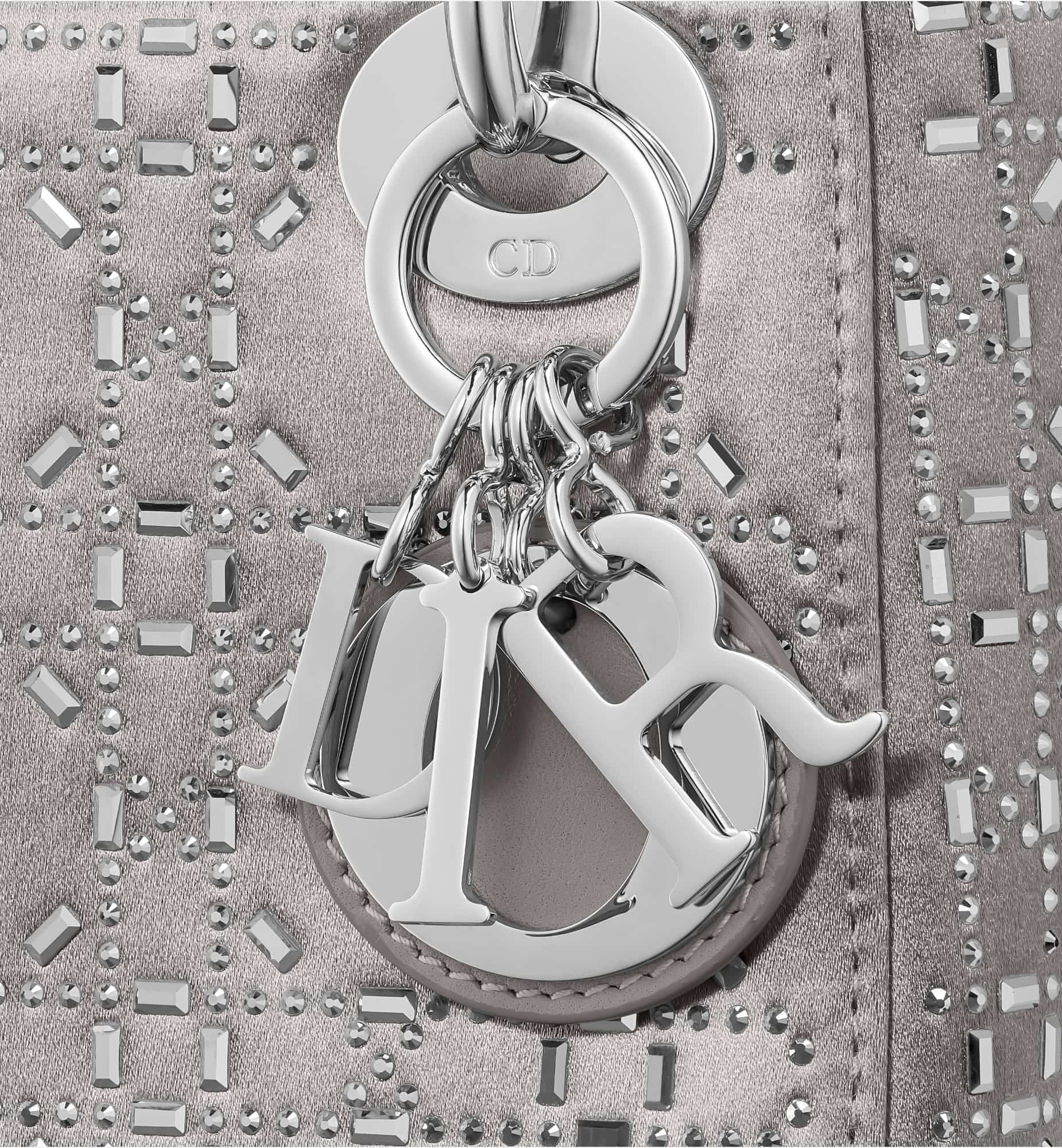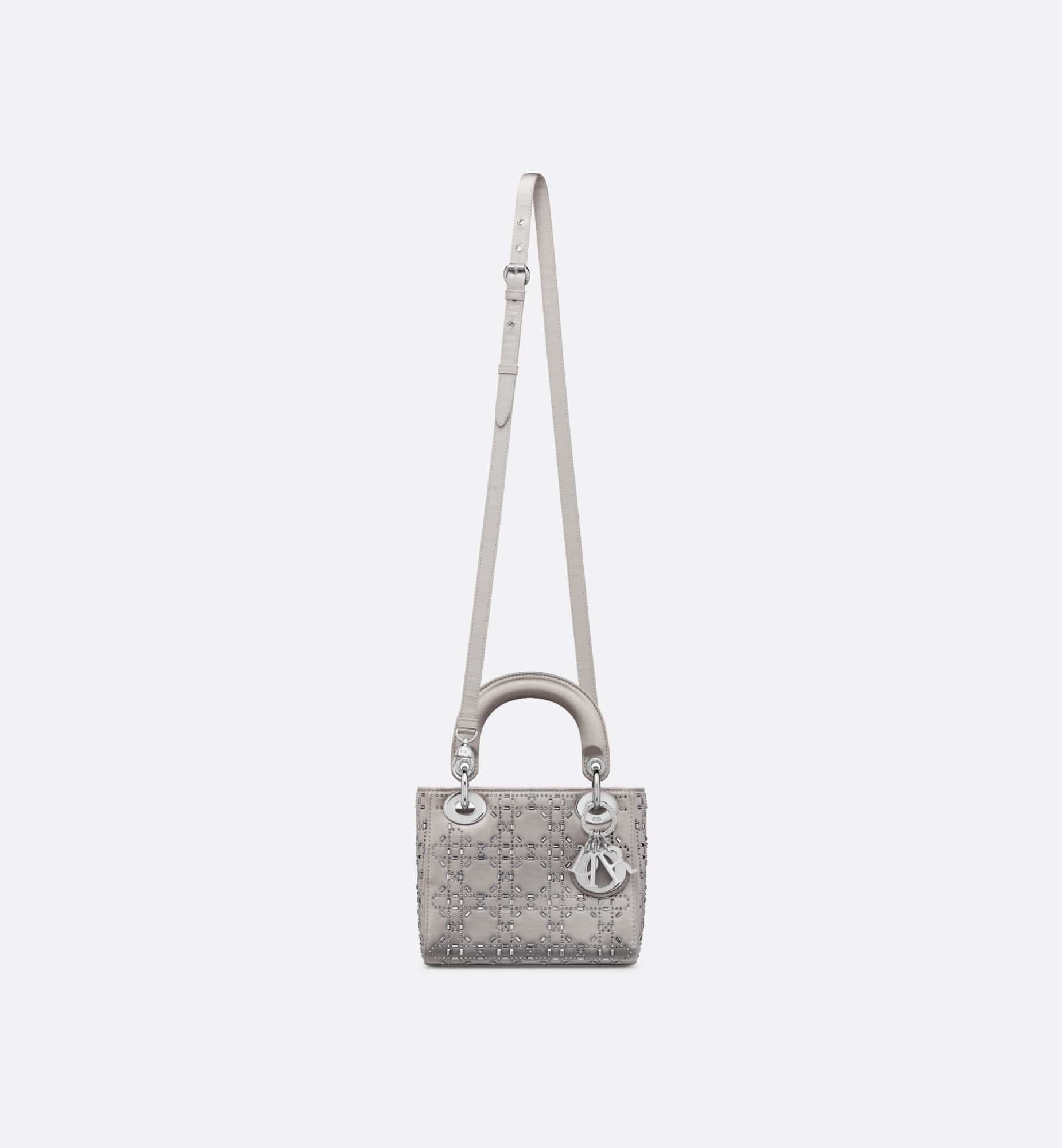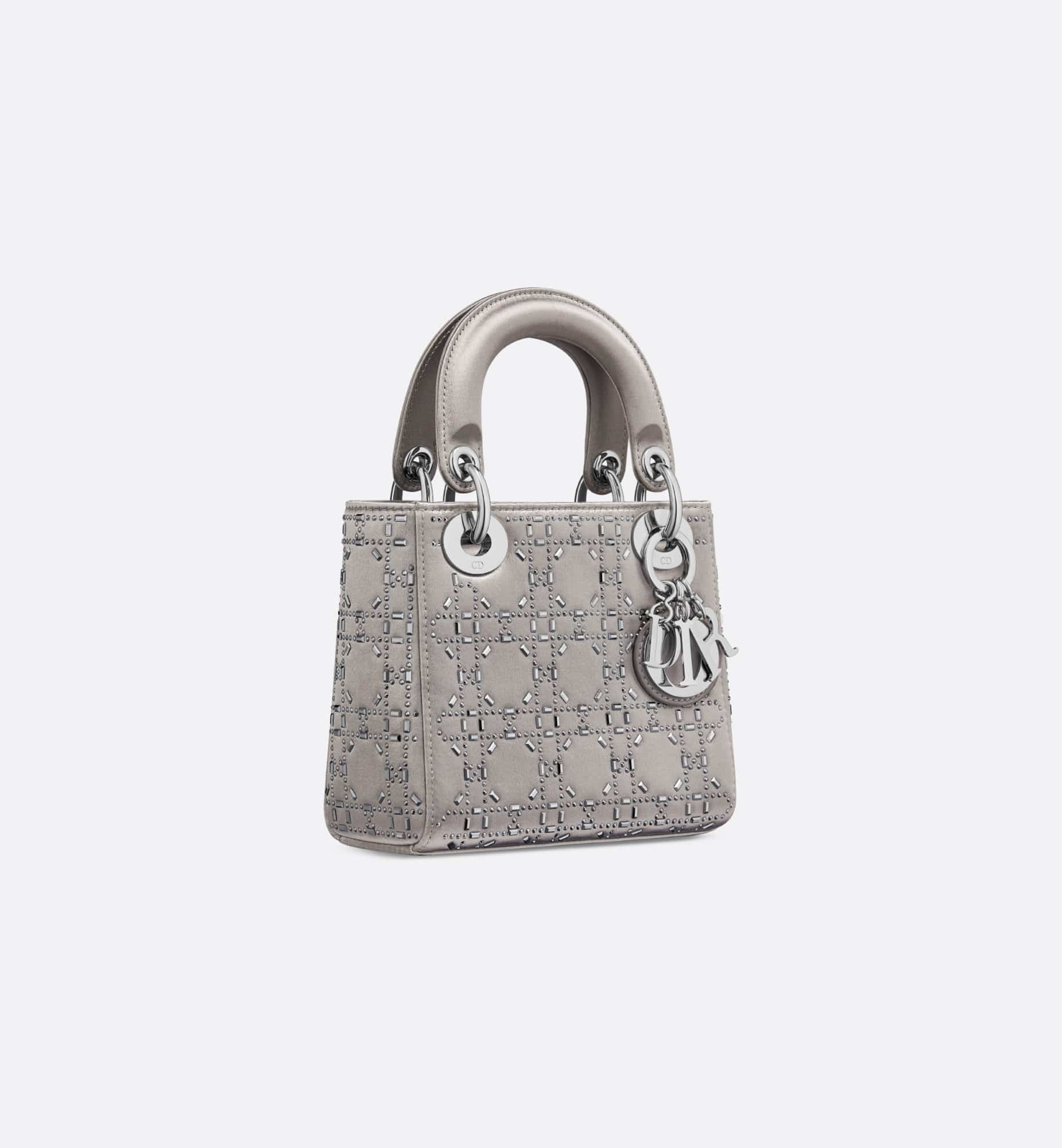The Lady Dior bag epitomizes the House’s vision of elegance and beauty. Sleek and refined, the creation is timeless. Crafted in gray satin and covered with strass for sophisticated evening allure. The palladium-finish metal signature D.I.O.R. charms embellish and illuminate its silhouette. Featuring a thin removable satin shoulder strap, the miniature Lady Dior bag can be carried by hand or worn crossbody as an ideal evening wear companion.
