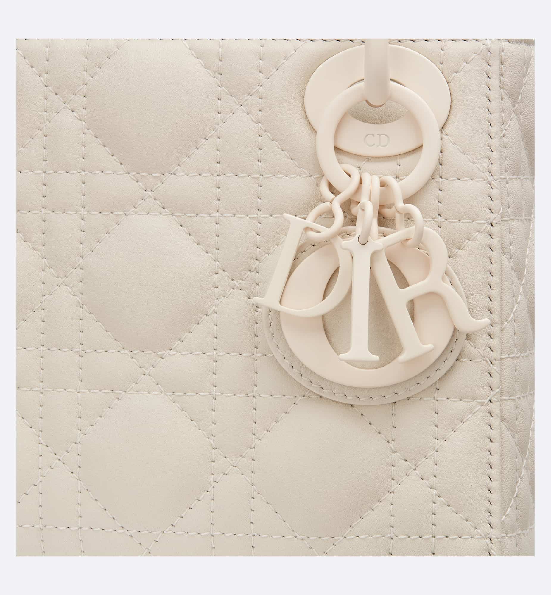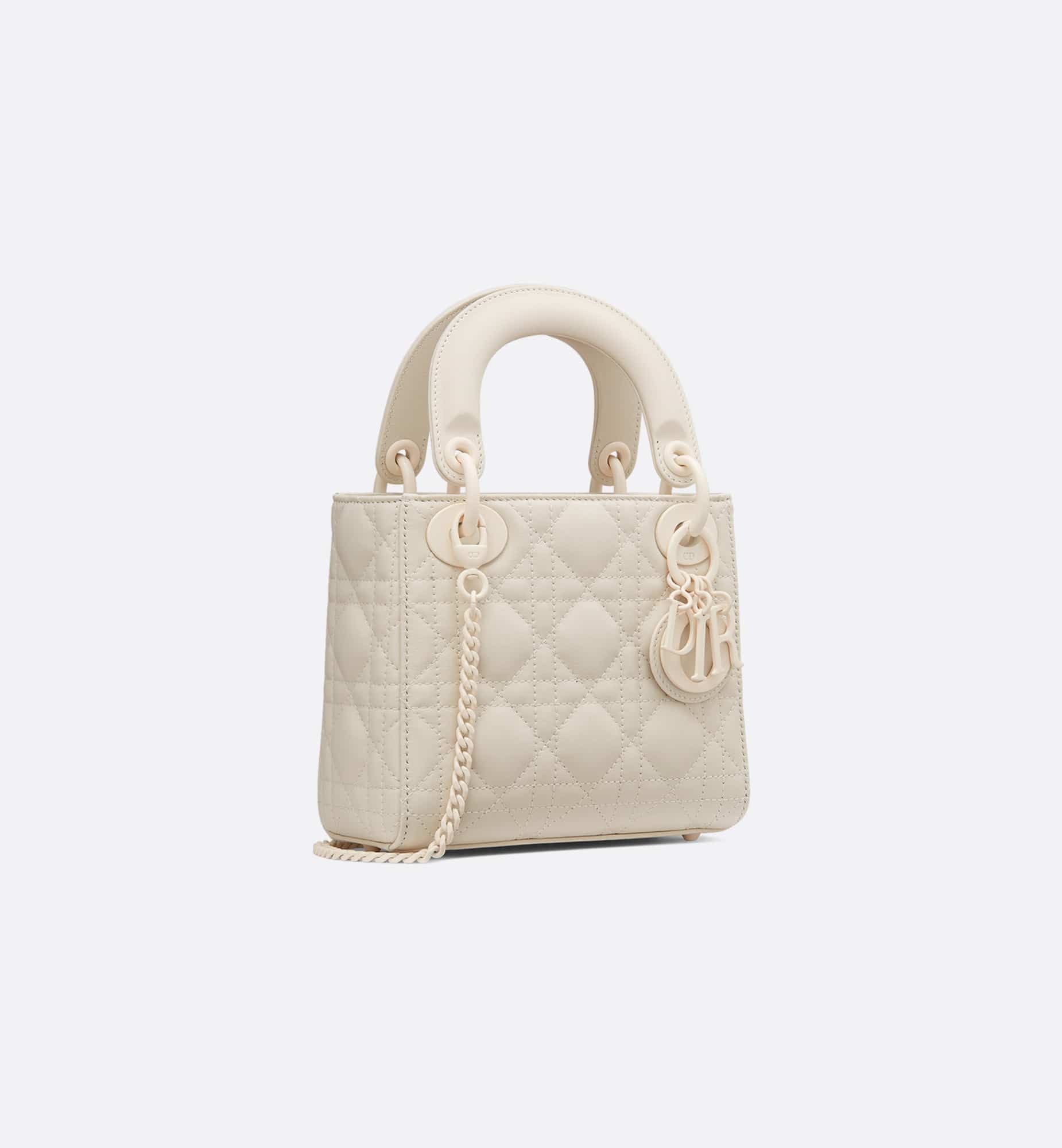 The Lady Dior bag epitomizes the House’s vision of elegance and beauty. Sleek and refined, the timeless yet relevant style is crafted in latte ultramatte calfskin with Cannage stitching, creating the instantly recognizable quilted texture. The tonal metal D.I.O.R. charms embellish and illuminate its silhouette. Featuring a removable chain shoulder strap, the miniature Lady Dior bag can be carried by hand, worn over the shoulder or crossbody as an ideal evening companion.