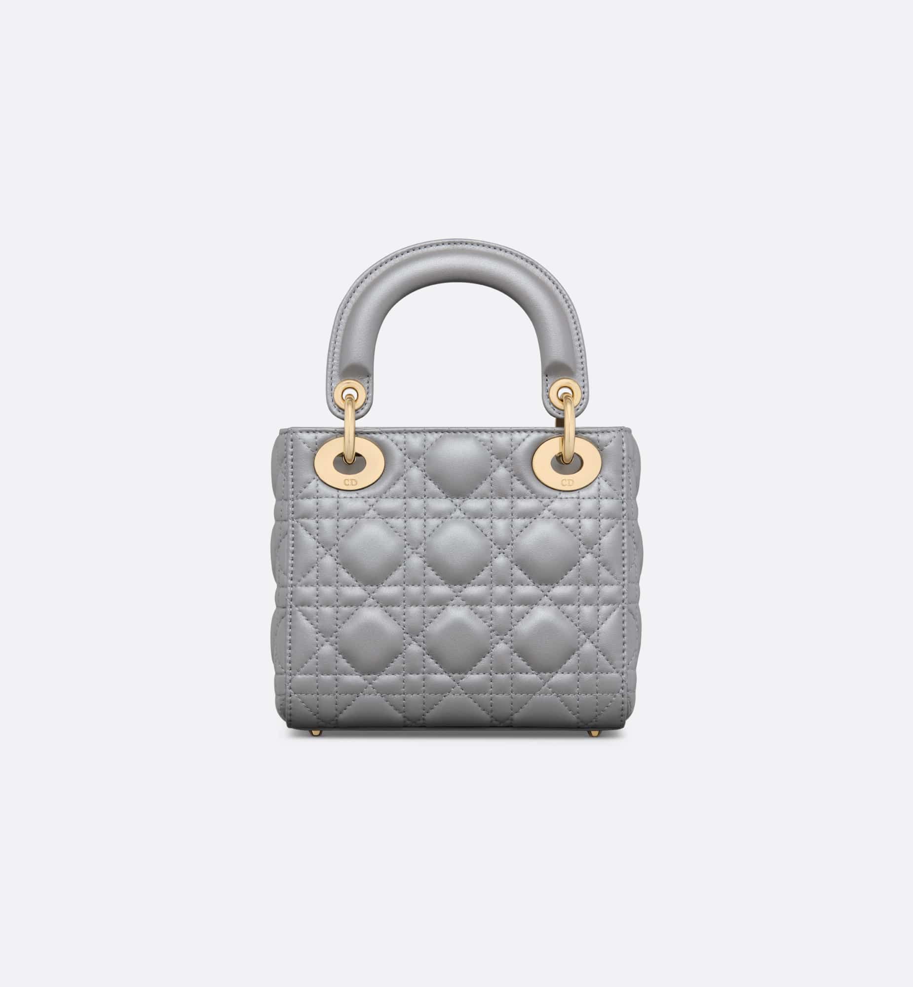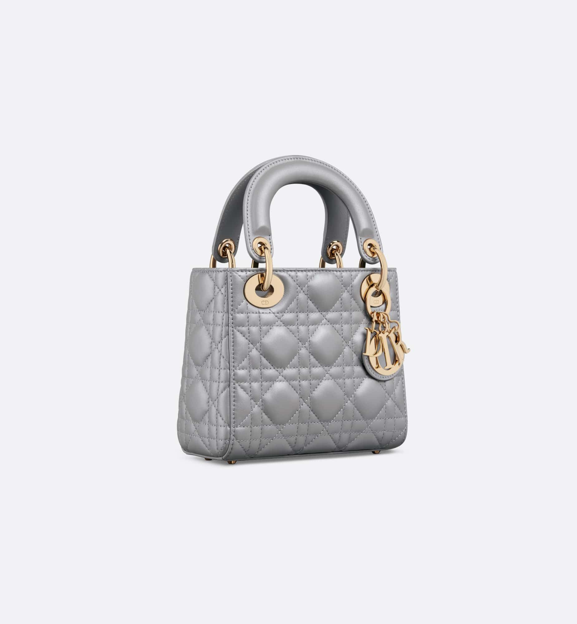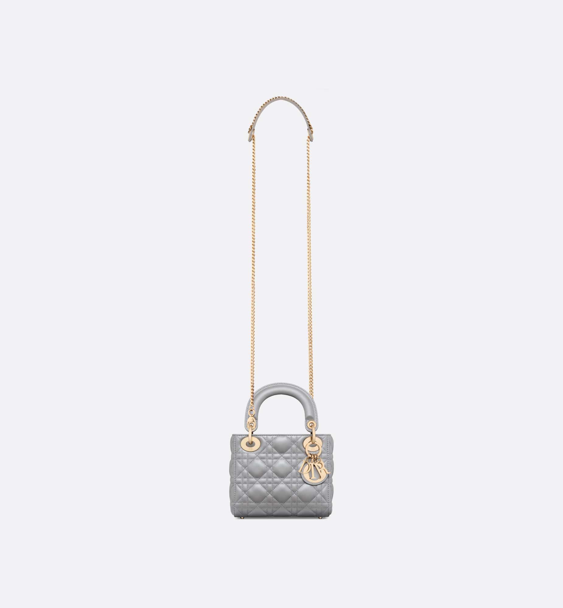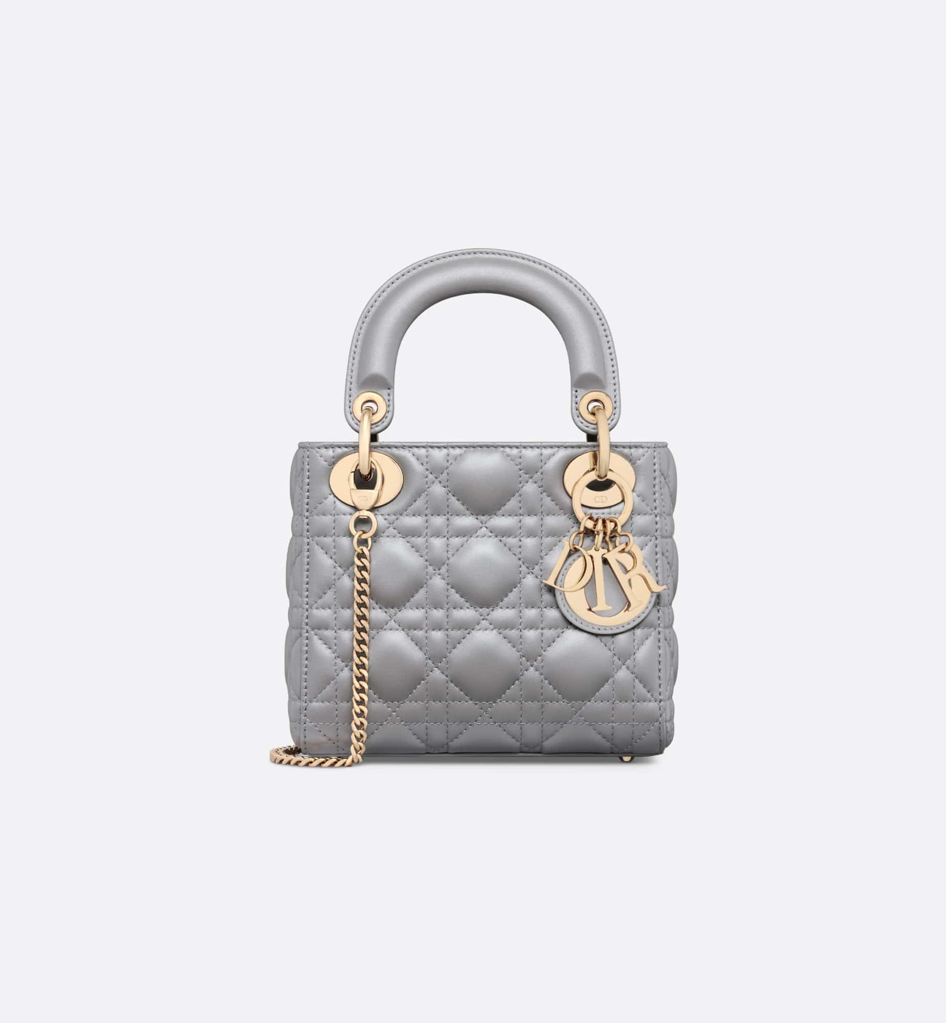 The Lady Dior bag epitomizes the House’s vision of elegance and beauty. Refined and sleek, this creation is timeless. Crafted in opaline gray pearlescent lambskin with Cannage stitching, it boasts an instantly recognizable quilted texture. The pale gold-finish metal D.I.O.R. charms embellish and illuminate its silhouette. Featuring a removable chain shoulder strap, the miniature Lady Dior bag can be carried by hand or worn crossbody as an ideal evening wear companion.