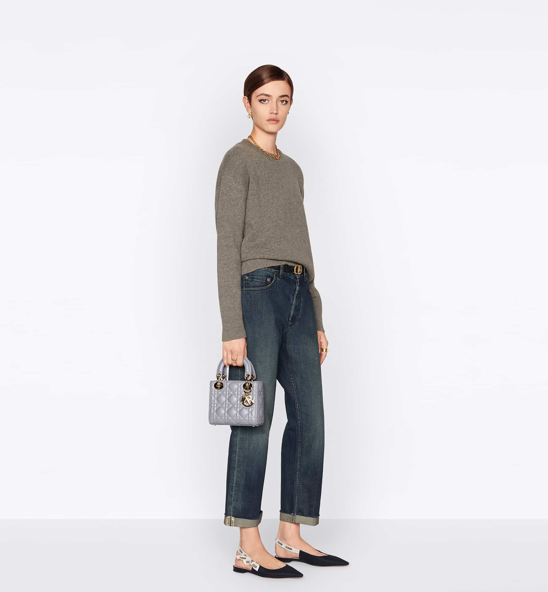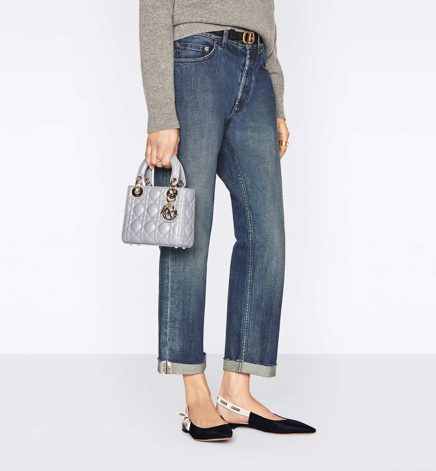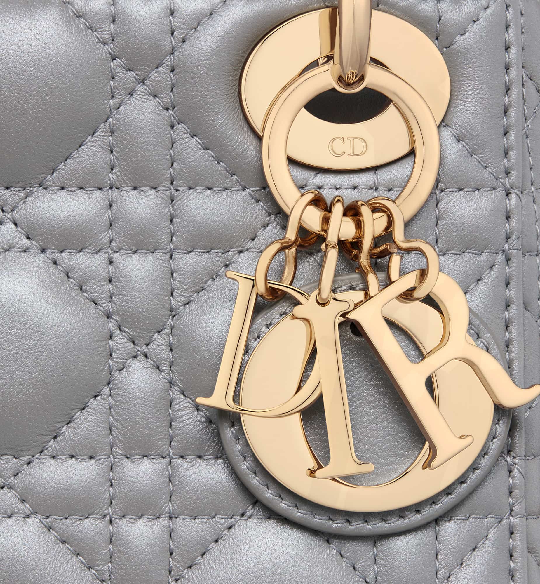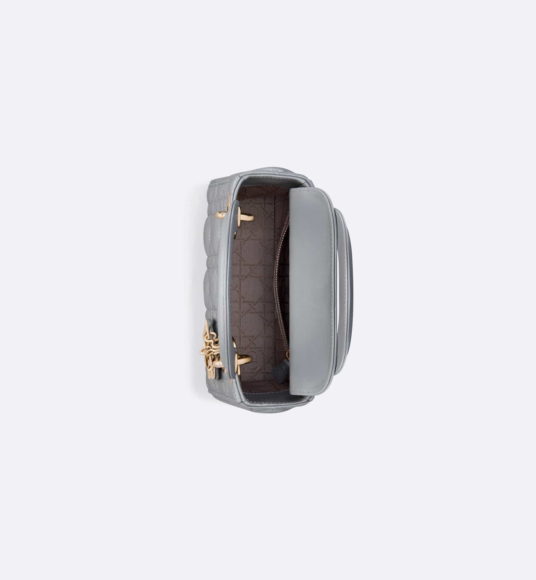 The Lady Dior bag epitomizes the House’s vision of elegance and beauty. Refined and sleek, this creation is timeless. Crafted in opaline gray pearlescent lambskin with Cannage stitching, it boasts an instantly recognizable quilted texture. The pale gold-finish metal D.I.O.R. charms embellish and illuminate its silhouette. Featuring a removable chain shoulder strap, the miniature Lady Dior bag can be carried by hand or worn crossbody as an ideal evening wear companion.
