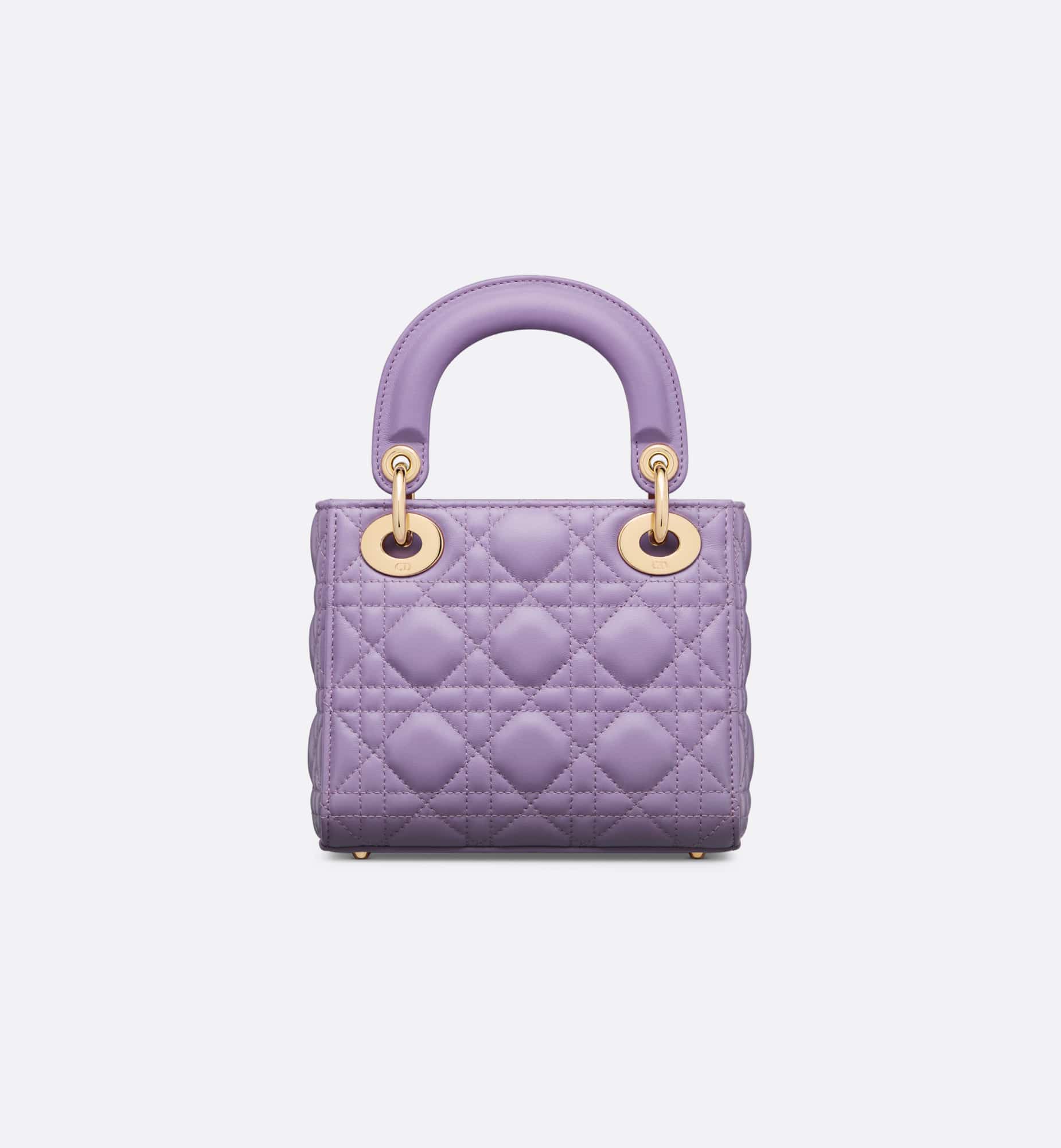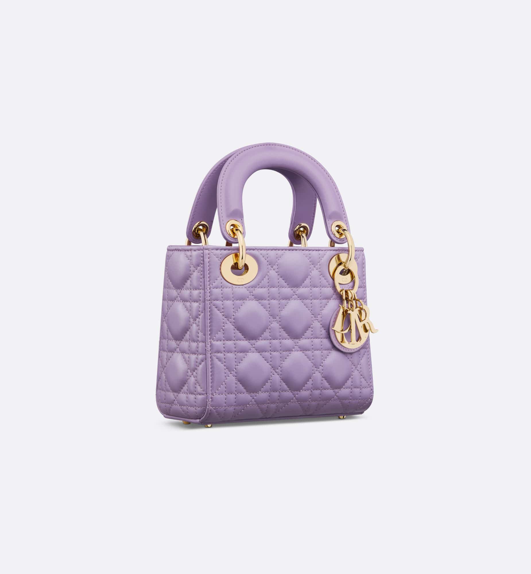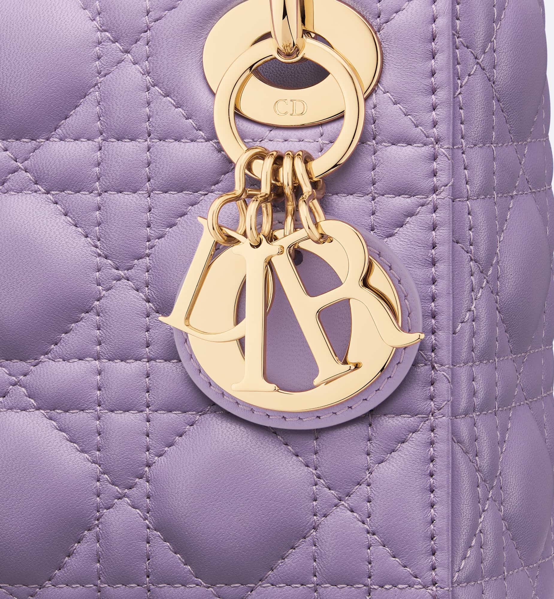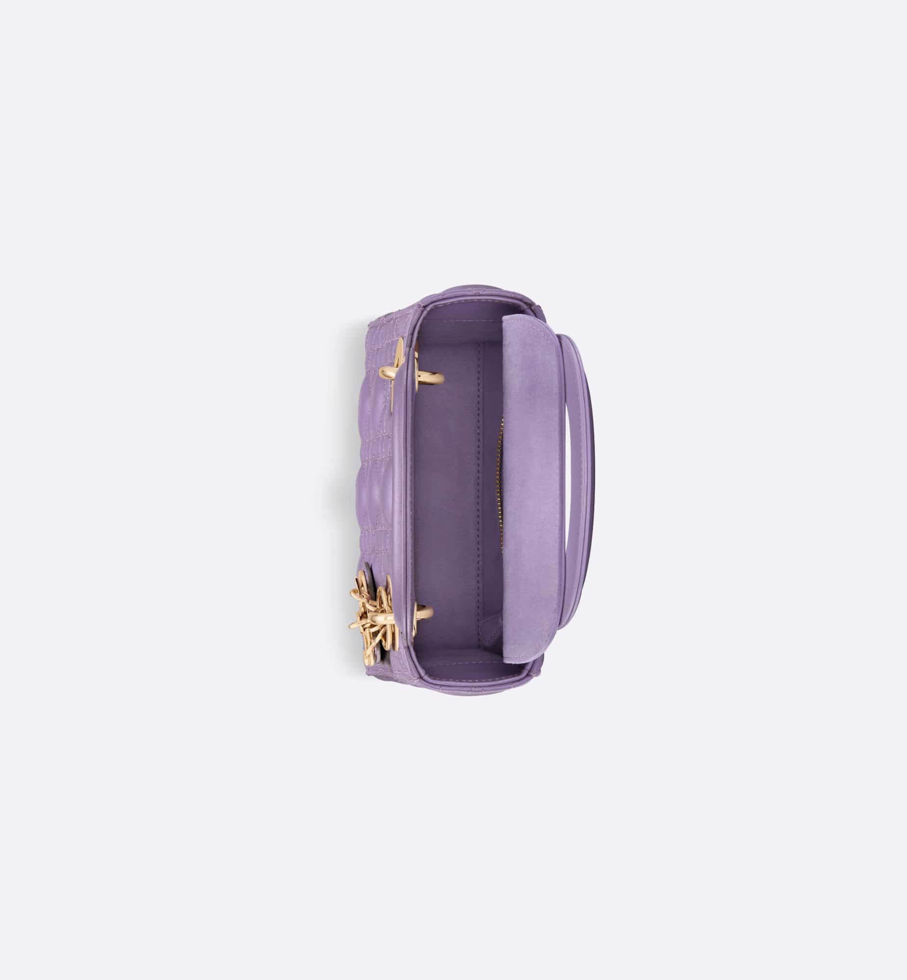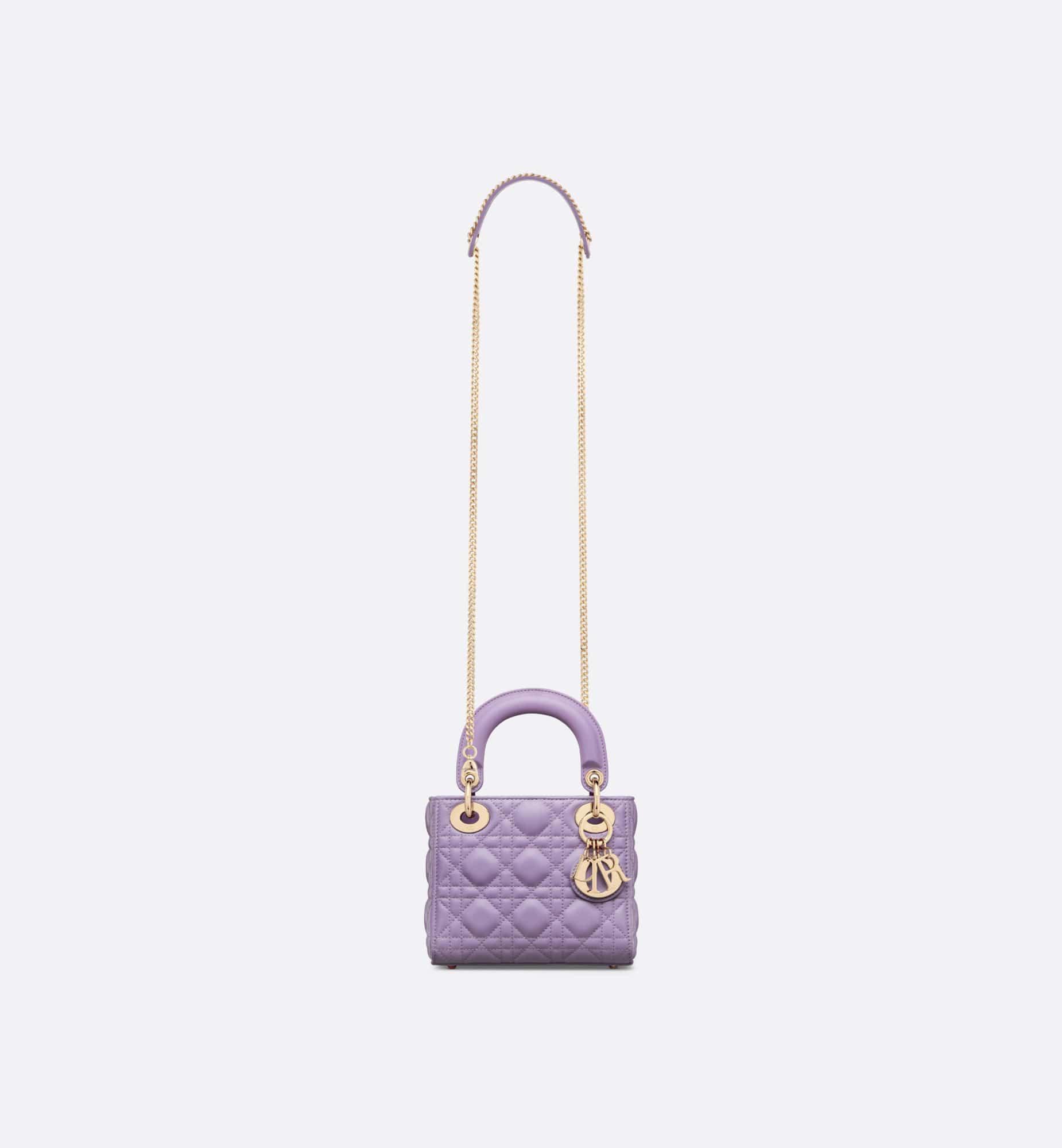 The Lady Dior bag epitomizes the House’s vision of elegance and beauty. Sleek and refined, the style is timeless. It is crafted in lilac lambskin with Cannage stitching, creating the instantly recognizable quilted texture. The pale gold-finish metal D.I.O.R. charms embellish and illuminate its silhouette. Featuring a removable chain shoulder strap, the miniature Lady Dior bag can be carried by hand or worn crossbody as an ideal evening wear companion.