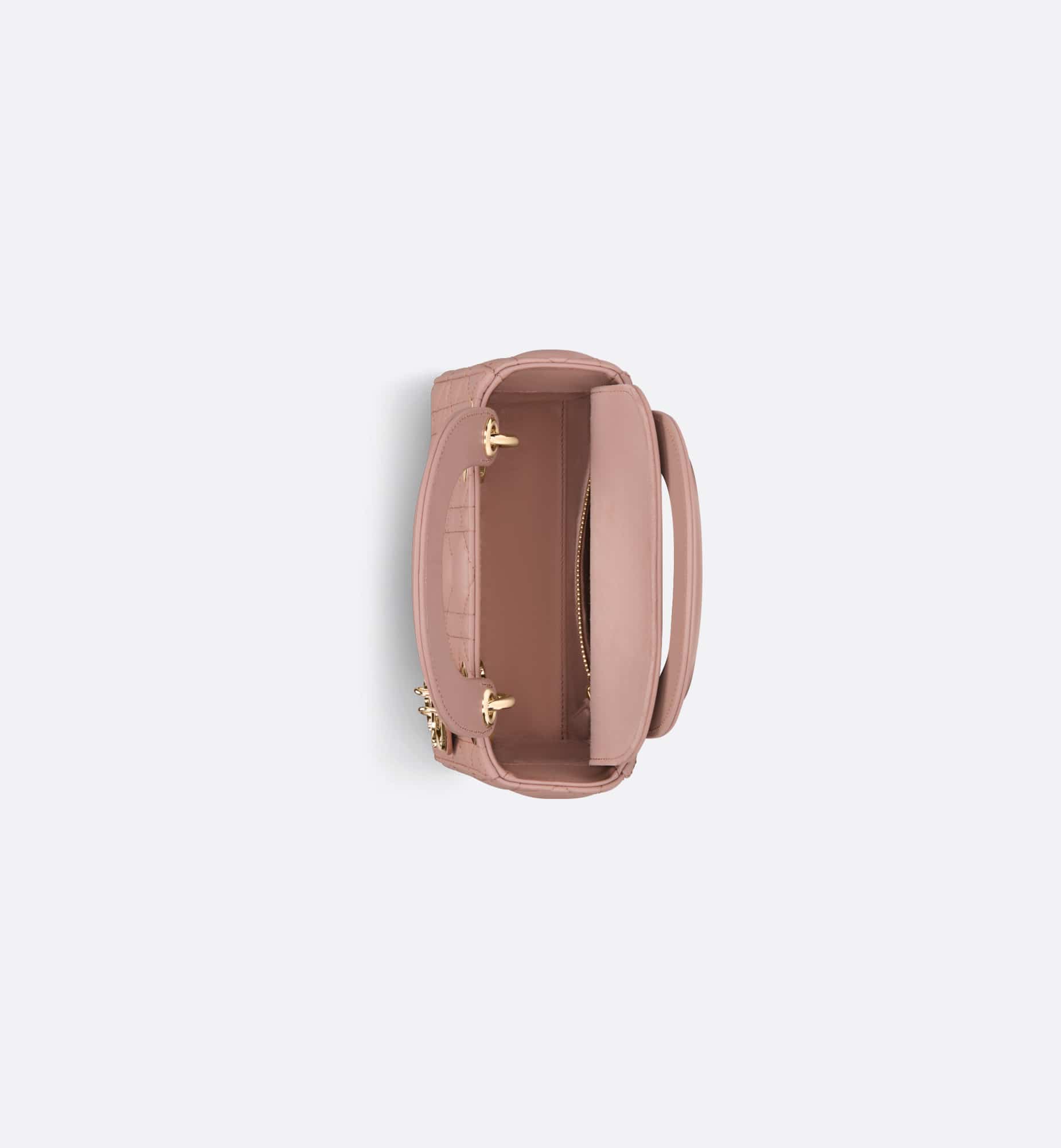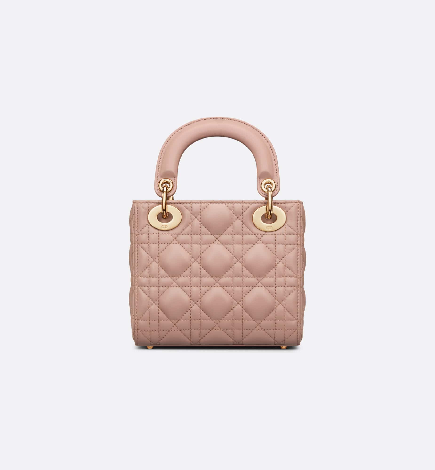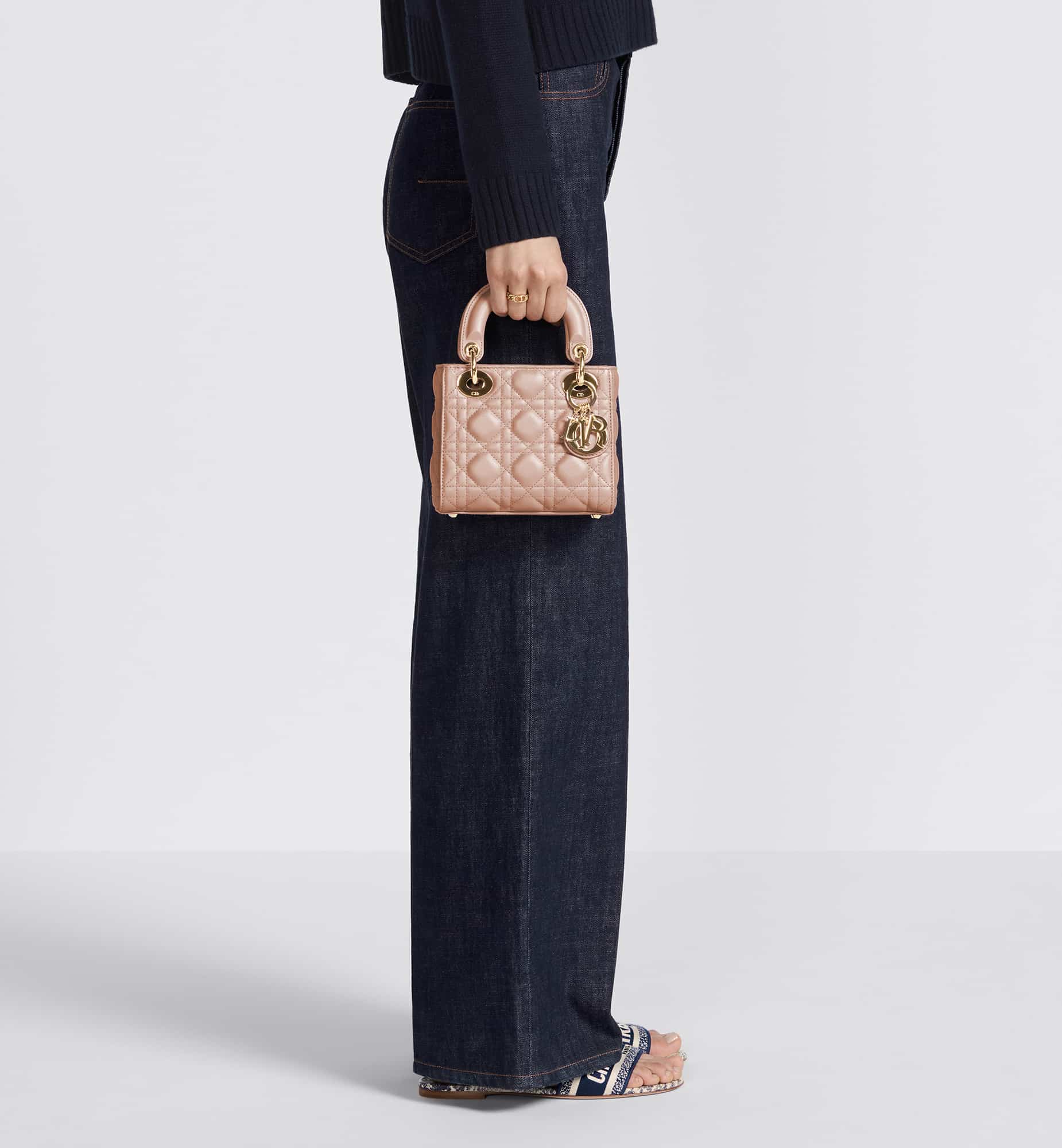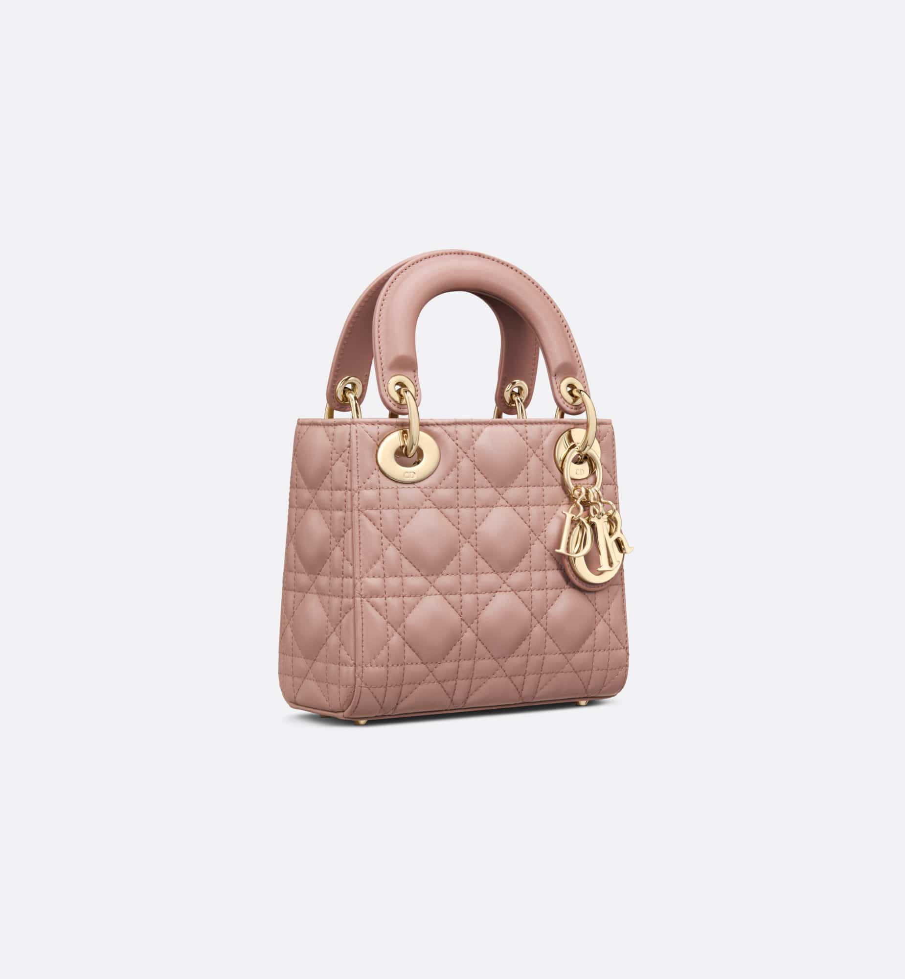 The Lady Dior bag epitomizes the House’s vision of elegance and beauty. Refined and sleek, the timeless creation is crafted in blush lambskin and covered with Cannage stitching, creating an instantly recognizable quilted texture. The pale gold-finish metal D.I.O.R. charms embellish and illuminate its silhouette. Featuring a removable chain shoulder strap, the miniature Lady Dior bag can be carried by hand or worn crossbody as an ideal evening wear companion.
