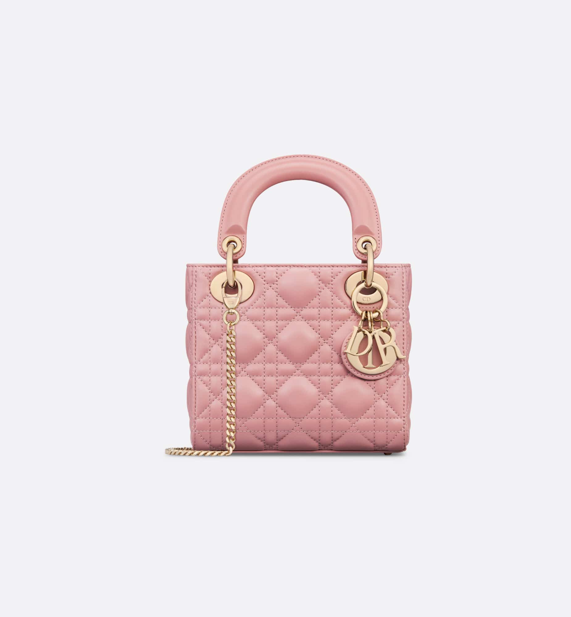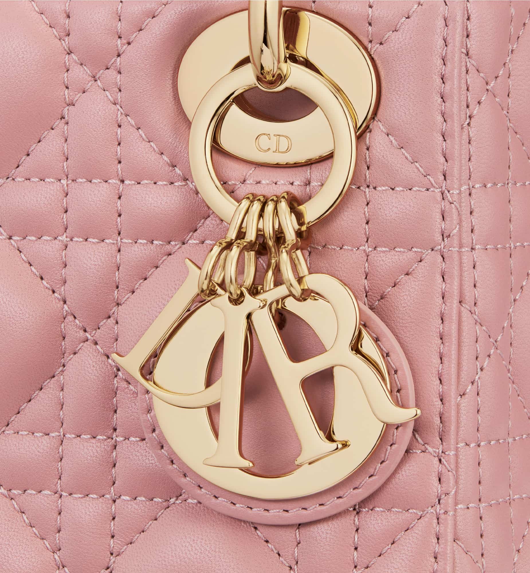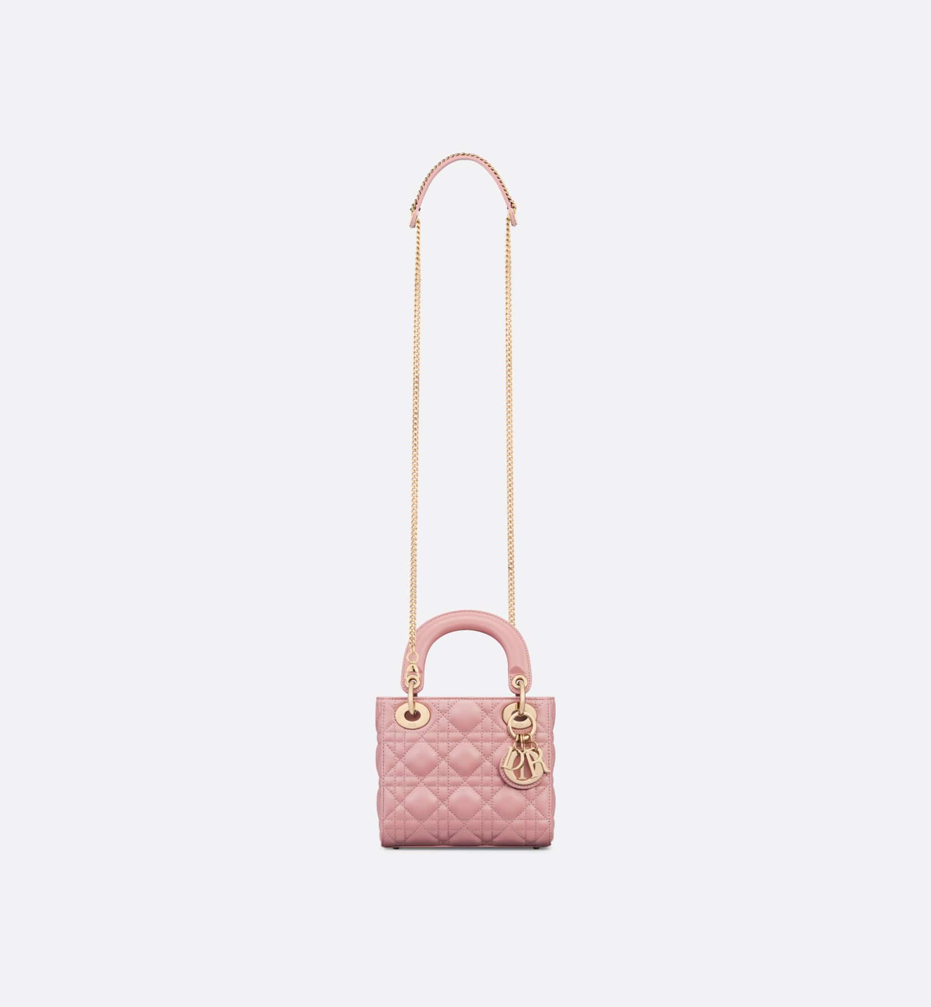 The Lady Dior bag epitomizes the House’s vision of elegance and beauty. Refined and sleek, the timeless creation is crafted in antique pink lambskin and covered with Cannage stitching, creating an instantly recognizable quilted texture. The pale gold-finish metal D.I.O.R. charms embellish and illuminate its silhouette. Featuring a removable chain shoulder strap, the miniature Lady Dior bag can be carried by hand or worn crossbody as an ideal evening wear companion.