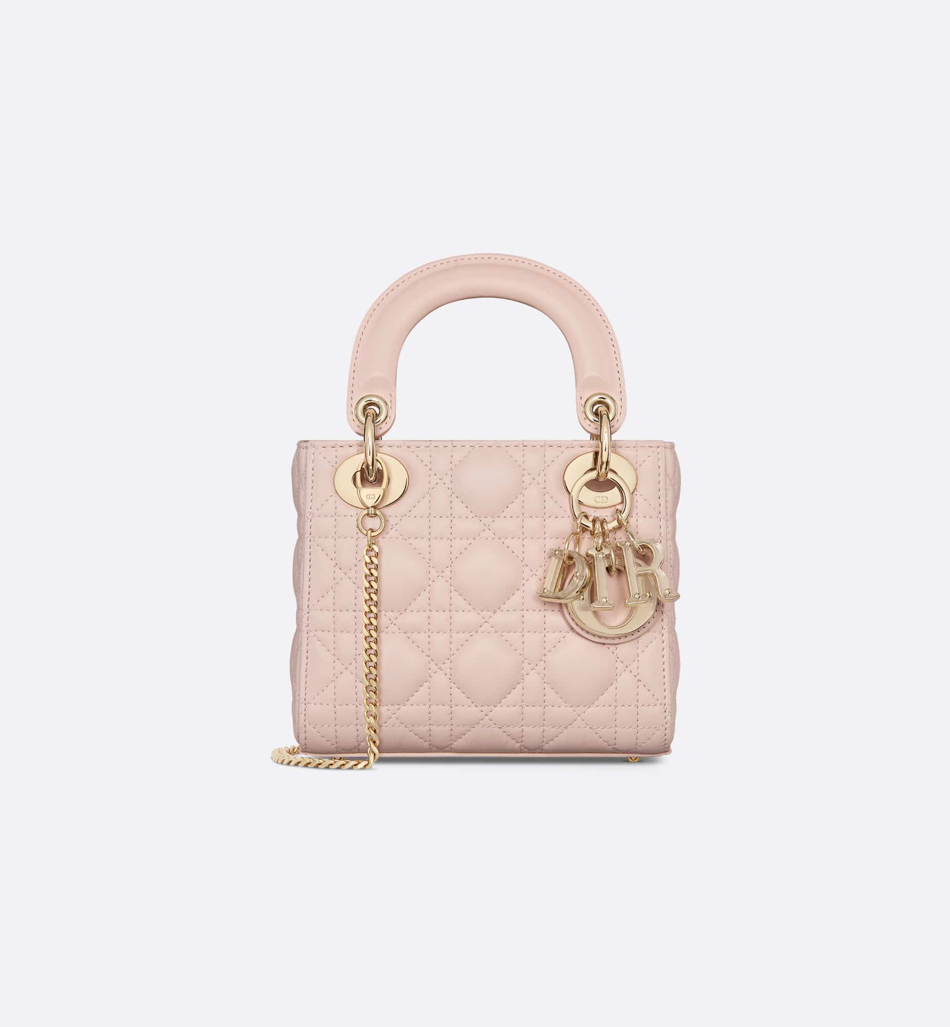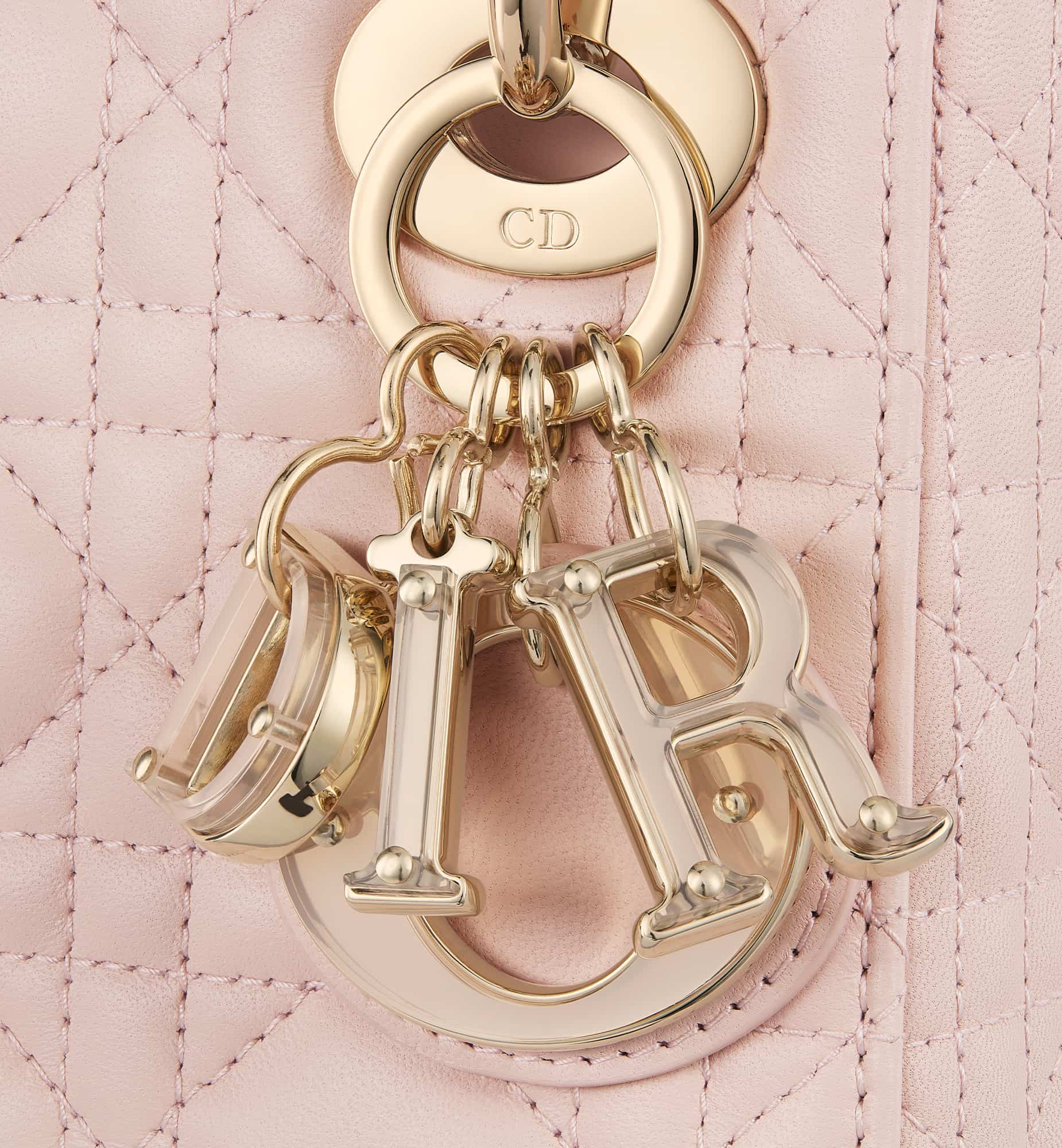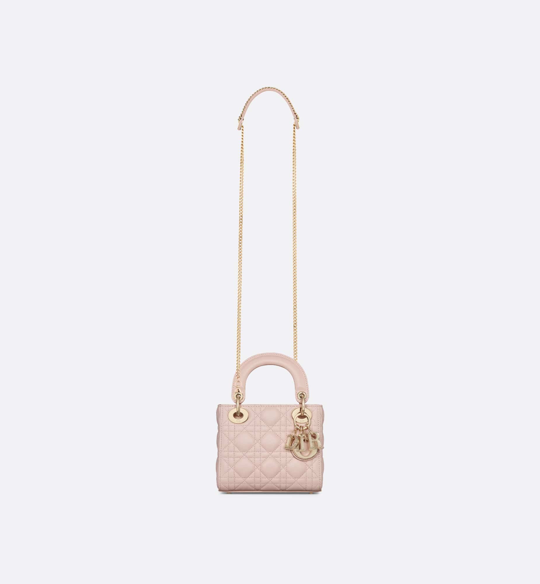 The Lady Dior bag embodies Dior’s vision of elegance and beauty. Sleek and refined, the timeless and modern style is crafted in powder pink lambskin with Cannage stitching, creating the instantly recognizable quilted texture. The D.I.O.R. charms embellished in transparent tonal resin highlight its silhouette. Featuring a removable chain shoulder strap, the miniature Lady Dior bag can be carried by hand, worn over the shoulder or crossbody as an ideal evening wear companion.