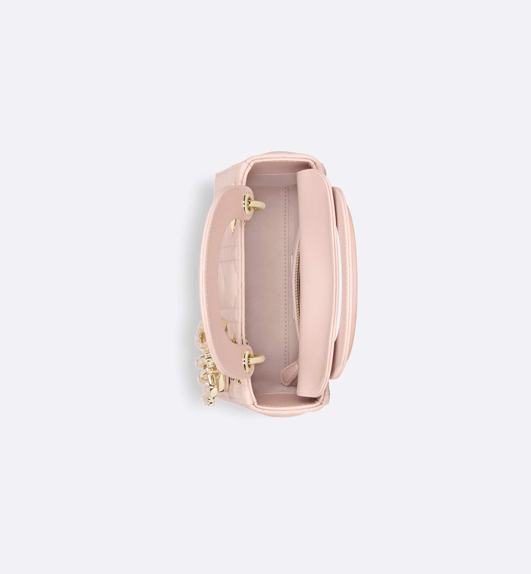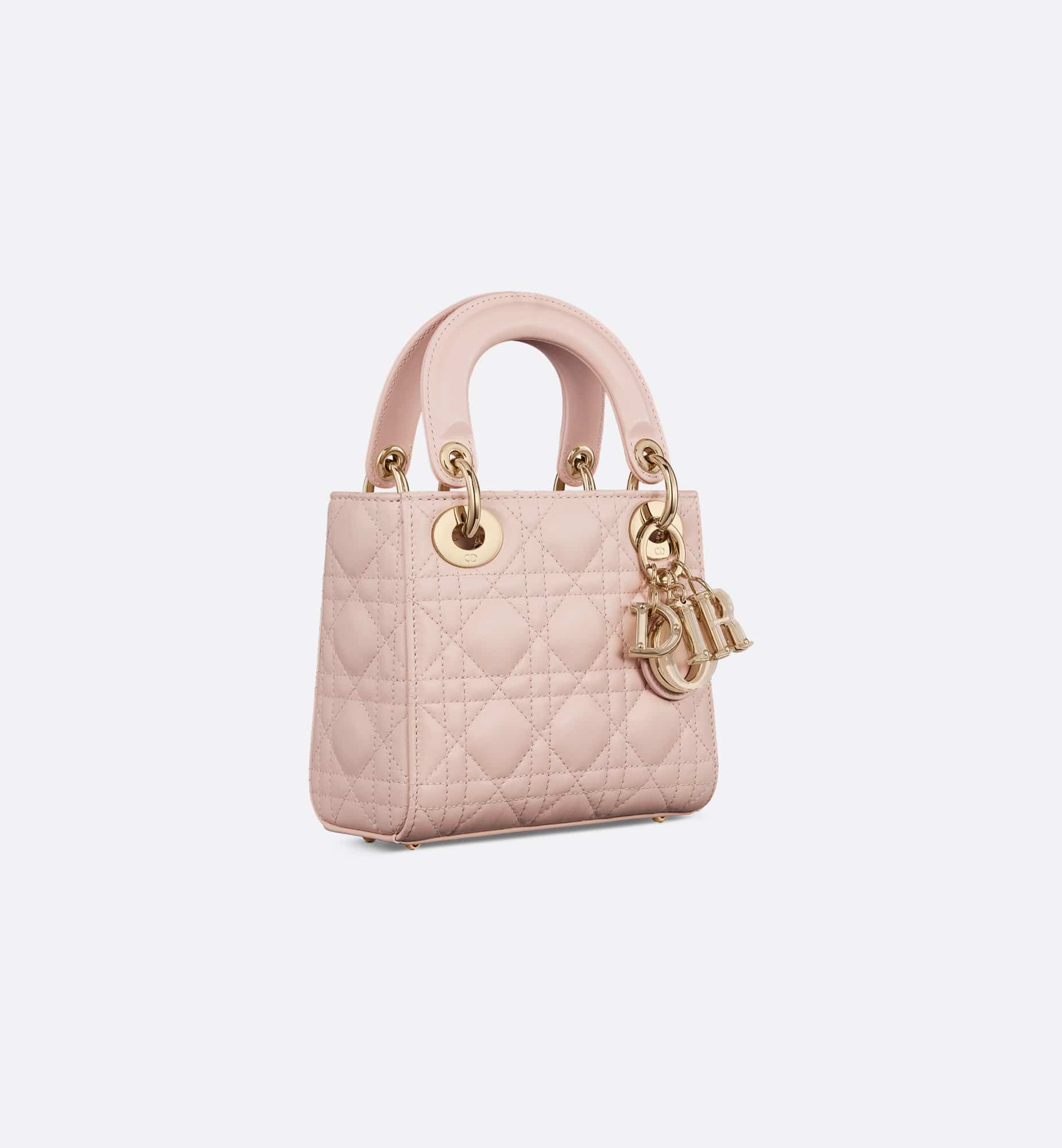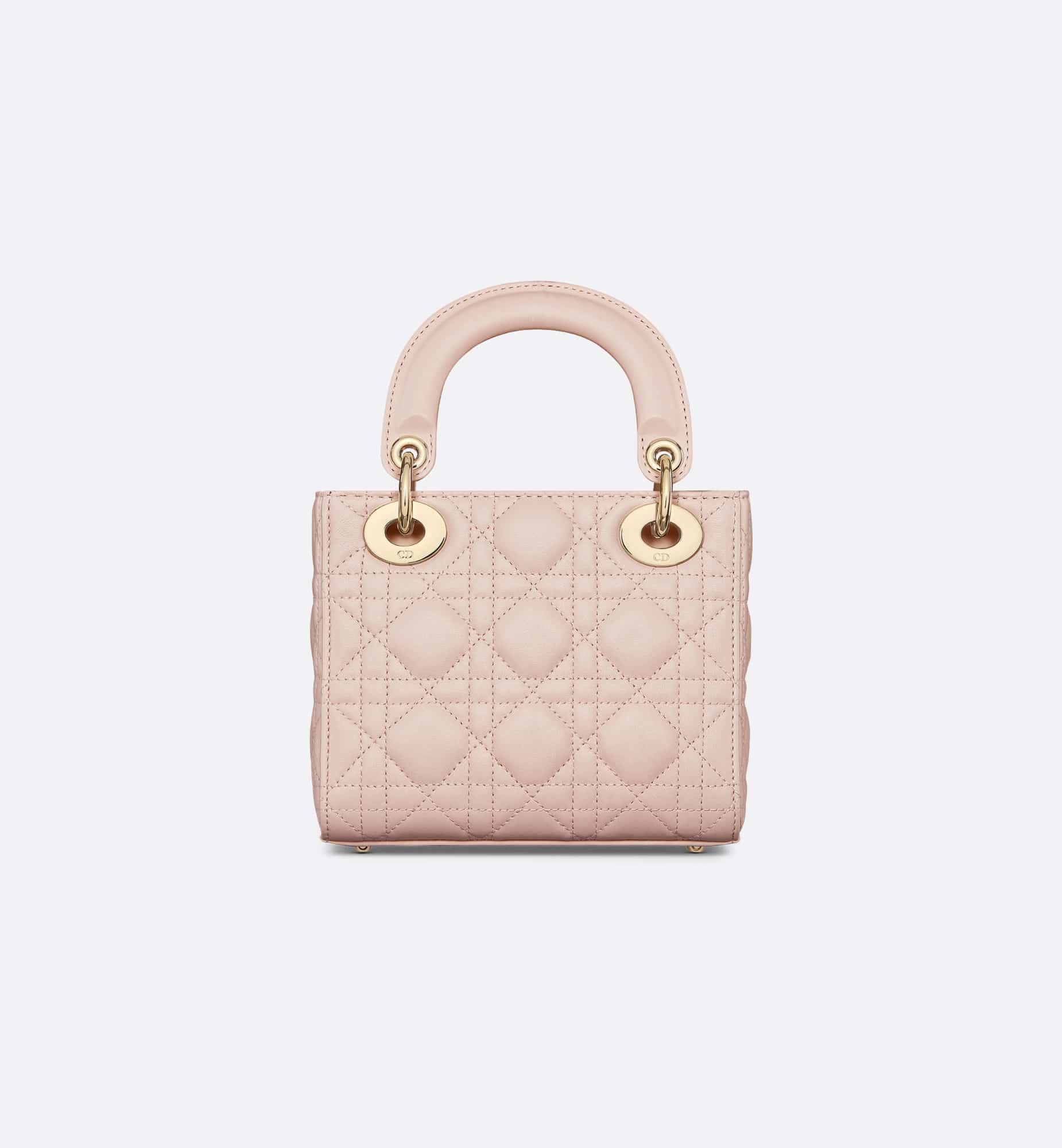 The Lady Dior bag embodies Dior’s vision of elegance and beauty. Sleek and refined, the timeless and modern style is crafted in powder pink lambskin with Cannage stitching, creating the instantly recognizable quilted texture. The D.I.O.R. charms embellished in transparent tonal resin highlight its silhouette. Featuring a removable chain shoulder strap, the miniature Lady Dior bag can be carried by hand, worn over the shoulder or crossbody as an ideal evening wear companion.