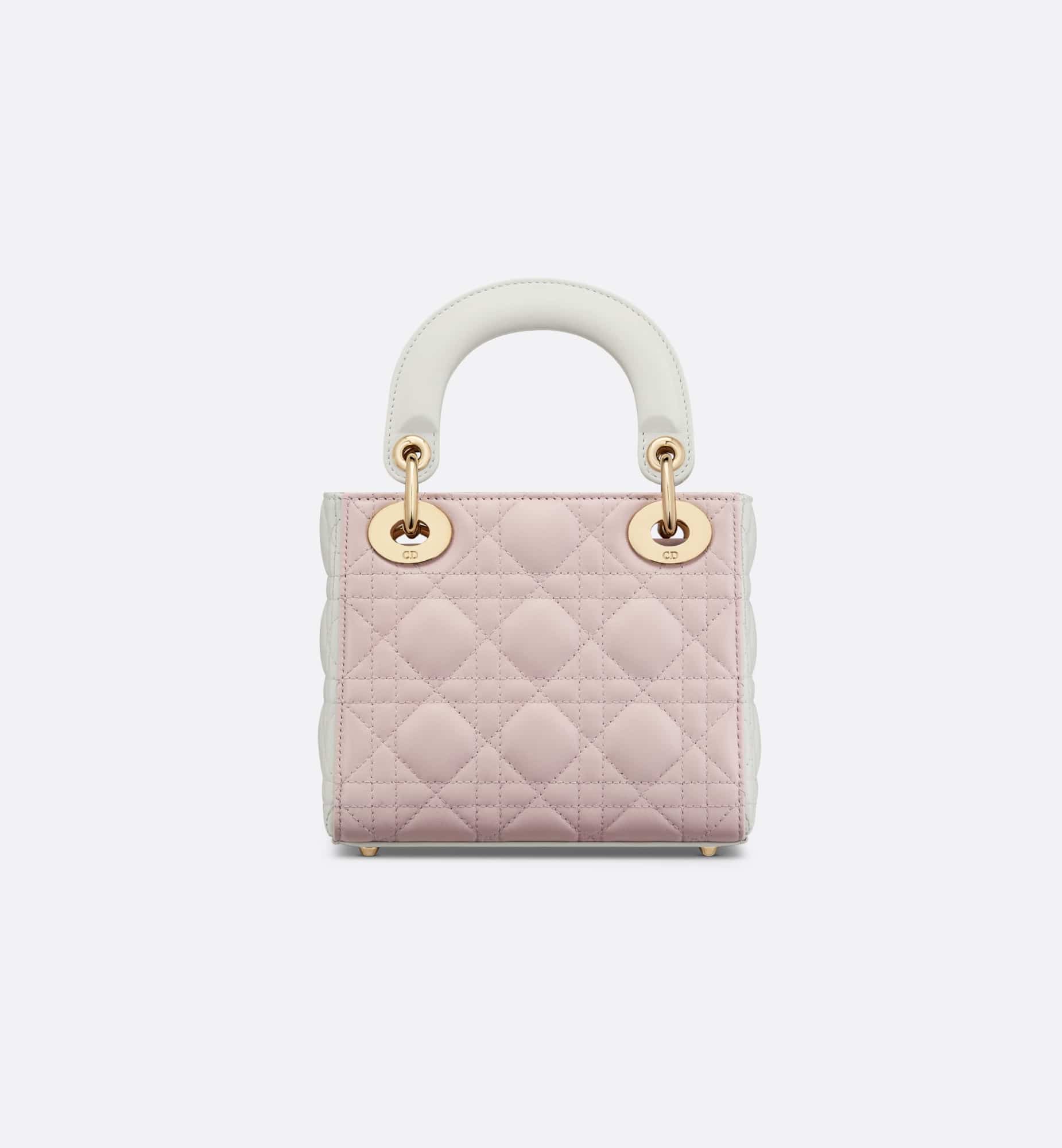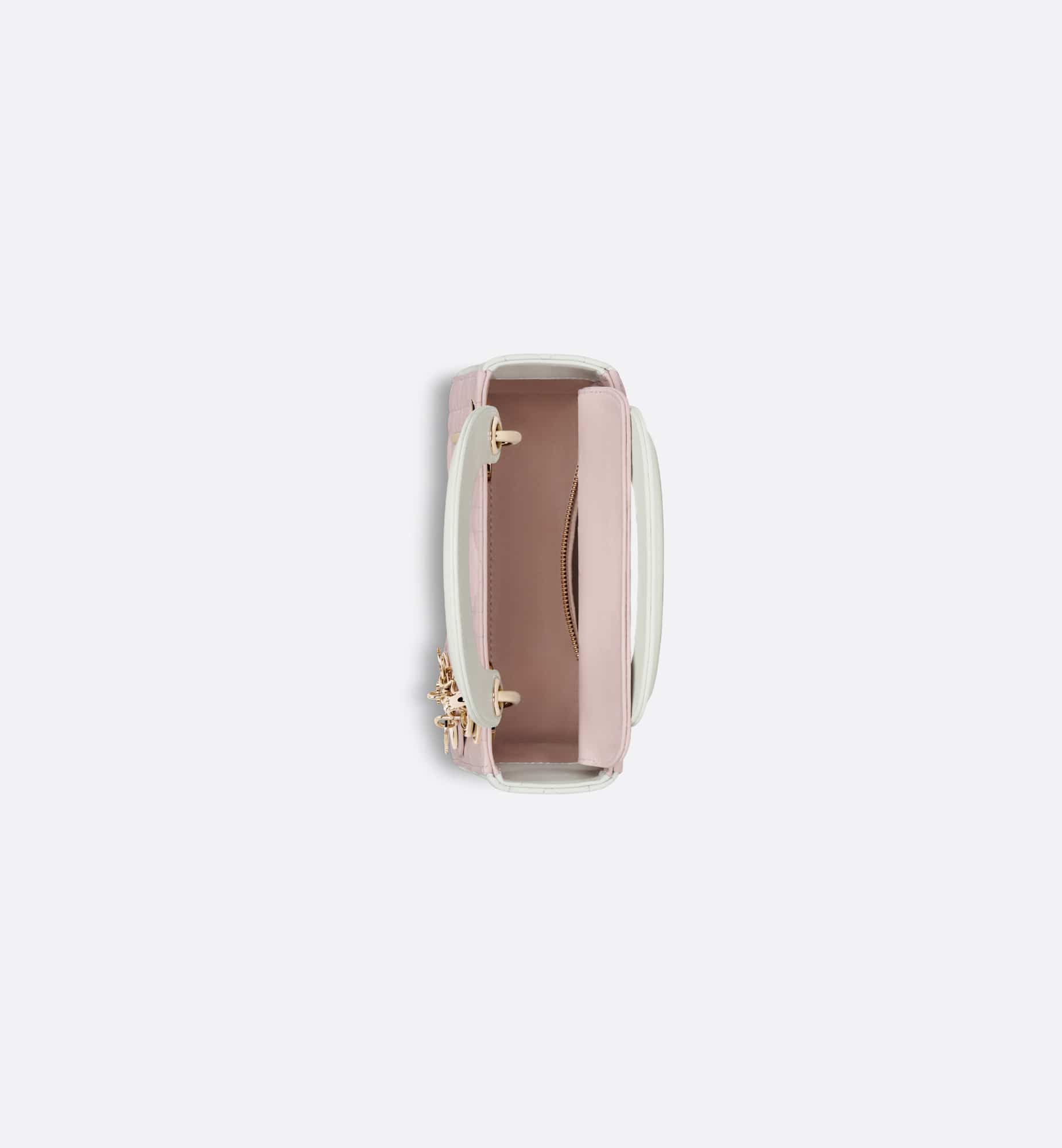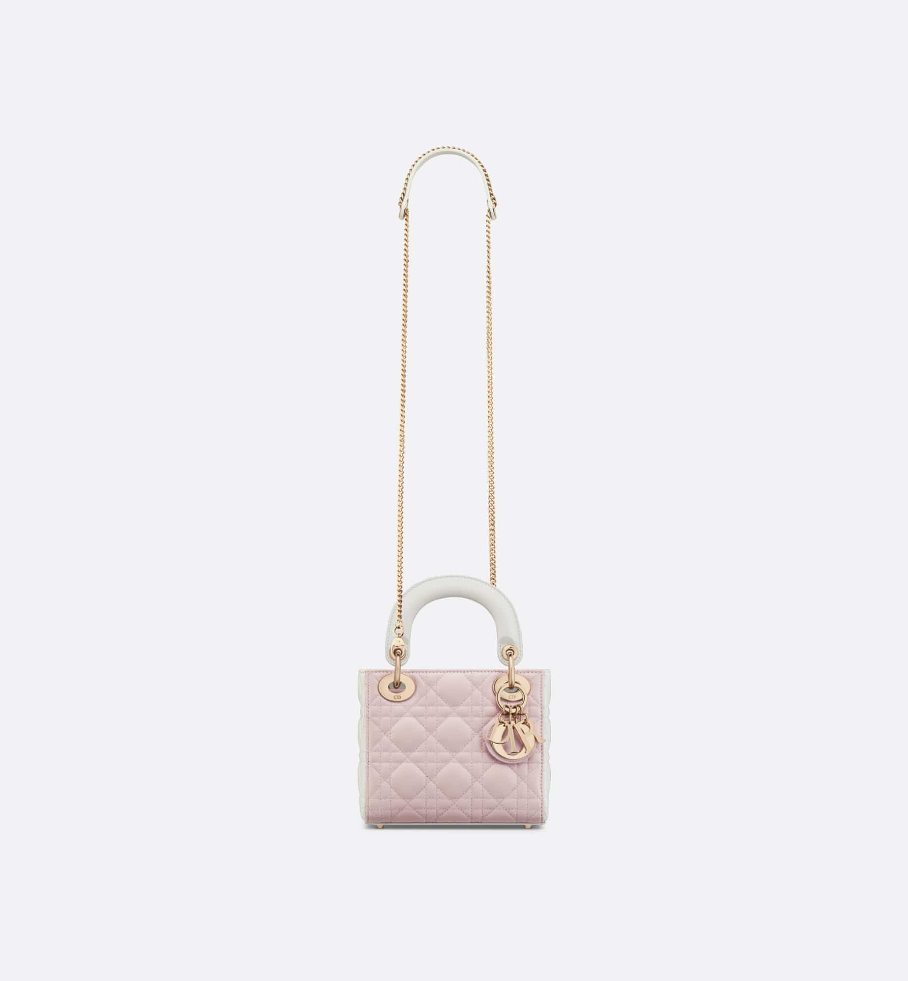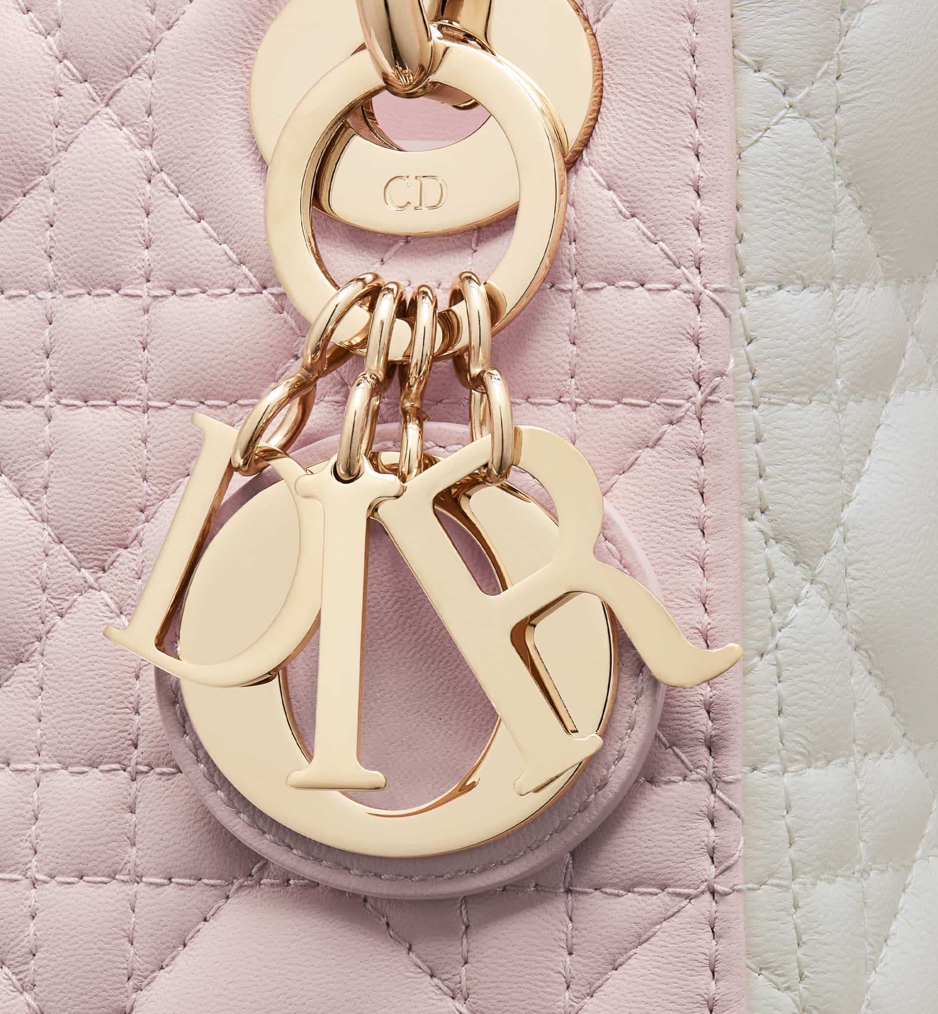 The Lady Dior bag embodies Dior’s vision of elegance and beauty. Sleek and refined, the timeless and modern style is crafted in two-tone latte and powder pink lambskin with Cannage stitching, creating the instantly recognizable quilted texture. Pale gold-finish metal D.I.O.R. charms further embellish and illuminate its silhouette. Featuring a removable chain shoulder strap, the miniature Lady Dior bag can be carried by hand, worn over the shoulder or crossbody as an ideal evening wear companion.