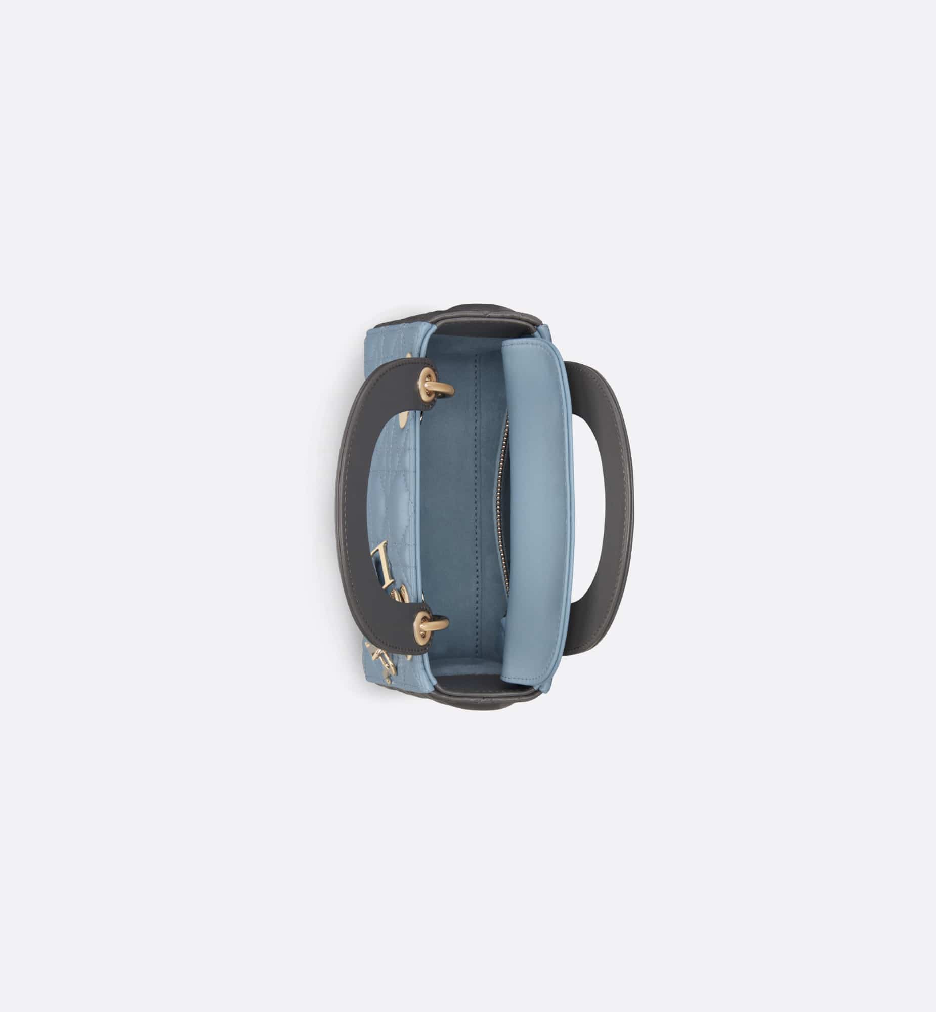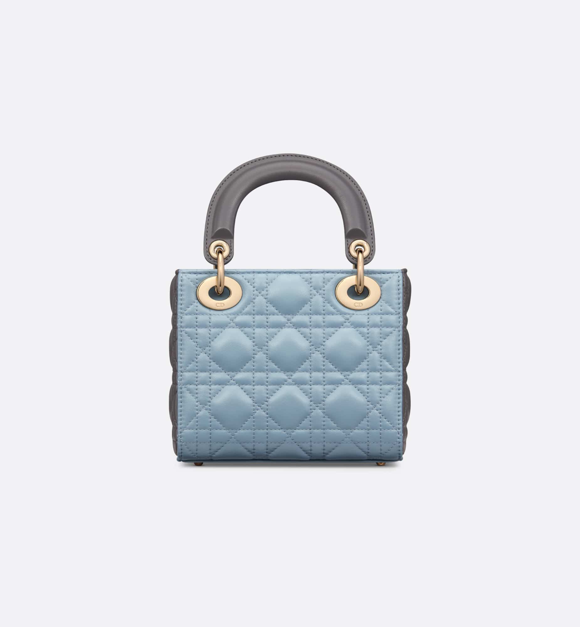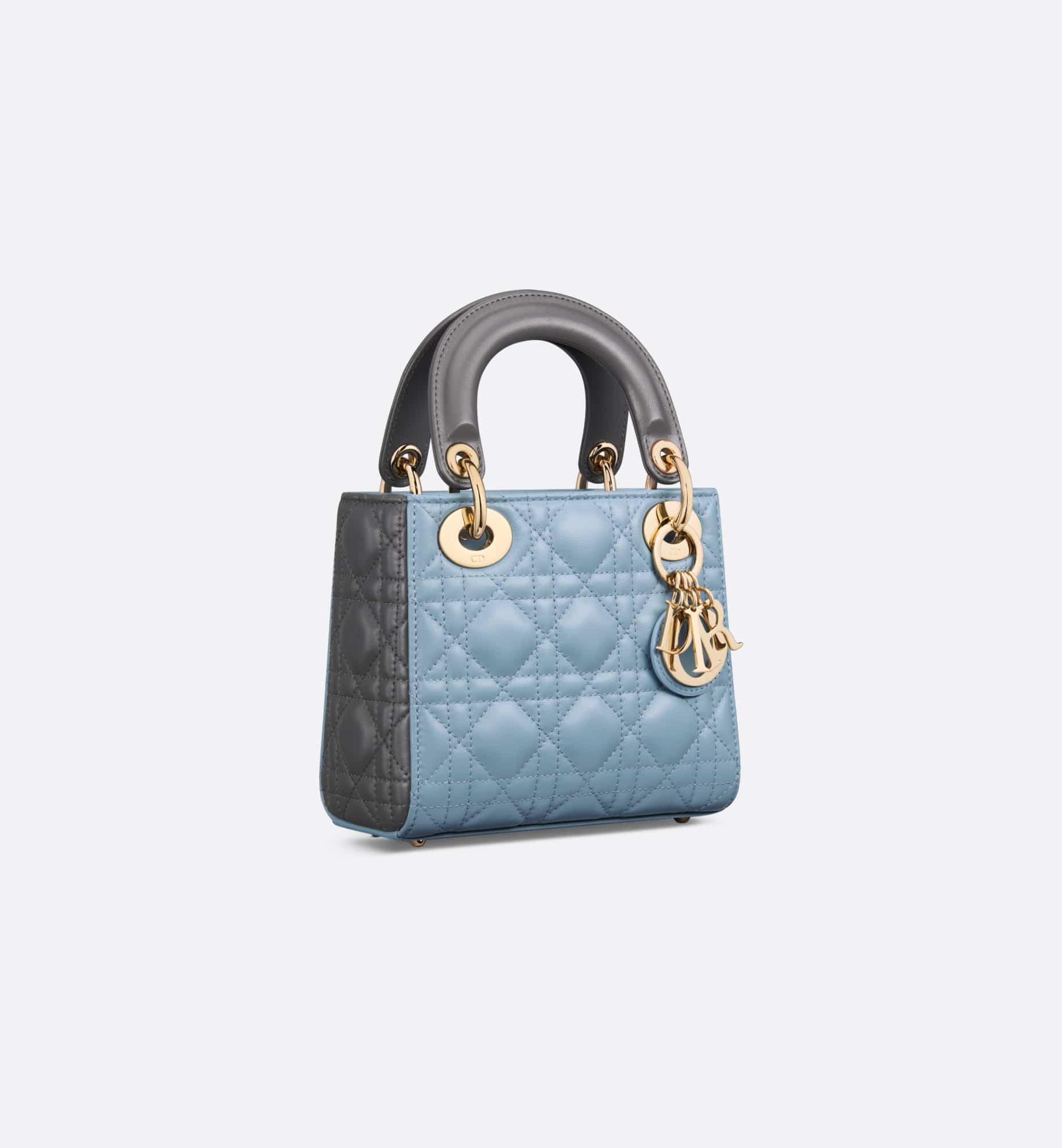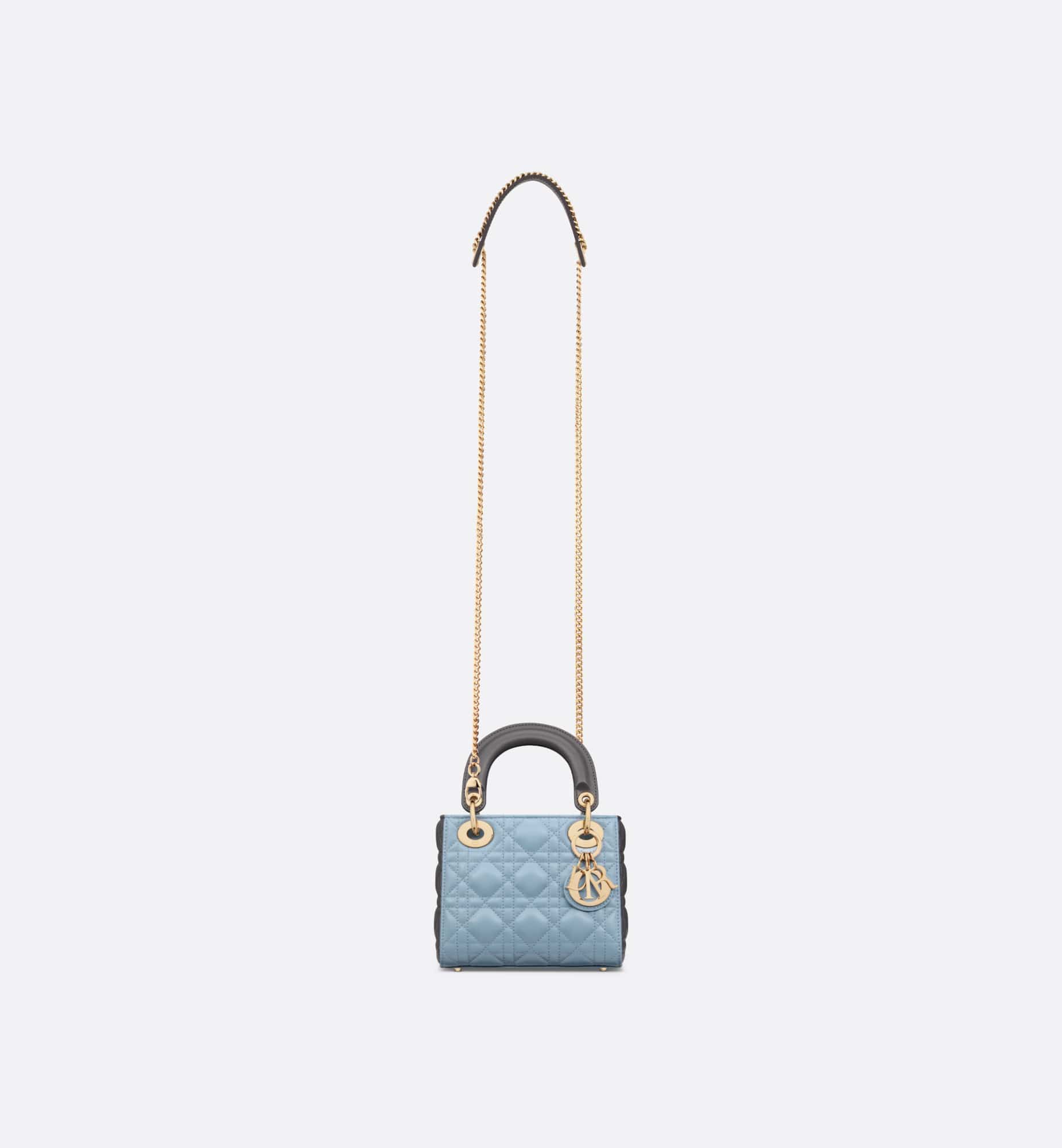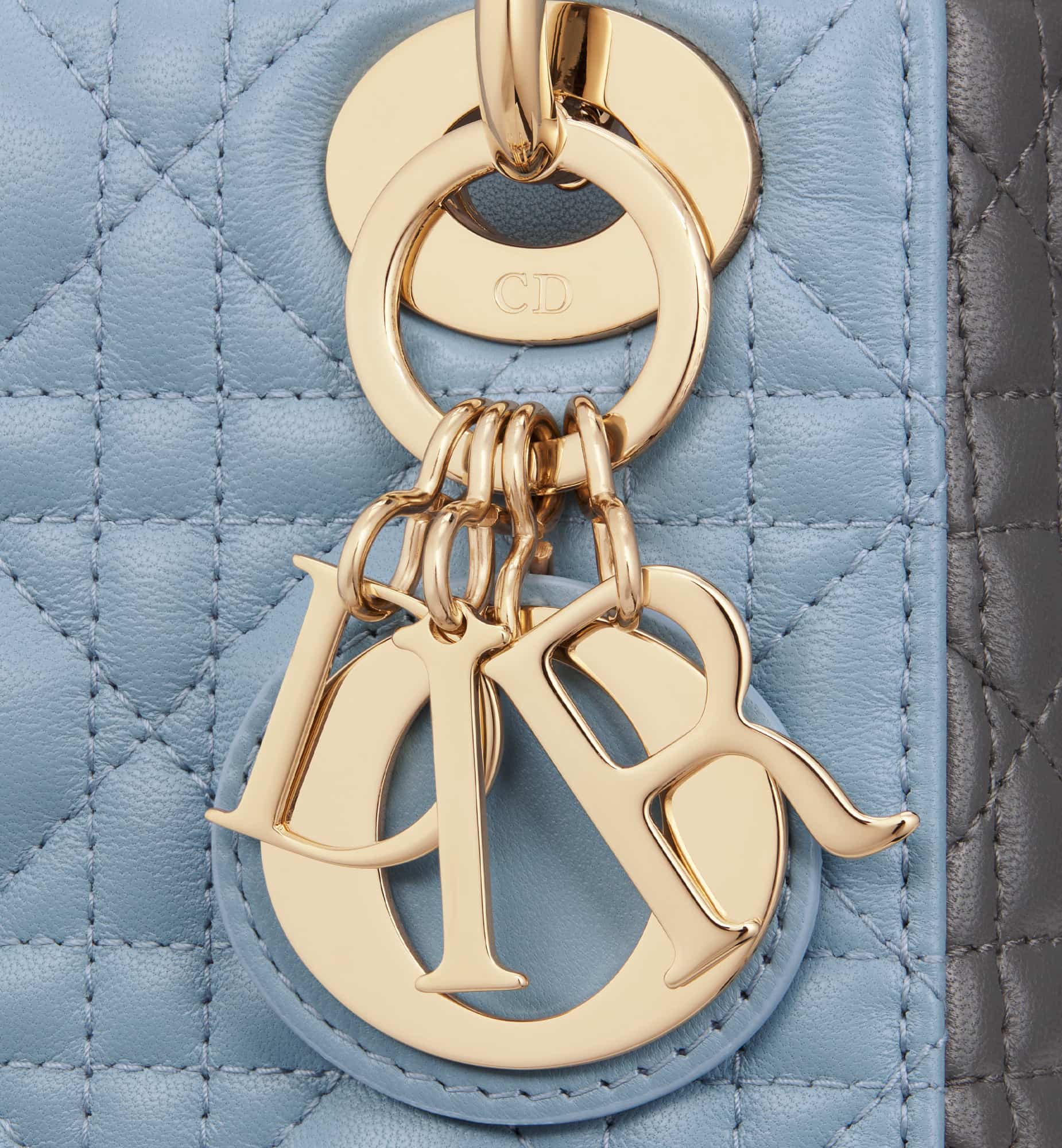 The Lady Dior bag embodies Dior’s vision of elegance and beauty. Sleek and refined, the timeless and modern style is made in two-tone sky blue and steel gray lambskin with Cannage stitching, creating the instantly recognizable quilted texture. Pale gold-finish metal D.I.O.R. charms embellish and illuminate its silhouette. Featuring a removable chain shoulder strap, the miniature Lady Dior bag can be carried by hand, worn over the shoulder or crossbody as an ideal evening wear companion.