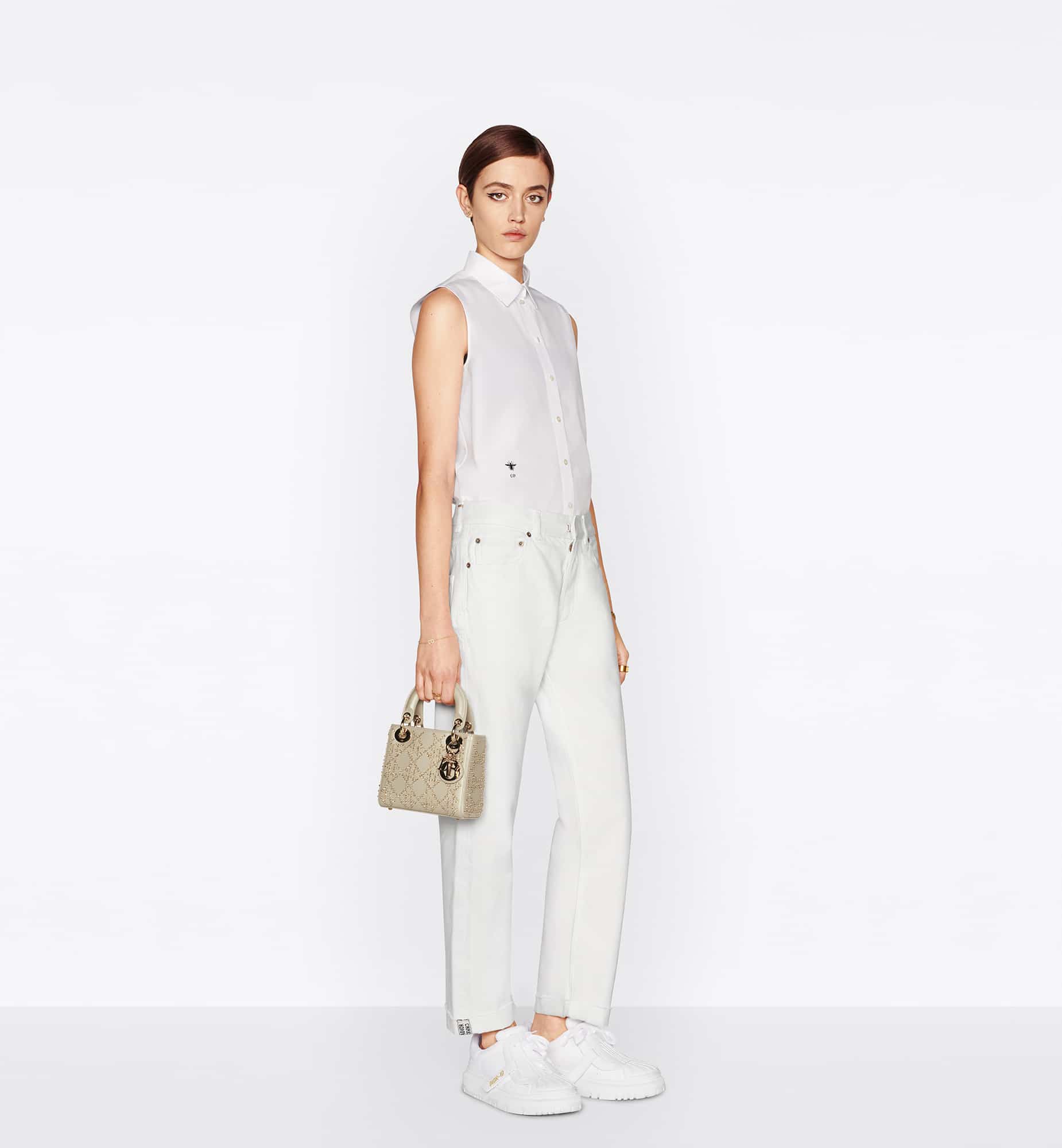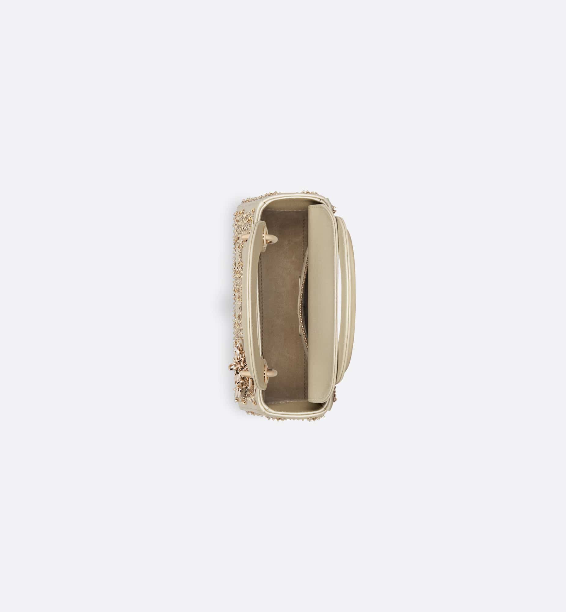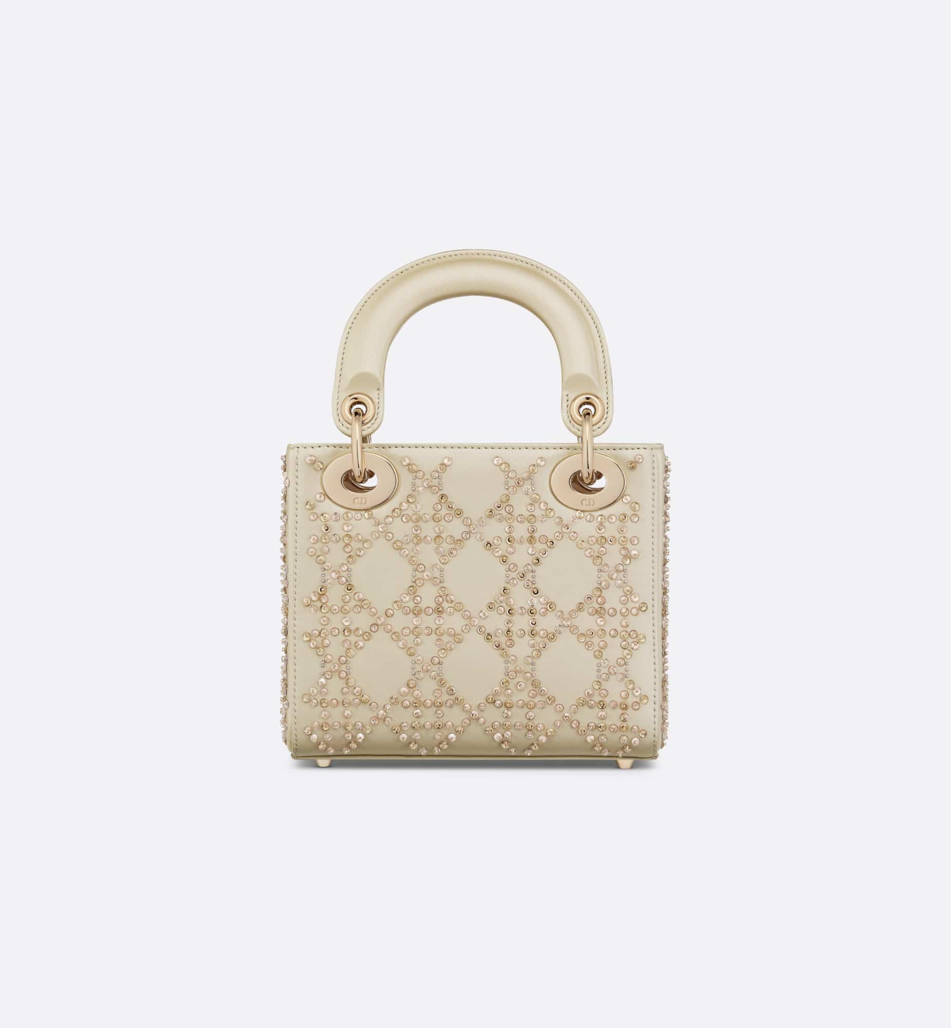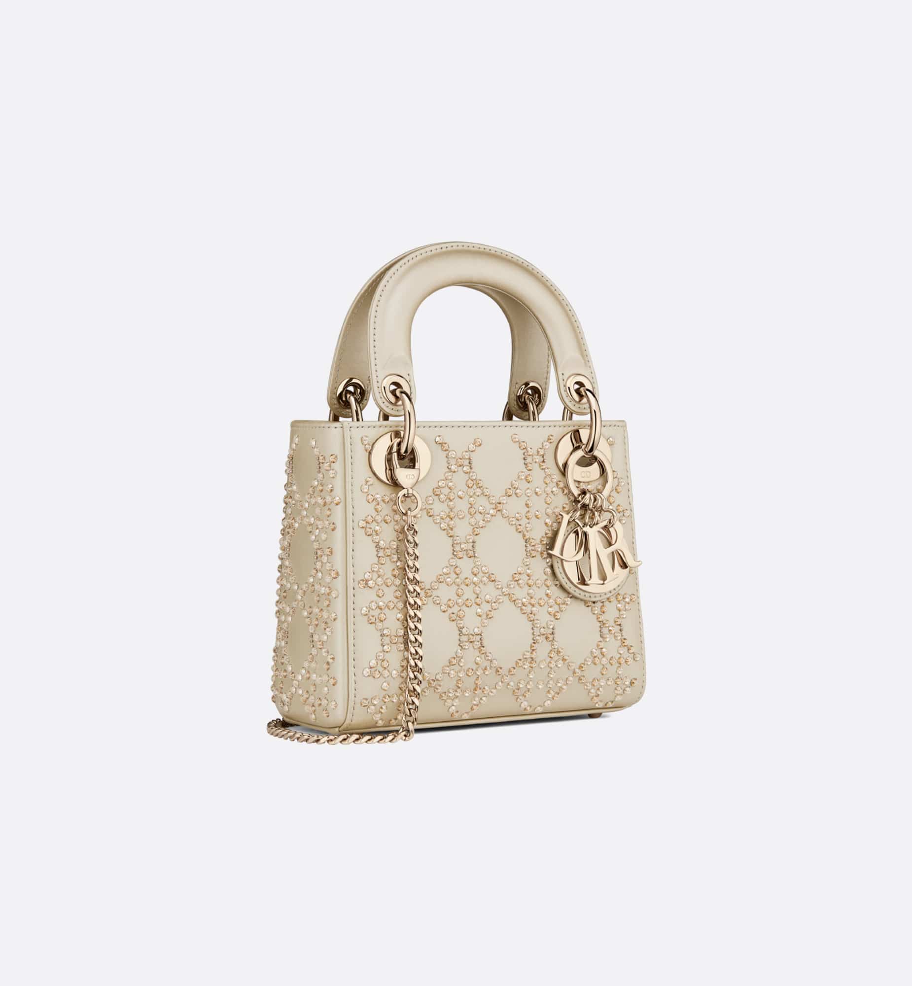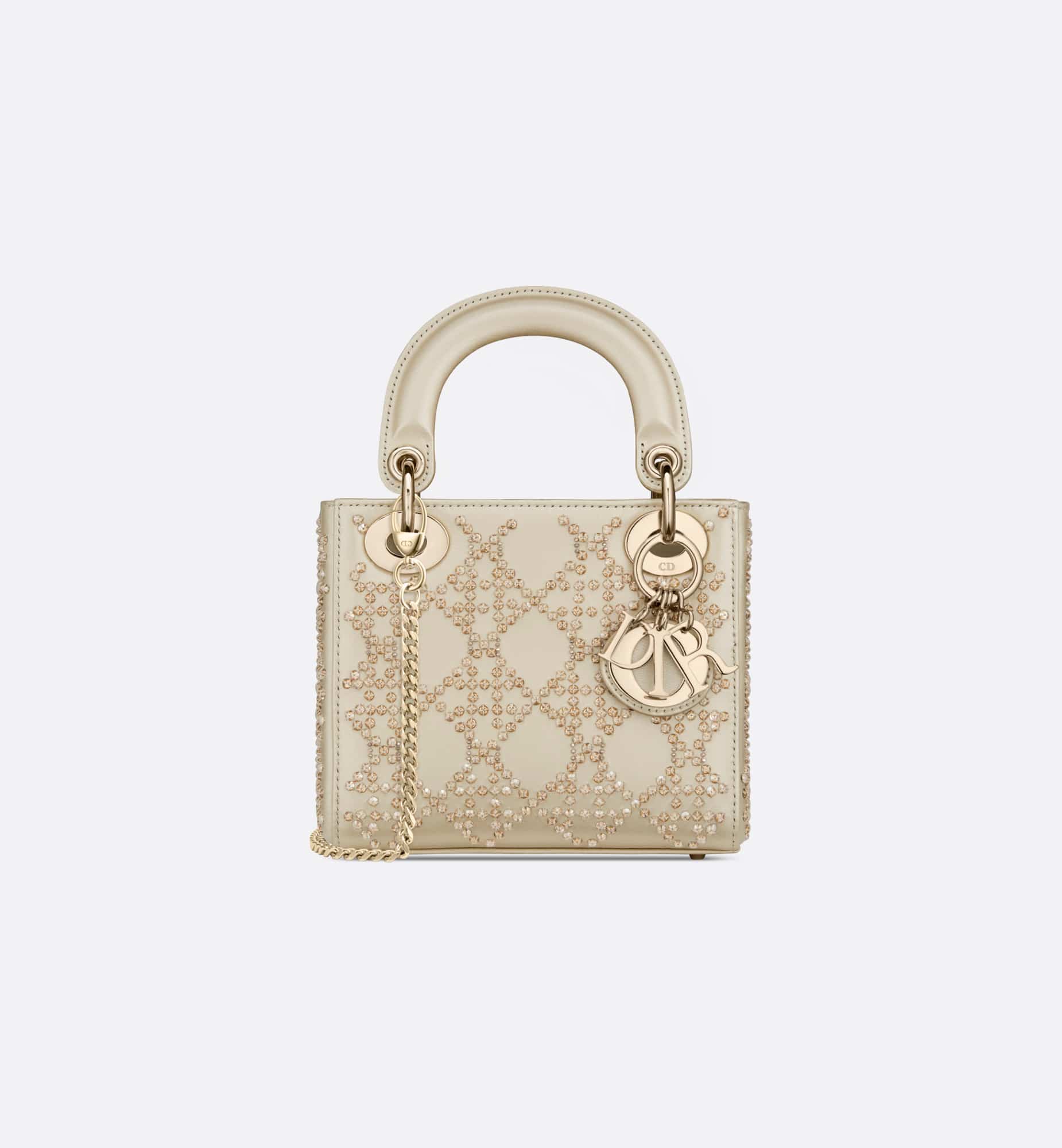 The Lady Dior bag embodies Dior’s vision of elegance and beauty. Sleek and refined, the timeless yet modern style is rafted in platinum-tone metallic lambskin and embroidered with faceted beads that capture the light and create a Cannage motif, while the pale gold-finish metal D.I.O.R. charms further embellish its silhouette. The miniature style, an ideal evening wear companion, has a removable chain shoulder strap.