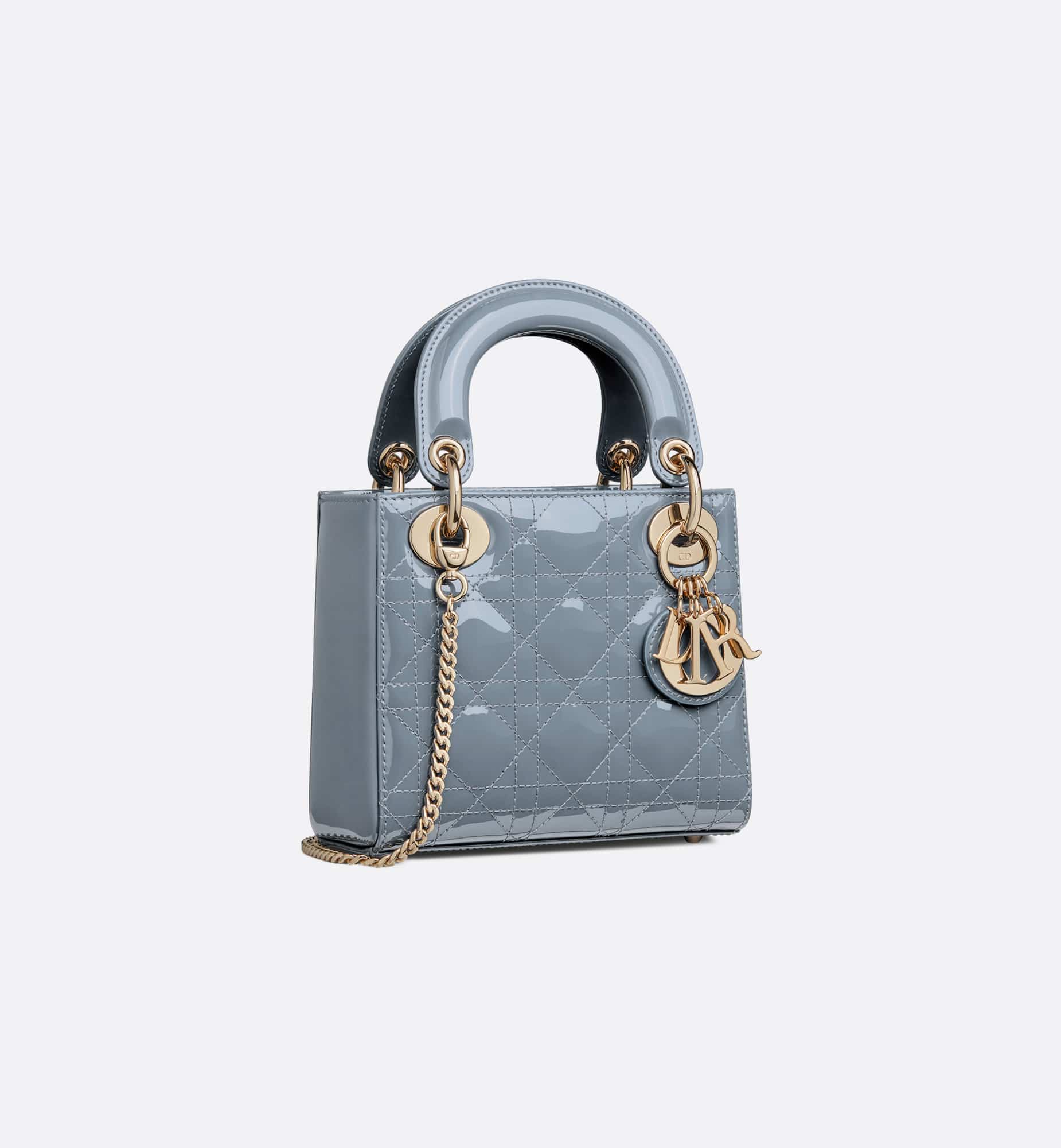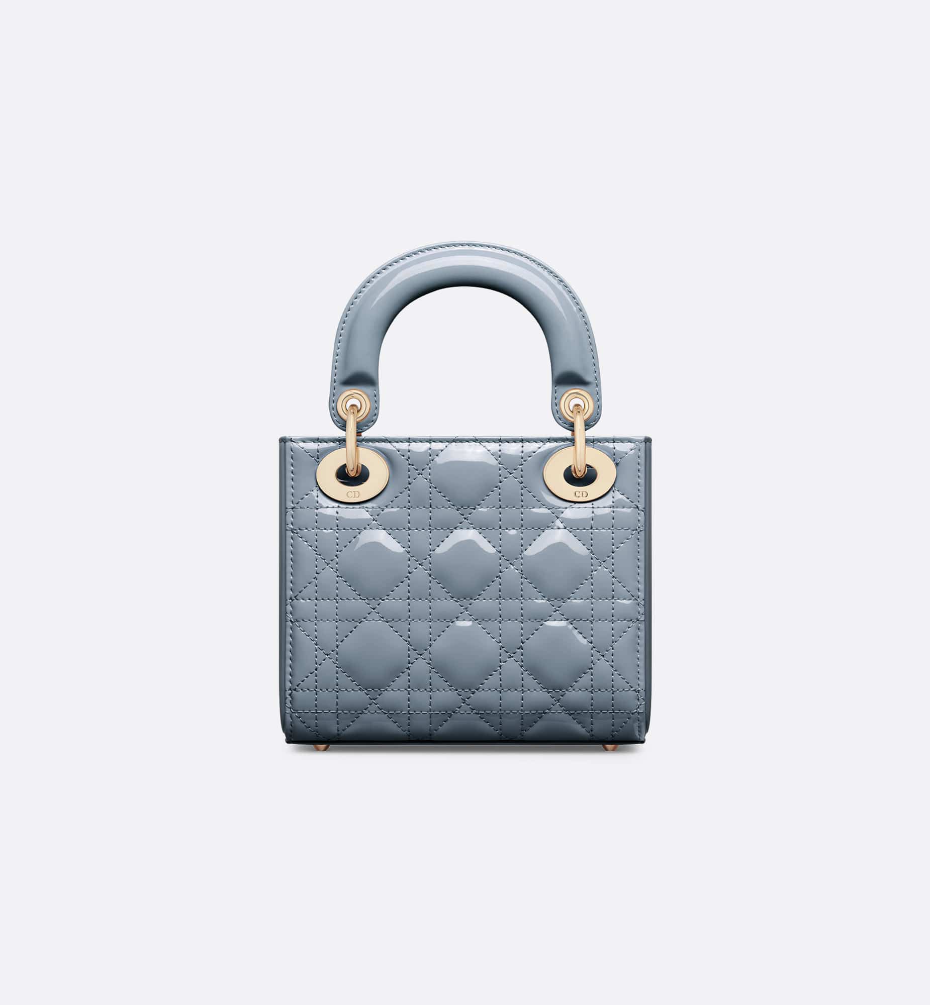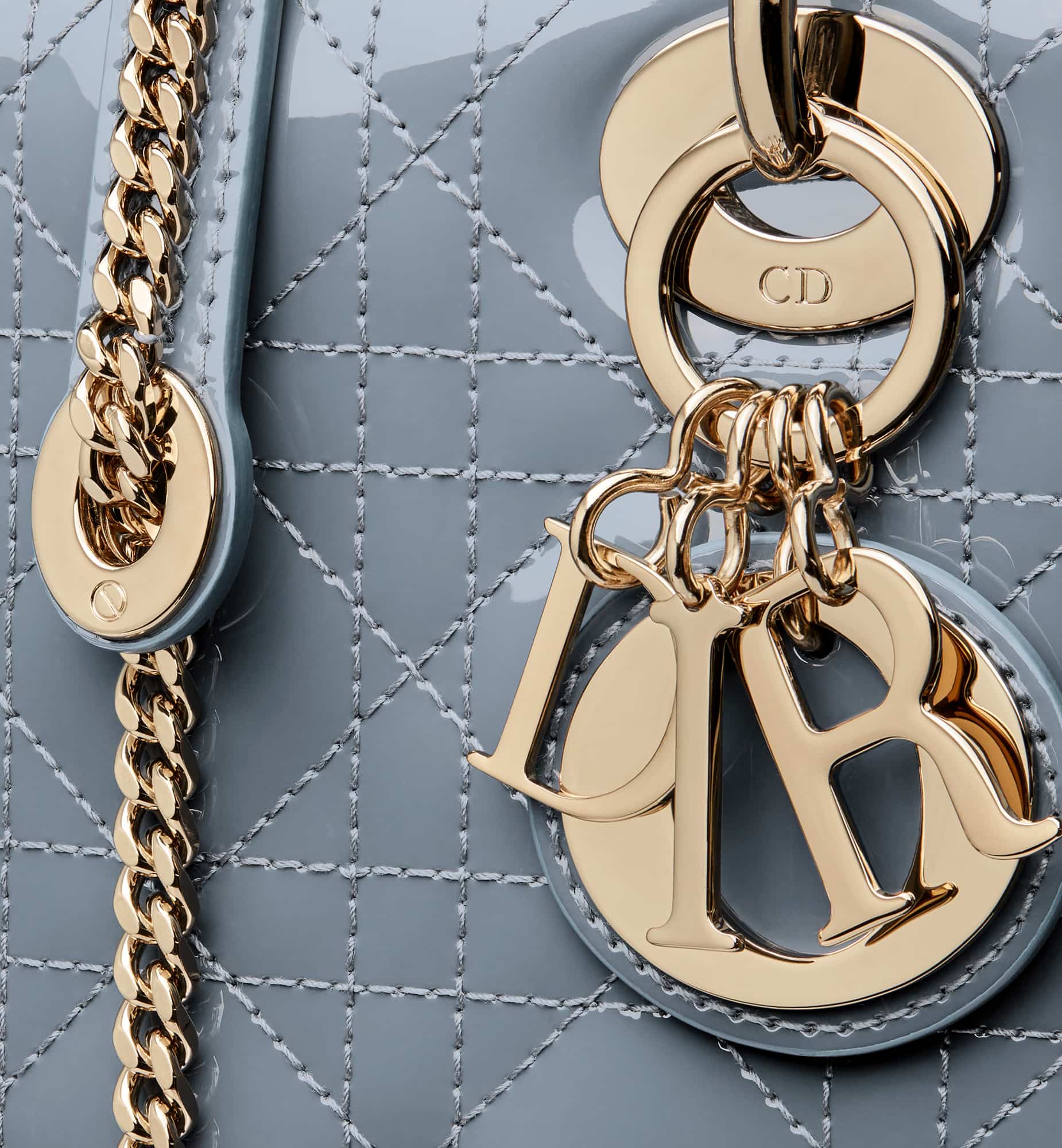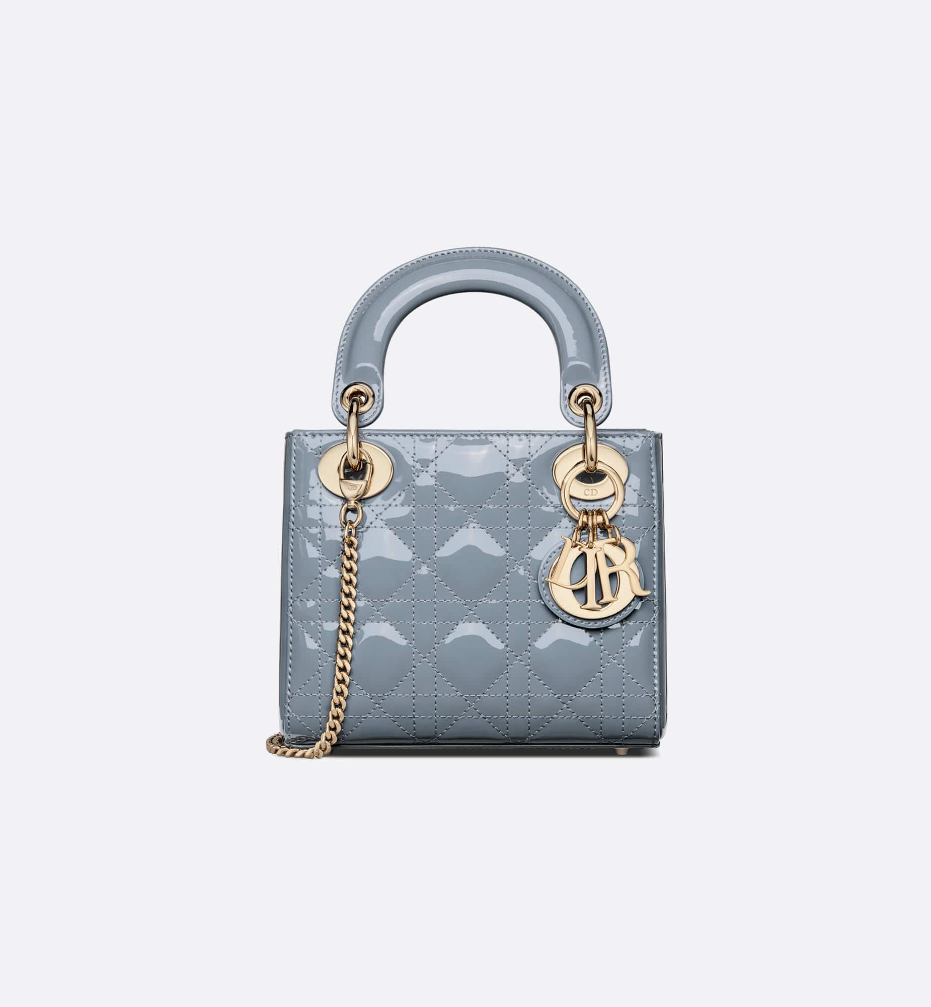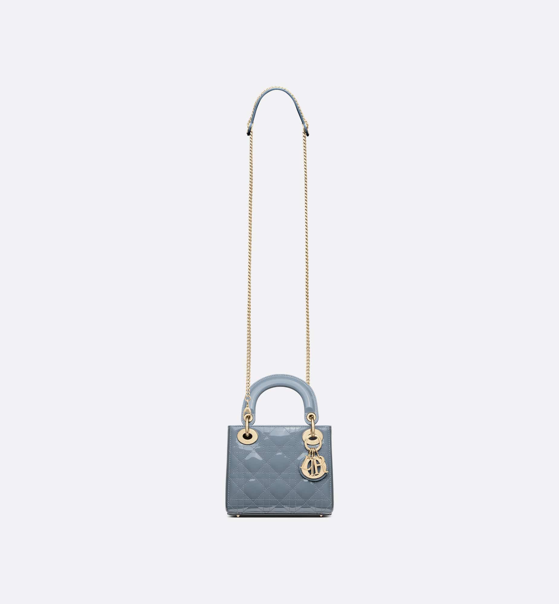 The Lady Dior bag epitomizes the House’s vision of elegance and beauty. Sleek and refined, the timeless style is crafted in cloud blue patent calfskin with Cannage stitching, creating the legendary and instantly recognizable quilted texture, while the pale gold-finish metal D.I.O.R. charms further embellish its silhouette. Featuring a removable chain strap, the miniature Lady Dior bag can be carried by hand or crossbody as an ideal evening wear companion.