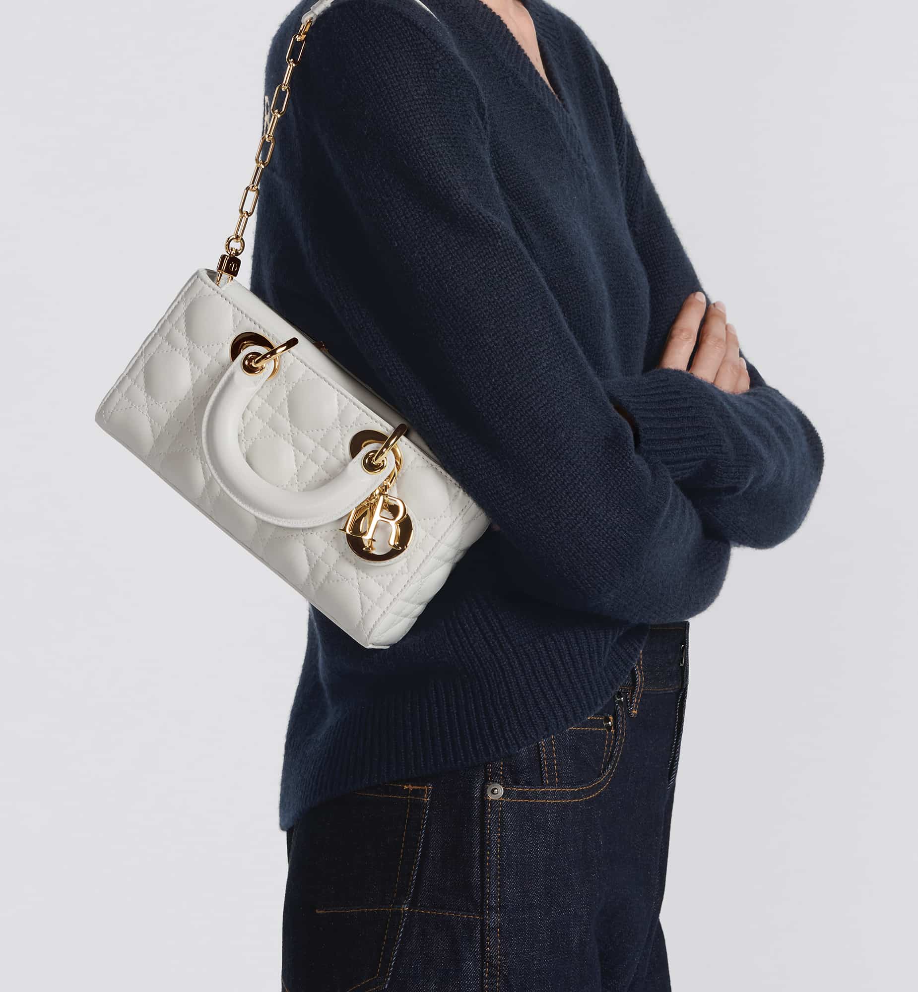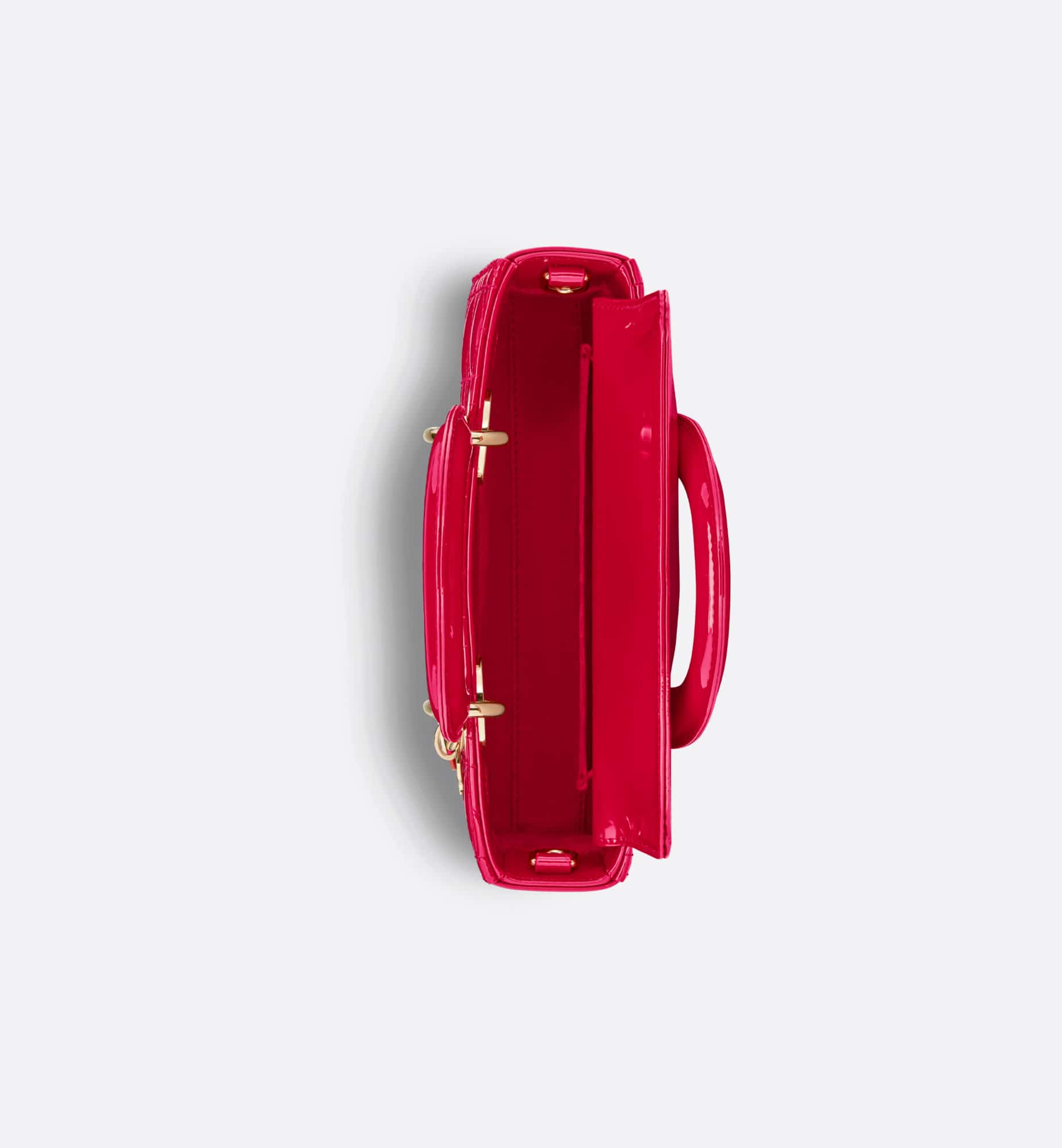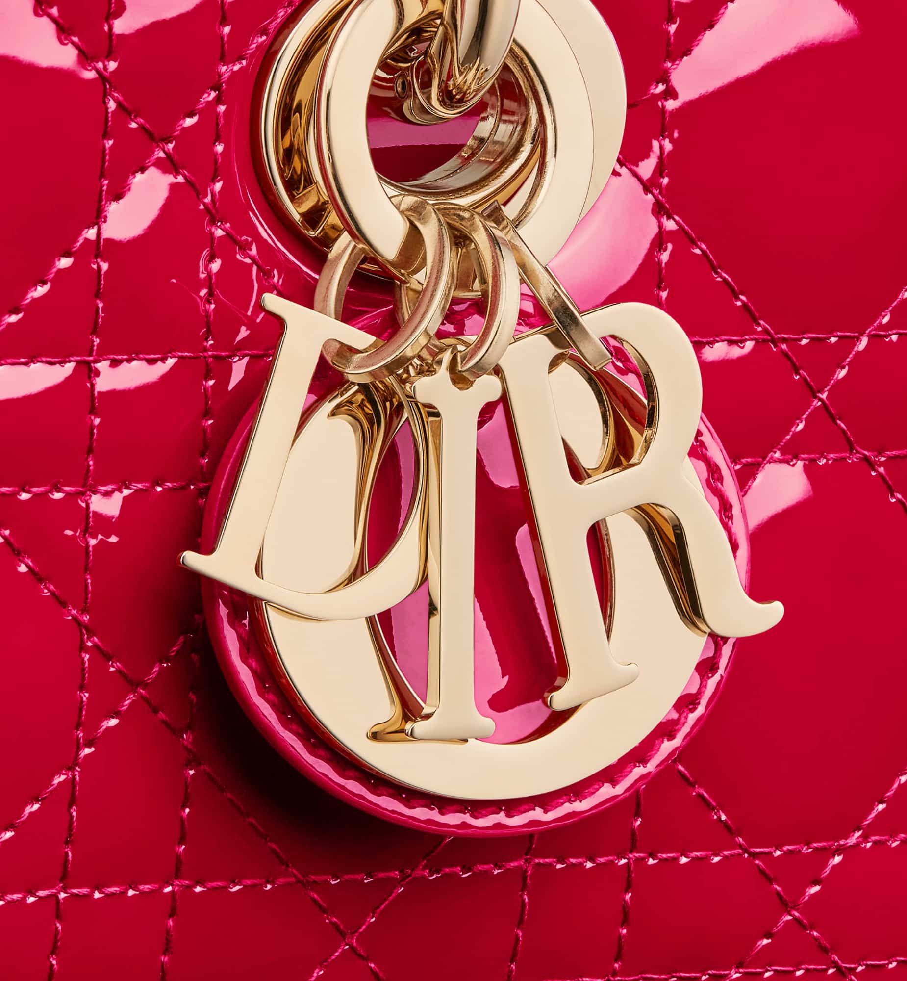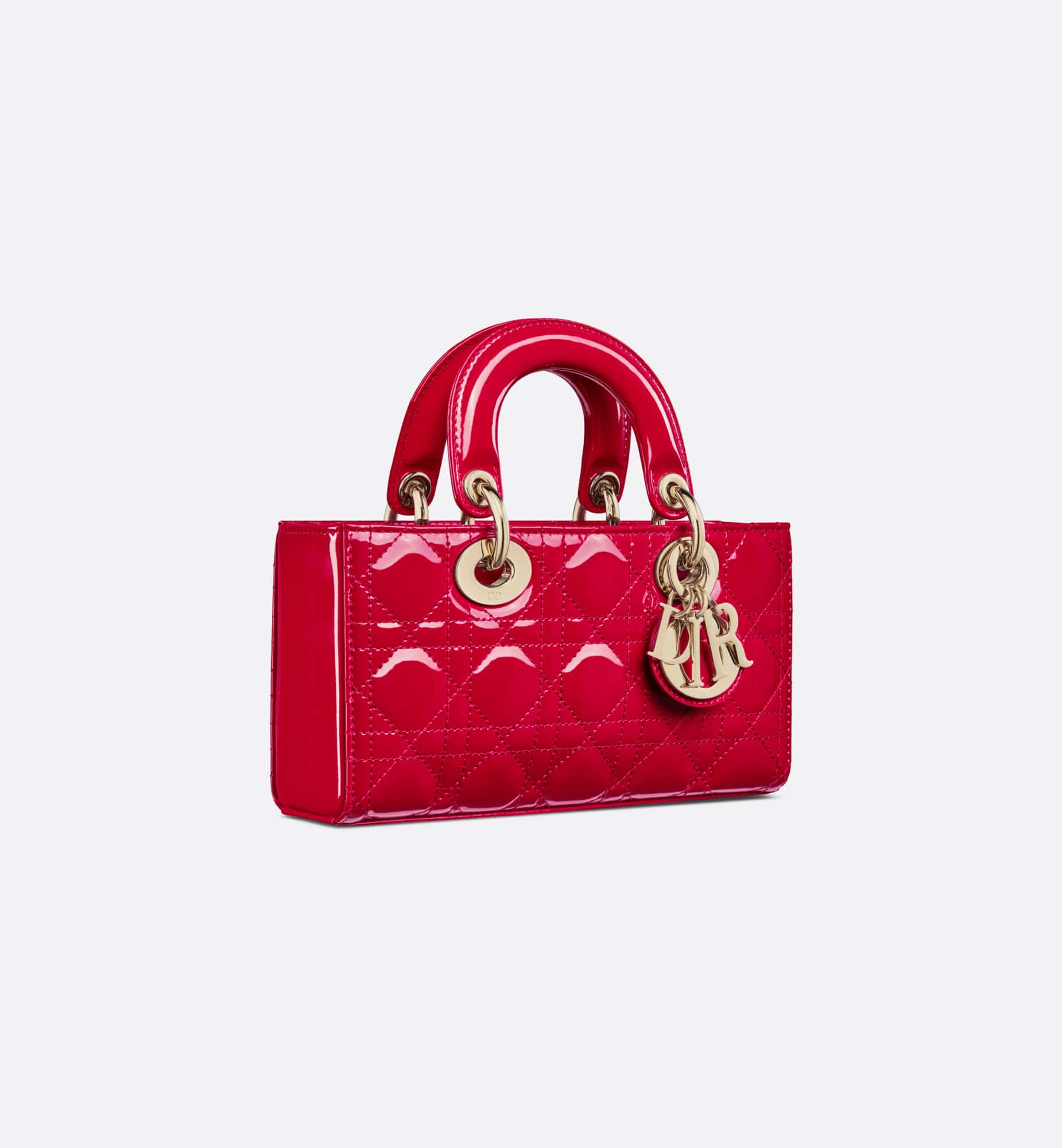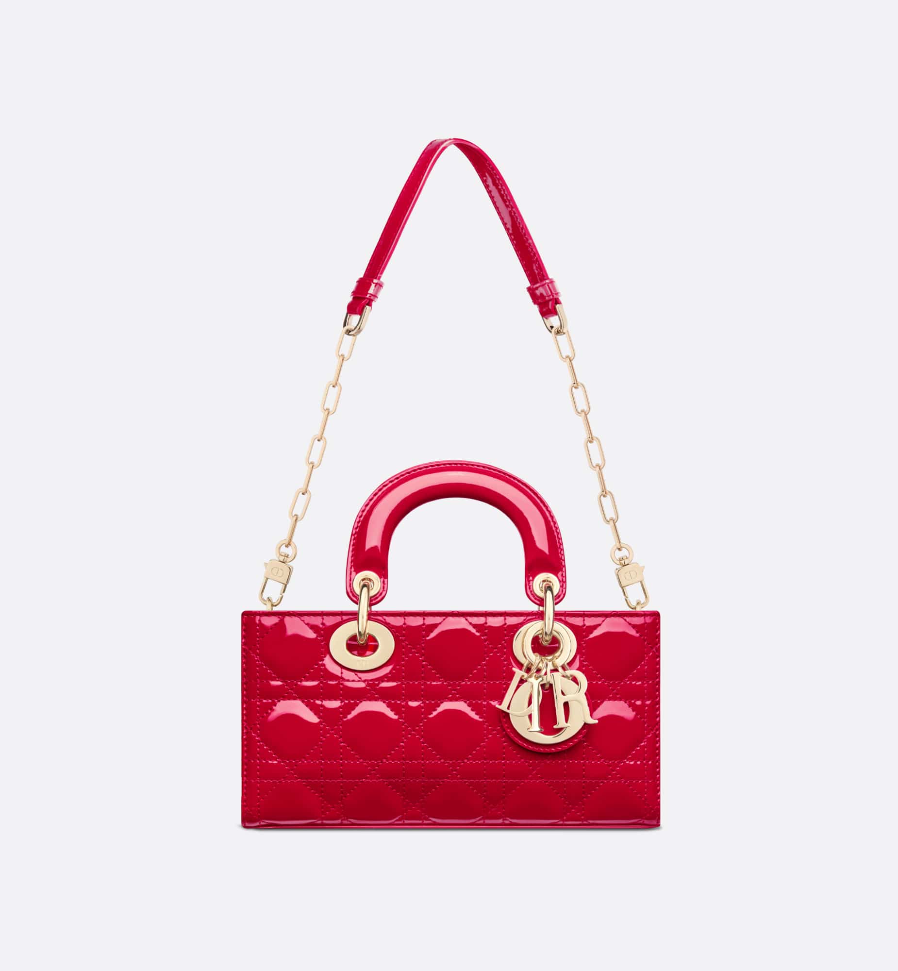 The Lady D-Joy bag captures the House’s vision of elegance and beauty by showcasing the iconic streamlined aesthetic of the Lady Dior line. Crafted in amaryllis red patent calfskin with Cannage stitching, the legendary quilted texture is immediately recognizable. Pale gold-finish metal D.I.O.R. charms embellish and illuminate its silhouette. Featuring one removable chain strap and another adjustable and removable leather strap, the small Lady D-Joy bag can be carried by hand, worn over the shoulder or crossbody as a daily companion.