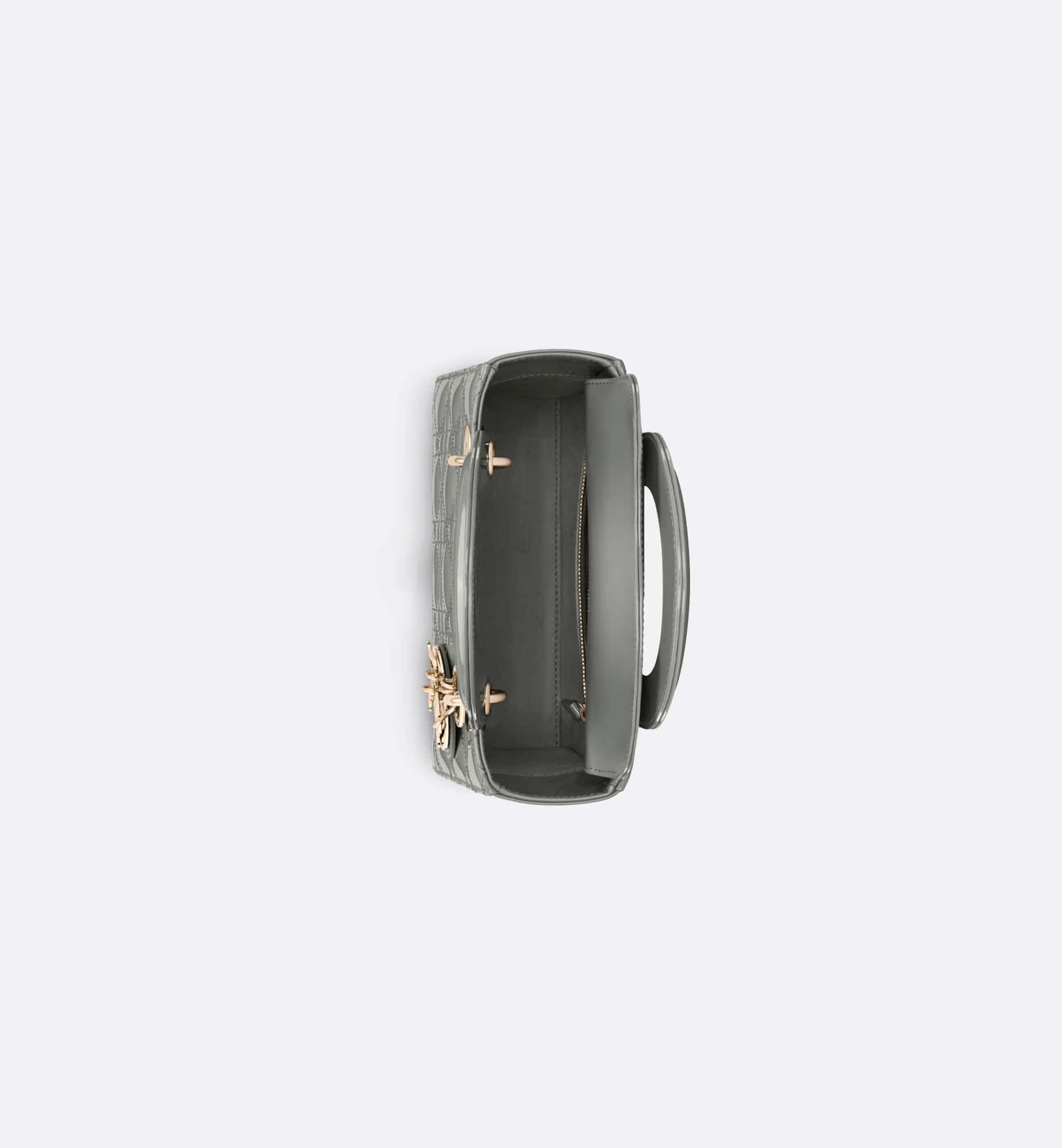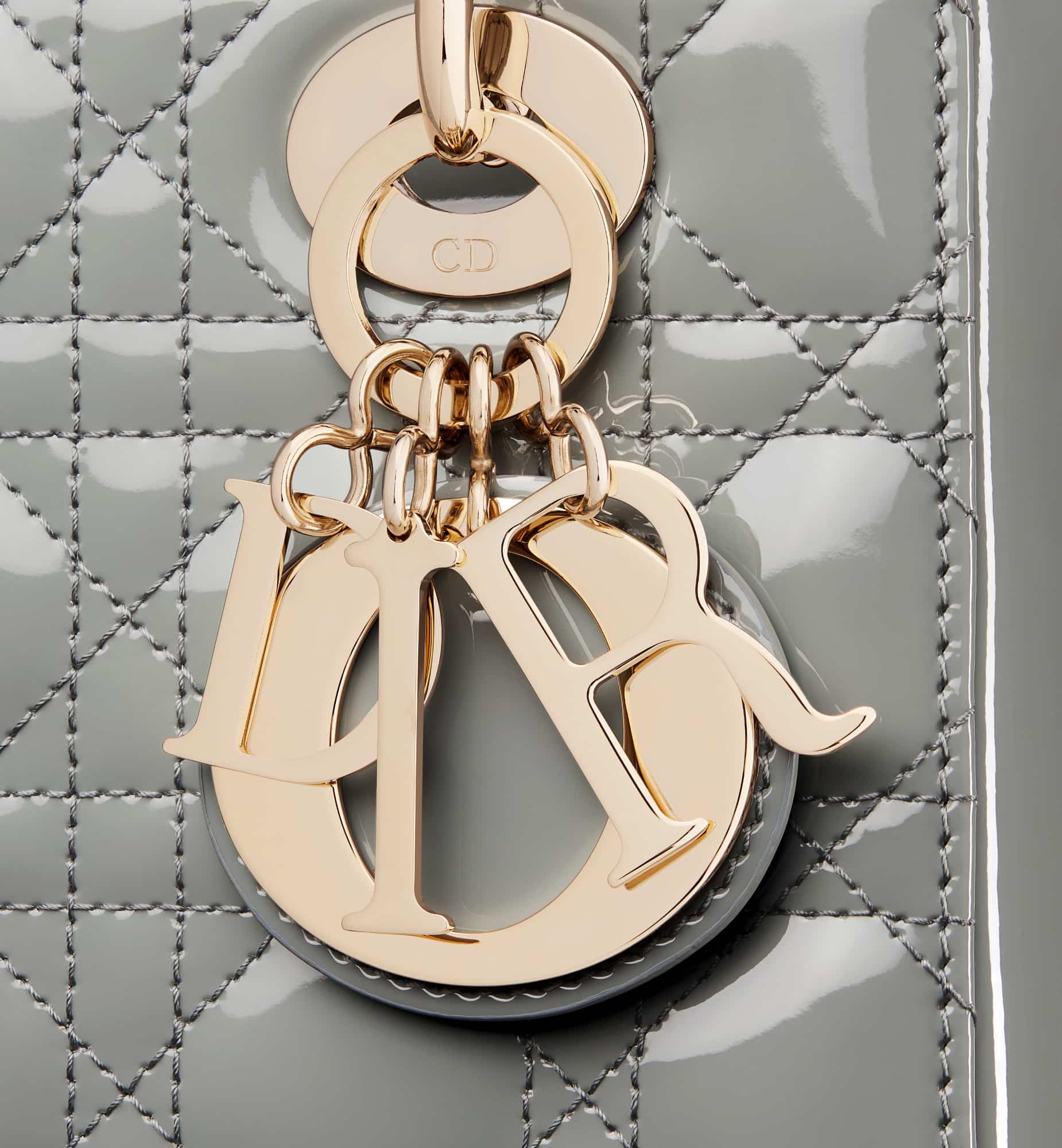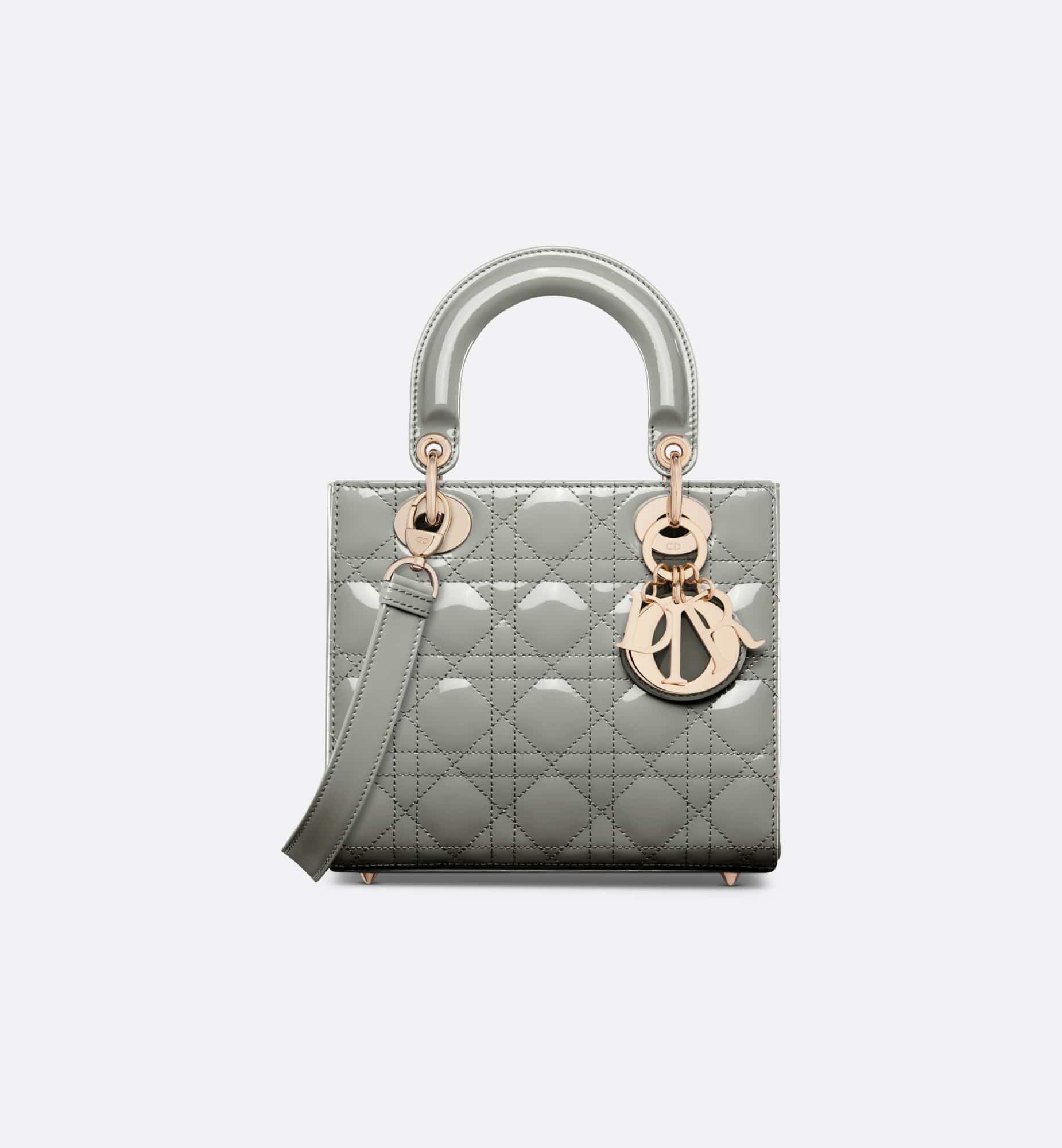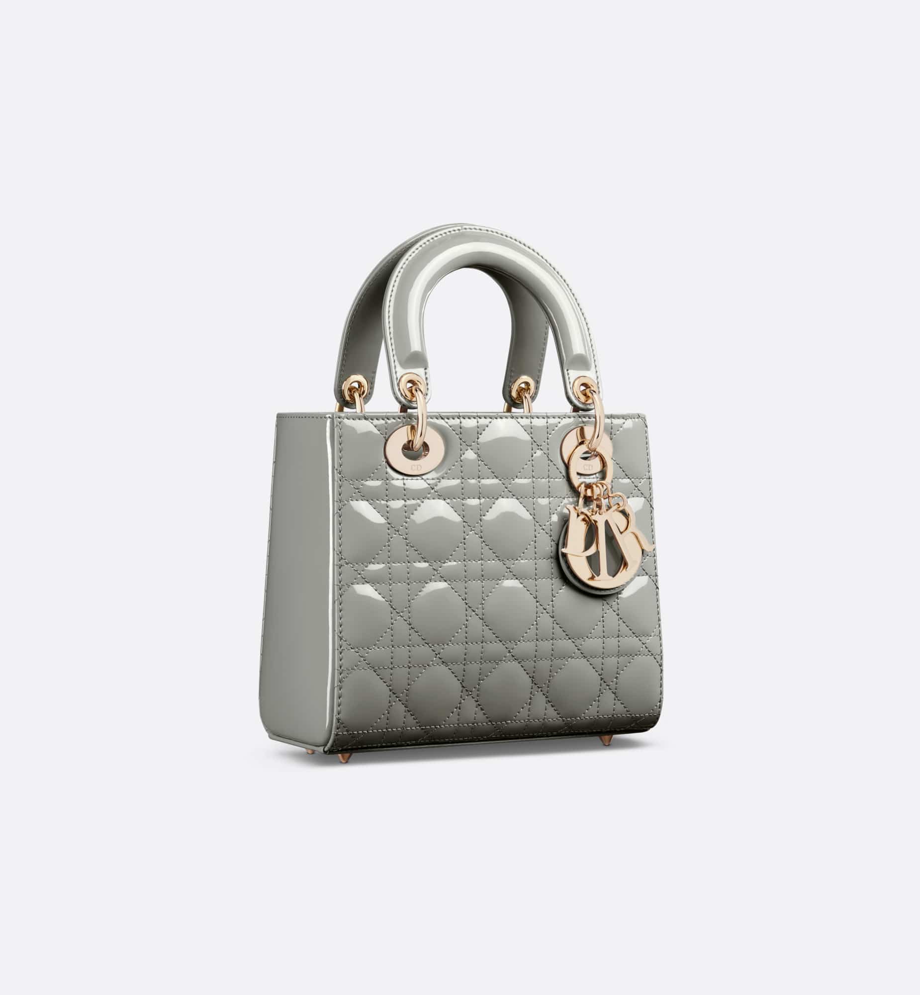 The Lady Dior bag epitomizes Dior’s vision of elegance and beauty. Sleek and refined, the timeless style is crafted in stone gray patent calfskin with Cannage stitching, creating the instantly recognizable quilted texture. Pale gold-finish metal D.I.O.R. charms further embellish its silhouette. The small Lady Dior bag features a thin, removable leather shoulder strap and can be carried by hand or worn crossbody.