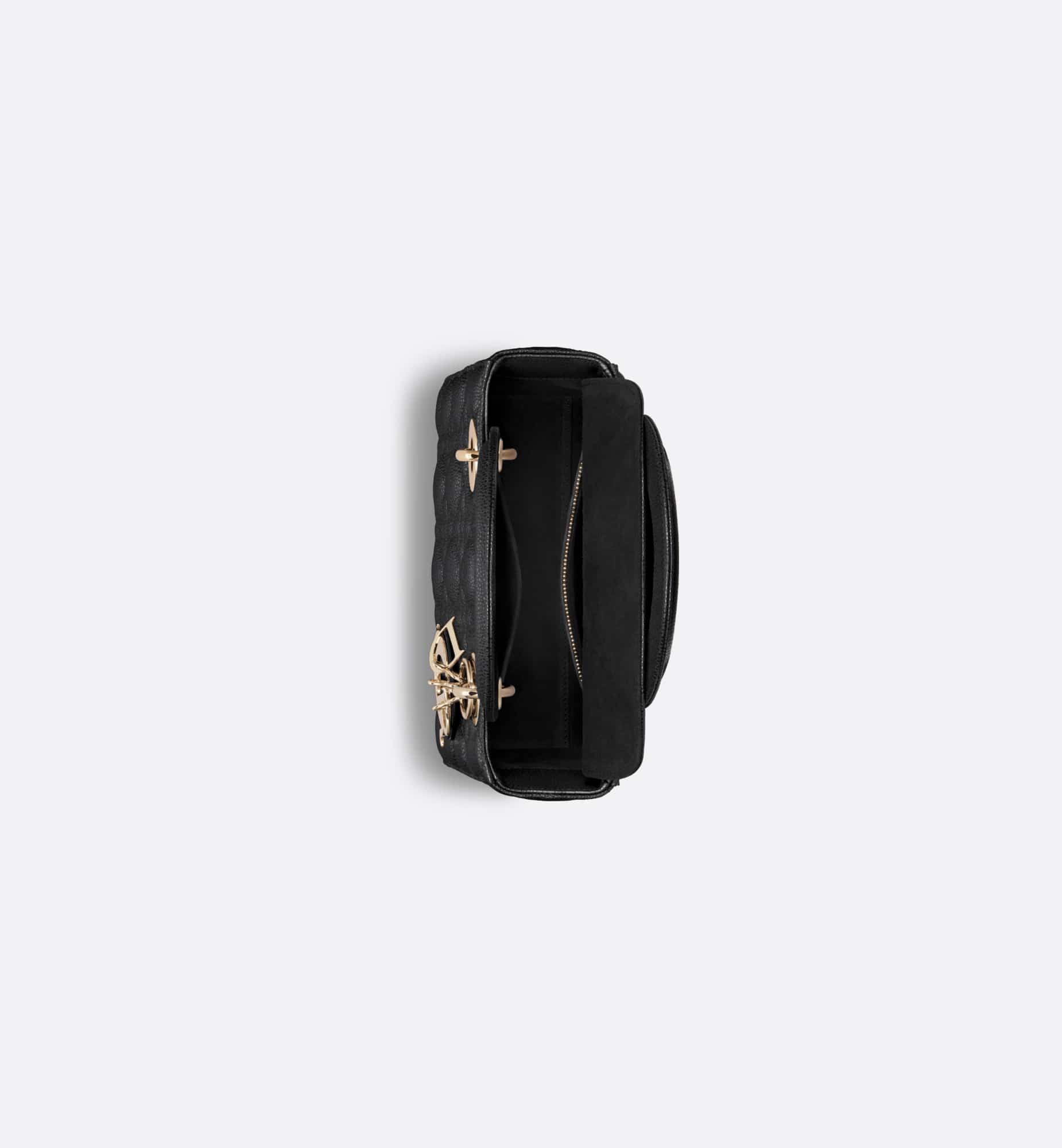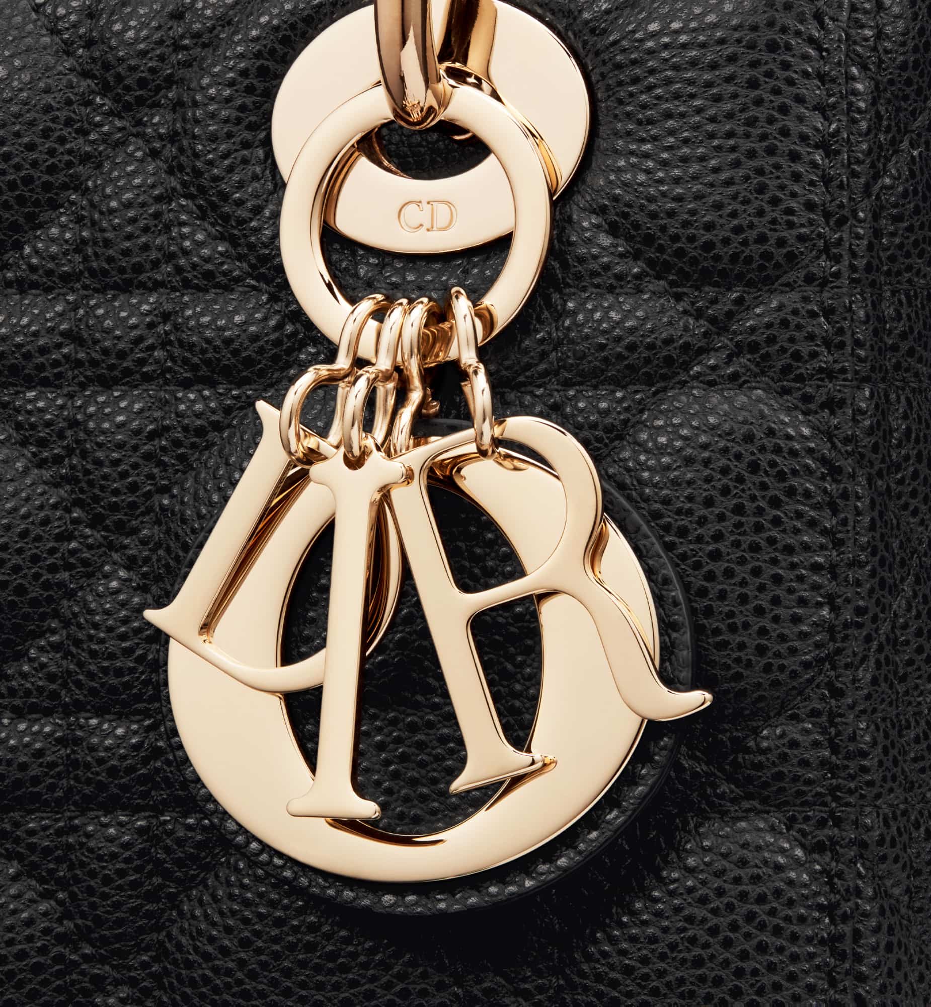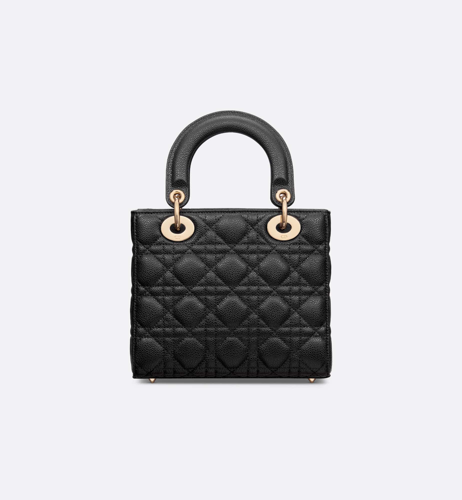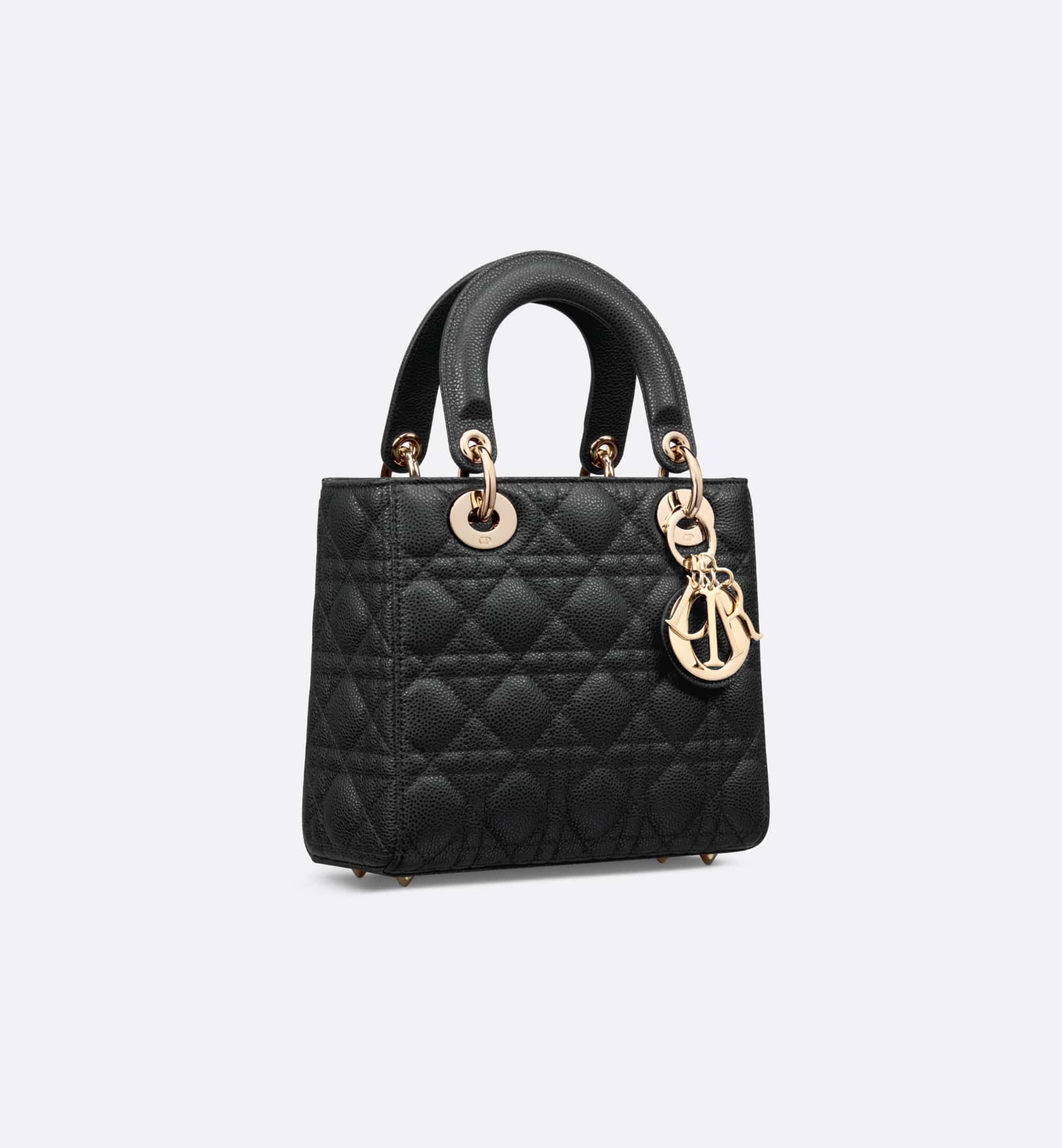 The Lady Dior bag epitomizes Dior’s vision of elegance and beauty. Sleek and refined, the timeless style is crafted in black grained calfskin with Cannage stitching, creating the instantly recognizable quilted texture. Pale gold-finish metal D.I.O.R. charms further embellish its silhouette. The small Lady Dior bag features a thin, removable leather shoulder strap and can be carried by hand or worn crossbody.
