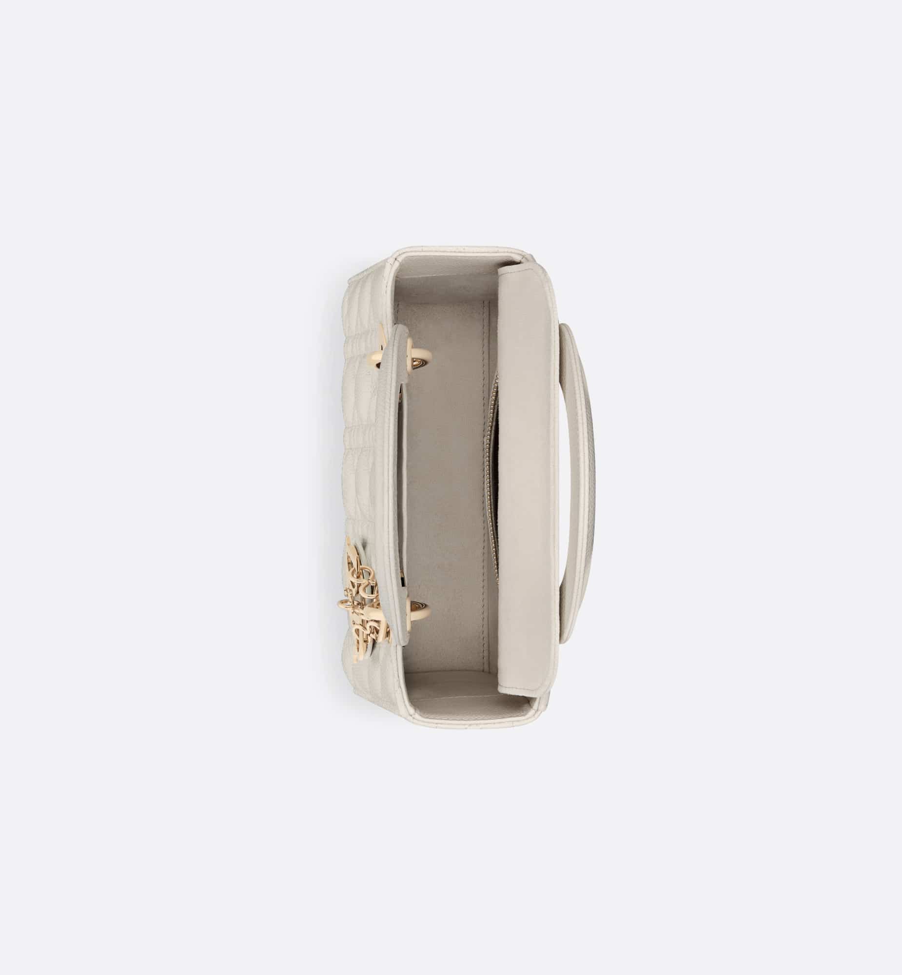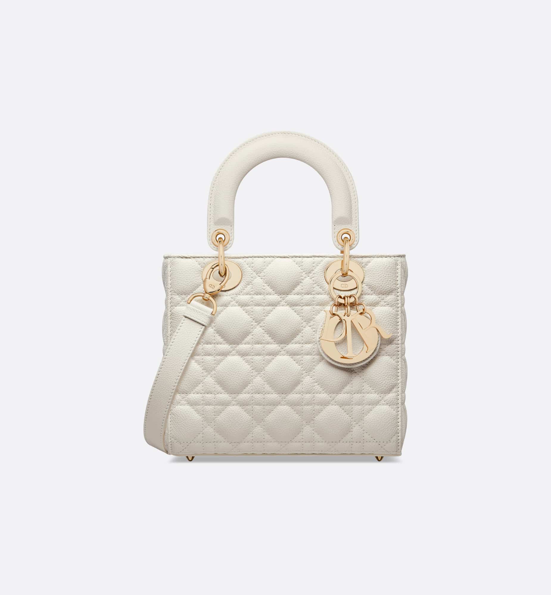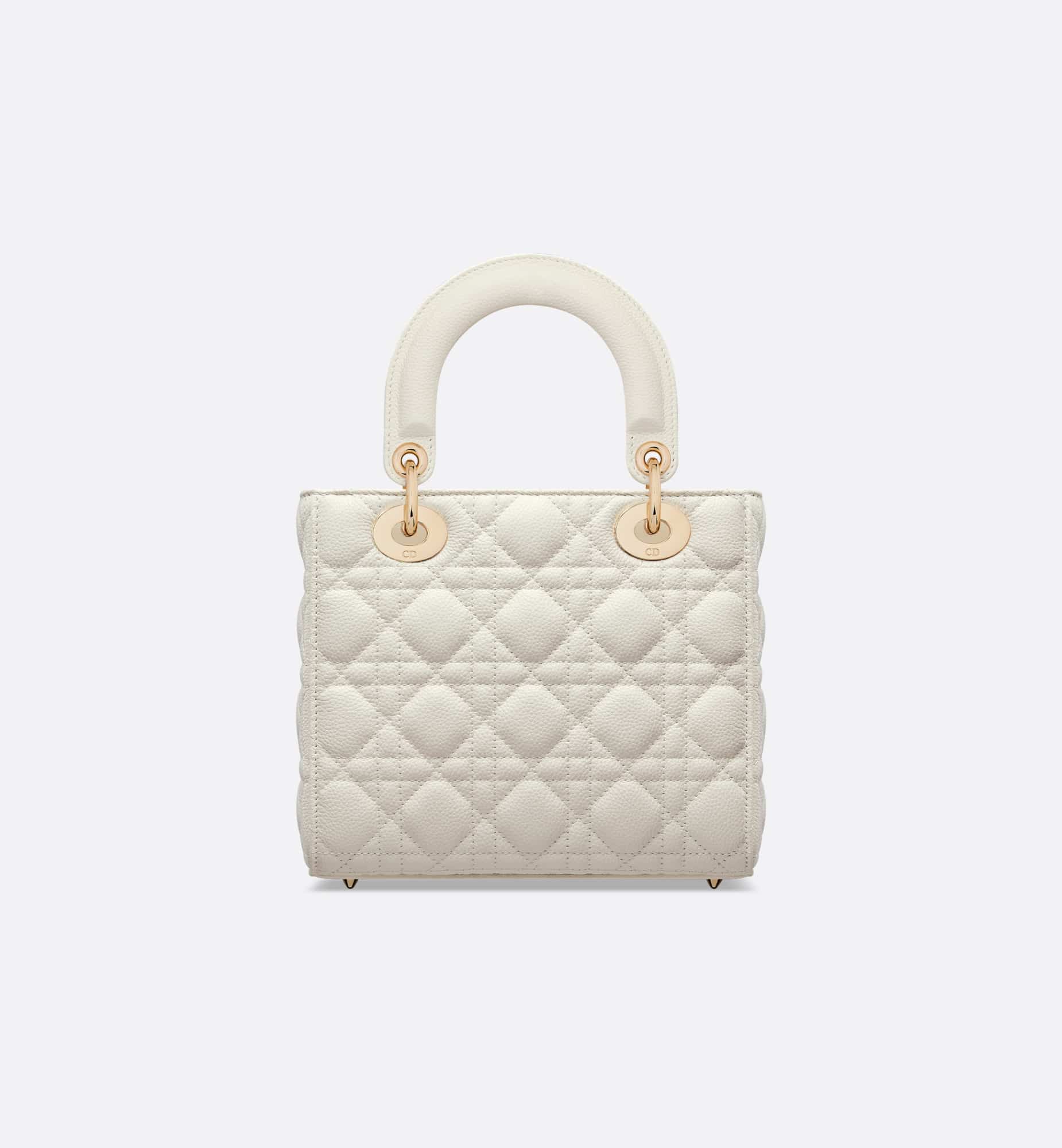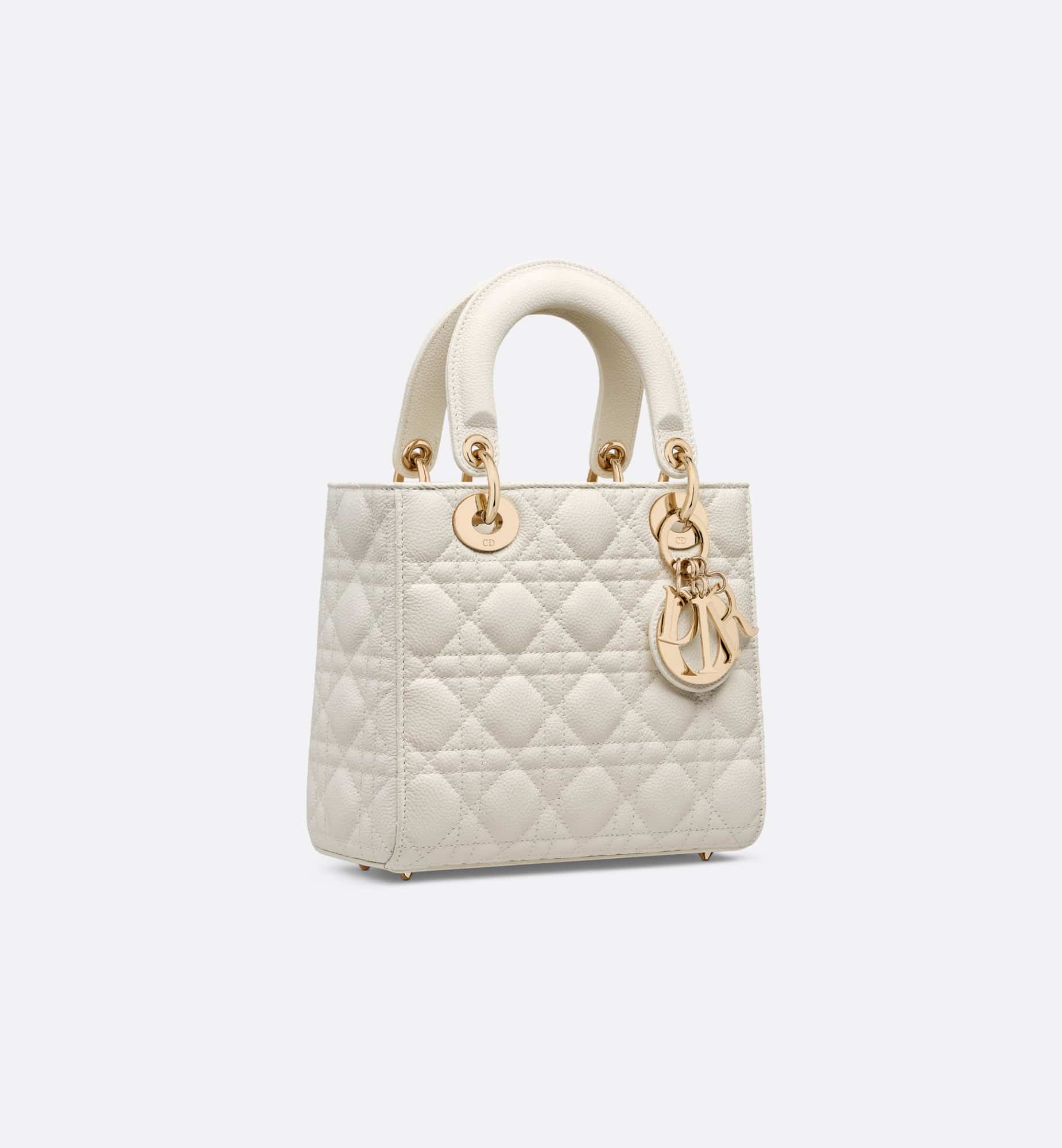 The Lady Dior bag embodies the House’s vision of elegance and beauty. Sleek and refined, the timeless style is crafted in latte grained calfskin with Cannage stitching, creating the instantly recognizable quilted texture, while the pale gold-finish metal D.I.O.R. charms further embellish its silhouette. Featuring a thin, removable leather shoulder strap, the small Lady Dior bag can be carried by hand or worn crossbody.