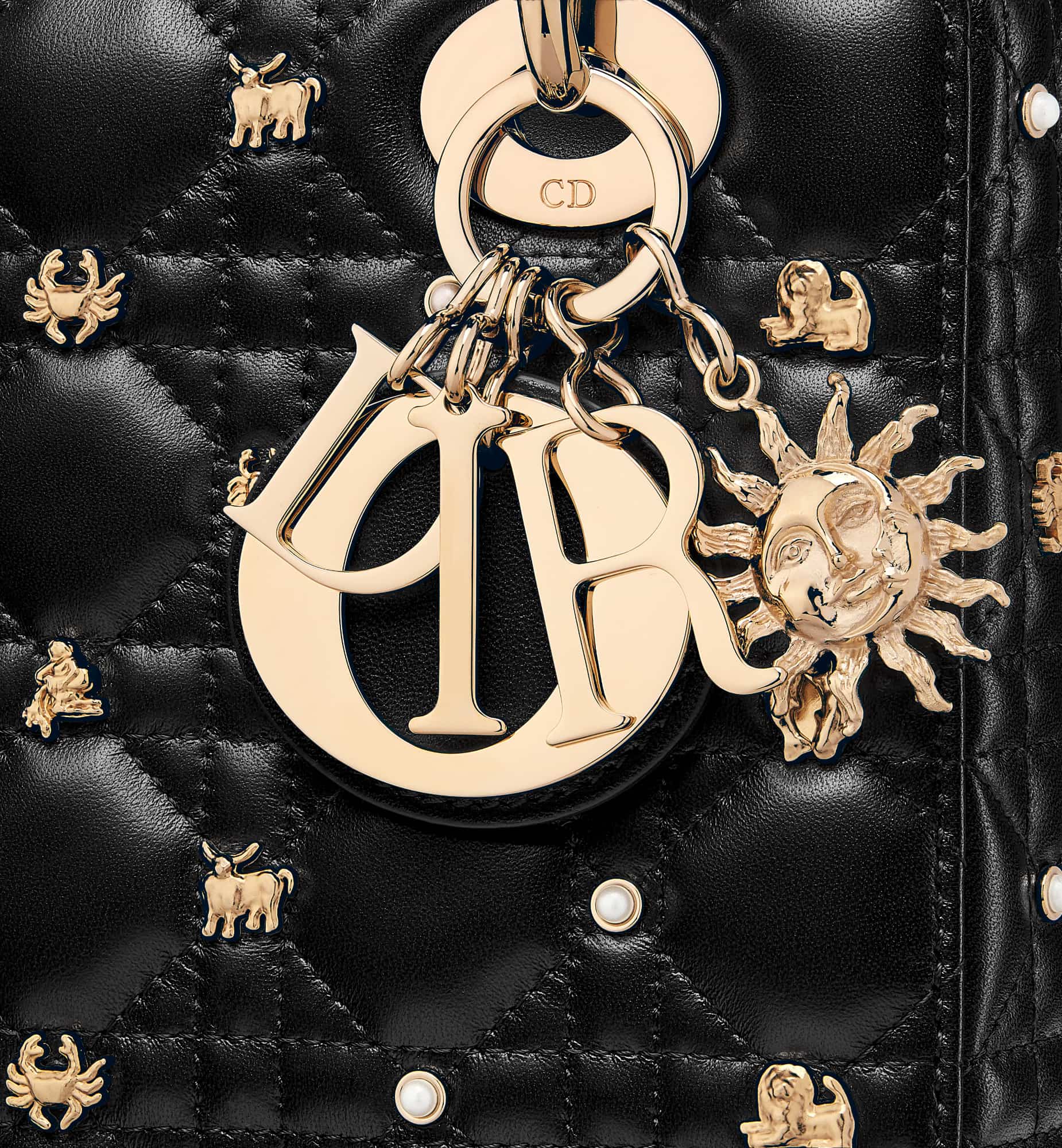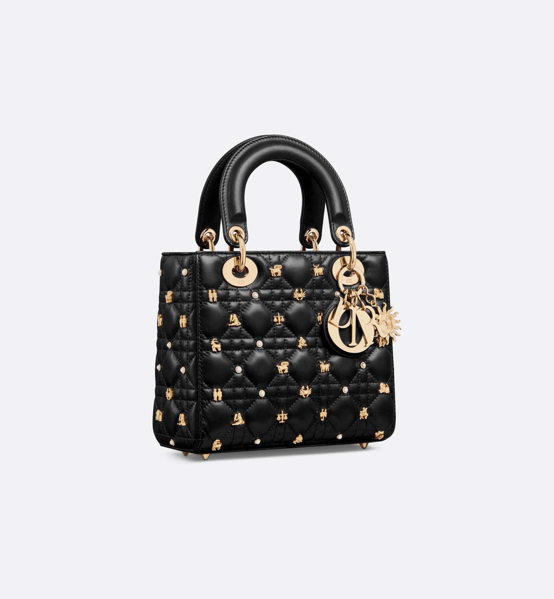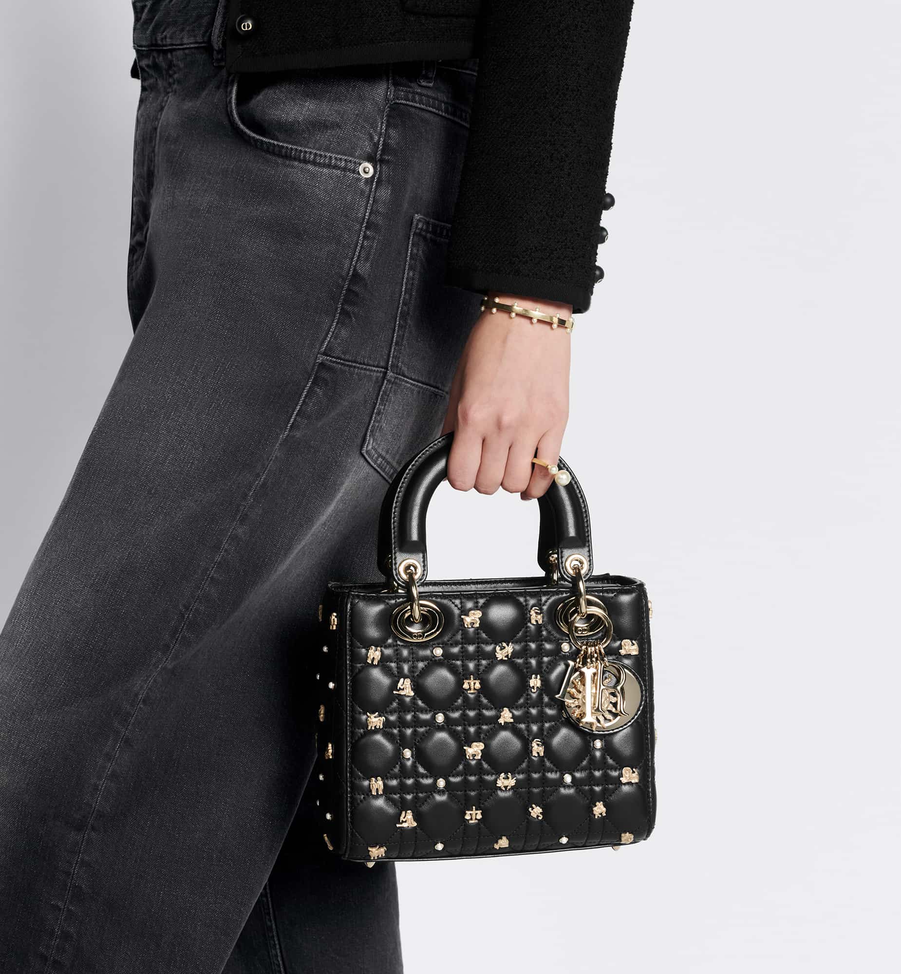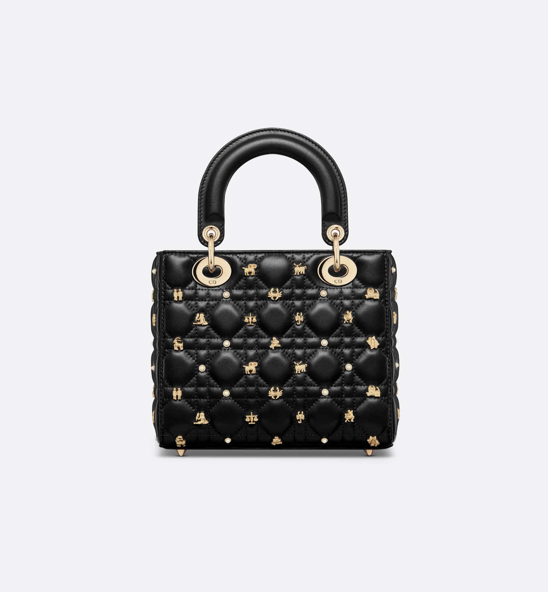 The Lady Dior My ABCDior bag epitomizes Dior’s vision of elegance and beauty. Sleek and refined, the creation is timeless. Constructed in black Cannage lambskin, the bag is accented by gold-tone resin pearls and gold-finish zodiac sign studs. Pale gold-finish metal D.I.O.R. charms embellish and illuminate the silhouette. The unique, small design may be personalized with badges placed on its shoulder strap and can be carried by hand or worn crossbody.