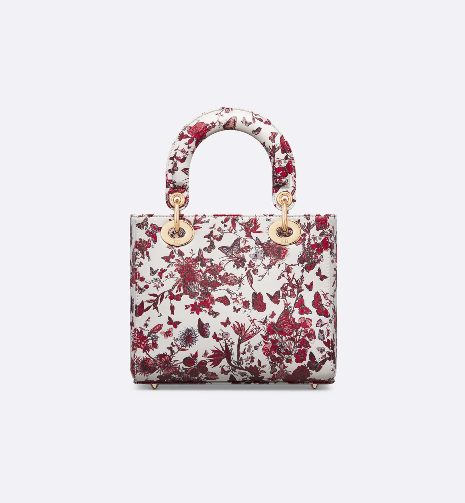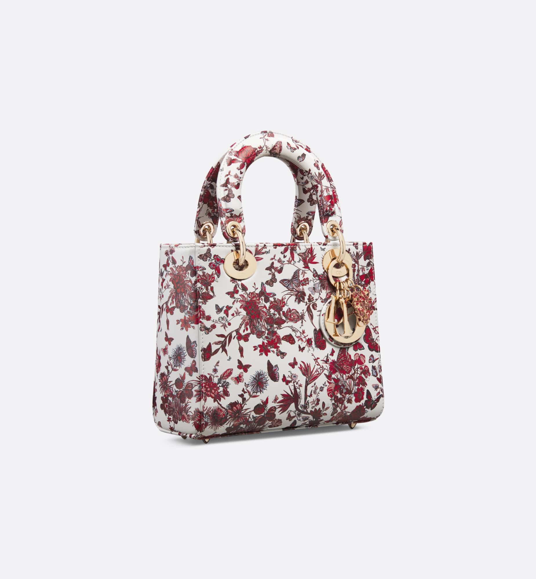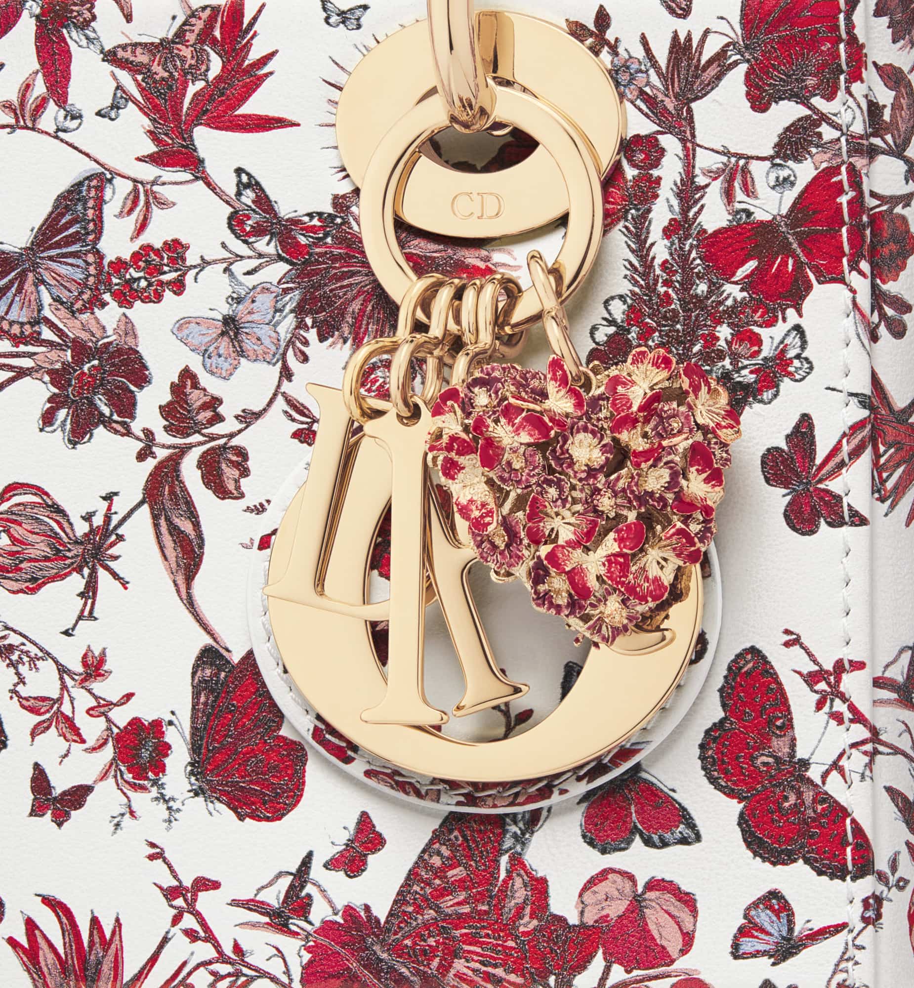 The Lady Dior My ABCDior bag captures the House’s vision of elegance and beauty. Refined and sophisticated, the style is timeless. Celebrating Dior’s vision of love and romance, the white calfskin features the red Le C?ur des Papillons motif by Pietro Ruffo, showcasing a bouquet of flowers and butterflies. Pale gold-finish metal D.I.O.R. charms are embellished with a Heart charm with red lacquer butterflies. Featuring a shoulder strap that can be personalized by adding badges, the unique, small bag can be carried by hand or worn crossbody.