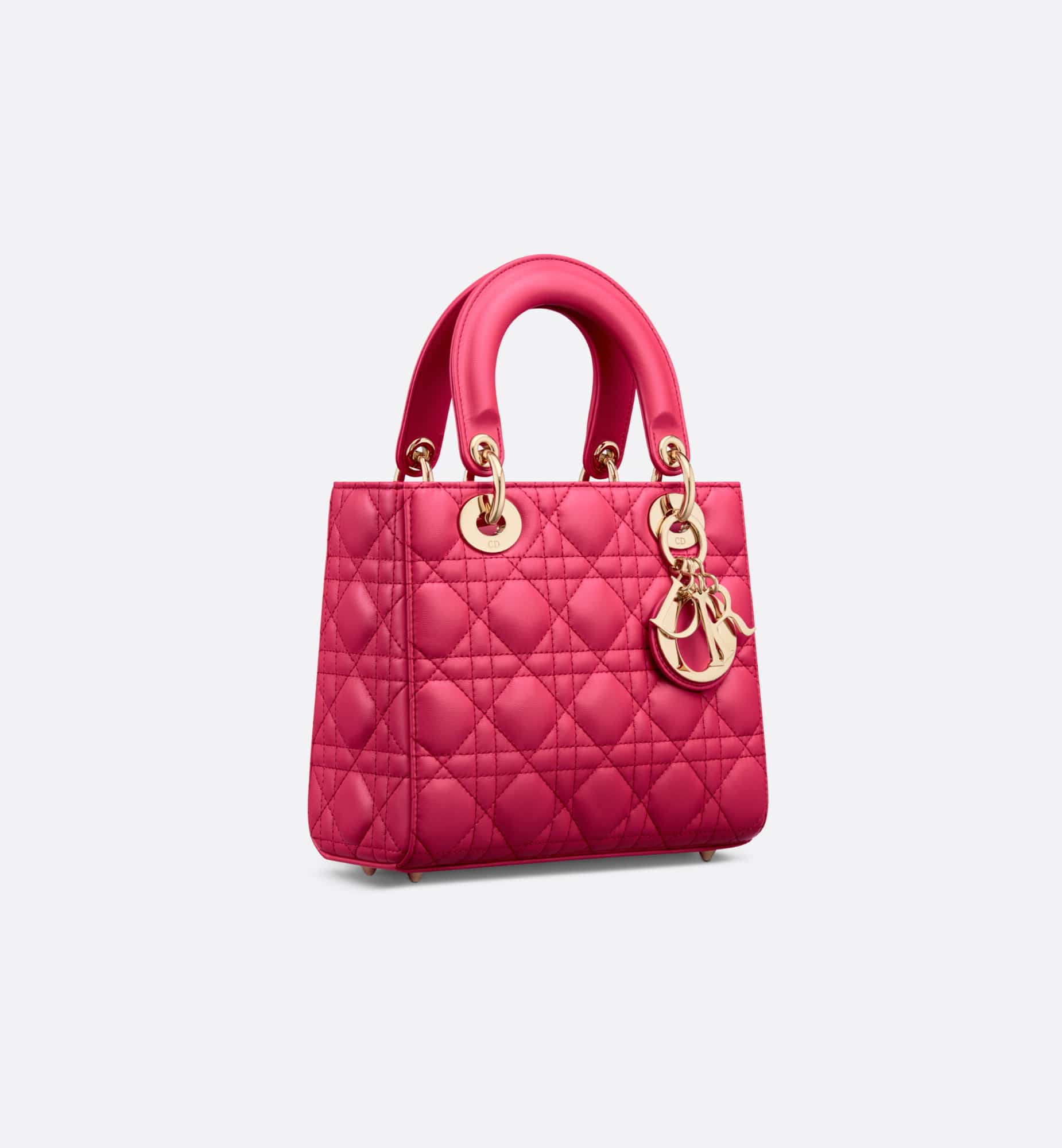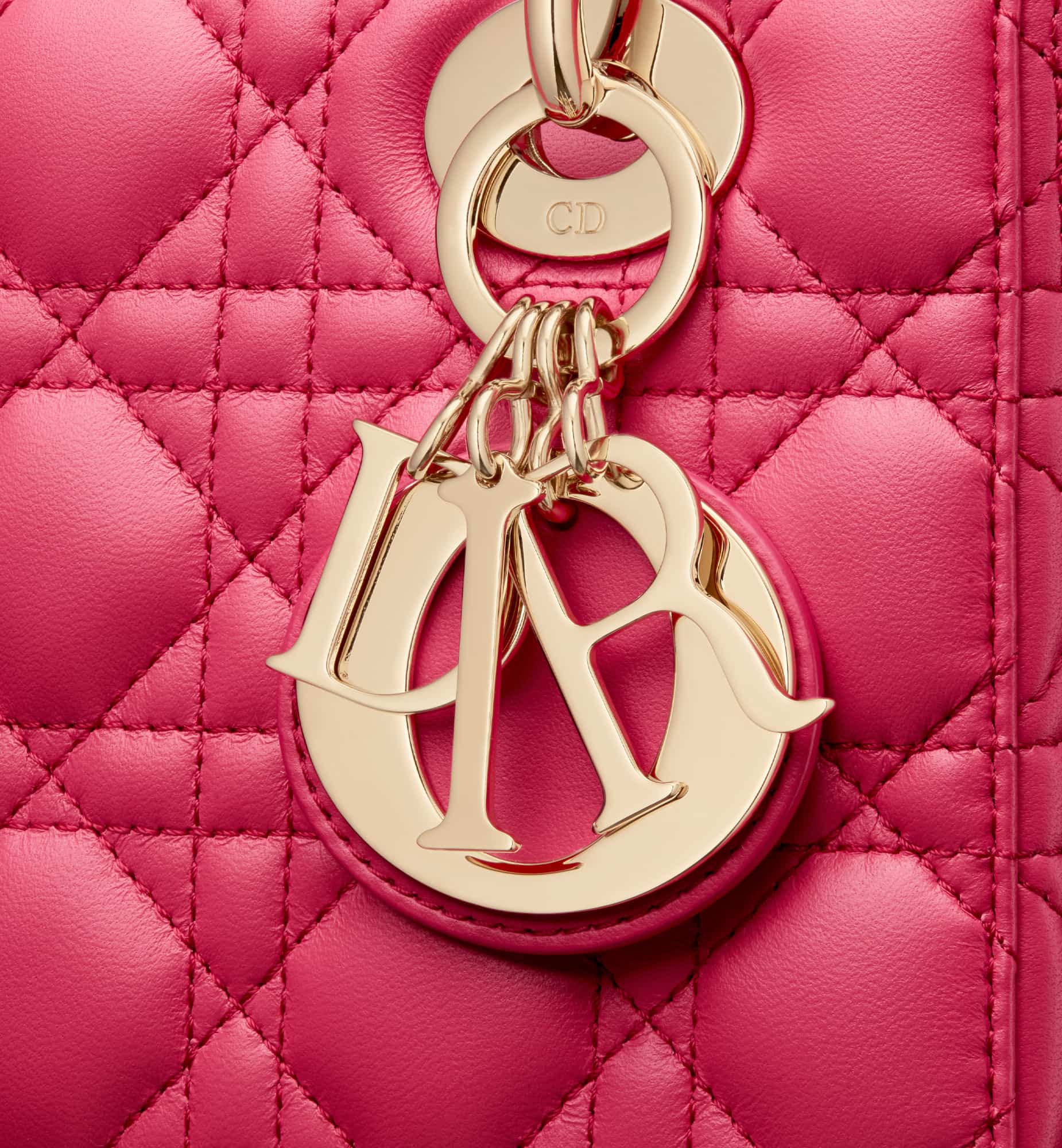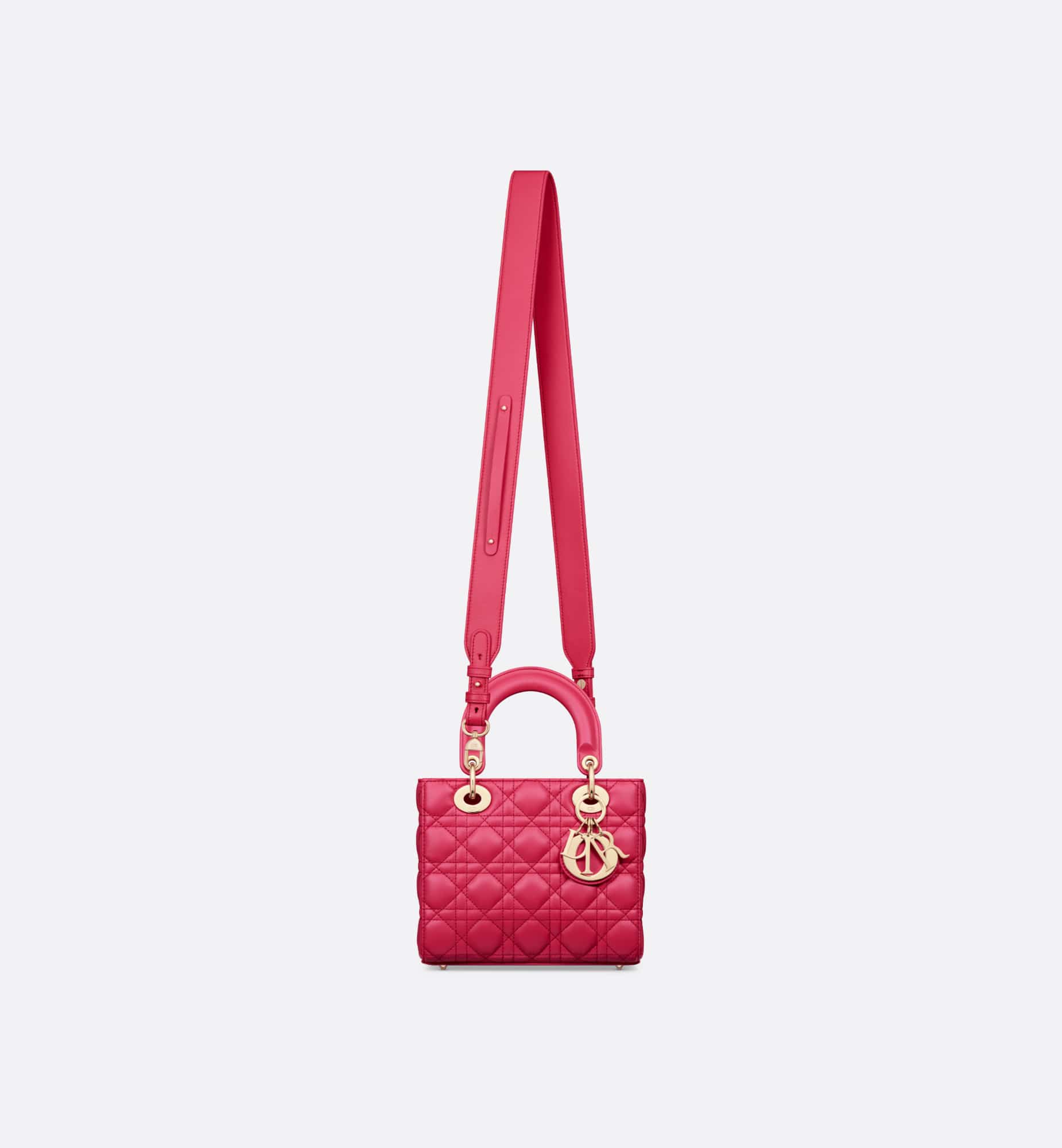 The Lady Dior My ABCDior bag epitomizes the House’s vision of elegance and beauty. Sleek and refined, the timeless style is crafted in passion pink lambskin with Cannage stitching, creating the instantly recognizable quilted texture, while the pale gold-finish metal D.I.O.R. charms embellish and illuminate the silhouette. Featuring a shoulder strap that can be customized by adding badges, the small, unique style may be carried by hand or worn crossbody.