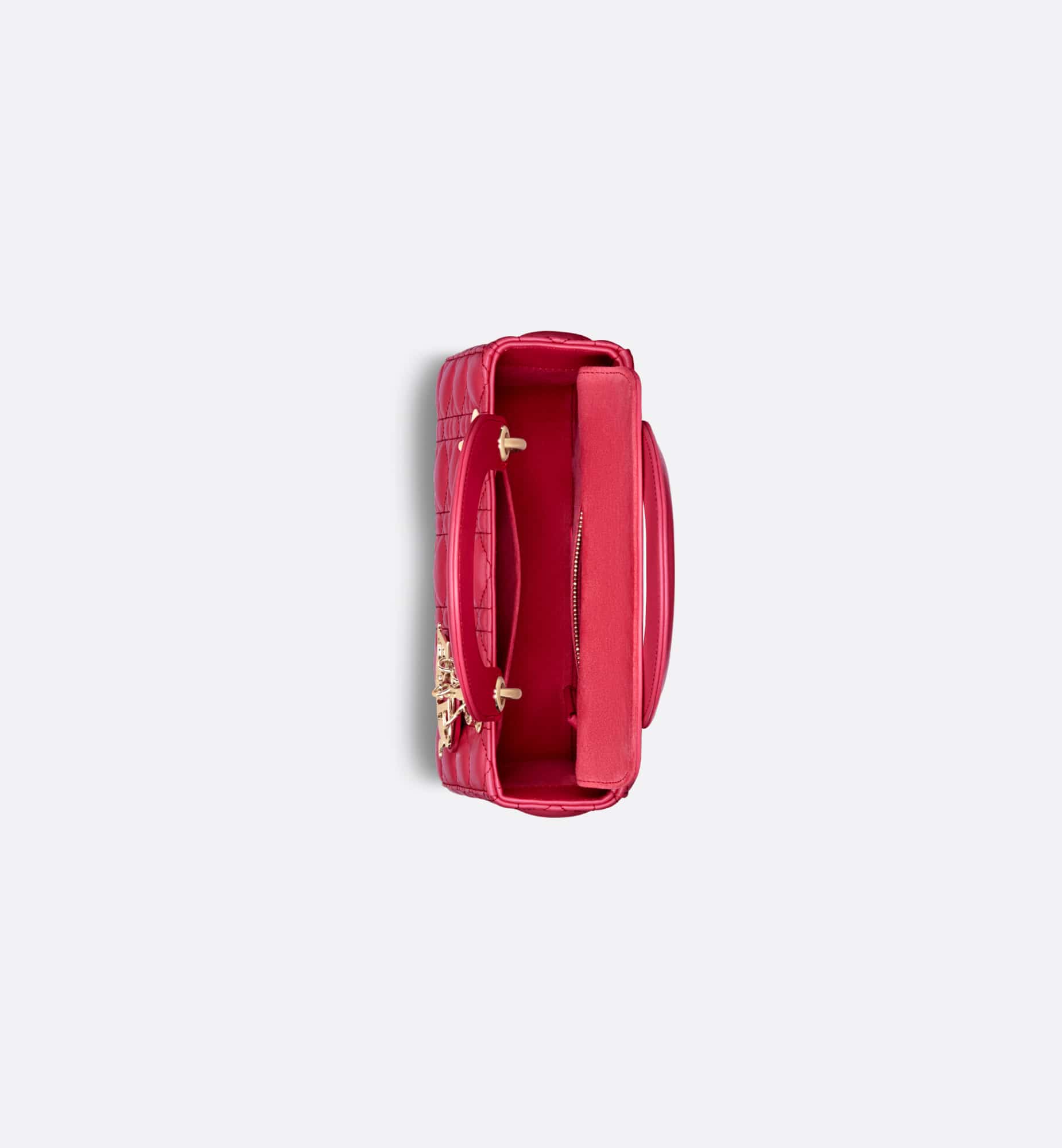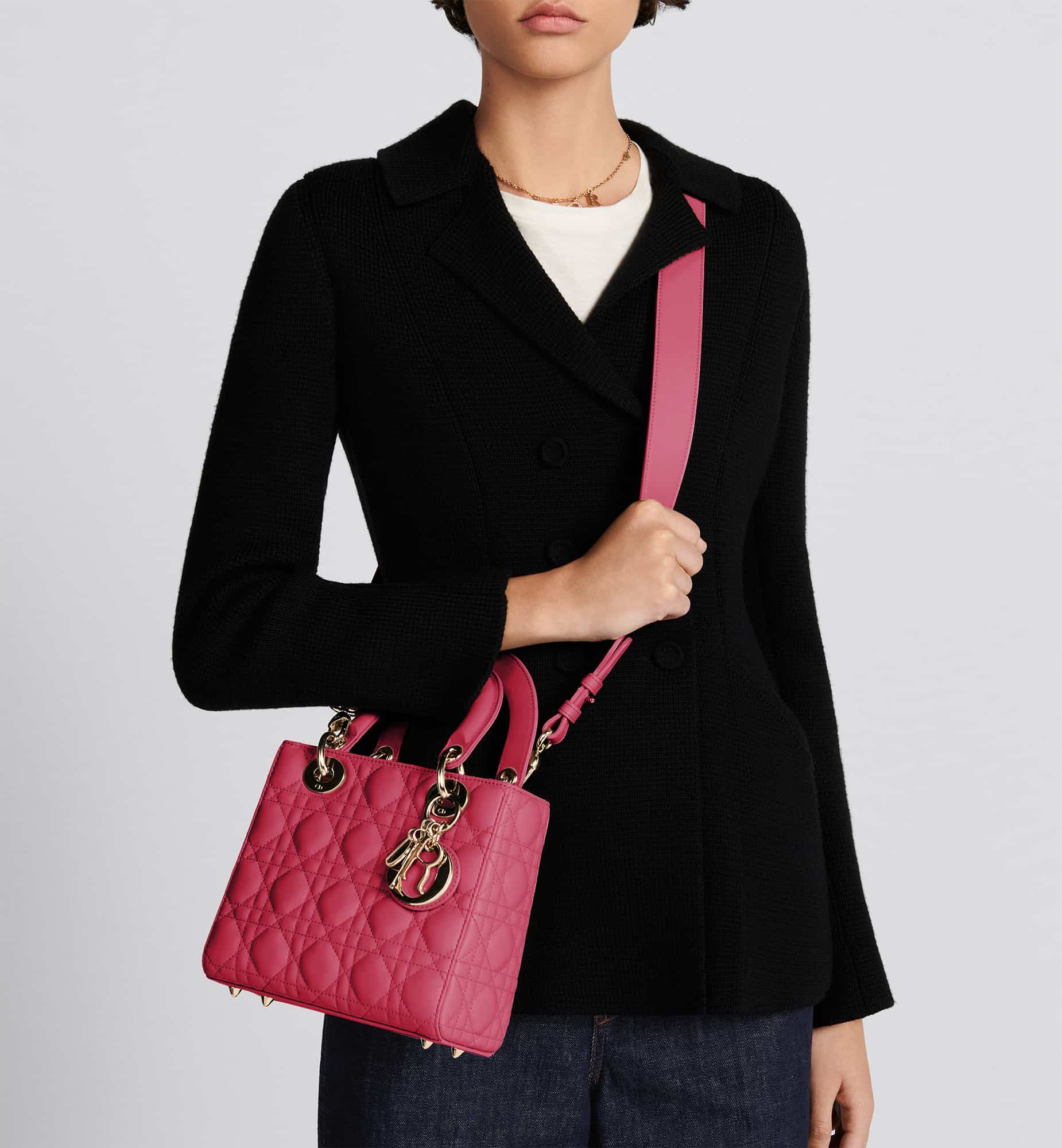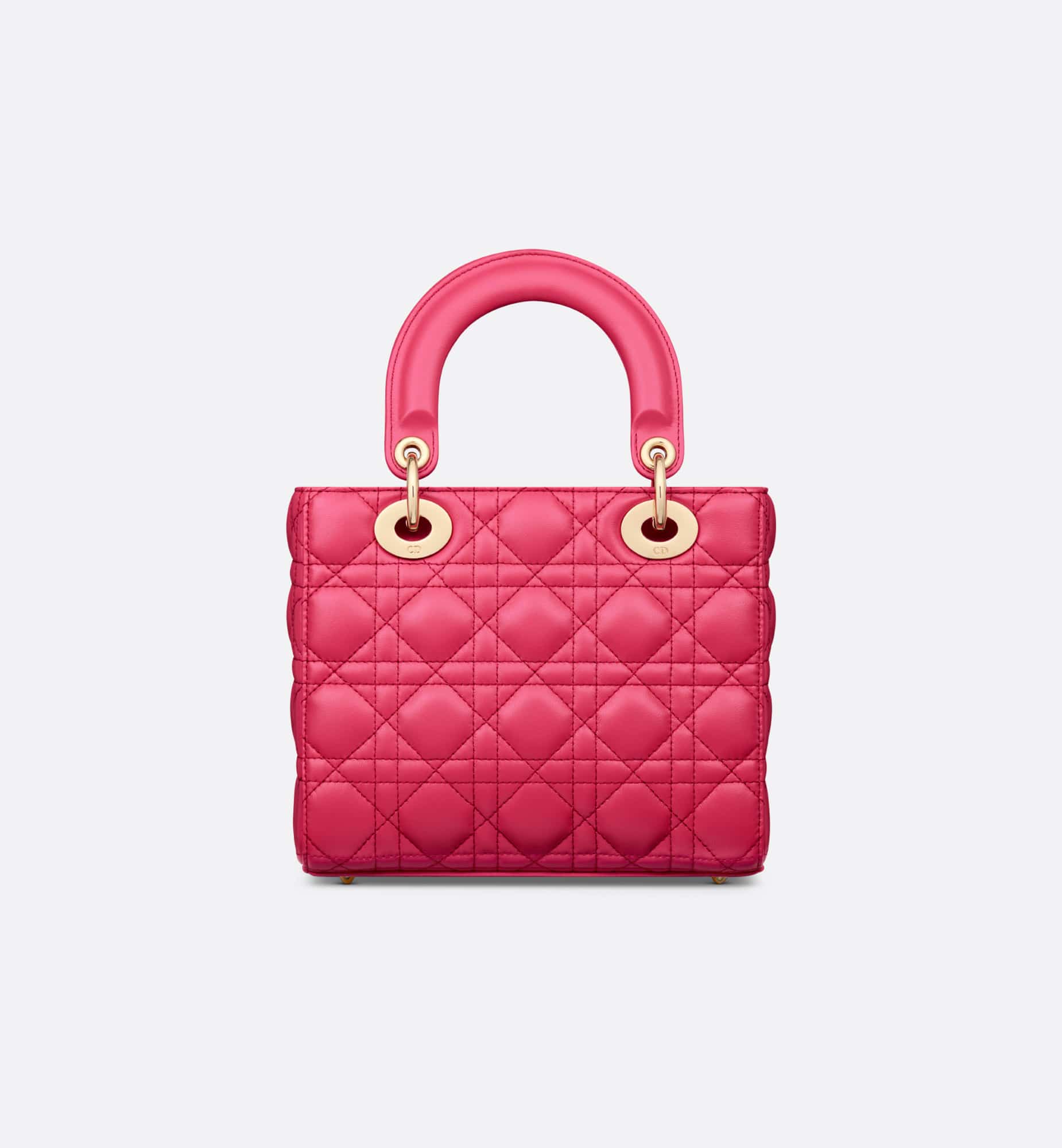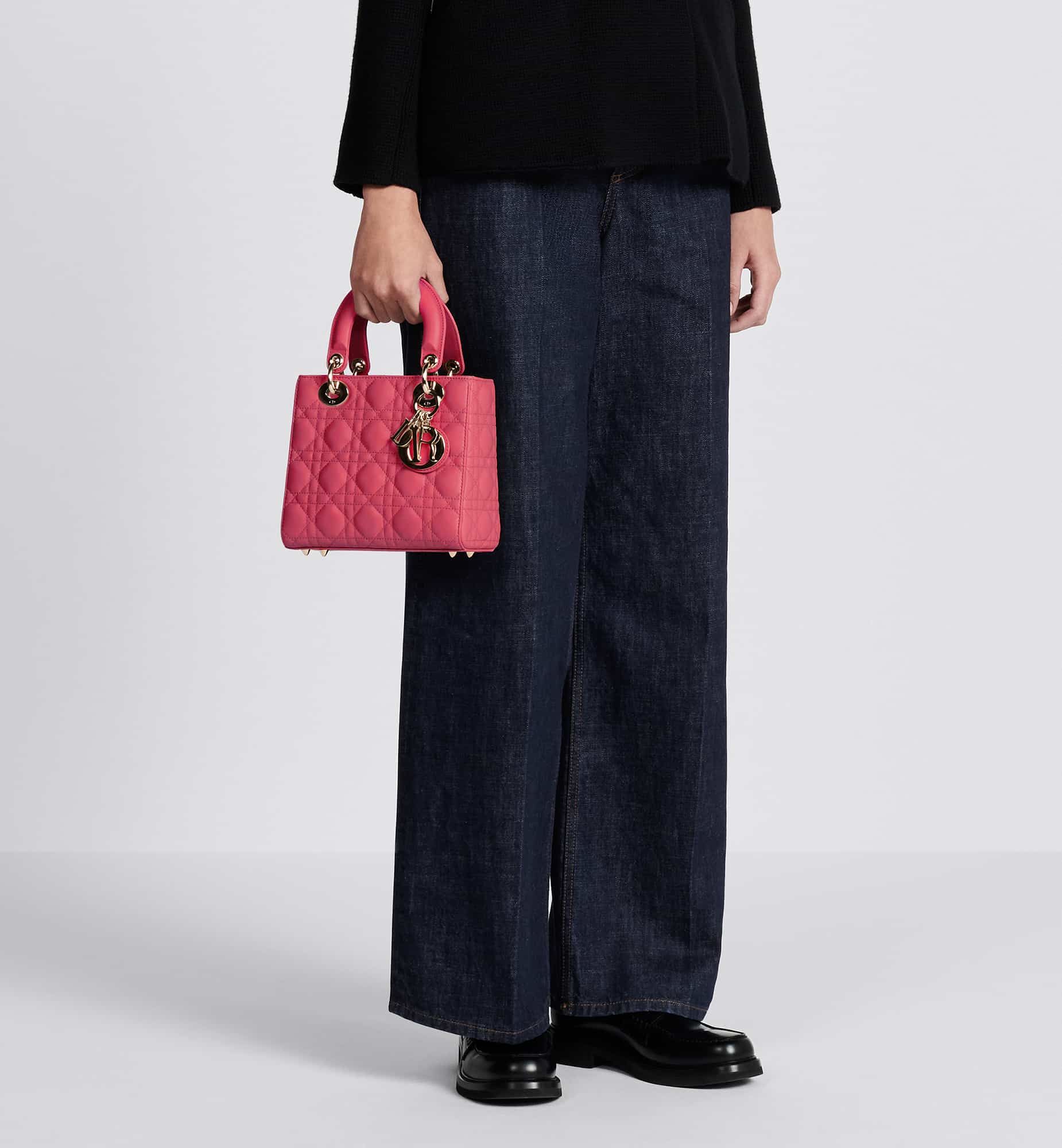 The Lady Dior My ABCDior bag epitomizes the House’s vision of elegance and beauty. Sleek and refined, the timeless style is crafted in passion pink lambskin with Cannage stitching, creating the instantly recognizable quilted texture, while the pale gold-finish metal D.I.O.R. charms embellish and illuminate the silhouette. Featuring a shoulder strap that can be customized by adding badges, the small, unique style may be carried by hand or worn crossbody.