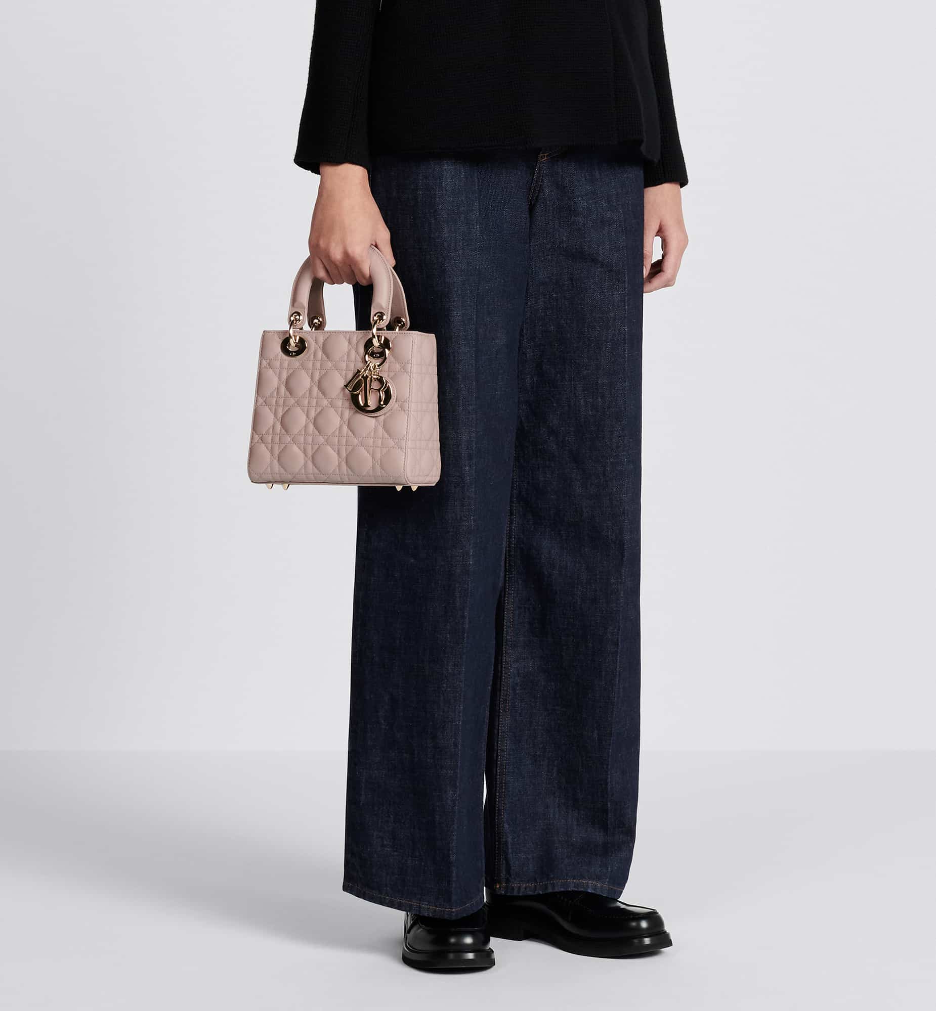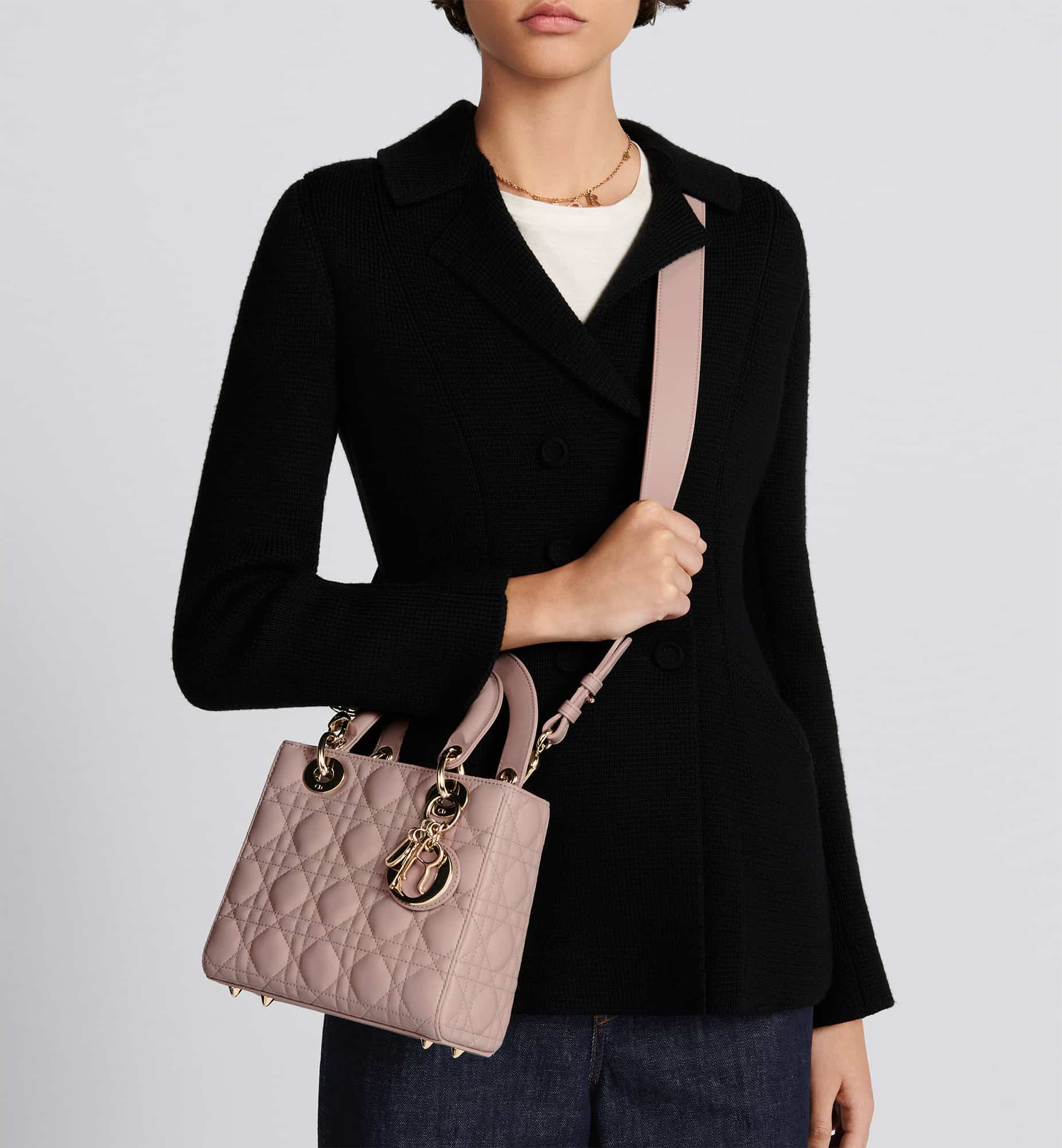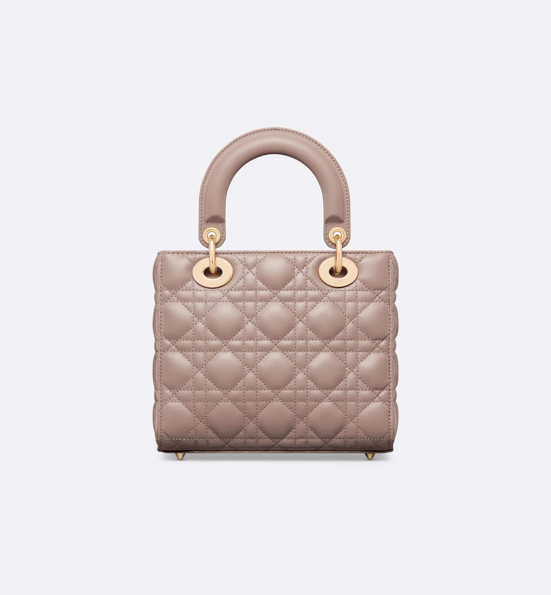 The Lady Dior My ABCDior bag epitomizes the House’s vision of elegance and beauty. Sleek and refined, the timeless style is crafted in warm taupe lambskin with Cannage stitching, creating the instantly recognizable quilted texture, while the pale gold-finish metal D.I.O.R. charms embellish and illuminate the silhouette. Featuring a shoulder strap that can be customized by adding badges, the small, unique style may be carried by hand or worn crossbody.