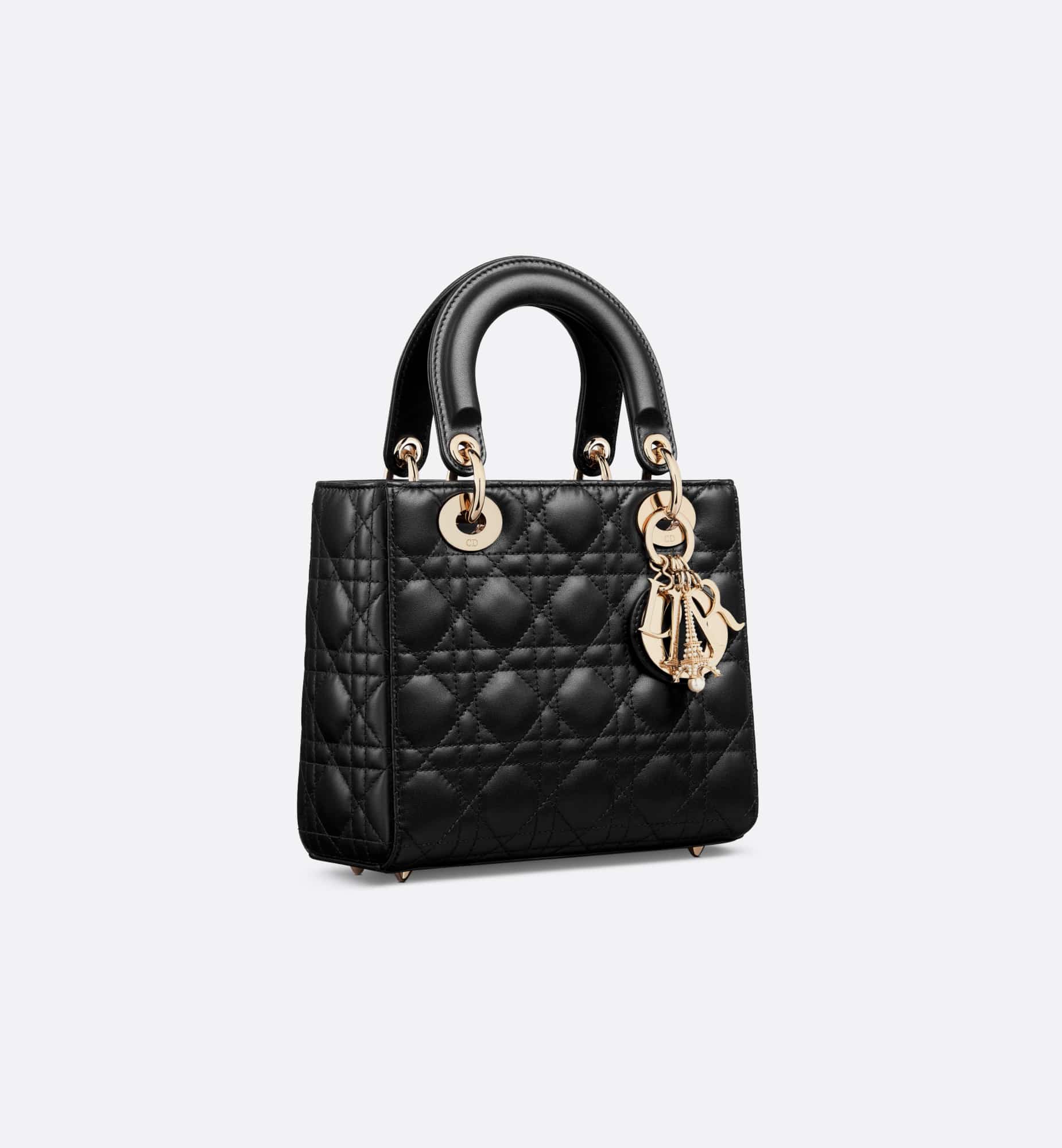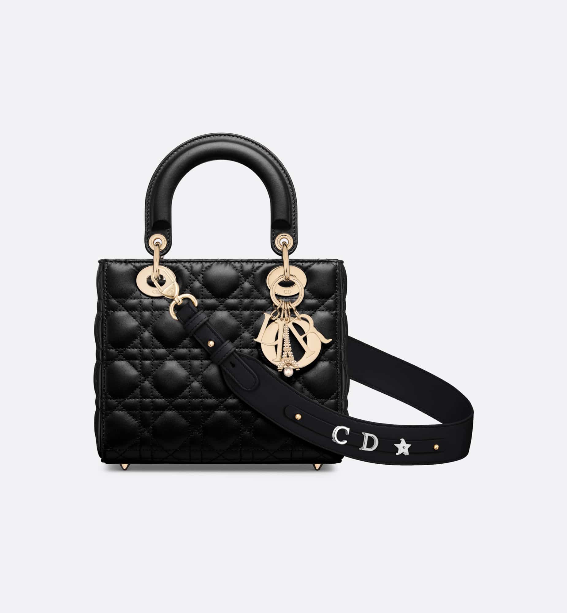 The Lady Dior My ABCDior bag epitomizes the House’s vision of elegance and beauty. Sleek and refined, the timeless style is crafted in black lambskin with Cannage stitching, creating the unmistakable quilted texture. Pale gold-finish metal D.I.O.R. charms are completed by an Eiffel Tower charm, a pillar symbol of the collection that is embellished with white resin pearls. Featuring a shoulder strap that can be customized by adding badges, the small, unique bag may be carried by hand or worn crossbody.