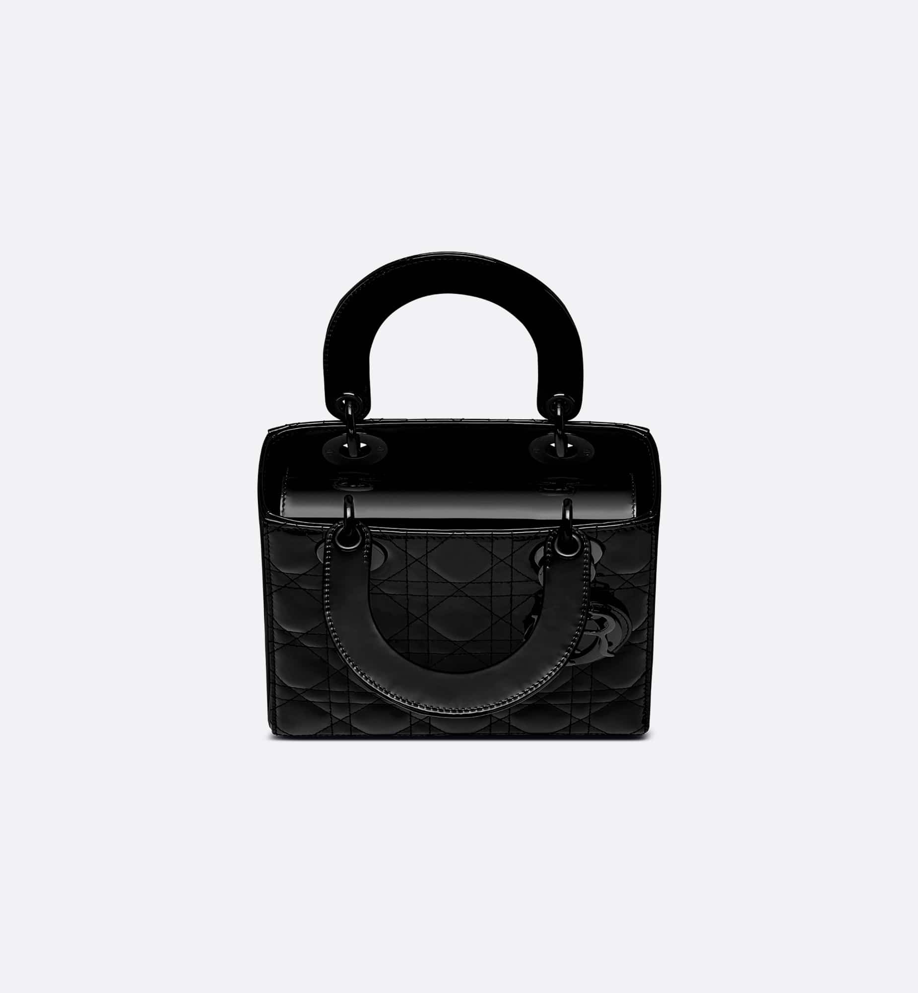The Lady Dior bag epitomizes Dior’s vision of elegance and beauty. Sleek and refined, the timeless style is crafted in black ultra-glossy patent calfskin with Cannage stitching, creating the instantly recognizable quilted texture. Shiny black-finish metal D.I.O.R. charms further embellish its silhouette. The small Lady Dior bag features a thin, removable leather shoulder strap and can be carried by hand or worn crossbody.