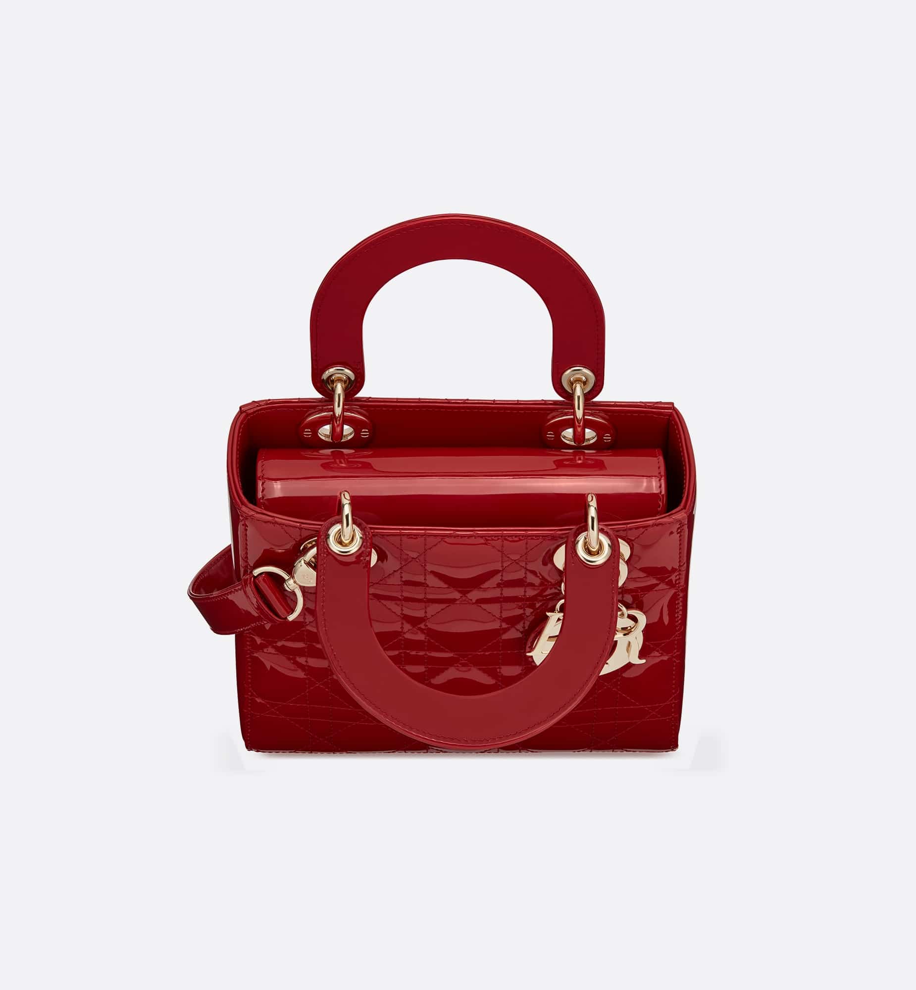 The Lady Dior bag epitomizes the House’s vision of elegance and beauty. Sleek and refined, the timeless style is crafted in cherry red patent calfskin with Cannage stitching, creating the instantly recognizable quilted texture. The pale gold-finish metal signature D.I.O.R. charms embellish and illuminate its silhouette. Featuring a thin, removable leather shoulder strap, the small Lady Dior bag can be carried by hand or worn crossbody.