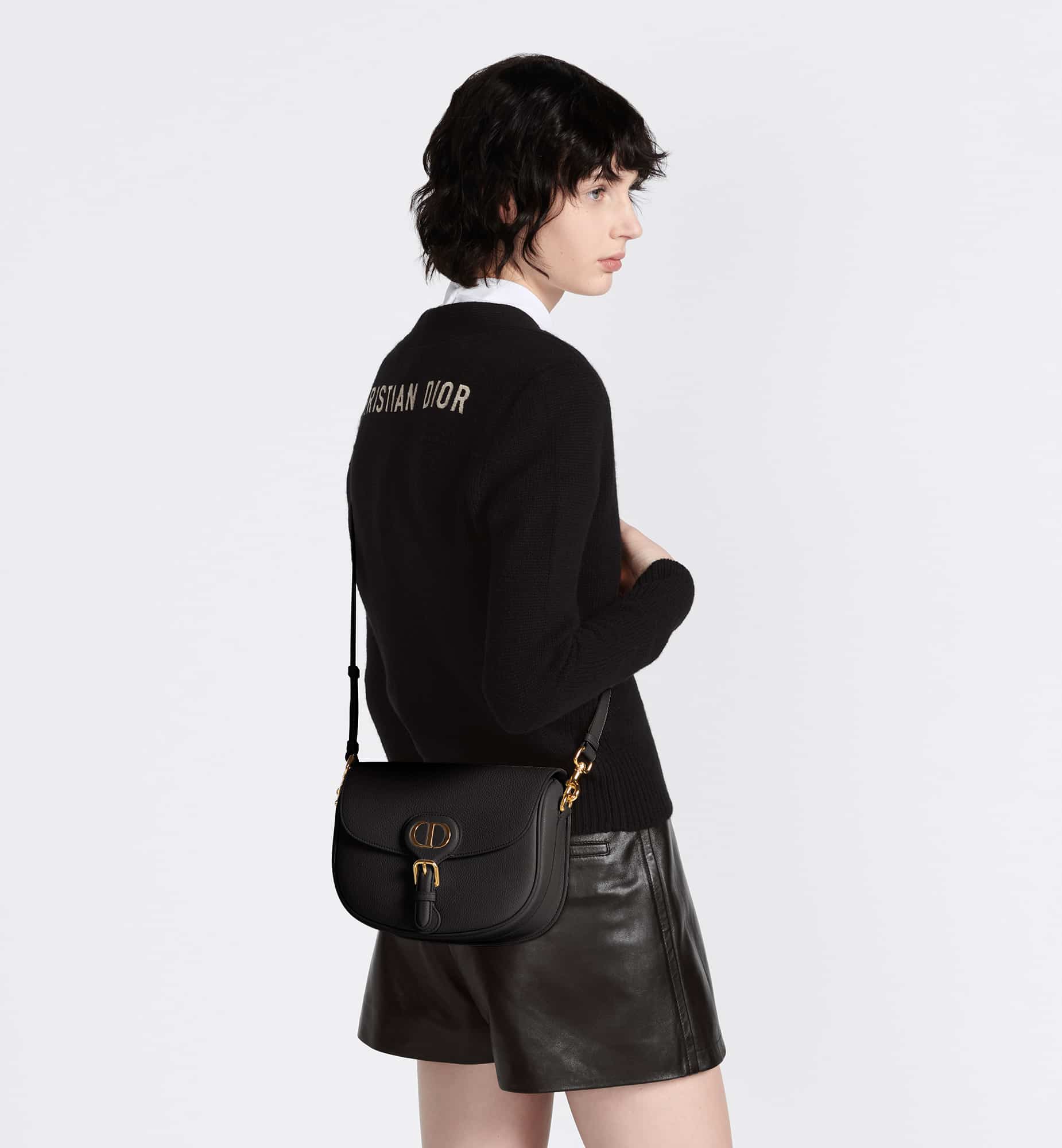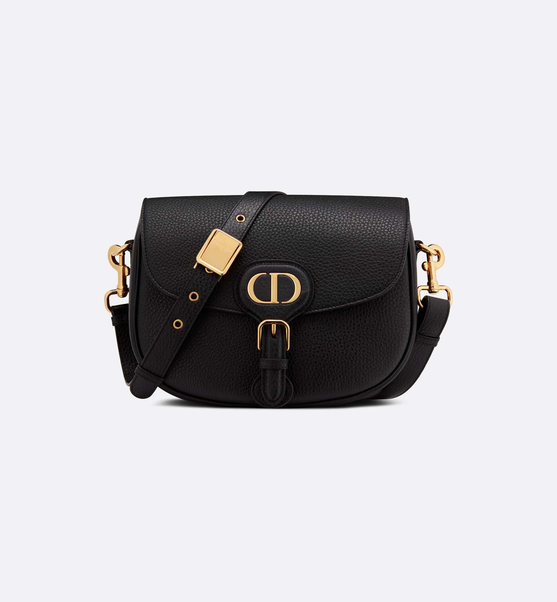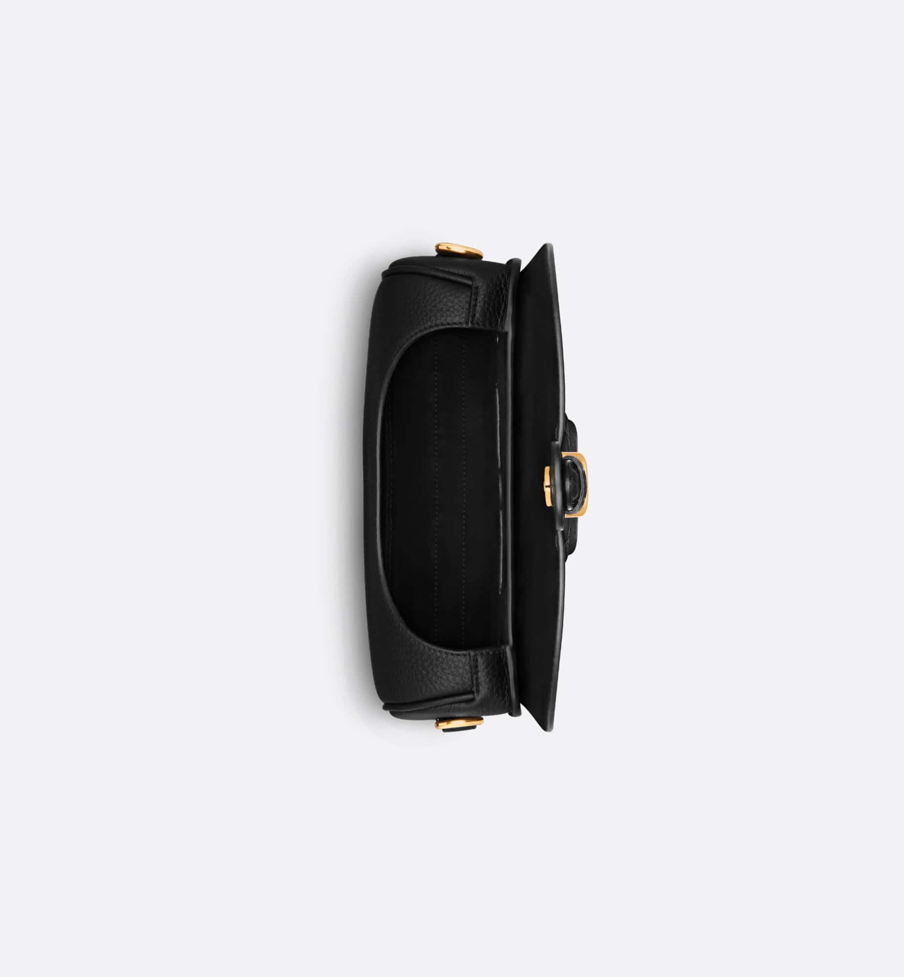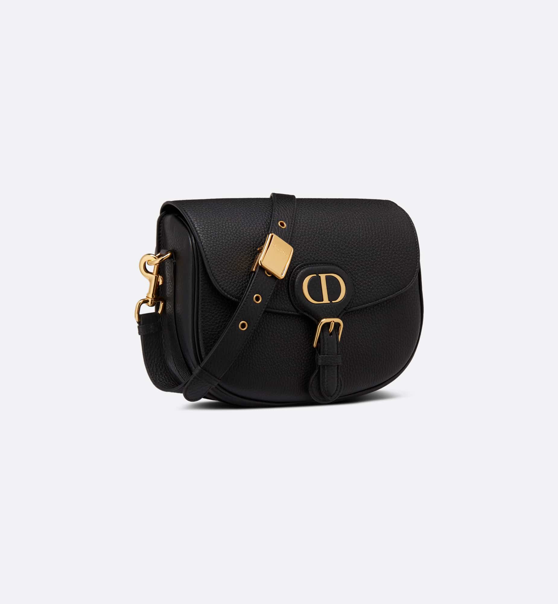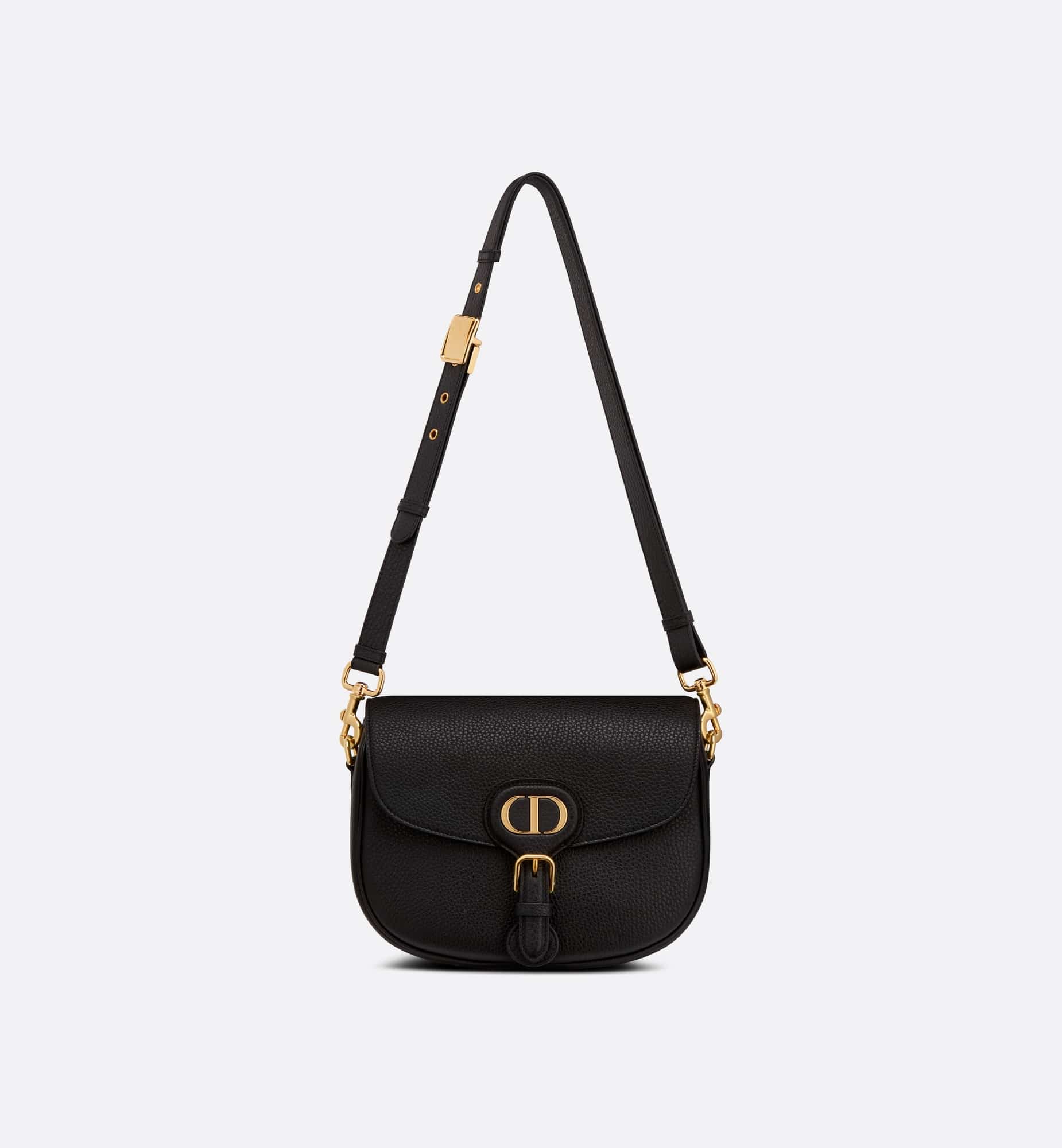 The Dior Bobby bag is a hobo style showcasing sophisticated lines and harmonious proportions. The black silhouette is crafted from very supple natural grained calfskin with a suede calfskin interior, and is enhanced by antique gold-finish metal hardware. Its removable and adjustable shoulder strap has a military-inspired buckle, and allows the medium bag to be carried by hand, worn over the shoulder or crossbody.