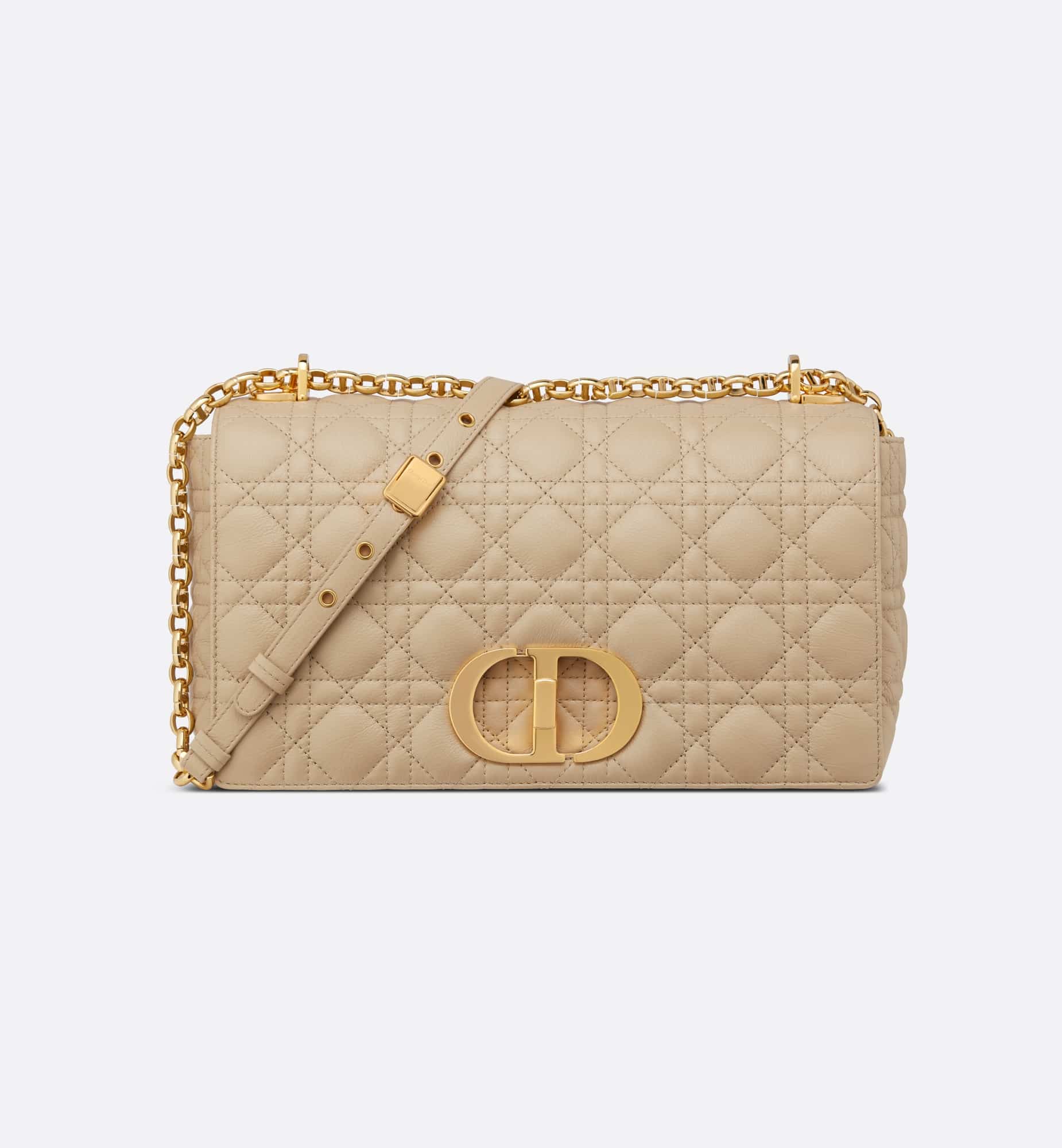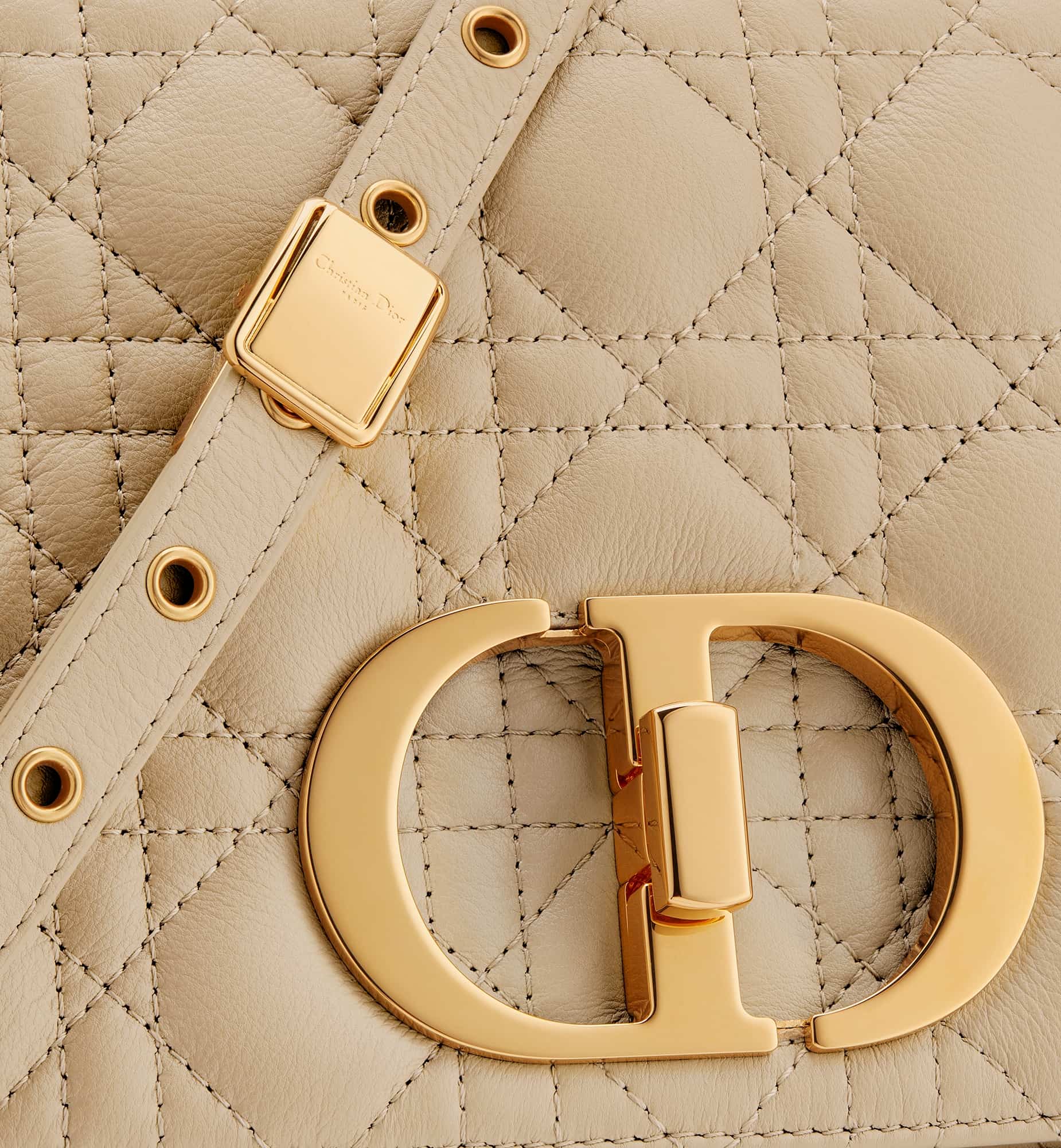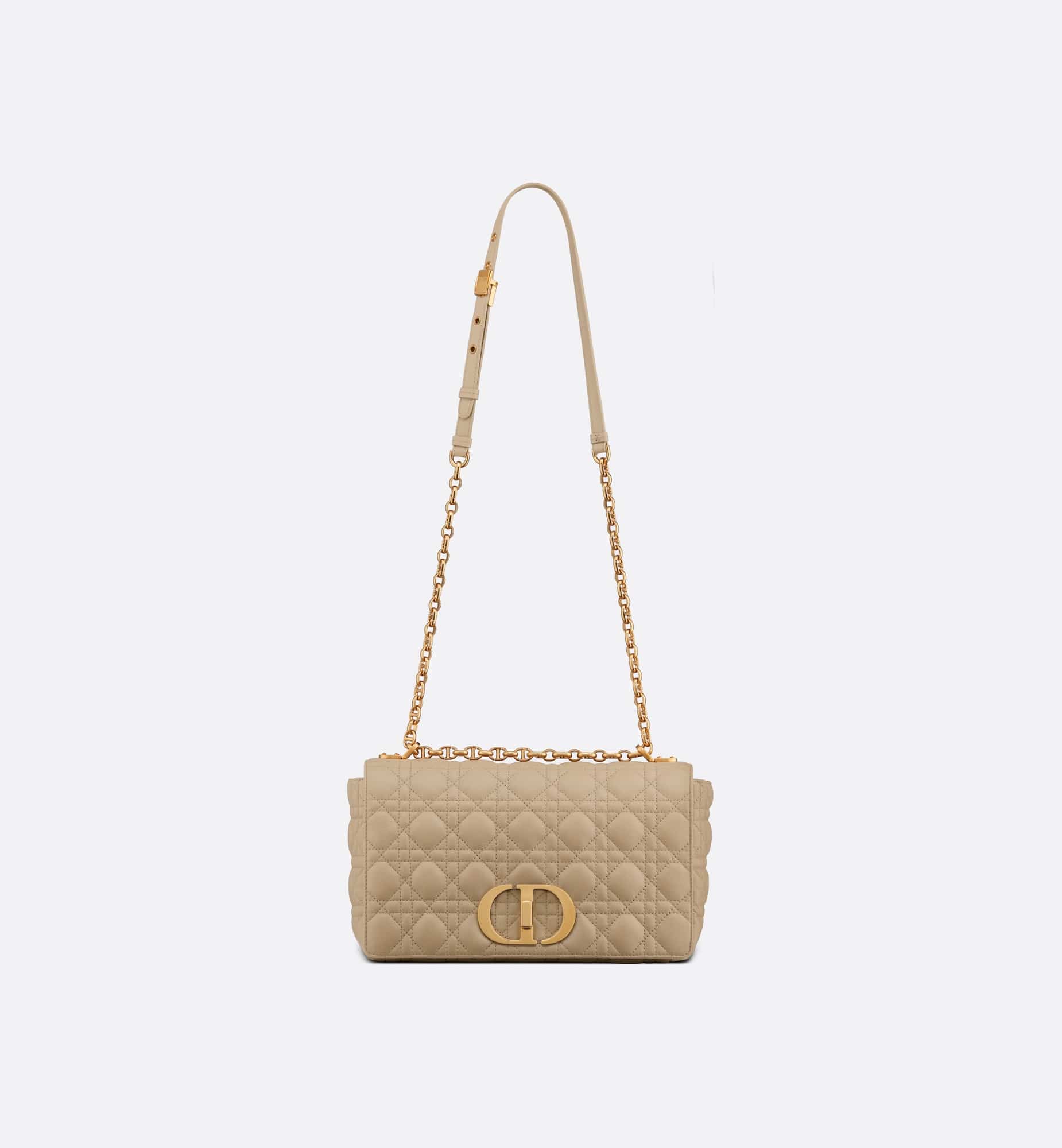 The Dior Caro bag combines modernity with timeless elegance. The silhouette is crafted in beige calfskin with Cannage stitching. The supple bag features a flap adorned with an antique gold-finish metal CD twist clasp, inspired by the seal of a Christian Dior perfume bottle. The detachable chain shoulder strap with CD signature links allows the large bag to be carried by hand or worn over the shoulder and may be replaced by one of the House’s wide embroidered straps for day or evening attire.
