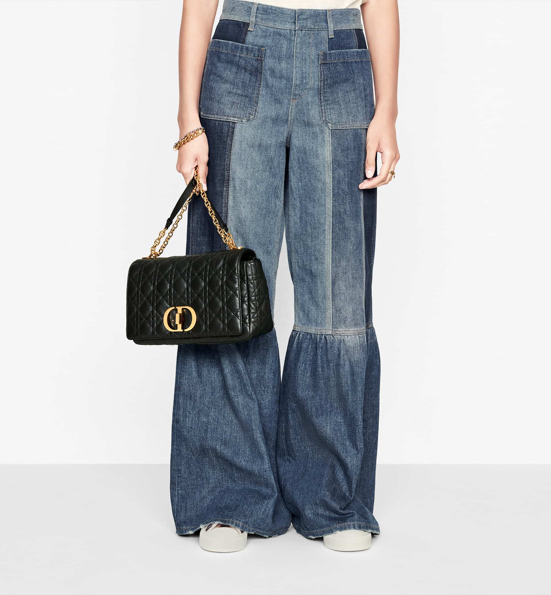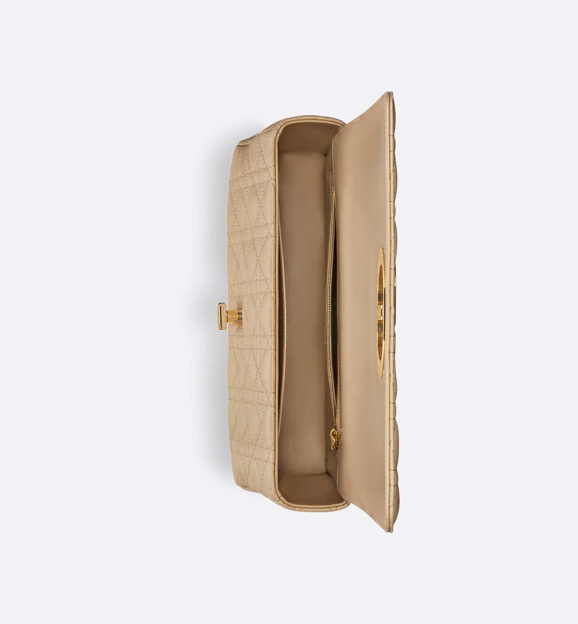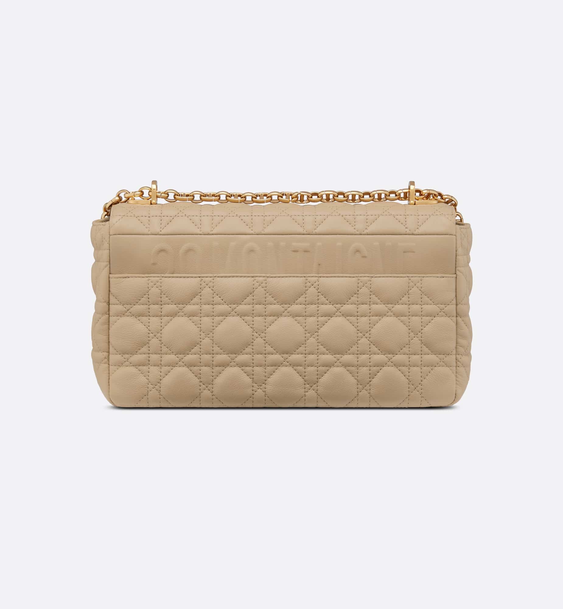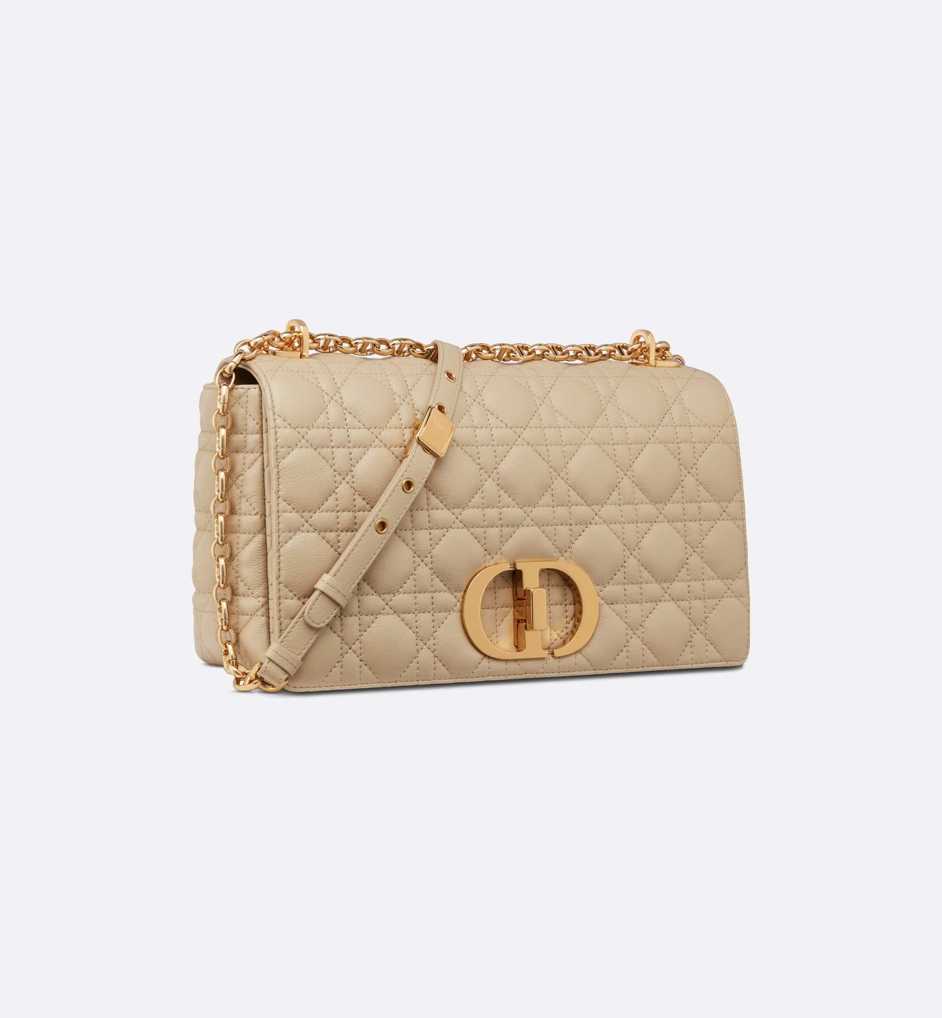 The Dior Caro bag combines modernity with timeless elegance. The silhouette is crafted in beige calfskin with Cannage stitching. The supple bag features a flap adorned with an antique gold-finish metal CD twist clasp, inspired by the seal of a Christian Dior perfume bottle. The detachable chain shoulder strap with CD signature links allows the large bag to be carried by hand or worn over the shoulder and may be replaced by one of the House’s wide embroidered straps for day or evening attire.