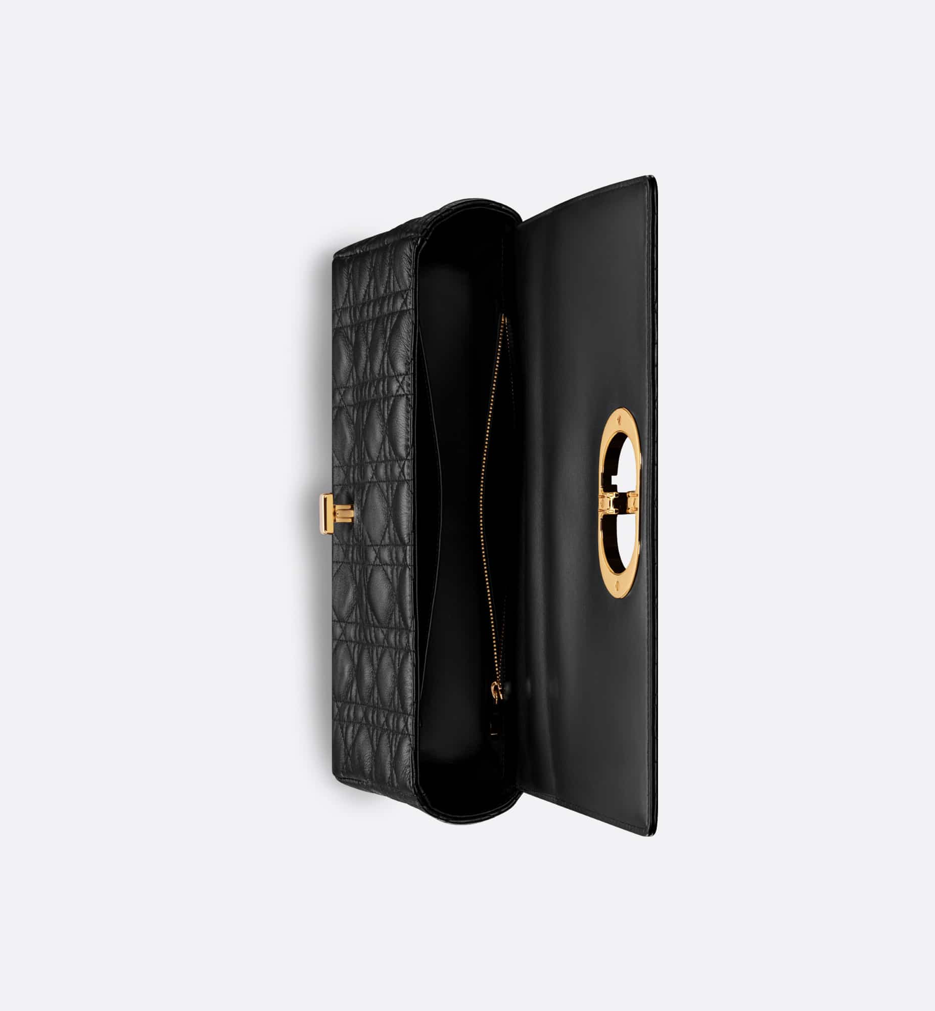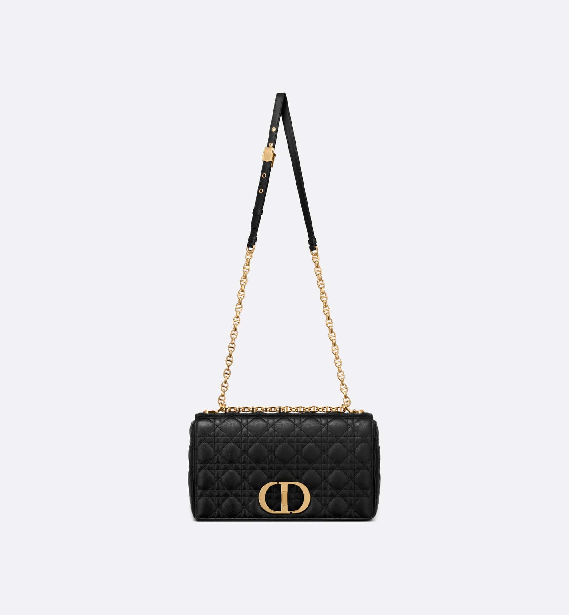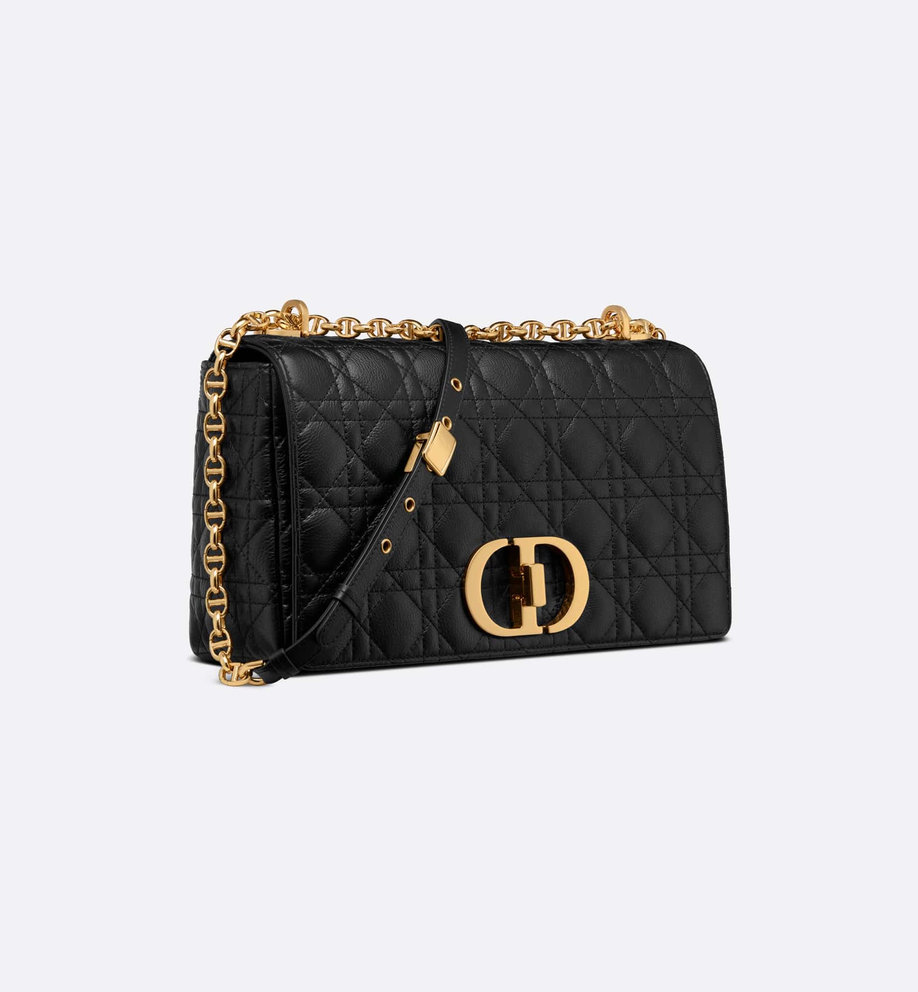 The Dior Caro bag combines modernity with timeless elegance. The silhouette is crafted in black calfskin with Cannage stitching. The supple bag features a flap adorned with an antique gold-finish metal CD twist clasp, inspired by the seal of a Christian Dior perfume bottle. The detachable chain shoulder strap with CD signature links allows the large bag to be carried by hand or worn over the shoulder and may be replaced by one of the House’s wide embroidered straps for day or evening attire.