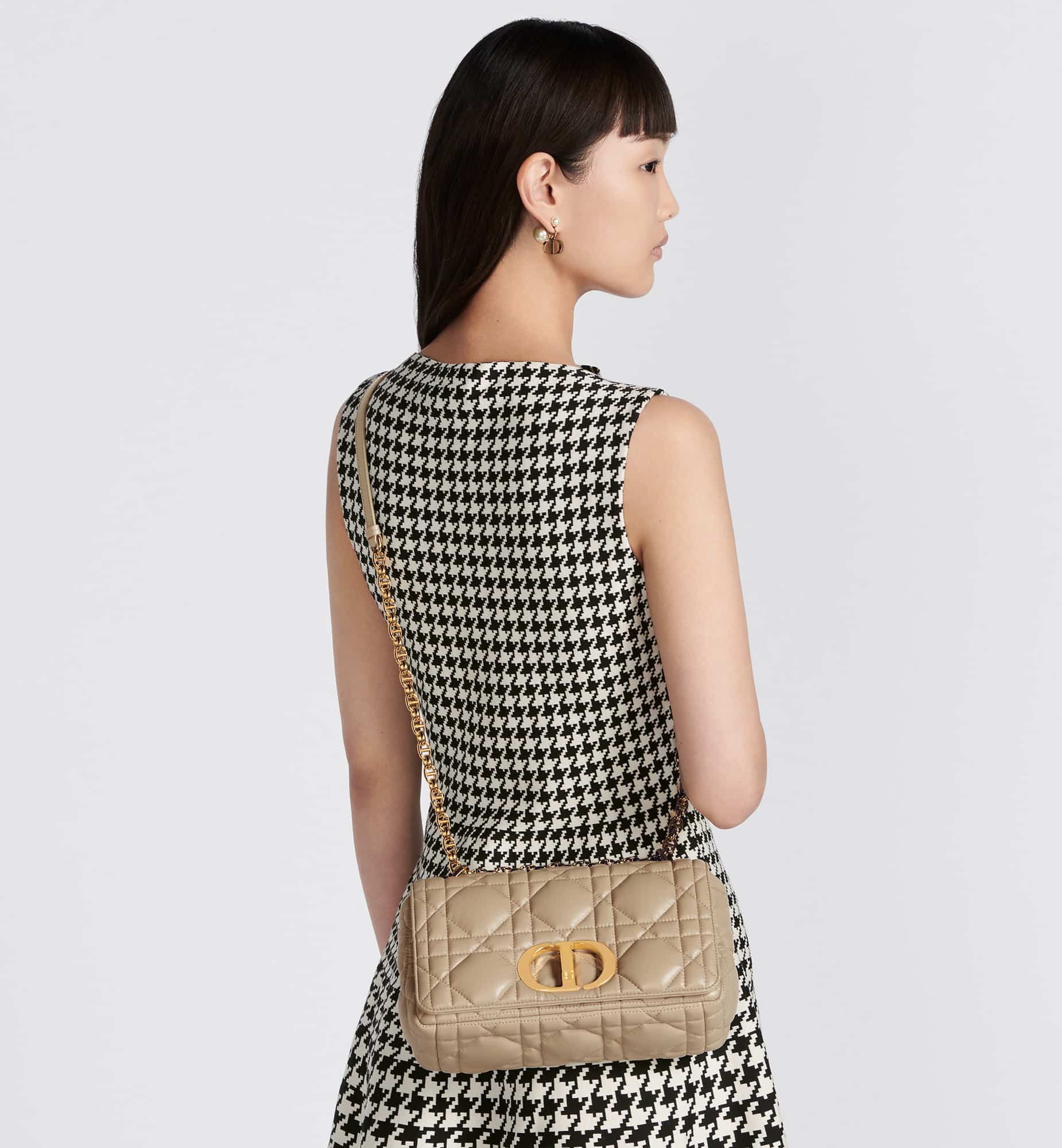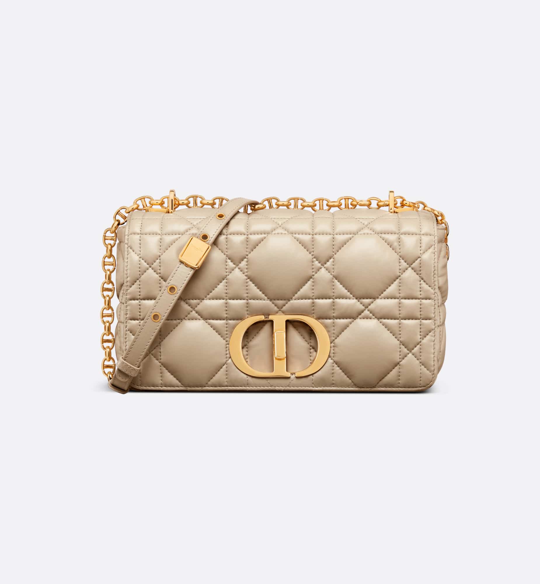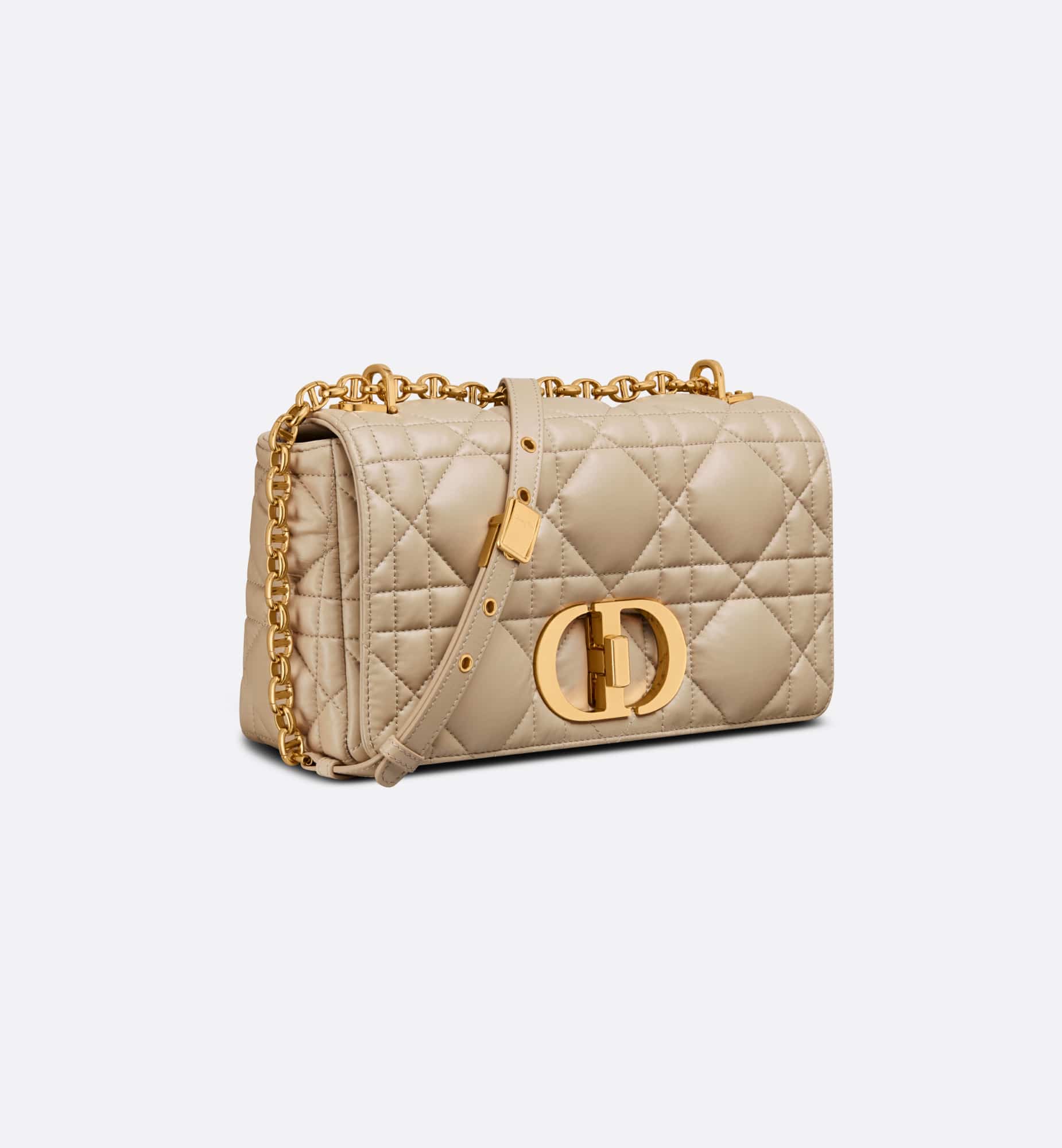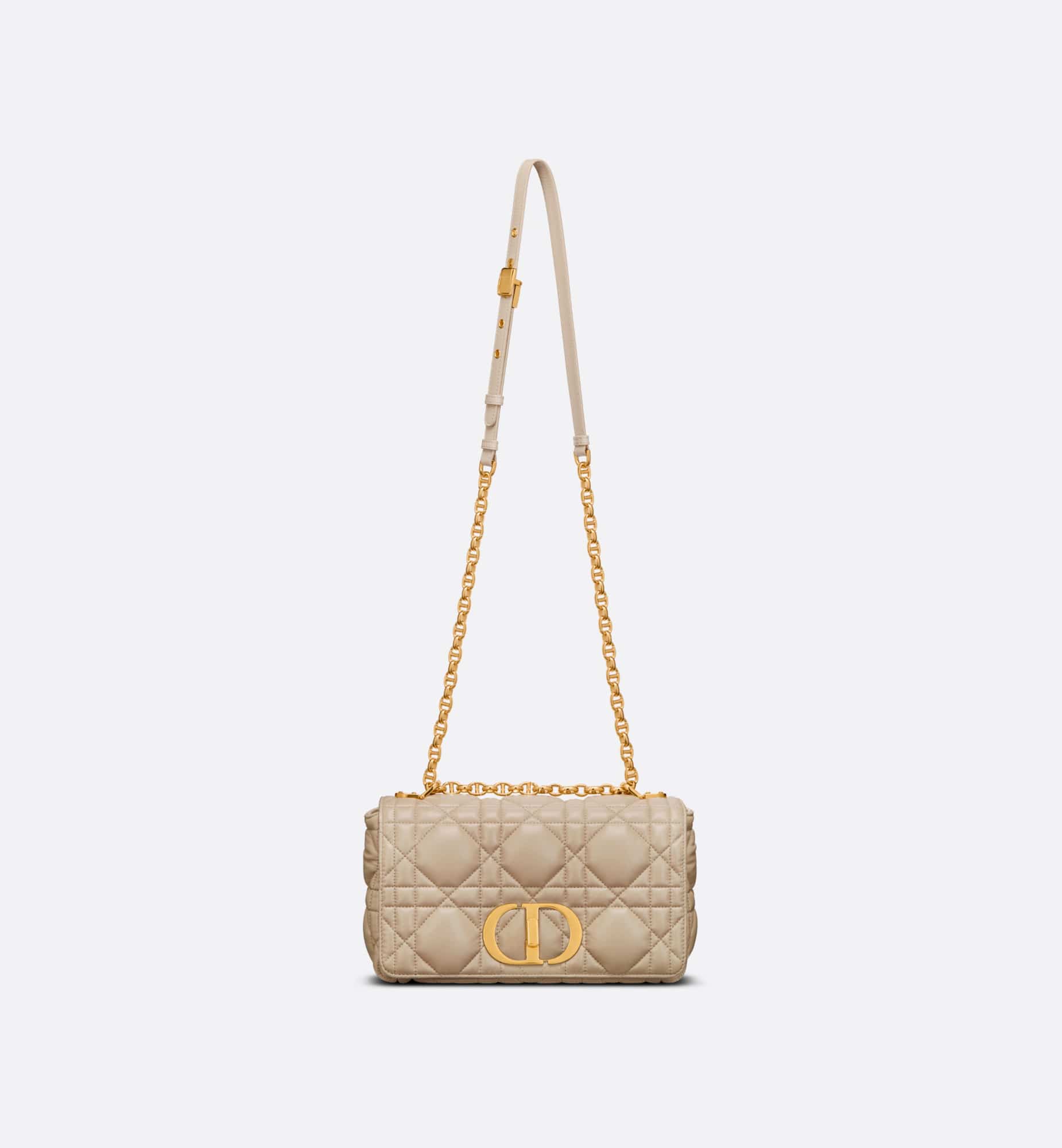 The Dior Caro bag combines modernity with timeless elegance. The style is crafted in sand-colored calfskin distinguished by its original quilted-effect Macrocannage stitching. The bag showcases a flap adorned with an antique gold-finish metal CD twist clasp, inspired by the seal of a Christian Dior perfume bottle. The detachable chain shoulder strap with CD signature links allows the medium bag to be carried by hand, worn over the shoulder or crossbody, and may be replaced by one of the House’s wide embroidered straps for day or evening attire.