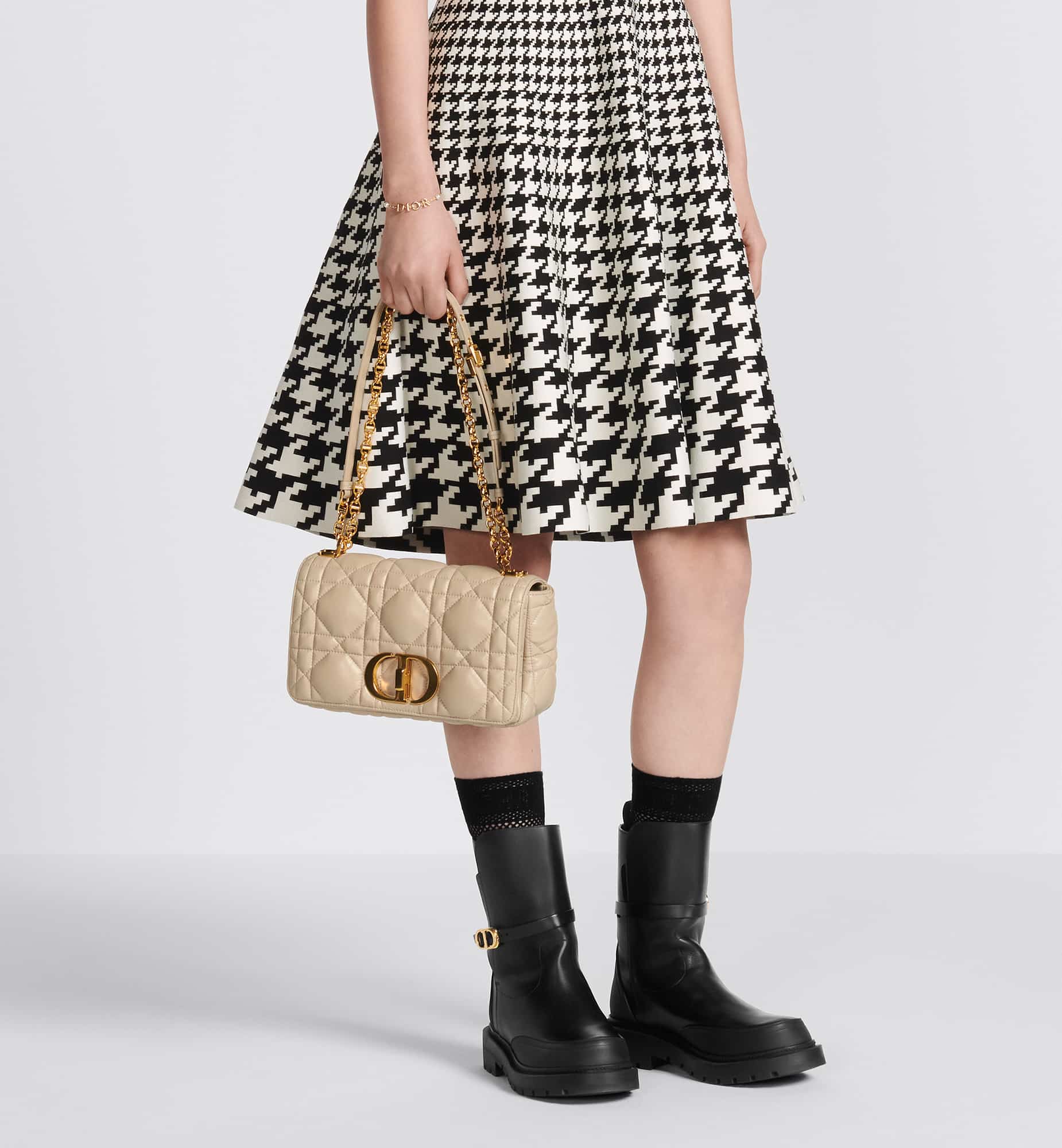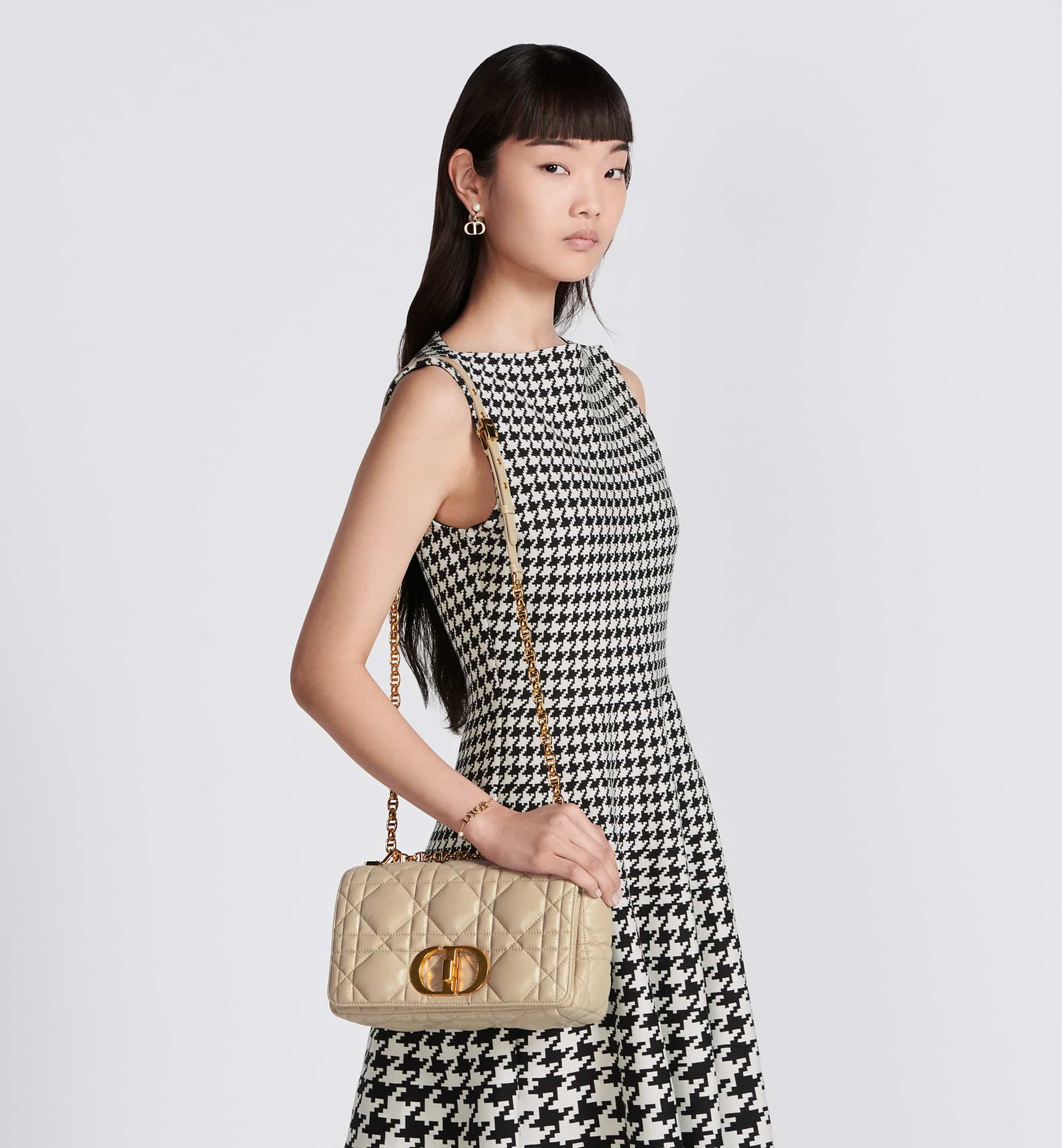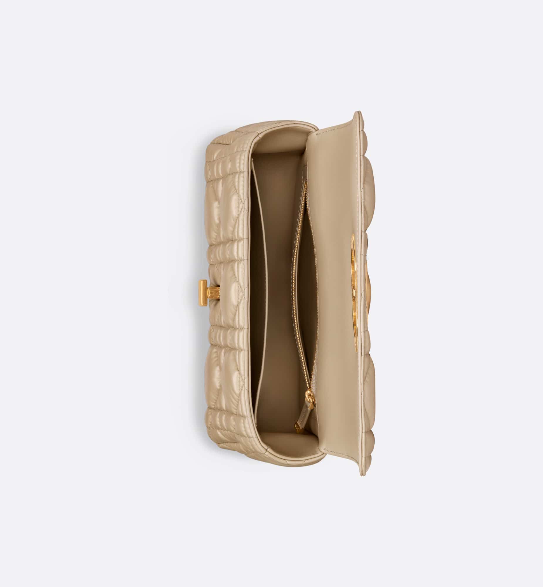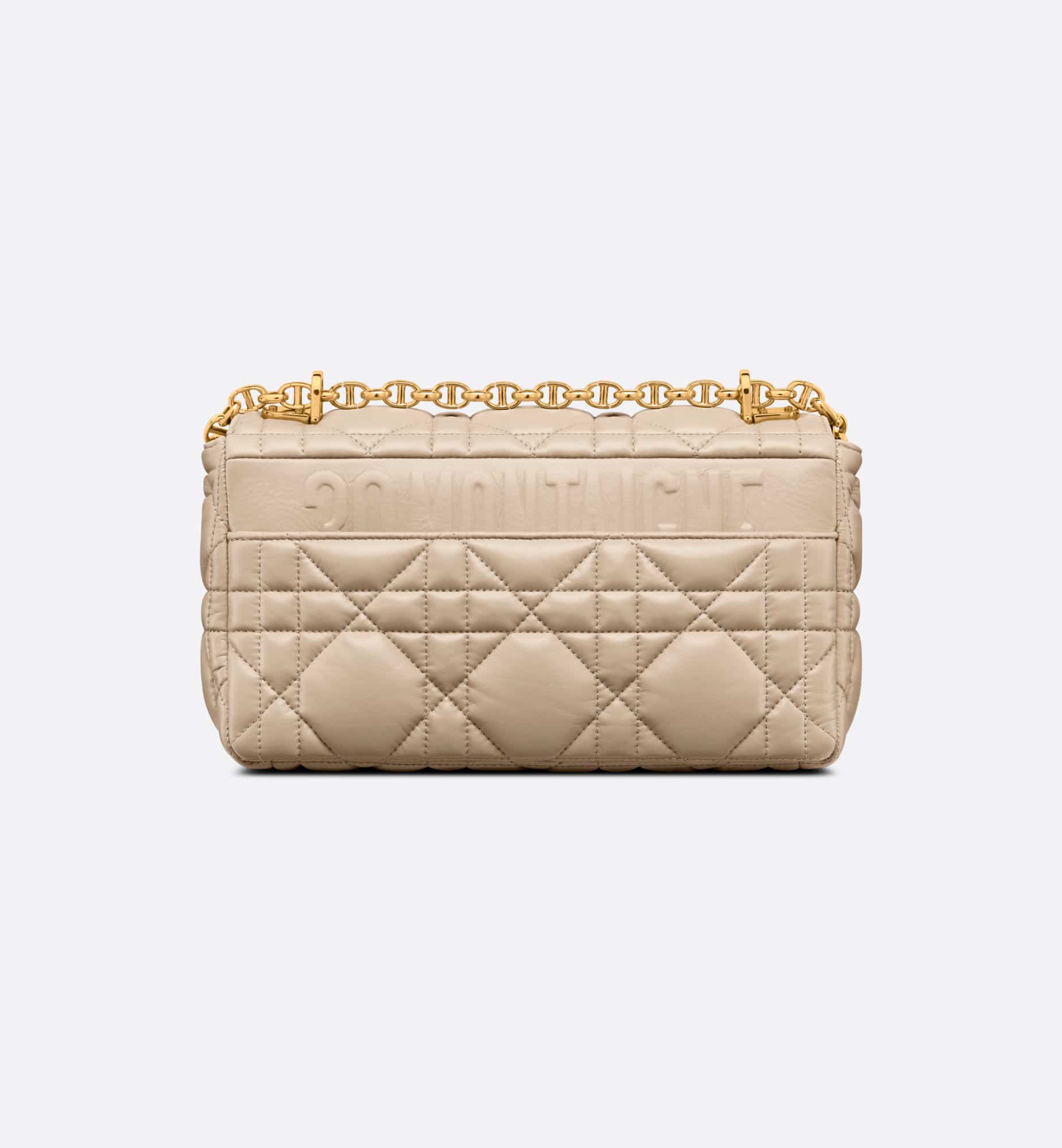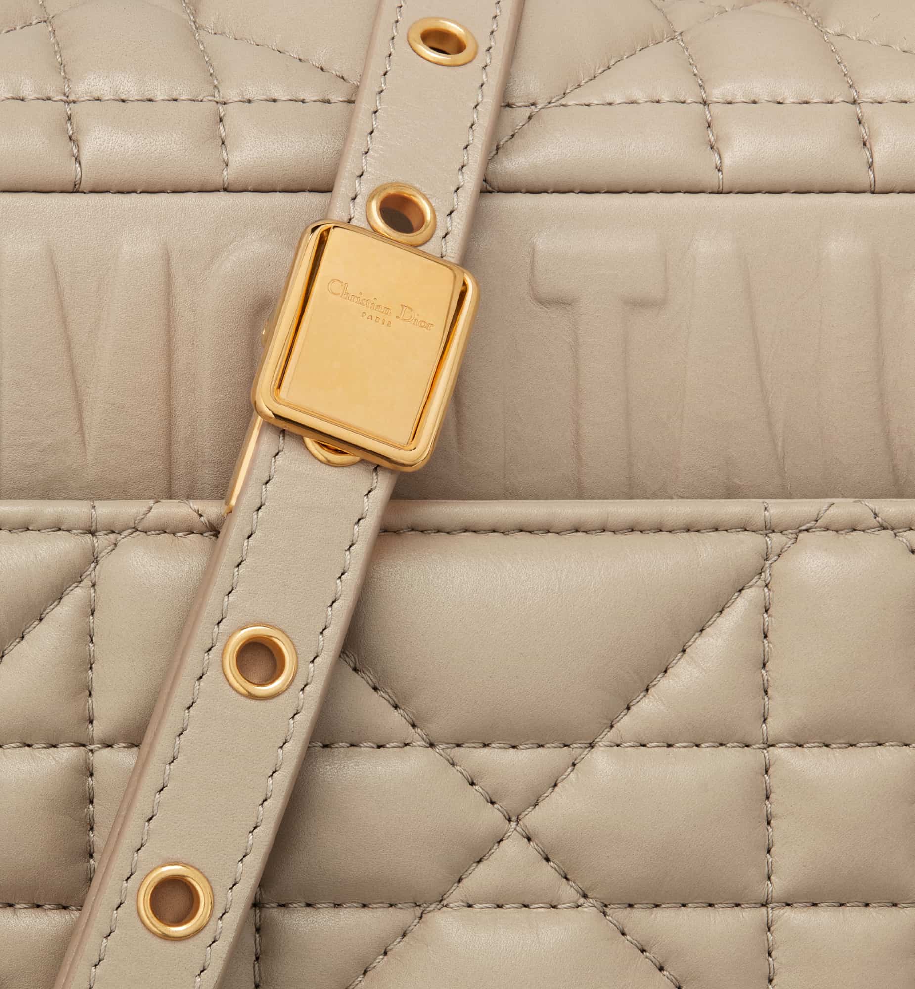 The Dior Caro bag combines modernity with timeless elegance. The style is crafted in sand-colored calfskin distinguished by its original quilted-effect Macrocannage stitching. The bag showcases a flap adorned with an antique gold-finish metal CD twist clasp, inspired by the seal of a Christian Dior perfume bottle. The detachable chain shoulder strap with CD signature links allows the medium bag to be carried by hand, worn over the shoulder or crossbody, and may be replaced by one of the House’s wide embroidered straps for day or evening attire.