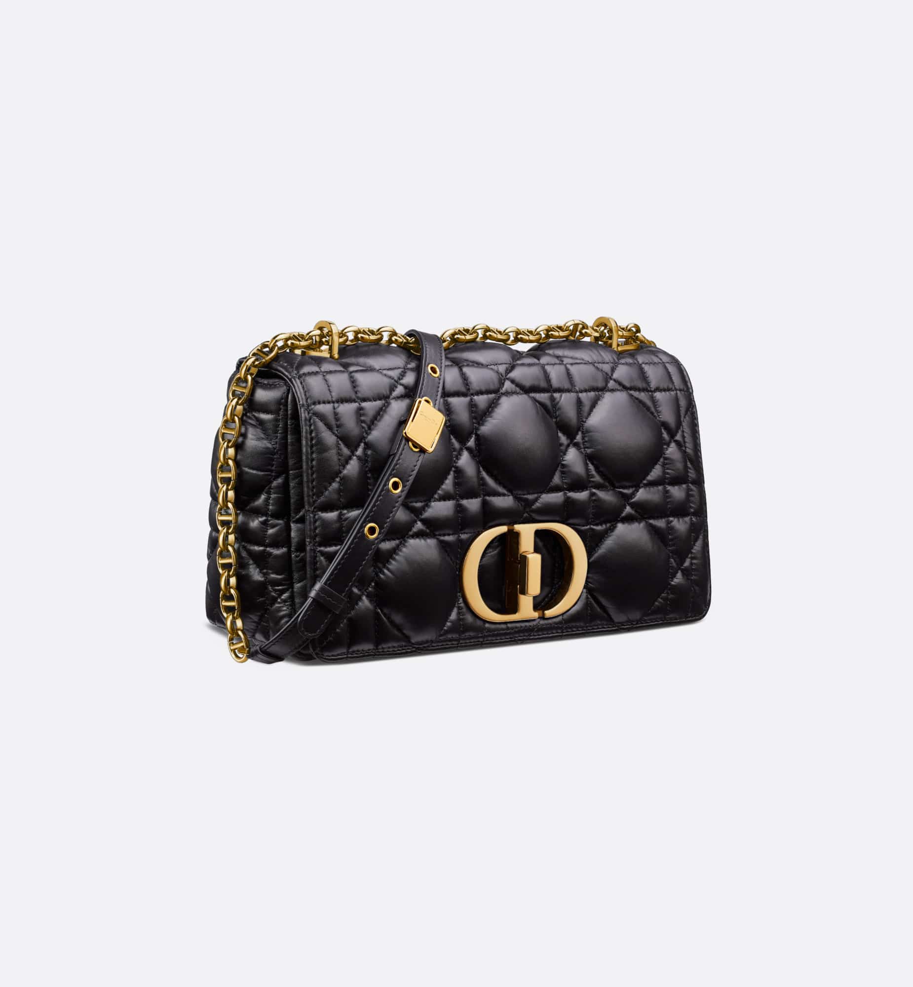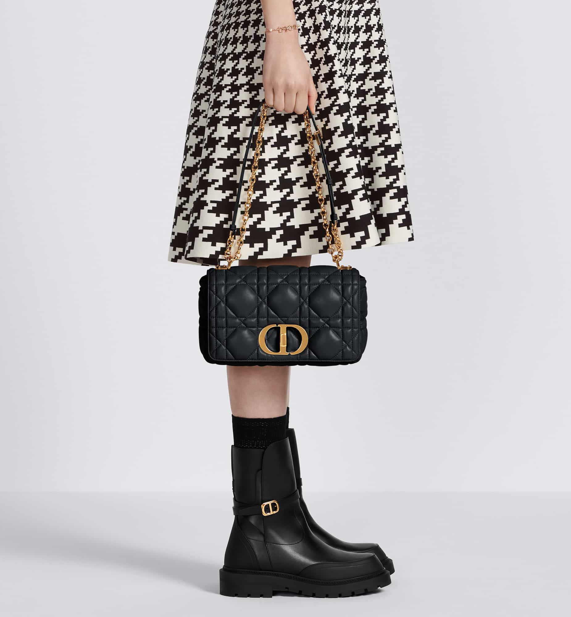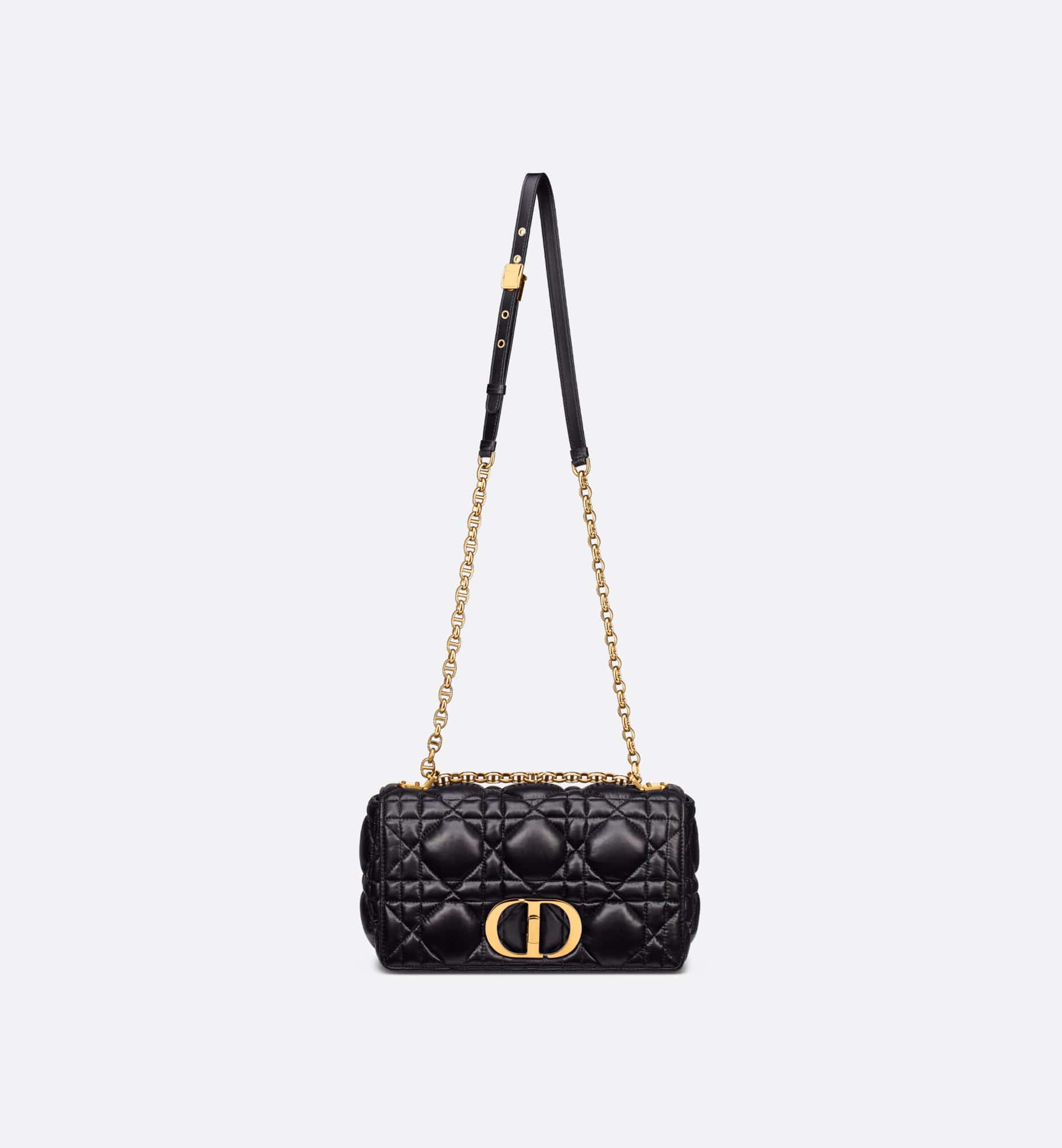 The Dior Caro bag combines modernity with timeless elegance. Crafted in black calfskin, it is distinguished by its original quilted-effect Macrocannage stitching. The bag features a flap adorned with an antique gold-finish metal CD twist clasp, inspired by the seal of a Christian Dior perfume bottle. The detachable chain shoulder strap with CD signature links allows the medium bag to be carried by hand or worn over the shoulder and may be replaced by one of the House’s wide embroidered straps for day or evening attire.