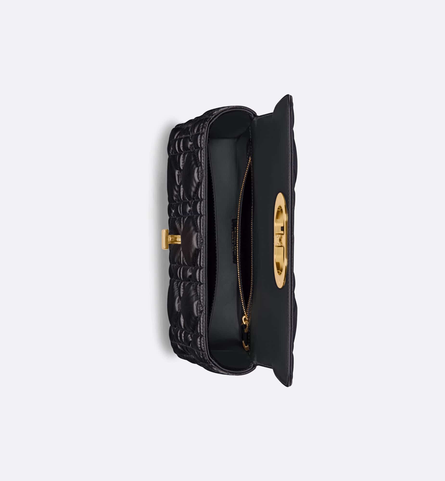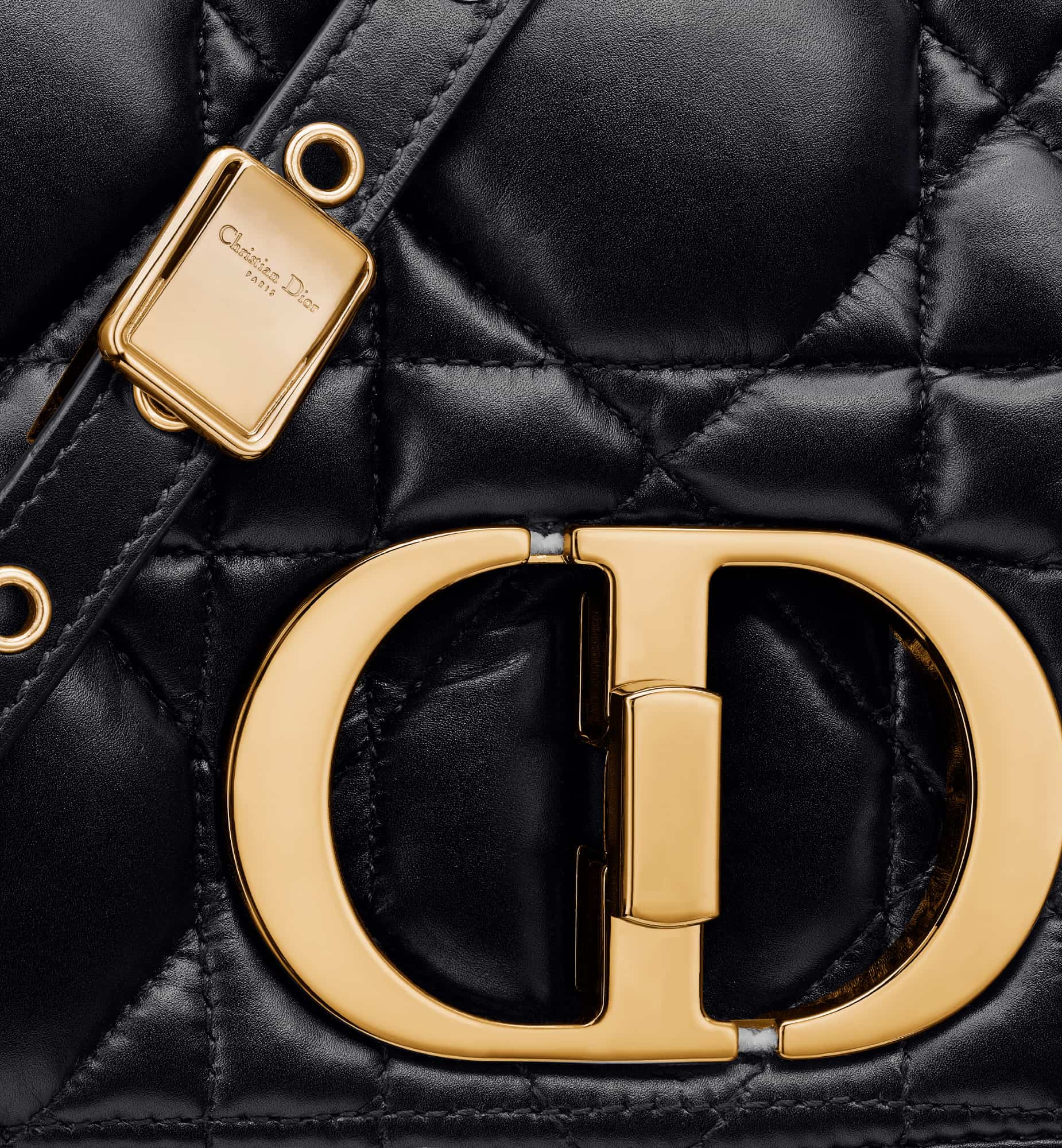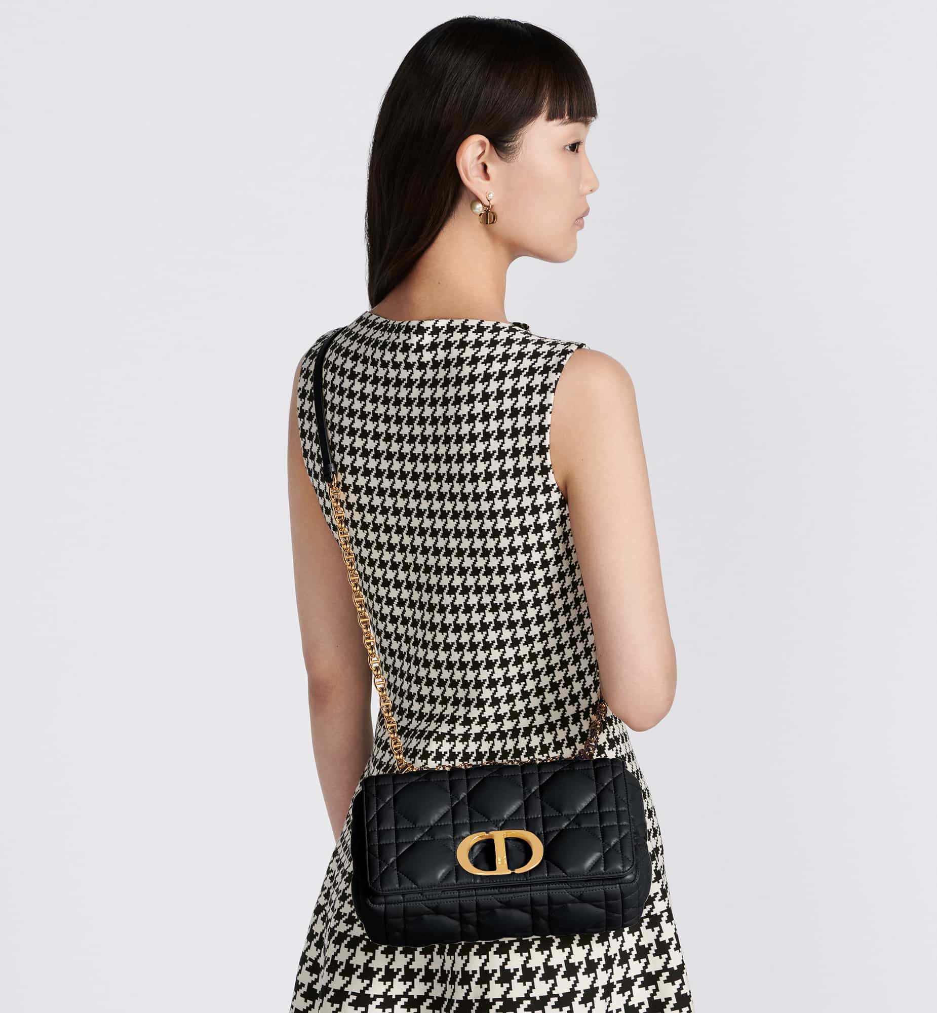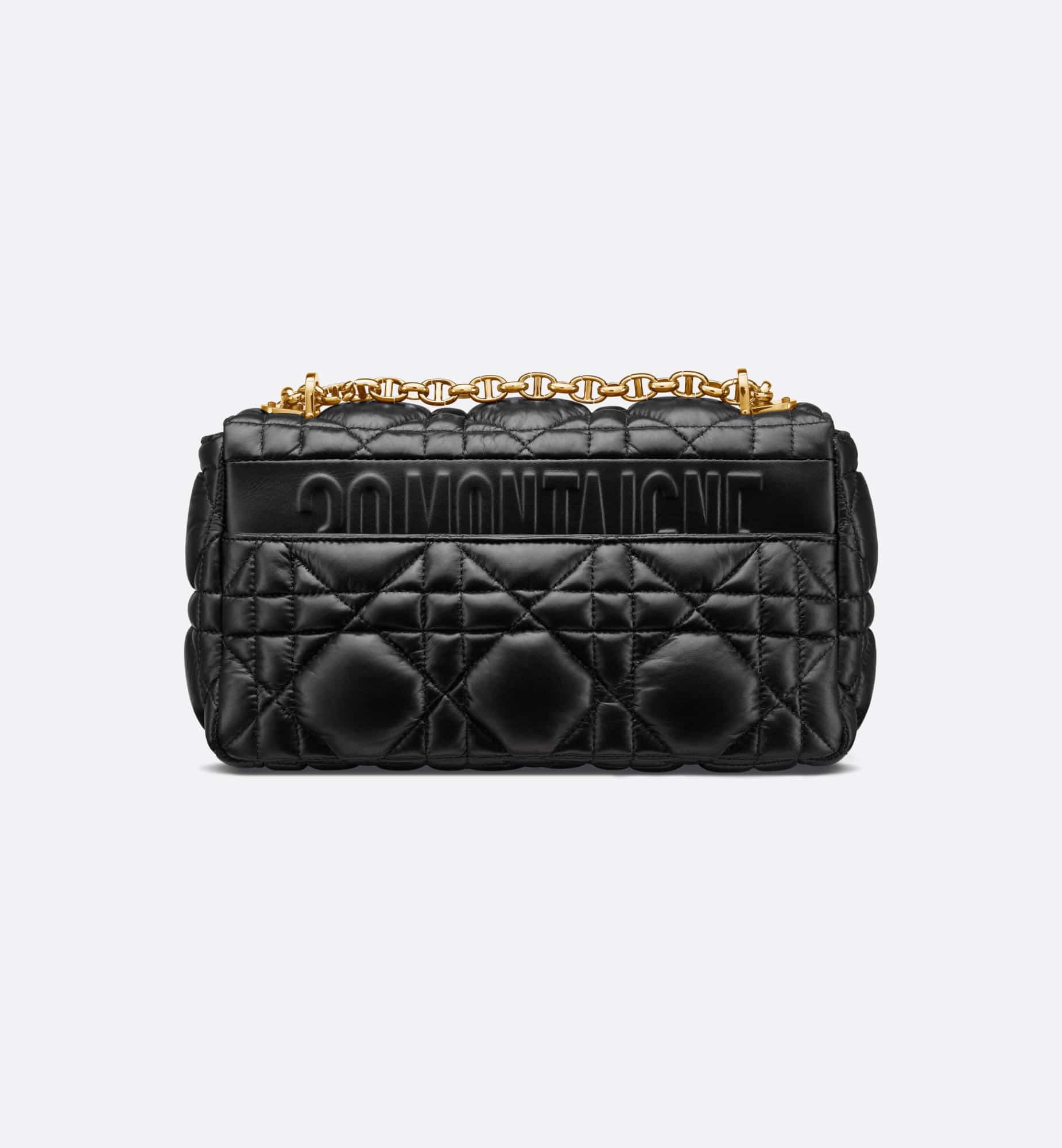 The Dior Caro bag combines modernity with timeless elegance. Crafted in black calfskin, it is distinguished by its original quilted-effect Macrocannage stitching. The bag features a flap adorned with an antique gold-finish metal CD twist clasp, inspired by the seal of a Christian Dior perfume bottle. The detachable chain shoulder strap with CD signature links allows the medium bag to be carried by hand or worn over the shoulder and may be replaced by one of the House’s wide embroidered straps for day or evening attire.