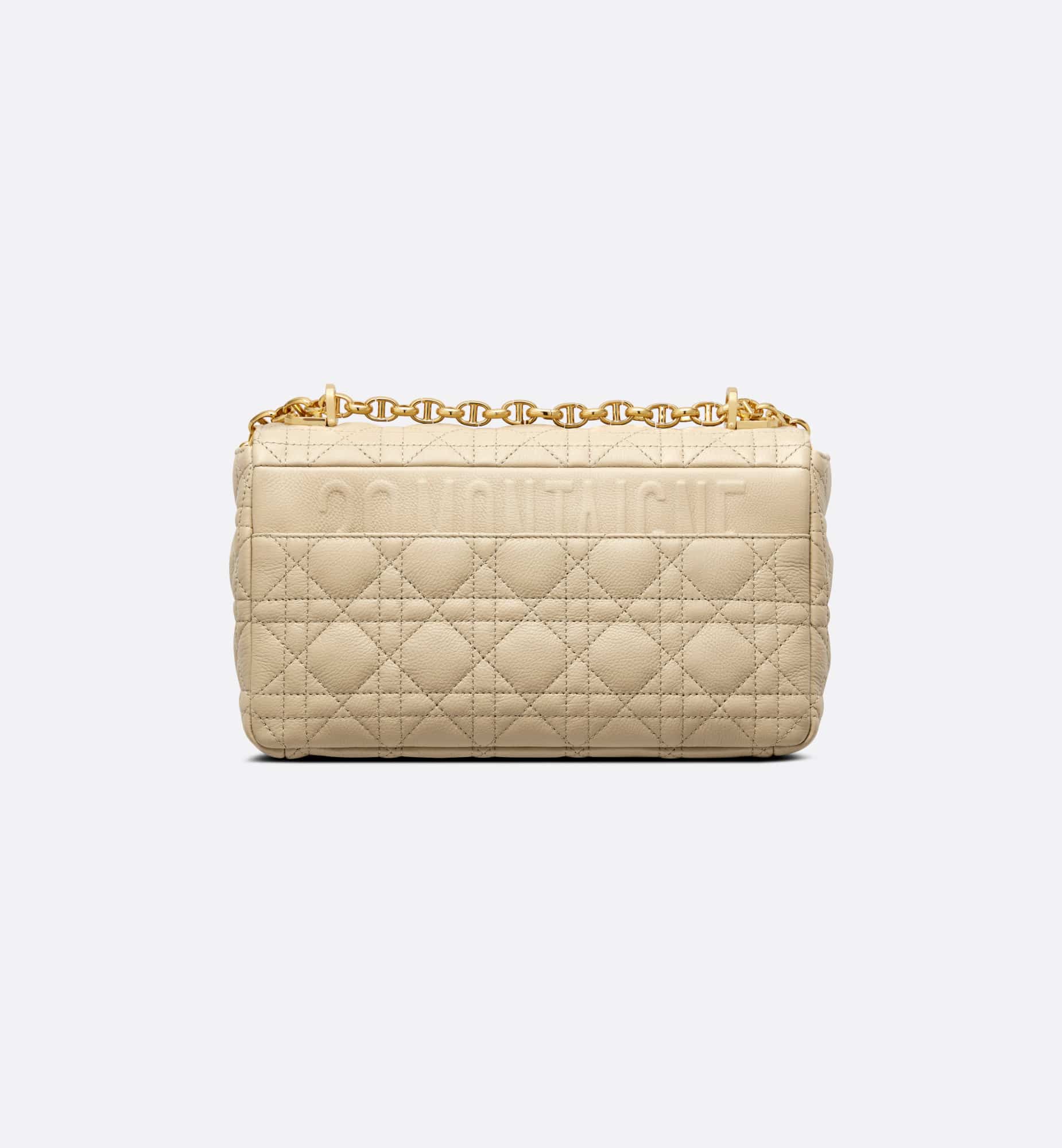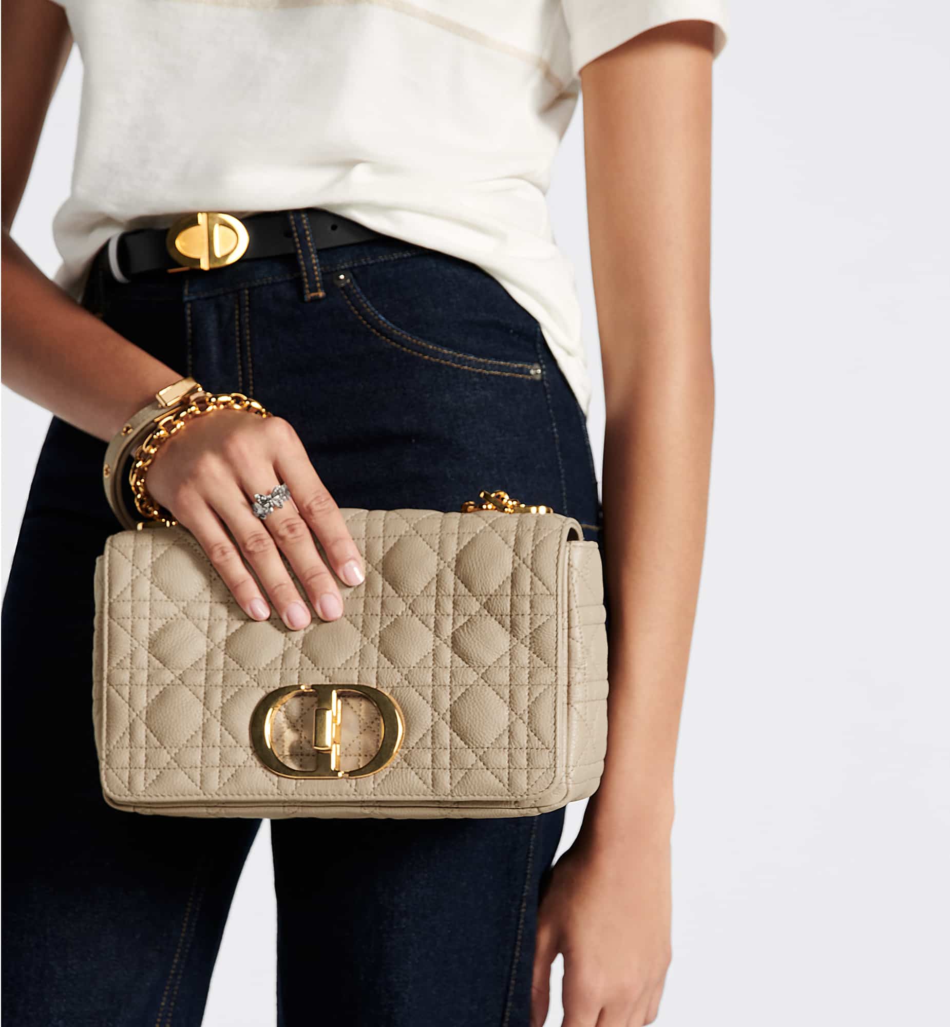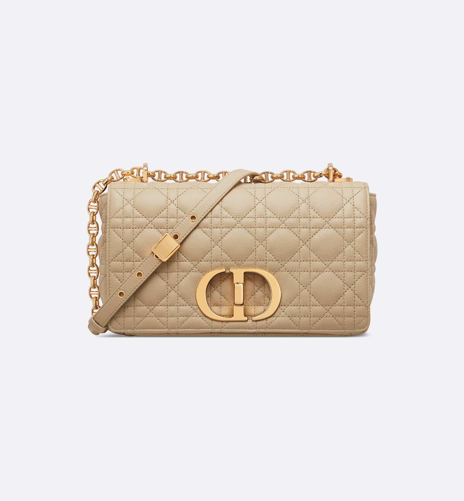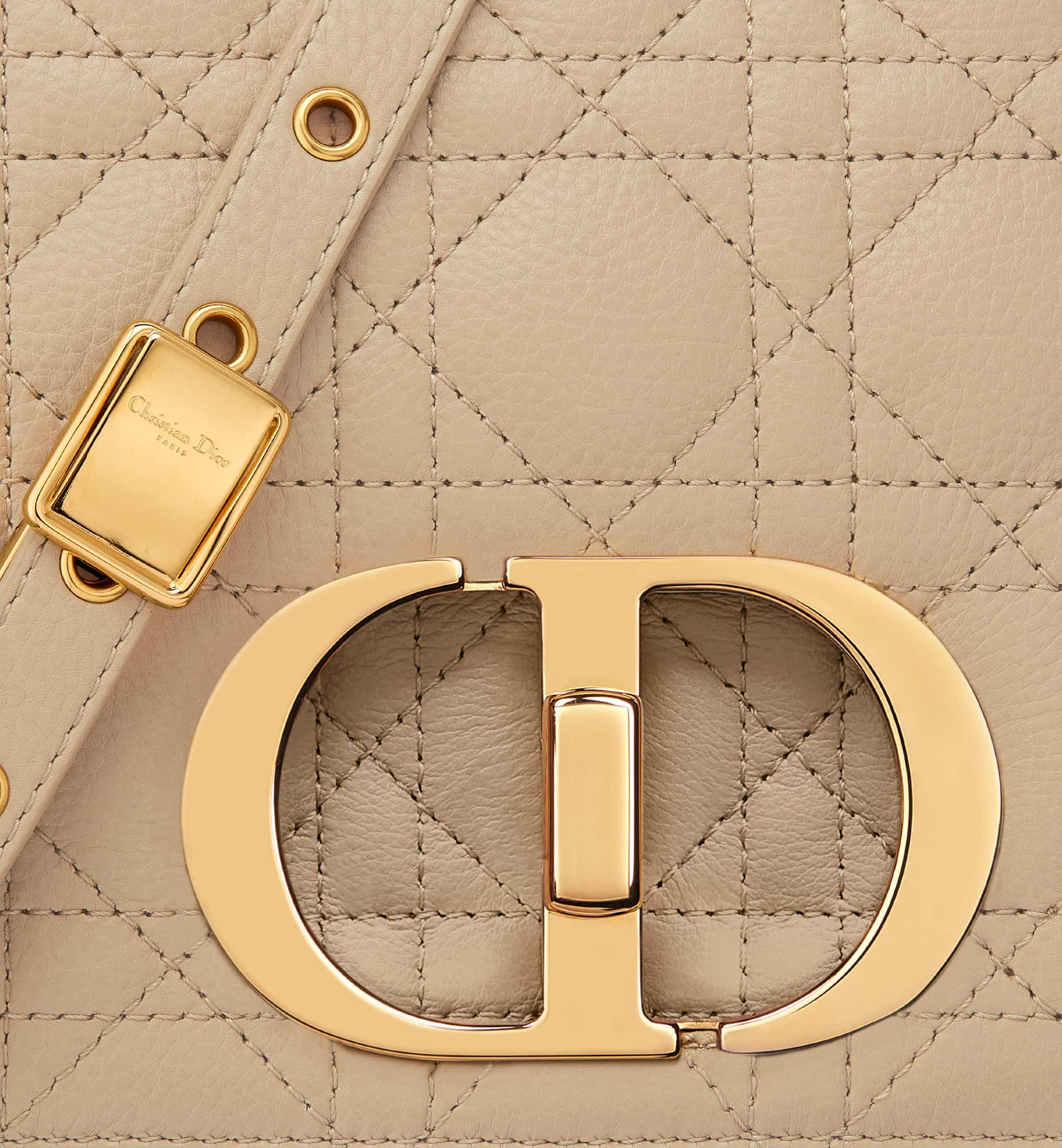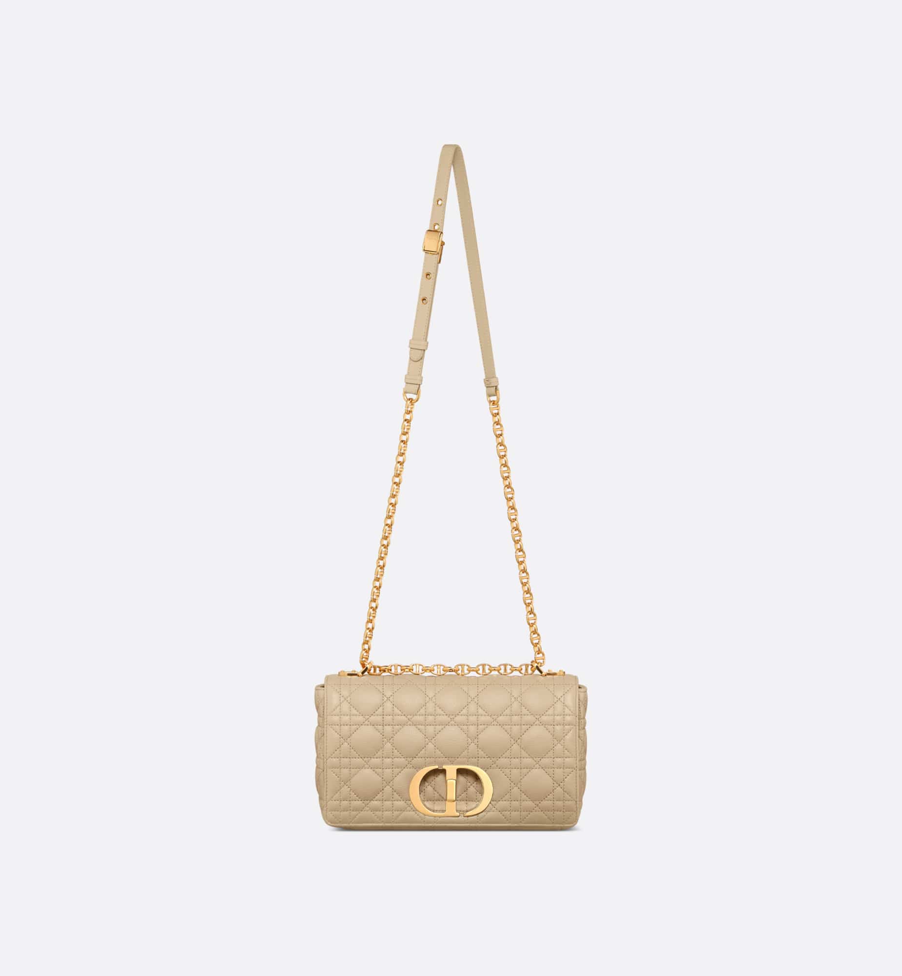 The Dior Caro bag combines modernity with timeless elegance. The style is crafted in beige supple calfskin with Cannage stitching. The bag showcases a flap adorned with an antique gold-finish metal CD twist clasp, inspired by the seal of a Christian Dior perfume bottle. The detachable chain shoulder strap with CD signature links allows the medium bag to be carried by hand, worn over the shoulder or crossbody, and may be replaced by one of the House’s wide embroidered straps for day or evening attire.