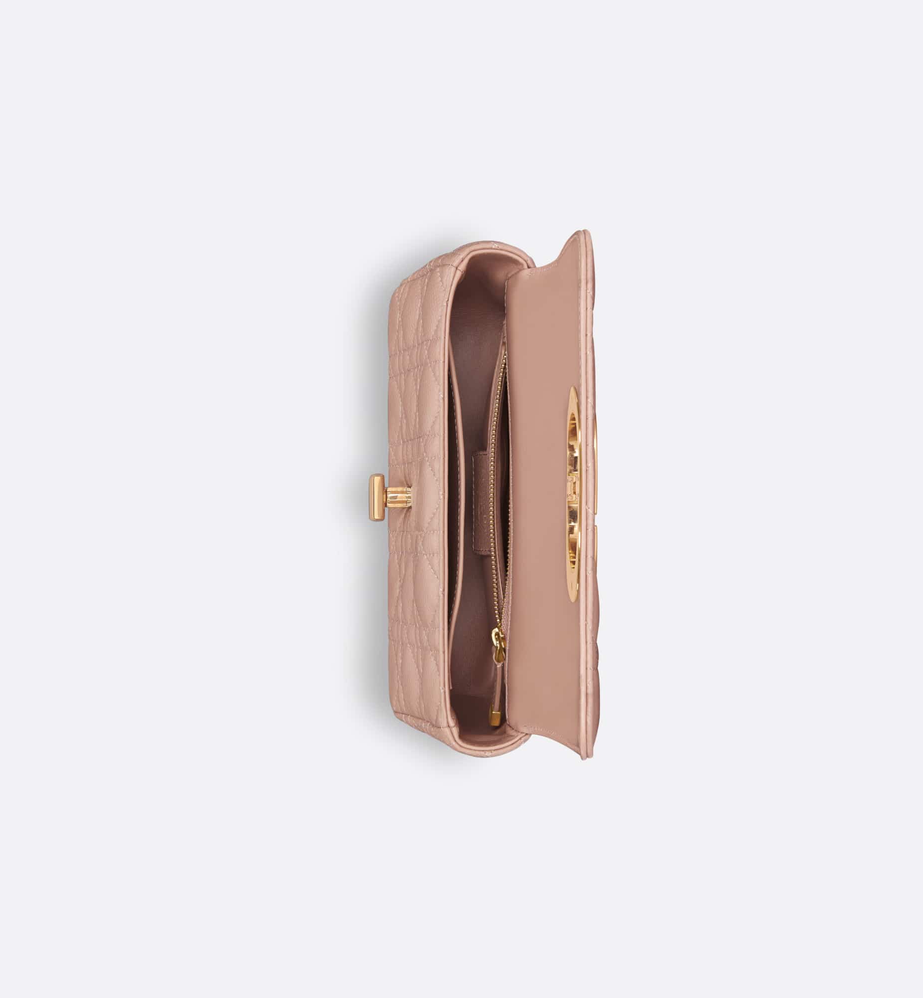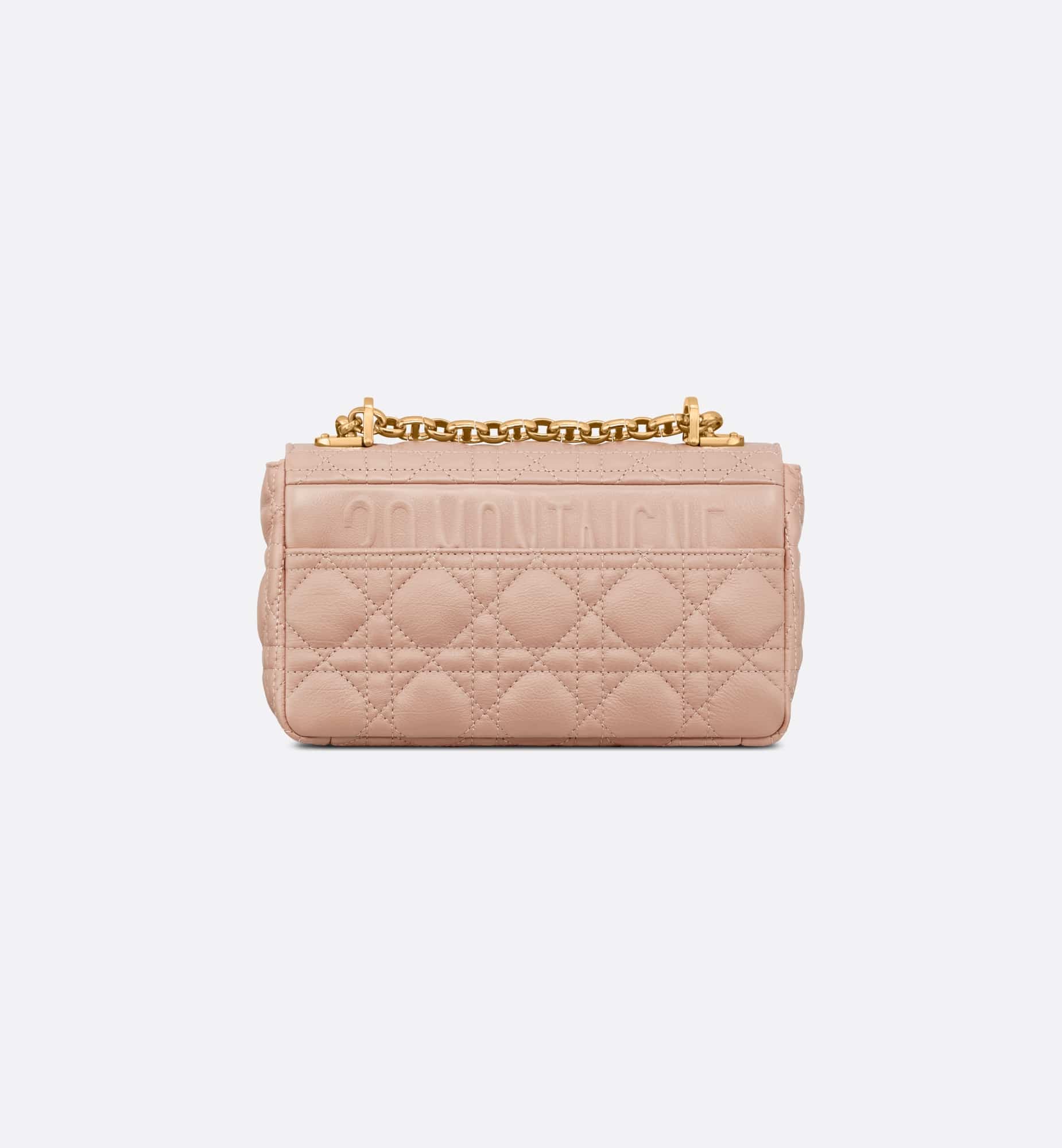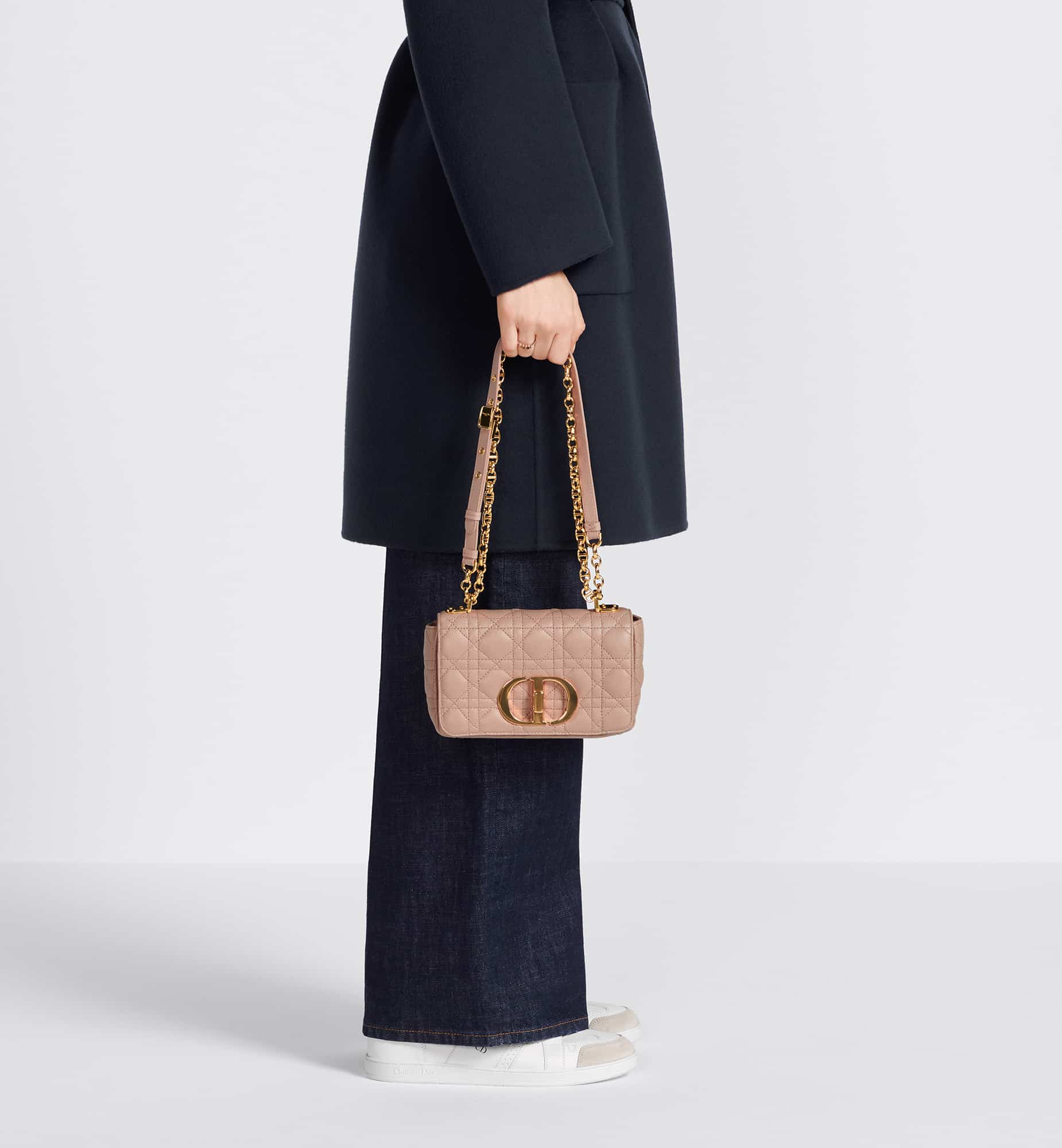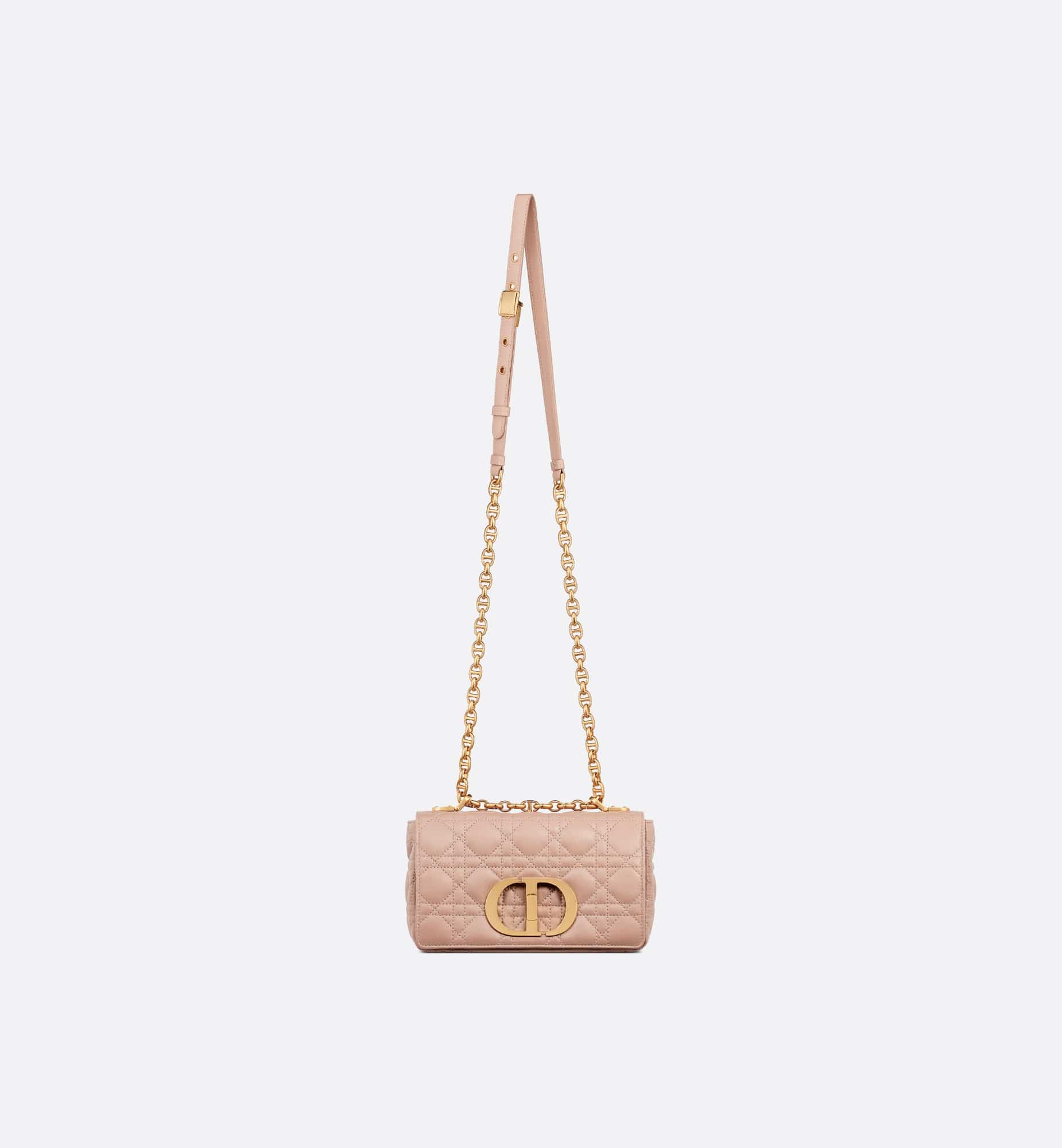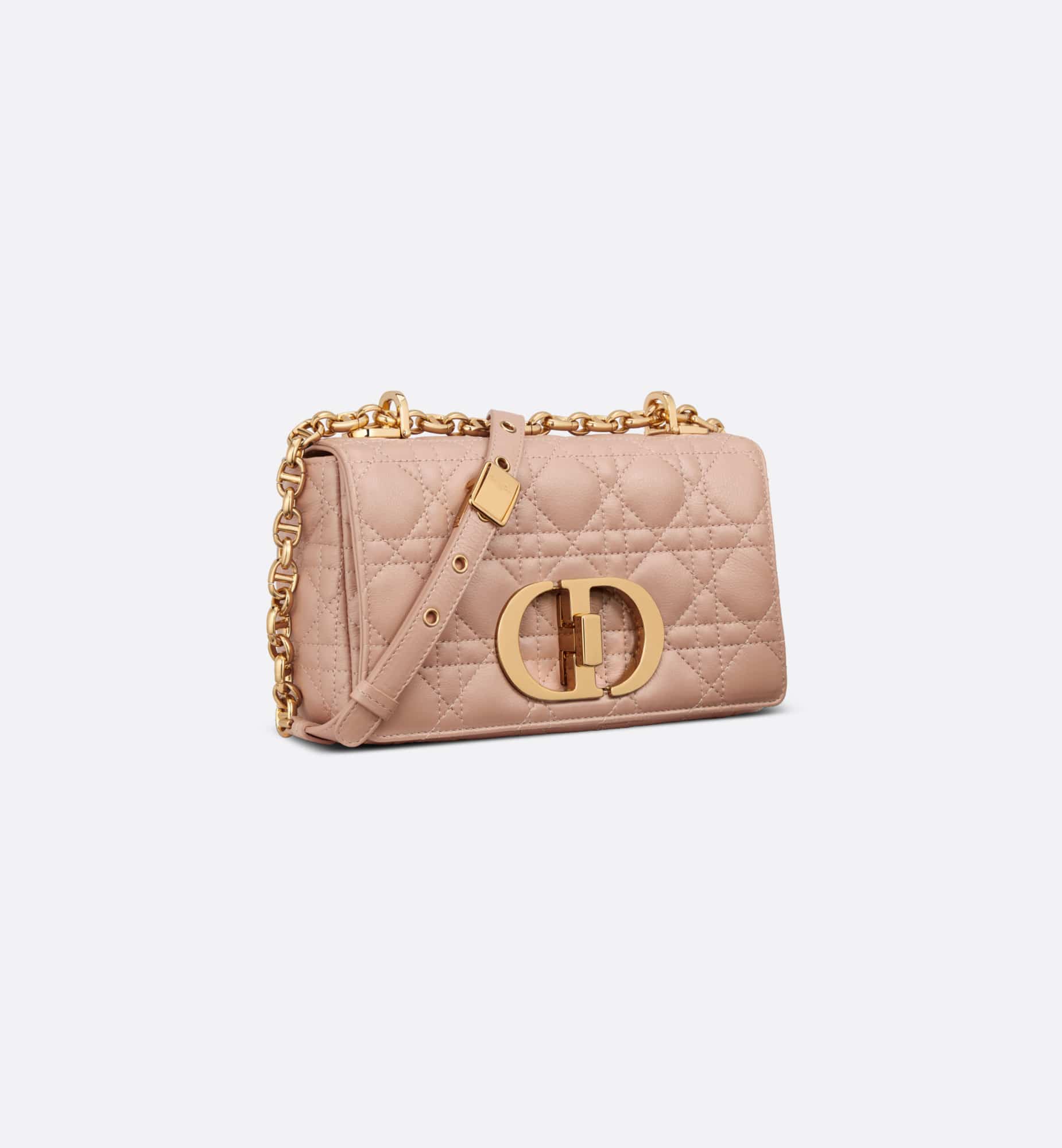 The Dior Caro bag combines modernity with timeless elegance. The silhouette is crafted in Rose des Vents supple calfskin with Cannage topstitching. The bag features a flap adorned with an antique gold-finish metal CD twist clasp, inspired by the seal of a Christian Dior perfume bottle. The detachable chain shoulder strap with CD signature links allows the small bag to be carried by hand, worn over the shoulder or crossbody and may be replaced by one of the House’s wide embroidered straps for day or evening attire.