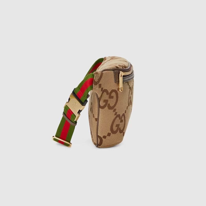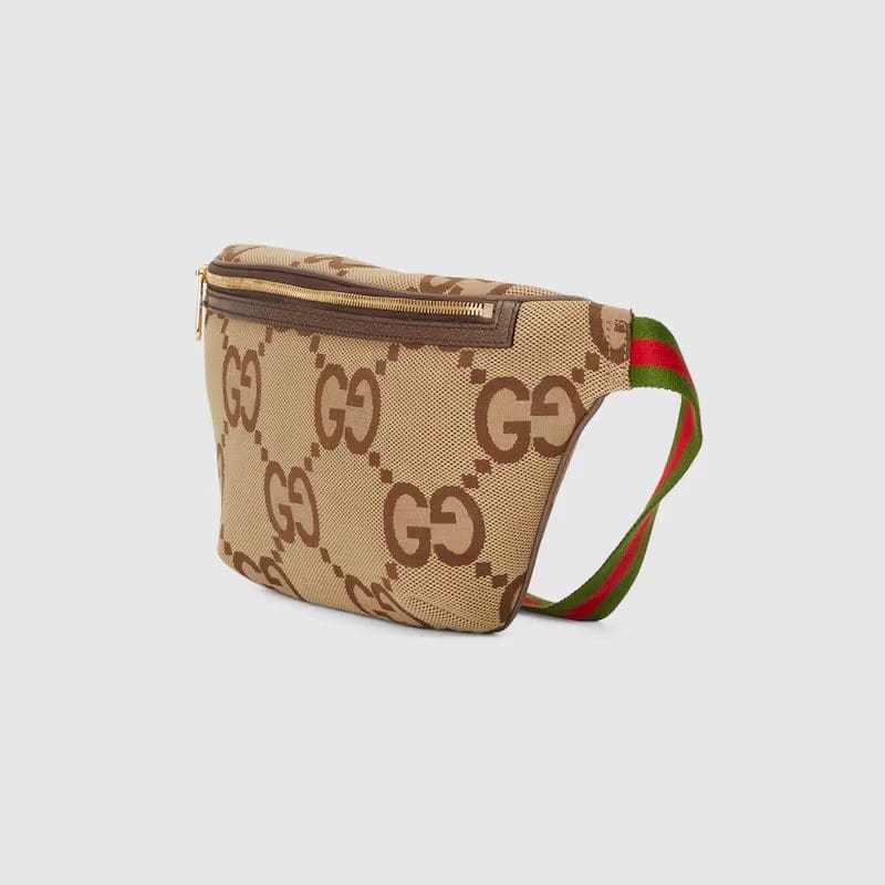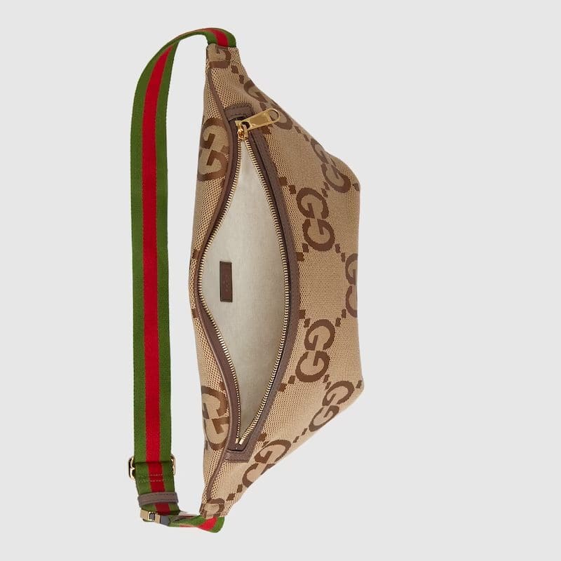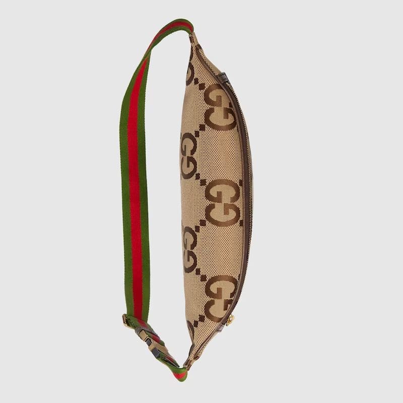 First seen as part of Gucci Aria, the jumbo version of the emblematic GG motif returns atop signature luggage pieces, imbuing each design with a pronounced logo feel. This belt bag is accentuated by the signature green and red House Web, a contemporary take on a Gucci archival belt buckle from the ’70s.
