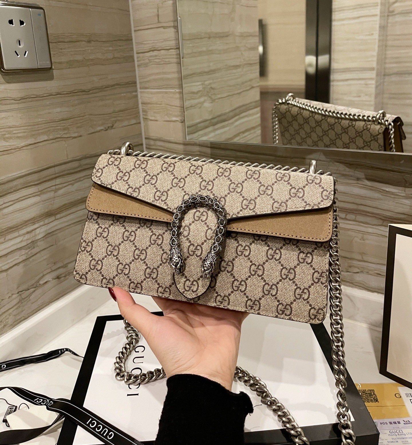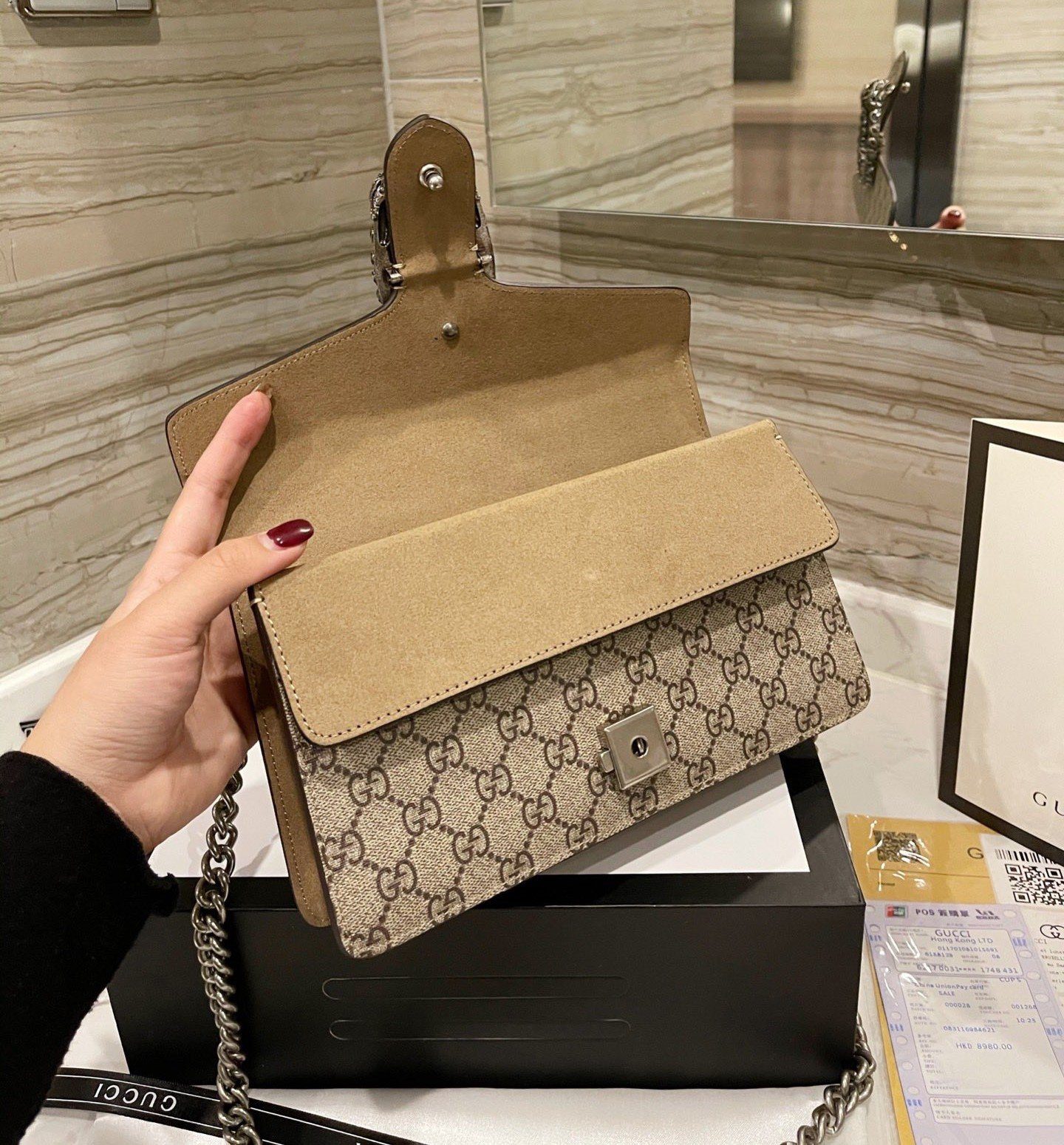 A structured GG Supreme canvas bag with our textured tiger head closure-a unique detail referencing the Greek god Dionysus, who in myth is said to have crossed the river Tigris on a tiger sent to him by Zeus. The sliding chain strap can be worn multiple ways, changing between a shoulder and a top handle bag.