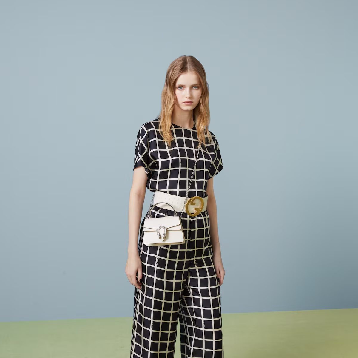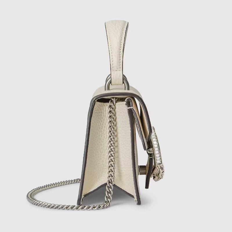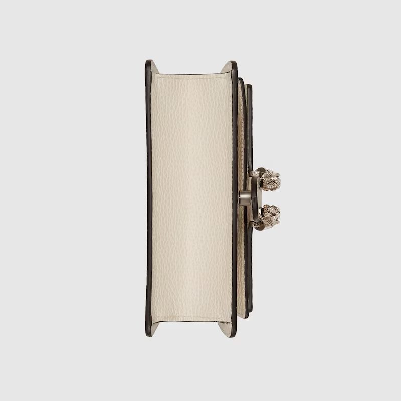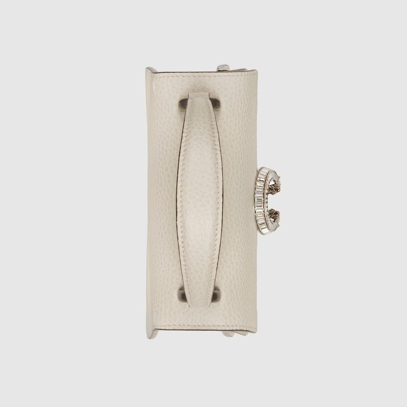 Presented in a mini dimensions for Pre-Fall 2023, this Dionysus bag in white leather is defined by the tiger head spur closure, a beloved symbol of the House. A crystal variation of the signature hardware adds an unexpected luxury element, introducing contrasting textures.